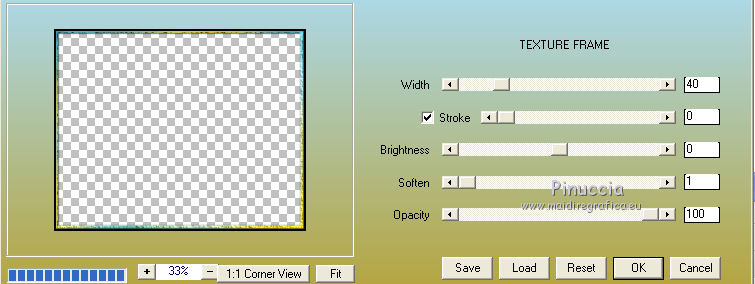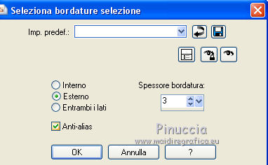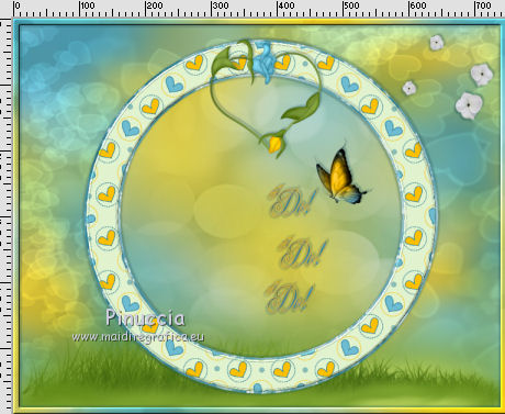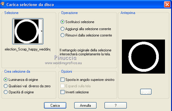 qui puoi trovare qualche risposta ai tuoi dubbi. Se l'argomento che ti interessa non è presente, ti prego di segnalarmelo. Questo tutorial è una creazione di ©Titoune e non può essere copiato su altri siti nè essere offerto per il download. Lo stesso vale per la mia traduzione. Il tutorial è stato creato con Corel17, ma può essere eseguito anche con le altre versioni di PSP. Secondo la versione utilizzata (anteriore a PSP X) potresti ottenere dei risultati differenti. Dalla versione X4, il comando Immagine>Rifletti è stato sostituito con Immagine>Capovolgi in orizzontale, e il comando Immagine>Capovolgi con Immagine>Capovolgi in verticale. Nelle versioni X5 e X6, le funzioni sono state migliorate rendendo disponibile il menu Oggetti. Con il nuovo X7 sono tornati i comandi Rifletti/Capovolgi, ma con nuove differenze. Vedi la scheda sull'argomento qui Per tradurre il tutorial ho usato PSP X. Occorrente: Un tube a scelta. Il resto del materiale qui Filtri in caso di dubbi, ricorda di consultare la mia sezione filtri qui AAA Frames - Texture Frame qui ![]() Metti la selezione nella cartella Selezioni. 1. Apri una nuova immagine trasparente 750 x 600 pixels. Selezione>Seleziona tutto. 2. Apri l'elemento MC_PP_SpringWedding_P04 e vai a Modifica>Copia. Torna al tuo lavoro e vai a Modifica>Incolla nella selezione. 3. Selezione>Carica/Salva selezione>Carica selezione da disco. Cerca e carica la selezione "selection_Scrap_happy_wedding". ![]() 4. Livelli>Nuovo livello raster. Apri l'elemento MC_PP_SpringWedding_P05 e vai a Modifica>Copia. Torna al tuo lavoro e vai a Modifica>Incolla nella selezione. Selezione>Deseleziona. 5. Effetti>Effetti 3D>Smusso a incasso. ![]() 6. Selezione>Modifica>Seleziona bordature selezione. ![]() 7. Livelli>Nuovo livello raster. Apri l'elemento MC_PP_SpringWedding_P03 e vai a Modifica>Copia. Torna al tuo lavoro e vai a Modifica>Incolla nella selezione. Selezione>Deseleziona. Livelli>Unisci>Unisci giù. 8. Attiva lo strumento Bacchetta magica ![]() e clicca al centro della cornice per selezionarla. Selezione>Modifica>Espandi - 4 pixels. Selezione>Inverti. 9. Selezione>Modifica>Contrai - 10 pixels. Livelli>Nuovo livello raster. Livelli>Disponi>Sposta giù. Apri l'elemento MC_PP_SpringWedding_P09 e vai a Modifica>Copia. Torna al tuo lavoro e vai a Modifica>Incolla nella selezione. 10. Selezione>Inverti. Attiva il livello inferiore. Selezione>Innalza selezione a livello. Livelli>Disponi>Porta in alto. Effetti>Effetti 3D>Smusso a incasso, con i settaggi precedenti. Selezione>Deseleziona. 11. Attiva lo strumento Selezione ![]() e seleziona il cerchio centrale (non lo vedi perchè è coperto dai livelli inferiori) ![]() Premi sulla tastiera il tasto CANC ![]() Selezione>Deseleziona. 12. Effetti>Effetti 3D>Sfalsa ombra, colore #194955. ![]() Ripeti l'Effetto Sfalsa ombra cambiando verticale e orizzontale -3/3. Rinomina questo livello "bordo". 13. Attiva il livello della cornice. Effetti>Effetti 3D>Sfalsa ombra, con i settaggi precedenti. 14. Apri l'elemento MC_PP_SpringWedding_E21 e vai a Modifica>Copia. Torna al tuo lavoro e vai a Modifica>Incolla come nuovo livello. Porta questo livello sotto il livello della cornice. Vedi l'esempio finale. Niente Sfalsa ombra. 15. Attiva nuovamente il livello superiore. Apri l'elemento MC_PP_SpringWedding_E26 e vai a Modifica>Copia. Torna al tuo lavoro e vai a Modifica>Incolla come nuovo livello. Spostalo dove preferisci o vedi il mio esempio.Effetti>Effetti 3D>Sfalsa ombra, con i settaggi precedenti. Porta questo livello sotto il livello della cornice. 16. Apri l'elemento MC_PP_SpringWedding_E45 e vai a Modifica>Copia. Torna al tuo lavoro e vai a Modifica>Incolla come nuovo livello. Effetti>Effetti 3D>Sfalsa ombra, con i settaggi precedenti. Livelli>Duplica - 2 volte e posiziona i tre elementi a tuo piacimento,o vedi il mio esempio. 17. Attiva nuovamente il livello superiore. Apri l'elemento MC_PP_SpringWedding_E01 e vai a Modifica>Copia. Torna al tuo lavoro e vai a Modifica>Incolla come nuovo livello. Spostalo nella parte superiore della cornice.Vedi l'esempio finale. Effetti>Effetti 3D>Sfalsa ombra, con i settaggi precedenti. 18. Apri l'elemento MC_PP_SpringWedding_E12 e vai a Modifica>Copia. Torna al tuo lavoro e vai a Modifica>Incolla come nuovo livello. Spostalo nella parte superiore destra della cornice,fuori dai bordi. ![]() Effetti>Effetti 3D>Sfalsa ombra, con i settaggi precedenti. 19. Apri l'elemento MC_PP_SpringWedding_E02 e vai a Modifica>Copia. Torna al tuo lavoro e vai a Modifica>Incolla come nuovo livello. Spostalo nella parte destra della cornice.Vedi l'esempio finale. Effetti>Effetti 3D>Sfalsa ombra, con i settaggi precedenti. 20. Apri l'elemento MC_PP_SpringWedding_E08_2 e vai a Modifica>Copia. Torna al tuo lavoro e vai a Modifica>Incolla come nuovo livello. Spostalo nella parte inferiore della cornice.Vedi l'esempio finale. Effetti>Effetti 3D>Sfalsa ombra, con i settaggi precedenti. 21. Apri l'elemento wedding-cake-with-bride-and-groom e vai a Modifica>Copia. Torna al tuo lavoro e vai a Modifica>Incolla come nuovo livello. Spostalo nella parte inferiore della cornice.Vedi l'esempio finale. Effetti>Effetti 3D>Sfalsa ombra, con i settaggi precedenti. 22. Apri l'elemento MC_PP_SpringWedding_E32 e vai a Modifica>Copia. Torna al tuo lavoro e vai a Modifica>Incolla come nuovo livello. Spostalo nella parte inferiore destra della cornice.Vedi l'esempio finale. Effetti>Effetti 3D>Sfalsa ombra, con i settaggi precedenti. 23. Apri l'elemento MC_PP_SpringWedding_E11 e vai a Modifica>Copia. Torna al tuo lavoro e vai a Modifica>Incolla come nuovo livello. Spostalo nella parte inferiore della cornice.Vedi l'esempio finale. Porta questo livello sotto il livello del vestito. Effetti>Effetti 3D>Sfalsa ombra, con i settaggi precedenti. 24. Attiva nuovamente il livello superiore. Apri l'elemento MC_PP_SpringWedding_E38 e vai a Modifica>Copia. Torna al tuo lavoro e vai a Modifica>Incolla come nuovo livello. Spostalo nella parte infer