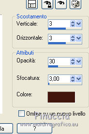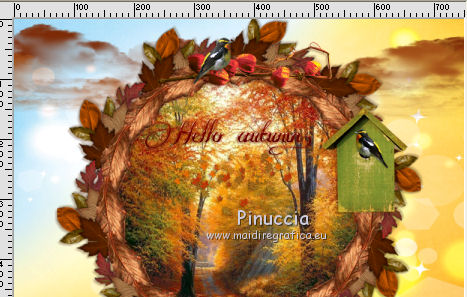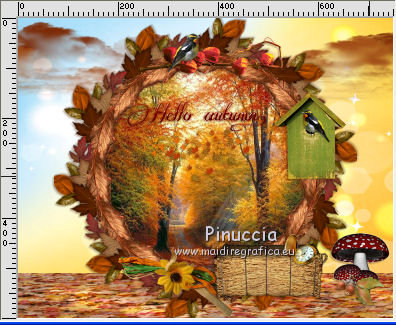 qui puoi trovare qualche risposta ai tuoi dubbi. Se l'argomento che ti interessa non è presente, ti prego di segnalarmelo. Questo tutorial è una creazione di ©Titoune e non può essere copiato su altri siti nè essere offerto per il download. Lo stesso vale per la mia traduzione. Il tutorial è stato creato con Corel17, ma può essere eseguito anche con le altre versioni di PSP. Secondo la versione utilizzata (anteriore a PSP X) potresti ottenere dei risultati differenti. Dalla versione X4, il comando Immagine>Rifletti è stato sostituito con Immagine>Capovolgi in orizzontale, e il comando Immagine>Capovolgi con Immagine>Capovolgi in verticale. Nelle versioni X5 e X6, le funzioni sono state migliorate rendendo disponibile il menu Oggetti. Con il nuovo X7 sono tornati i comandi Rifletti/Capovolgi, ma con nuove differenze. Vedi la scheda sull'argomento qui Per tradurre il tutorial ho usato PSP X. Occorrente: Un tube a scelta. Il resto del materiale qui Filtri in caso di dubbi, ricorda di consultare la mia sezione filtri qui Eye Candy 4000 - Jiggle qui ![]() 1. Apri una nuova immagine trasparente 750 x 600 Pixels. Selezione>Seleziona tutto. 2. Apri l'elemento GD-GDoA-Paper18 e vai a Modifica>Copia. Torna al tuo lavoro e vai a Modifica>Incolla nella selezione. Selezione>Deseleziona. 3. Apri l'elemento leaves_ground e vai a Modifica>Copia. Torna al tuo lavoro e vai a Modifica>Incolla come nuovo livello. Spostalo in basso.4. Apri l'elemento GD-GDoA-Clouds e vai a Modifica>Copia. Torna al tuo lavoro e vai a Modifica>Incolla come nuovo livello. Spostalo in alto.5. Apri l'elemento GD-GDoA-Frame7 e vai a Modifica>Copia. Torna al tuo lavoro e vai a Modifica>Incolla come nuovo livello. Non spostarlo. 6. Attiva lo strumento Bacchetta magica e clicca al centro della cornice per selezionarla. Selezione>Modifica>Espandi - 6 pixels. 7. Livelli>Nuovo livello raster. Livelli>Disponi>Sposta giù. 8. Apri l'immagine colorful-autumn-landscapes-1-728 e vai a Modifica>Copia. Torna al tuo lavoro e vai a Modifica>Incolla nella selezione. Selezione>Deseleziona. 9. Apri l'elemento SumFall_zm e vai a Modifica>Copia. Torna al tuo lavoro e vai a Modifica>Incolla come nuovo livello. Spostalo come nel mio esempio.Livelli>Duplica. Cambia la modalità di miscelatura di questo livello in Moltiplica. 10. Attiva nuovamente il livello originale. Effetti>Effetti 3D>Sfalsa ombra, colore #542100. ![]() 11. Attiva nuovamente il livello della cornice. Effetti>Effetti 3D>Sfalsa ombra, colore #542100. ![]() Ripeti l'Effetto Sfalsa ombra, cambiando verticale e orizzontale con -3. 12. Apri l'elemento GD-GDoA-Leaf Scatter1 e vai a Modifica>Copia. Torna al tuo lavoro e vai a Modifica>Incolla come nuovo livello. Spostalo sotto il wordart.Vedi l'esempio finale. 13. Apri l'elemento GD-GDoA-DryFlowers e vai a Modifica>Copia. Torna al tuo lavoro e vai a Modifica>Incolla come nuovo livello. Spostalo nella parte superiore della cornice.Vedi l'esempio finale. Effetti>Effetti 3D>Sfalsa ombra, colore #542100. ![]() 14. Apri l'elemento GD-GDoA-Birdhouse e vai a Modifica>Copia. Torna al tuo lavoro e vai a Modifica>Incolla come nuovo livello. Spostalo nella parte destra della cornice.Vedi l'esempio finale. Effetti>Effetti 3D>Sfalsa ombra, con i settaggi precedenti. 15. Apri l'elemento GD-GDoA-Bird e vai a Modifica>Copia. Torna al tuo lavoro e vai a Modifica>Incolla come nuovo livello. Spostalo nella parte superiore della cornice.![]() Effetti>Effetti 3D>Sfalsa ombra, con i settaggi precedenti. 16. Apri l'elemento GD-GDoA-Mushrooms2 e vai a Modifica>Copia. Torna al tuo lavoro e vai a Modifica>Incolla come nuovo livello. Spostalo nella parte inferiore destra della cornice.Vedi l'esempio finale. Effetti>Effetti 3D>Sfalsa ombra, con i settaggi precedenti. 17. Apri l'elemento GD-GDoA-Acorns3 e vai a Modifica>Copia. Torna al tuo lavoro e vai a Modifica>Incolla come nuovo livello. Spostalo nella parte inferiore destra della cornice.Vedi l'esempio finale. Effetti>Effetti 3D>Sfalsa ombra, con i settaggi precedenti. 18. Apri l'elemento GD-GDoA-Deco e vai a Modifica>Copia. Torna al tuo lavoro e vai a Modifica>Incolla come nuovo livello. Spostalo nella parte inferiore della cornice.Vedi l'esempio finale. Effetti>Effetti 3D>Sfalsa ombra, con i settaggi precedenti. 19. Apri l'elemento GD-GDoA-Hay e vai a Modifica>Copia. Torna al tuo lavoro e vai a Modifica>Incolla come nuovo livello. Spostalo nella parte inferiore della cornice.Vedi l'esempio finale. Effetti>Effetti 3D>Sfalsa ombra, con i settaggi precedenti. 20. Apri l'elemento GD-GDoA-Pocket Watch e vai a Modifica>Copia. Torna al tuo lavoro e vai a Modifica>Incolla come nuovo livello. Spostalo nella parte inferiore della cornice.![]() Effetti>Effetti 3D>Sfalsa ombra, con i settaggi precedenti. 21. Apri l'elemento GD-GDoA-Barrel e vai a Modifica>Copia. Torna al tuo lavoro e vai a Modifica>Incolla come nuovo livello. Spostalo nella parte inferiore sinistra della cornice.Vedi l'esempio finale. Effetti>Effetti 3D>Sfalsa ombra, con i settaggi precedenti. 22. Apri l'elemento GD-GDoA-Broom e vai a Modifica>Copia. Torna al tuo lavoro e vai a Modifica>Incolla come nuovo livello. Spostalo nella parte inferiore sinistra della cornice.Vedi l'esempio finale. Effetti>Effetti 3D>Sfalsa ombra, con i settaggi precedenti. 23. Apri l'elemento GD-GDoA-Lamp e vai a Modifica>Copia. Torna al tuo lavoro e vai a Modifica>Incolla come nuovo livello. Spostalo nella parte inferiore sinistra della cornice.Vedi l'esempio finale. Effetti>Effetti 3D>Sfalsa ombra, con i settaggi precedenti. 24. Apri l'elemento GD-GDoA-Kitten e vai a Modifica>Copia. Torna al tuo lavoro e vai a Modifica>Incolla come nuovo livello. Spostalo nella parte inferiore sinistra della cornice.Vedi l'esempio finale. Effetti>Effetti 3D>Sfalsa ombra, con i settaggi precedenti. 25. Apri l'elemento GD-GDoA-Bottle e vai a Modifica>Copia. Torna al tuo lavoro e vai a Modifica>Incolla come nuovo livello. Spostalo nella parte inferiore sinistra della cornice.Vedi l'esempio fina
