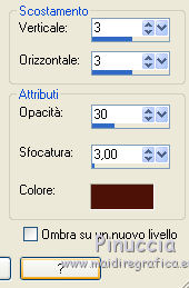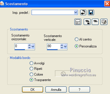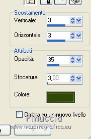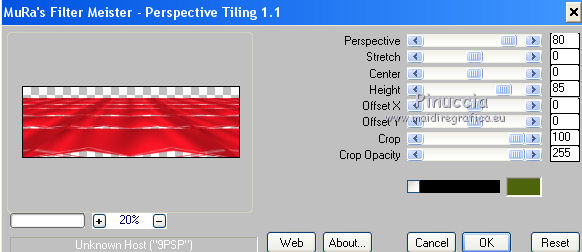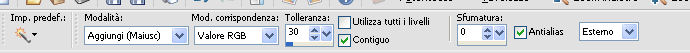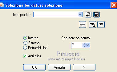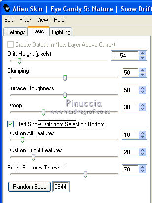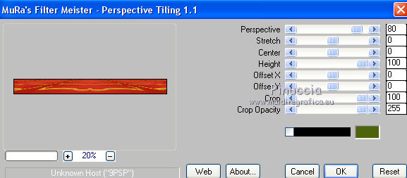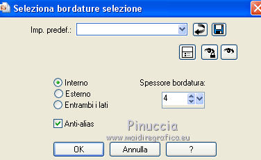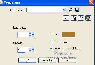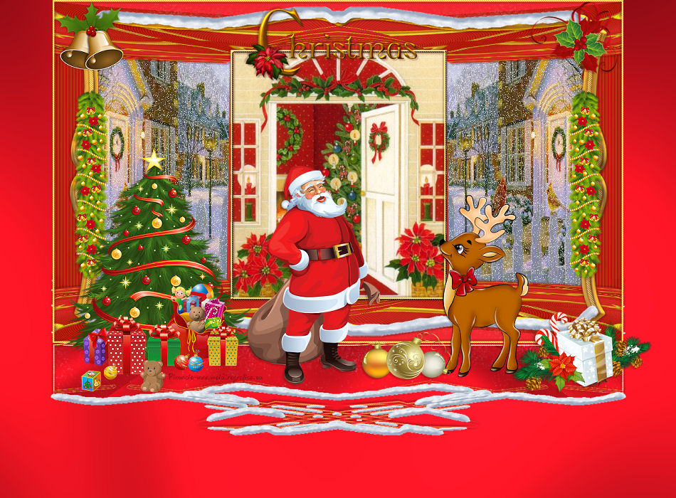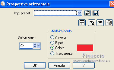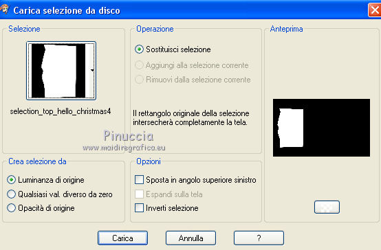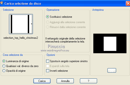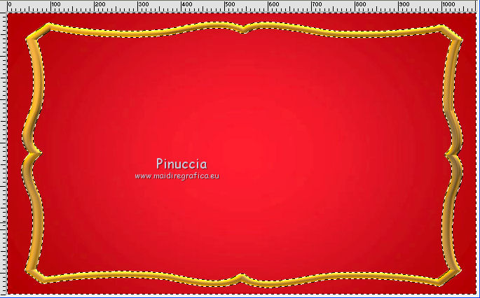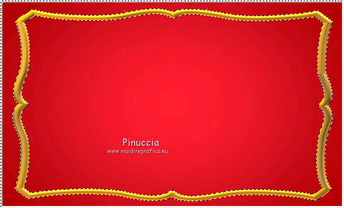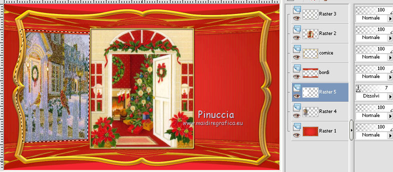 qui puoi trovare qualche risposta ai tuoi dubbi. Se l'argomento che ti interessa non è presente, ti prego di segnalarmelo. Questo tutorial è una creazione di ©Titoune e non può essere copiato su altri siti nè essere offerto per il download. Lo stesso vale per la mia traduzione. Il tutorial è stato creato con Corel18, ma può essere eseguito anche con le altre versioni di PSP. Secondo la versione utilizzata (anteriore a PSP X) potresti ottenere dei risultati differenti. Dalla versione X4, il comando Immagine>Rifletti è stato sostituito con Immagine>Capovolgi in orizzontale, e il comando Immagine>Capovolgi con Immagine>Capovolgi in verticale. Nelle versioni X5 e X6, le funzioni sono state migliorate rendendo disponibile il menu Oggetti. Con il nuovo X7 sono tornati i comandi Rifletti/Capovolgi, ma con nuove differenze. Vedi la scheda sull'argomento qui Per tradurre il tutorial ho usato PSP X. Occorrente: Un tube a scelta. Il resto del materiale qui Filtri in caso di dubbi, ricorda di consultare la mia sezione filtri qui Filters Unlimited 2.0 qui Penta.com - Jeans qui Graphics Plus - Cross Shadow qui Mura's Meister - Perspective Tiling qui Alien Skin Eye Candy 5 Nature - Snowdrift qui I filtri Penta.com e Graphics Plus si possono usare da soli o importati in Filters Unlimited (come fare vedi qui) Se un filtro fornito appare con questa icona ![]() Metti le selezioni nella cartella Selezioni. Apri la maschera in PSP e minimizzala con il resto del materiale. 1. Apri una nuova immagine trasparente 1080 x 650 pixels. Selezione>Seleziona tutto. 2. Apri l'immagine free-red-with-gold-frame-backgrounds, e vai a Modifica>Copia. Torna al tuo lavoro e vai a Modifica>Incolla nella selezione. Selezione>Deseleziona. 3. Attiva lo strumento Bacchetta magica ![]() ![]() Clicca nella parte esterna dell'immagine e poi nella parte interna per selezionarle. ![]() Selezione>Inverti, e avrai selezionato la cornice ![]() Selezione>Innalza selezione a livello. Rinomina questo livello "cornice". Selezione>Deseleziona. 4. Attiva il livello inferiore. Effetti>Effetti di trama>Veneziana, colore #ae791e. ![]() 5. Selezione>Carica/Salva selezione>Carica selezione da disco. Cerca e carica la selezione "selection_top_hello_christmas". ![]() Selezione>Innalza selezione a livello. 6. Effetti>Plugins>Mura's Meister - Perspective Tiling. ![]() Selezione>Deseleziona. 7. Immagine>Capovolgi. 8. Effetti>Effetti geometrici>Sfera. ![]() 9. Effetti>Effetti geometrici>Prospettiva orizzontale, colore #f32730. ![]() 10. Effetti>Effetti di riflesso>Specchio rotante. ![]() Livelli>Duplica. 11. Immagine>Capovolgi. Livelli>Unisci>Unisci giù. 12. Effetti>Effetti geometrici>Cilindro verticale. ![]() Rinomina questo livello "bordi". 13. Attiva il livello della cornice. Selezione>Carica/Salva selezione>Carica selezione da disco. Cerca e carica la selezione "selection_top_hello_christmas2". ![]() 14. Livelli>Nuovo livello raster. Apri l'immagine "entrenoel", e vai a Modifica>Copia. Torna al tuo lavoro e vai a Modifica>Incolla nella selezione. 15. Selezione>Modifica>Seleziona bordature selezione. ![]() 16. Livelli>Nuovo livello raster. Imposta il colore di primo piano con #fab93c, e riempi il livello con questo colore.17. Effetti>Effetti 3D>Smusso a incasso. ![]() Effetti>Plugins>Penta.com - Jeans, con i settaggi standard. ![]() Selezione>Deseleziona. 18. Effetti>Effetti 3D>Sfalsa ombra, colore #4f1209. ![]() Ripeti l'Effetto Sfalsa ombra, cambiando verticale e orizzontale con -3. 19. Attiva nuovamente il livello della cornice. Selezione>Carica/Salva selezione>Carica selezione da disco. Cerca e carica la selezione "top_hello_christmas3". ![]() Effetti>Plugins>Penta.com - Jeans, con i settaggi precedenti. Effetti>Effetti 3D>Sfalsa ombra, con i settaggi precedenti. Selezione>Deseleziona. Sempre sul livello della cornice. Effetti>Effetti 3D>Sfalsa ombra, con i settaggi precedenti. 20. Attiva il livello "bordi". Effetti>Effetti 3D>Sfalsa ombra, con i settaggi precedenti. 21. Selezione>Carica/Salva selezione>Carica selezione da disco. Cerca e carica la selezione "top_hello_christmas4". ![]() 22. Livelli>Nuovo livello raster. Livelli>Disponi>Sposta giù. Apri l'immagine "bush%20-%20winters%20song", e vai a Modifica>Copia. Torna al tuo lavoro e vai a Modifica>Incolla nella selezione. 23. Livelli>nuovo livello raster. Imposta il colore di sfondo con il colore bianco. Riempi il livello con il colore bianco.Cambia la modalità di miscelatura di questo livello in Dissolvi, e abbassa l'opacità al 7%. ![]() Livelli>Unisci>Unisci giù. Selezione>Deseleziona. 24. Effetti>Effetti di riflesso>Specchio rotante. ![]() Attiva il livello della cornice. 25. Apri l'elemento snow, e vai a Modifica>Copia. Torna al tuo lavoro e vai a Modifica>Incolla come nuovo livello. Effetti>Effetti 3D>Sfalsa ombra, con i settaggi precedenti. 26. Apri l'elemento Golden_Christmas_PNG_Clipart, e vai a Modifica>Copia. Torna al tuo lavoro e vai a Modifica>Incolla come nuovo livello. Spostalo nella parte superiore.Vedi l'esempio finale. Effetti>Effetti 3D>Sfalsa ombra, con i settaggi precedenti. 27. Apri l'elemento Transparent_Christmas_Pine_Garland_with_Ornaments_Clipartt, e vai a Modifica>Copia. Torna al tuo lavoro e vai a Modifica>Incolla come nuovo livello. Spostalo a sinistra.Vedi l'esempio finale. 28. Effetti>Effetti 3D>Sfalsa ombra, colore #4f1209. ![]() Livelli>Duplica. Immagine>Rifletti. 29. Apri l'elemento christmas-bellst, e vai a Modifica>Copia. Torna al tuo lavoro e vai a Modifica>Incolla come nuovo livello. Spostalo in alto a sinistra.Vedi l'esempio finale. Niente Sfalsa ombra. 30. Apri l'elemento Christmas_Red_Green_Mistletoe_PNG_Picturet, e vai a Modifica>Copia. Torna al tuo lavoro e vai a Modifica>Incolla come nuovo livello. Spostalo in alto a destra.Vedi l'esempio finale. Effetti>Effetti 3D>Sfalsa ombra, con i settaggi precedenti. 31. Assicurati di essere posizionato sul livello superiore. Livelli>Nuovo livello raster. Riempi con il colore di primo piano #fab93c.32