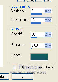 qui puoi trovare qualche risposta ai tuoi dubbi. Se l'argomento che ti interessa non è presente, ti prego di segnalarmelo. Questo tutorial è una creazione di ©Titoune e non può essere copiato su altri siti nè essere offerto per il download. Lo stesso vale per la mia traduzione. Il tutorial è stato creato con Corel17, ma può essere eseguito anche con le altre versioni di PSP. Secondo la versione utilizzata (anteriore a PSP X) potresti ottenere dei risultati differenti. Dalla versione X4, il comando Immagine>Rifletti è stato sostituito con Immagine>Capovolgi in orizzontale, e il comando Immagine>Capovolgi con Immagine>Capovolgi in verticale. Nelle versioni X5 e X6, le funzioni sono state migliorate rendendo disponibile il menu Oggetti. Con il nuovo X7 sono tornati i comandi Rifletti/Capovolgi, ma con nuove differenze. Vedi la scheda sull'argomento qui Per tradurre il tutorial ho usato PSP X. Occorrente: Un tube a scelta. Il resto del materiale qui Filtri in caso di dubbi, ricorda di consultare la mia sezione filtri qui Adjust - Variations qui ![]() 1. Apri una nuova immagine trasparente 750 x 600 pixels. Selezione>Seleziona tutto. 2. Apri l'immagine christmas-snowy-landscape_1048-2833 e vai a Modifica>Copia. Torna al tuo lavoro e vai a Modifica>Incolla nella selezione. Selezione>Deseleziona. 3. Effetti>Plugins>Adjust - Variations. Un clic su Original per annullare eventuali precedenti settaggi memorizzati dal filtro, un clic su More Green, un clic su More Cyan, un clic su Darker e ok. 4. Apri l'elemento SDHD-Element39 e vai a Modifica>Copia. Torna al tuo lavoro e vai a Modifica>Incolla come nuovo livello. Spostalo nella parte inferiore.Vedi l'esempio finale. 5. Effetti>Effetti 3D>Sfalsa ombra, colore #145964. ![]() 6. Apri l'elemento SDHD-Frame (11) e vai a Modifica>Copia. Torna al tuo lavoro e vai a Modifica>Incolla come nuovo livello. Non spostarlo. 7. Attiva lo strumento Bacchetta magica ![]() e clicca al centro della cornice per selezionarla. Selezione>Modifica>Espandi - 15 pixels. 8. Livelli>Nuovo livello raster. Livelli>Disponi>Sposta giù. 9. Apri l'immagine [wallcoo_com]_winter_snow_01 e vai a Modifica>Copia. Torna al tuo lavoro e vai a Modifica>Incolla nella selezione. Selezione>Deseleziona. Effetti>Plugins>Adjust - Variations, con i settaggi precedenti. 10. Ritorna sul livello della cornice. Effetti>Effetti 3D>Sfalsa ombra, colore #145964. ![]() Ripeti l'Effetto Sfalsa ombra, cambiando verticale e orizzontale con -3/3. 11. Apri l'elemento SDHD-WOA (4) e vai a Modifica>Copia. Torna al tuo lavoro e vai a Modifica>Incolla come nuovo livello. Spostalo nella parte superiore del paesaggio.Vedi l'esempio finale. Effetti>Effetti 3D>Sfalsa ombra, colore #145964. ![]() 12. Apri l'elemento SDHD-Element3 (6) e vai a Modifica>Copia. Torna al tuo lavoro e vai a Modifica>Incolla come nuovo livello. Spostalo nella parte inferiore destra.Vedi l'esempio finale. Effetti>Effetti 3D>Sfalsa ombra, con i settaggi precedenti. 13. Apri l'elemento SDHD-Element18 (6) e vai a Modifica>Copia. Torna al tuo lavoro e vai a Modifica>Incolla come nuovo livello. Spostalo nella parte inferiore destra.Vedi l'esempio finale. Effetti>Effetti 3D>Sfalsa ombra, con i settaggi precedenti. 14. Apri l'elemento SDHD-Element5 e vai a Modifica>Copia. Torna al tuo lavoro e vai a Modifica>Incolla come nuovo livello. Spostalo nella parte inferiore.Vedi l'esempio finale. Effetti>Effetti 3D>Sfalsa ombra, con i settaggi precedenti. 15. Apri l'elemento SDHD-Element5_1 e vai a Modifica>Copia. Torna al tuo lavoro e vai a Modifica>Incolla come nuovo livello. Spostalo nella parte inferiore.Vedi l'esempio finale. Effetti>Effetti 3D>Sfalsa ombra, con i settaggi precedenti. 16. Apri l'elemento SDHD-Element5_2 e vai a Modifica>Copia. Torna al tuo lavoro e vai a Modifica>Incolla come nuovo livello. Spostalo nella parte inferiore.![]() Effetti>Effetti 3D>Sfalsa ombra, con i settaggi precedenti. 17. Apri il tuo tube e vai a Modifica>Copia. Torna al tuo lavoro e vai a Modifica>Incolla come nuovo livello. Immagine>Ridimensiona, se e quanto necessario, tutti i livelli non selezionato. Spostalo come preferisci o vedi il mio esempio.Effetti>Effetti 3D>Sfalsa ombra, con i settaggi precedenti. 18. Attiva il livello inferiore. Modifica>Copia. Selezione>Seleziona tutto. 19. Immagine>Ritaglia la selezione. Immagine>Dimensioni tela - 800 x 650 pixels. ![]() 20. Livelli>Nuovo livello raster. Livelli>Disponi>Sposta giù. Selezione>Seleziona tutto. Modifica>Incolla nella selezione. Selezione>Deseleziona. 21. Attiva nuovamente il livello superiore. Apri l'elemento Frame e vai a Modifica>Copia. Torna al tuo lavoro e vai a Modifica>Incolla come nuovo livello. Effetti>Effetti 3D>Sfalsa ombra, colore #145964. ![]() Ripeti l'Effetto Sfalsa ombra, cambiando verticale e orizzontale con -3/3. 23. Apri l'elemento Corners e vai a Modifica>Copia. Torna al tuo lavoro e vai a Modifica>Incolla come nuovo livello. Effetti>Effetti 3D>Sfalsa ombra, con i settaggi precedenti. Firma il tuo lavoro. Livelli>Unisci>Unisci tutto e salva in formato jpg. ![]() Se hai problemi o dubbi, o trovi un link non funzionante, scrivimi. 7 Dicembre