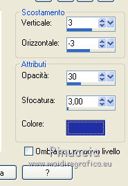 qui puoi trovare qualche risposta ai tuoi dubbi. Se l'argomento che ti interessa non è presente, ti prego di segnalarmelo. Questo tutorial è una creazione di ©Titoune e non può essere copiato su altri siti nè essere offerto per il download. Lo stesso vale per la mia traduzione. Il tutorial è stato creato con Corel17, ma può essere eseguito anche con le altre versioni di PSP. Secondo la versione utilizzata (anteriore a PSP X) potresti ottenere dei risultati differenti. Dalla versione X4, il comando Immagine>Rifletti è stato sostituito con Immagine>Capovolgi in orizzontale, e il comando Immagine>Capovolgi con Immagine>Capovolgi in verticale. Nelle versioni X5 e X6, le funzioni sono state migliorate rendendo disponibile il menu Oggetti. Con il nuovo X7 sono tornati i comandi Rifletti/Capovolgi, ma con nuove differenze. Vedi la scheda sull'argomento qui Per tradurre il tutorial ho usato PSP X. Occorrente: Un tube a scelta. Il resto del materiale qui Il tube utilizzato è di Odette. Lo scrap "12190726545_scrap è una creazione di Nikita Filtri in caso di dubbi, ricorda di consultare la mia sezione filtri qui Filters Unlimited 2.0 qui Simple - Top Left Mirror qui I filtri Simple si possono usare da soli o importati in Filters Unlimited (come fare vedi qui) Se un filtro fornito appare con questa icona ![]() 1. Apri l'immagine 12190726545_scrap, che è composta da vari livelli. Attiva il livello papier5 e vai a Modifica>Copia. 2. Apri una nuova immagine trasparente 750 x 600 pixels. Selezione>Seleziona tutto. Modifica>Incolla nella selezione. Selezione>Deseleziona. Immagine>Rifletti. 3. Effetti>Effetti di riflesso>Specchio rotante. ![]() 4. Apri l'elemento frame, e vai a Modifica>Copia. Torna al tuo lavoro e vai a Modifica>Incolla come nuovo livello. 5. Attiva lo strumento Bacchetta magica ![]() e clicca al centro della cornice per selezionarla. Selezione>Modifica>Espandi - 3 pixels. 6. Livelli>Nuovo livello raster. Livelli>Disponi>Sposta giù. 7. Apri l'elemento Feb Series Seascapes 3 - 3mkm, e vai a Modifica>Copia. Torna al tuo lavoro e vai a Modifica>Incolla nella selezione. Selezione>Deseleziona. 8. Attiva nuovamente il livello della cornice. Effetti>Effetti 3D>Sfalsa ombra, colore #212fa7. ![]() Ripeti l'Effetto Sfalsa ombra, cambiando verticale e orizzontale con -3. 9. Attiva il livello Raster 1. Apri l'elemento sands45 e vai a Modifica>Copia. Torna al tuo lavoro e vai a Modifica>Incolla come nuovo livello. Spostalo in basso a sinistra.Vedi l'esempio finale. Livelli>Duplica. Immagine>Rifletti. 10. Attiva il livello superiore. Attiva nuovamente l'immagine 12190726545_scrap e copia il livello "branches-palmier". Torna al tuo lavoro e vai a Modifica>Incolla come nuovo livello. 11. Immagine>Ridimensiona, al 55%, tutti i livelli non selezionato. Spostalo in alto a destra.Vedi l'esempio finale. Effetti>Effetti 3D>Sfalsa ombra, colore #212fa7. ![]() Livelli>Duplica. Immagine>Rifletti. 12. Ritorna sull'immagine 12190726545_scrap e copia il livello "filet". Torna al tuo lavoro e vai a Modifica>Incolla come nuovo livello. Spostalo in basso a destra.Vedi l'esempio finale. Effetti>Effetti 3D>Sfalsa ombra, con i settaggi precedenti. 13. Ritorna sull'immagine 12190726545_scrap e copia il livello "hibiscus1". Torna al tuo lavoro e vai a Modifica>Incolla come nuovo livello. Spostalo in basso a destra.Vedi l'esempio finale. Effetti>Effetti 3D>Sfalsa ombra, con i settaggi precedenti. 14. Ritorna sull'immagine 12190726545_scrap e copia il livello "coco". Torna al tuo lavoro e vai a Modifica>Incolla come nuovo livello. Spostalo in basso a destra.Vedi l'esempio finale. Effetti>Effetti 3D>Sfalsa ombra, con i settaggi precedenti. 15. Ritorna sull'immagine 12190726545_scrap e copia il livello "planche". Torna al tuo lavoro e vai a Modifica>Incolla come nuovo livello. 16. Immagine>Ridimensiona, al 75%, tutti i livelli non selezionato. Immagine>Ruota per gradi - 10 gradi a destra. ![]() Spostalo in basso a sinistra.Vedi l'esempio finale. Effetti>Effetti 3D>Sfalsa ombra, con i settaggi precedenti. 17. Ritorna sull'immagine 12190726545_scrap e copia il livello "bateau". Torna al tuo lavoro e vai a Modifica>Incolla come nuovo livello. 18. Immagine>Ridimensiona, all'85%, tutti i livelli non selezionato. Spostalo in basso a sinistra.Vedi l'esempio finale. Effetti>Effetti 3D>Sfalsa ombra, con i settaggi precedenti. 19. Ritorna sull'immagine 12190726545_scrap e copia il livello "hibiscus2". Torna al tuo lavoro e vai a Modifica>Incolla come nuovo livello. Spostalo in basso a sinistra.Vedi l'esempio finale. Effetti>Effetti 3D>Sfalsa ombra, con i settaggi precedenti. 20. Apri l'elemento Banner e vai a Modifica>Copia. Torna al tuo lavoro e vai a Modifica>Incolla come nuovo livello. Spostalo nella parte superiore della cornice.Vedi l'esempio finale. Effetti>Effetti 3D>Sfalsa ombra, con i settaggi precedenti. 21. Apri l'elemento wordart e vai a Modifica>Copia. Torna al tuo lavoro e vai a Modifica>Incolla come nuovo livello. Spostalo sul banner.Vedi l'esempio finale. Effetti>Effetti 3D>Sfalsa ombra, con i settaggi precedenti. 22. Apri il tuo tube e vai a Modifica>Copia. Torna al tuo lavoro e vai a Modifica>Incolla come nuovo livello. Immagine>Ridimensiona, se e quanto necessario, tutti i livelli non selezionato. Spostalo dove preferisci o vedi il mio esempio.Effetti>Effetti 3D>Sfalsa ombra, con i settaggi precedenti. 23. Attiva il livello inferiore. Modifica>Copia. Selezione>Seleziona tutto. Immagine>Ritaglia la selezione. 24. Immagine>Dimensioni tela - 800 x 650 pixels. ![]() 25. Livelli>Nuovo livello raster. Livelli>Disponi>Sposta giù. Selezione>Seleziona tutto. Modifica>Incolla nella selezione. 26. Selezione>Modifica>Contrai - 25 pixels. Selezione>Inverti. Selezione>Innalza selezione a livello. 27. Effetti>Effetti di trama>Plastica morbida. ![]() Immagine>Capovolgi. Effetti>Plugins>Simple - Top Left Mirror. 28. Effetti>Effetti 3D>Smusso a incasso. ![]() Selezione>Deseleziona. 29. Attiva il livello superiore. Firma il