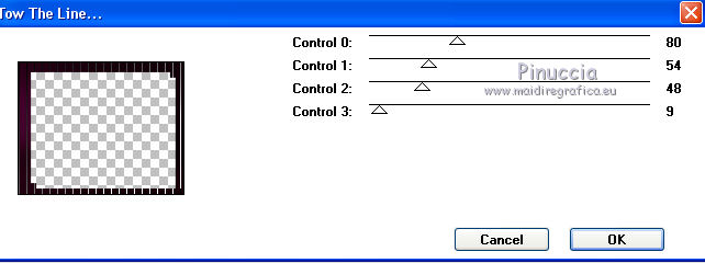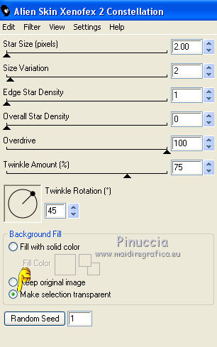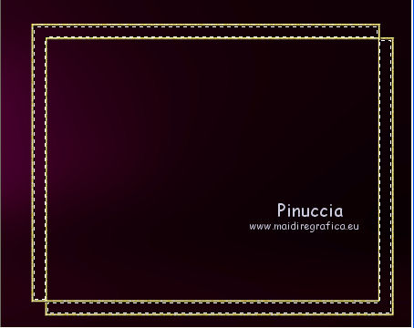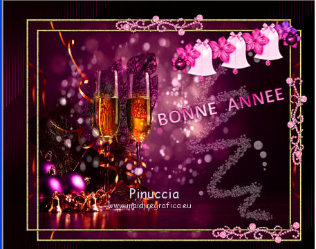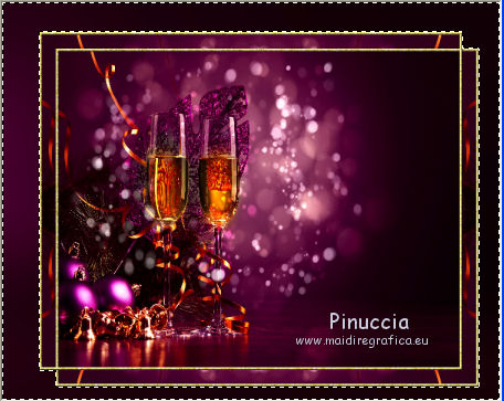 qui puoi trovare qualche risposta ai tuoi dubbi. Se l'argomento che ti interessa non è presente, ti prego di segnalarmelo. Questo tutorial è una creazione di ©Titoune e non può essere copiato su altri siti nè essere offerto per il download. Lo stesso vale per la mia traduzione. Il tutorial è stato creato con Corel17, ma può essere eseguito anche con le altre versioni di PSP. Secondo la versione utilizzata (anteriore a PSP X) potresti ottenere dei risultati differenti. Dalla versione X4, il comando Immagine>Rifletti è stato sostituito con Immagine>Capovolgi in orizzontale, e il comando Immagine>Capovolgi con Immagine>Capovolgi in verticale. Nelle versioni X5 e X6, le funzioni sono state migliorate rendendo disponibile il menu Oggetti. Con il nuovo X7 sono tornati i comandi Rifletti/Capovolgi, ma con nuove differenze. Vedi la scheda sull'argomento qui Per tradurre il tutorial ho usato PSP X. Occorrente: Un tube a scelta. Il resto del materiale qui Il tube utilizzato è di Occhiblu. Filtri in caso di dubbi, ricorda di consultare la mia sezione filtri qui Simple - Top Left Mirror qui Tramages - Tow the line qui Filters Unlimited 2.0 qui Alien Skin Xenofex 2 - Constellation qui I filtri Simple e Tramages si possono usare da soli o importati in Filters Unlimited (come fare vedi qui) Se un filtro fornito appare con questa icona Animation Shop qui ![]() 1. Apri una nuova immagine trasparente de 750 x 600 pixels. Selezione>Seleziona tutto. 2. Apri l'elemento tuile, e vai a Modifica>Copia. Torna al tuo lavoro e vai a Modifica>Incolla nella selezione. Selezione>Deseleziona. 3. Regola>Sfocatura>Sfocatura gaussiana - raggio 45. ![]() Nuovo livello raster. Selezione>Seleziona tutto. Apri l'elemento SophisticatSimone_A_New_Beginning_Paper_5 e vai a Modifica>Copia. Torna al tuo lavoro e vai a Modifica>Incolla nella selezione. 5. Selezione>Modifica>Contrai - 5 pixels. Premi sulla tastiera il tasto CANC ![]() Selezione>Inverti. 6. Effetti>Effetti 3D>Smusso a incasso. ![]() Selezione>Deseleziona. 7. Immagine>Ridimensiona, all'85%, tutti i livelli non selezionato. Livelli>Duplica. Attiva il livello sottostante dell'originale. 8. Effetti>Effetti di immagine>Scostamento. ![]() 9. Ritorna sul livello della copia. Livelli>Unisci>Unisci giù. 10. Attiva lo strumento Bacchetta magica , modalità Aggiungi,e clicca nei due bordi delle cornici per selezionarli. ![]() Selezione>Modifica>Espandi - 5 pixels. 11. Livelli>Nuovo livello raster. Livelli>Disponi>Sposta giù. Apri l'immagine Fotolia_47331456_XS1 e vai a Modifica>Copia. Torna al tuo lavoro e vai a Modifica>Incolla nella selezione. Effetti>Plugins>Simple - Top Left Mirror. Effetti>Effetti 3D>Smusso a incasso, con i settaggi precedenti. Selezione>Deseleziona. 12. Ritorna sul livello della cornice. Attiva lo strumento Bacchetta magica ![]() e clicca al centro della cornice per selezionarla. Selezione>Modifica>Espandi - 5 pixels. 13. Livelli>Nuovo livello raster. Livelli>Disponi>Sposta giù. Modifica>Incolla nella selezione (l'immagine Fotolia_47331456_XS1 è sempre in memoria). Selezione>Deseleziona. 14. Attiva nuovamente il livello della cornice. Attiva lo strumento Bacchetta magica ![]() e clicca nella parte esterna della cornice per selezionarla. ![]() Attiva il livello Raster 1. Selezione>Innalza selezione a livello. Effetti>Plugins>Tramages - Tow the line, con i settaggi standard. ![]() Rinomina questo livello "animazione". Cambia la modalità di miscelatura di questo livello in Luce diffusa. 15. Attiva nuovamente il livello della cornice. Effetti>Effetti 3D>Sfalsa ombra, colore #0b0504. ![]() Ripeti l'Effetto Sfalsa ombra, cambiando verticale e orizzontale con -3/3. 16. Apri l'elemento SophisticatSimone_A_New_Beginning_Element_68 e vai a Modifica>Copia. Torna al tuo lavoro e vai a Modifica>Incolla come nuovo livello. Spostalo nella parte destra della cornice.Vedi l'esempio finale. Cambia la modalità di miscelatura di questo livello in Luminanza (esistente) e abbassa l'opacità al 50%. 17. Apri l'elemento e05833c8 e vai a Modifica>Copia. Torna al tuo lavoro e vai a Modifica>Incolla come nuovo livello. Spostalo nella parte superiore destra della cornice.Vedi l'esempio finale. Effetti>Effetti 3D>Sfalsa ombra, colore #0b0504. ![]() 18. Apri l'elemento e05833c8 (2) e vai a Modifica>Copia. Torna al tuo lavoro e vai a Modifica>Incolla come nuovo livello. Spostalo nella parte destra della cornice.Vedi l'esempio finale. Effetti>Effetti 3D>Sfalsa ombra, con i settaggi precedenti. 19. Apri l'elemento SophisticatSimone_A_New_Beginning_Element_9 e vai a Modifica>Copia. Torna al tuo lavoro e vai a Modifica>Incolla come nuovo livello. Spostalo nella parte destra della cornice.Vedi l'esempio finale. Effetti>Effetti 3D>Sfalsa ombra, con i settaggi precedenti. 20. Livelli>Duplica. Immagine>Ruota per gradi - 90 gradi a destra. ![]() Spostalo in basso a destra.Vedi l'esempio finale. Di nuovo Livelli>Duplica. Spostalo in alto.![]() 21. Apri l'elemento 2017_purple_Gold_Large_PNG_Transparent_Image e vai a Modifica>Copia. Torna al tuo lavoro e vai a Modifica>Incolla come nuovo livello. Spostalo in basso a destra.Vedi l'esempio finale. Niente Sfalsa ombra. 22. Apri l'elemento SophisticatSimone_A_New_Beginning_Element_47 e vai a Modifica>Copia. Torna al tuo lavoro e vai a Modifica>Incolla come nuovo livello. Spostalo nella parte superiore sinistra della cornice.Vedi l'esempio finale. Effetti>Effetti 3D>Sfalsa ombra, con i settaggi precedenti. 23. Apri il tuo tube e vai a Modifica>Copia. Torna al tuo lavoro e vai a Modifica>Incolla come nuovo livello. Immagine>Ridimensiona, se e quanto necessario, tutti i livelli non selezionato. Spostalo in basso a sinistra.Vedi l'esempio finale. Effetti>Effetti 3D>Sfalsa ombra, con i settaggi precedenti. 24. Assicurati di essere posizionato sul livello superiore. Firma il tuo lavoro. Livelli>Nuovo livello raster. Selezione>Seleziona tutto. Apri l'elemento SophisticatSimone_A_New_Beginning_Paper_5 e vai a Modifica>Copia. Torna al tuo lavor
