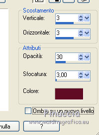 qui puoi trovare qualche risposta ai tuoi dubbi. Se l'argomento che ti interessa non è presente, ti prego di segnalarmelo. Questo tutorial è una creazione di ©Titoune e non può essere copiato su altri siti nè essere offerto per il download. Lo stesso vale per la mia traduzione. Il tutorial è stato creato con Corel18, ma può essere eseguito anche con le altre versioni di PSP. Secondo la versione utilizzata (anteriore a PSP X) potresti ottenere dei risultati differenti. Dalla versione X4, il comando Immagine>Rifletti è stato sostituito con Immagine>Capovolgi in orizzontale, e il comando Immagine>Capovolgi con Immagine>Capovolgi in verticale. Nelle versioni X5 e X6, le funzioni sono state migliorate rendendo disponibile il menu Oggetti. Con il nuovo X7 sono tornati i comandi Rifletti/Capovolgi, ma con nuove differenze. Vedi la scheda sull'argomento qui Per tradurre il tutorial ho usato PSP X. Occorrente: Un tube a scelta. Il resto del materiale qui Il tube usato è di Nicky ![]() 1. Apri una nuova immagine trasparente 750 x 600 pixels. Selezione>Seleziona tutto. 2. Apri l'elemento Candy's Winter Papers (8), e vai a Modifica>Copia. Torna al tuo lavoro e vai a Modifica>Incolla nella selezione. Mantieni selezionato. 3. Livelli>Nuovo livello raster. Apri l'elemento Candy's Winter Papers (6), e vai a Modifica>Copia. Torna al tuo lavoro e vai a Modifica>Incolla nella selezione. Abbassa l'opacità di questo livello al 60%. Selezione>Deseleziona. 4. Apri l'elemento Candy's Winter Frames (6) e vai a Modifica>Copia. Torna al tuo lavoro e vai a Modifica>Incolla come nuovo livello. Non spostarlo. 5. Attiva lo strumento Bacchetta magica ![]() e clicca al centro della cornice per selezionarla. Selezione>Modifica>Espandi - 5 pixels. Livelli>Nuovo livello raster. Livelli>Disponi>Sposta giù. 6. Apri l'elemento Candy's Winter Papers (4), e vai a Modifica>Copia. Torna al tuo lavoro e vai a Modifica>Incolla nella selezione. Selezione>Deseleziona. 7. Apri l'elemento Candy's Winter (82), e vai a Modifica>Copia. Torna al tuo lavoro e vai a Modifica>Incolla come nuovo livello. 8. Effetti>Effetti 3D>Sfalsa ombra, colore #610d24. ![]() 9. Apri l'elemento Candy's Winter (41), e vai a Modifica>Copia. Torna al tuo lavoro e vai a Modifica>Incolla come nuovo livello. Spostalo nella parte superiore della cornice.Vedi l'esempio finale. Effetti>Effetti 3D>Sfalsa ombra, con i settaggi precedenti. 10. Apri l'elemento Candy's Winter (39), e vai a Modifica>Copia. Torna al tuo lavoro e vai a Modifica>Incolla come nuovo livello. Spostalo nella parte inferiore della cornice.Vedi l'esempio finale. Effetti>Effetti 3D>Sfalsa ombra, con i settaggi precedenti. 11. Effetti>Effetti 3D>Sfalsa ombra, con i settaggi precedenti. 12. Apri l'elemento Candy's Winter (46), e vai a Modifica>Copia. Torna al tuo lavoro e vai a Modifica>Incolla come nuovo livello. Spostalo nella parte inferiore della cornice.Vedi l'esempio finale. Sposta questo livello sotto il livello del paesaggio. Effetti>Effetti 3D>Sfalsa ombra, con i settaggi precedenti. 13. Attiva il livello superiore. Apri l'elemento Candy's Winter (33), e vai a Modifica>Copia. Torna al tuo lavoro e vai a Modifica>Incolla come nuovo livello. Spostalo nella cornice, in alto a destra.![]() Effetti>Effetti 3D>Sfalsa ombra, con i settaggi precedenti. 14. Apri l'elemento Candy's Winter (29), e vai a Modifica>Copia. Torna al tuo lavoro e vai a Modifica>Incolla come nuovo livello. Spostalo nella parte destra della cornice.Vedi l'esempio finale. Effetti>Effetti 3D>Sfalsa ombra, con i settaggi precedenti. 15. Apri l'elemento Candy's Winter (37), e vai a Modifica>Copia. Torna al tuo lavoro e vai a Modifica>Incolla come nuovo livello. Spostalo nella parte inferiore destra della cornice.Vedi l'esempio finale. Effetti>Effetti 3D>Sfalsa ombra, con i settaggi precedenti. 16. Apri l'elemento Candy's Winter (30), e vai a Modifica>Copia. Torna al tuo lavoro e vai a Modifica>Incolla come nuovo livello. Spostalo nella parte inferiore destra della cornice.Vedi l'esempio finale. Effetti>Effetti 3D>Sfalsa ombra, con i settaggi precedenti. 17. Apri l'elemento Candy's Winter (6), e vai a Modifica>Copia. Torna al tuo lavoro e vai a Modifica>Incolla come nuovo livello. Spostalo nella parte inferiore destra della cornice.Vedi l'esempio finale. Effetti>Effetti 3D>Sfalsa ombra, con i settaggi precedenti. 18. Apri l'elemento Candy's Winter (34), e vai a Modifica>Copia. Torna al tuo lavoro e vai a Modifica>Incolla come nuovo livello. Spostalo nella parte inferiore destra della cornice.Vedi l'esempio finale. Effetti>Effetti 3D>Sfalsa ombra, con i settaggi precedenti. 19. Apri l'elemento Candy's Winter (18), e vai a Modifica>Copia. Torna al tuo lavoro e vai a Modifica>Incolla come nuovo livello. Spostalo nella parte inferiore destra della cornice.Vedi l'esempio finale. Effetti>Effetti 3D>Sfalsa ombra, con i settaggi precedenti. 20. Apri l'elemento Candy's Winter (7), e vai a Modifica>Copia. Torna al tuo lavoro e vai a Modifica>Incolla come nuovo livello. Spostalo nella parte inferiore destra della cornice.Vedi l'esempio finale. Effetti>Effetti 3D>Sfalsa ombra, con i settaggi precedenti. 21. Apri l'elemento Candy's Winter (1), e vai a Modifica>Copia. Torna al tuo lavoro e vai a Modifica>Incolla come nuovo livello. Spostalo nella parte inferiore destra della cornice.![]() Effetti>Effetti 3D>Sfalsa ombra, con i settaggi precedenti. 22. Apri l'elemento Candy's Winter (14), e vai a Modifica>Copia. Torna al tuo lavoro e vai a Modifica>Incolla come nuovo livello. Spostalo nella parte inferiore della cornice.Vedi l'esempio finale. Effetti>Effetti 3D>Sfalsa ombra, con i settaggi precedenti. 23. Apri l'elemento Candy's Winter (28), e vai a Modifica>Copia. Torna al tuo lavoro e vai a Modifica>Incolla come nuovo livello. Spostalo nella parte inferiore della cornice.Vedi l'esempio finale. Effetti>Effetti 3D>Sfalsa ombra, con i settaggi precedenti. 24. Apri l'elemento Candy's Winter (20), e vai a Modifica>Copia. Torna al tuo lavor