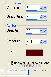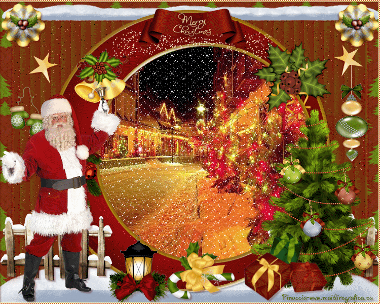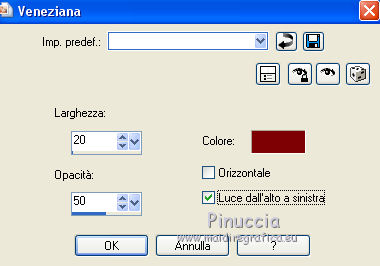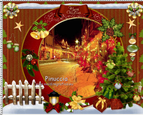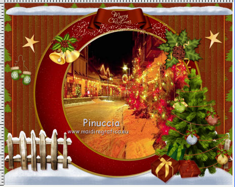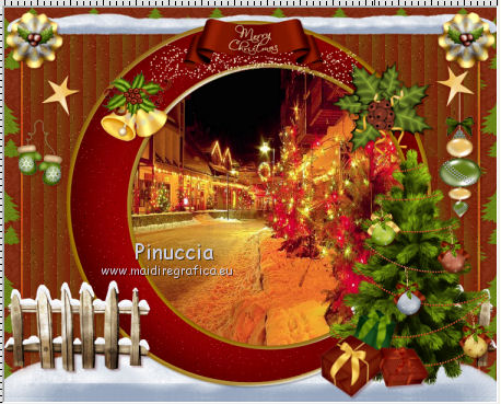 clicca al centro della cornice per selezionarla.Selezione>Modifica>Espandi - 3 pixels. Selezione>Inverti. Selezione>Modifica>Contrai - 25 pixels. 6. Attiva il livello Raster 1. Selezione>Innalza selezione a livello. Regola>Sfocatura>Sfocatura gaussiana - raggio 25. ![]() 7. Effetti>Effetti di trama>Veneziana - colore #7e0304. ![]() 8. Selezione>Modifica>Seleziona bordature selezione. ![]() Selezione>Innalza selezione a livello. Selezione>Deseleziona. Effetti>Effetti di bordo>Aumenta. Livelli>Unisci>Unisci giù. Regola>Aggiungi/Rimuovi disturbo>Aggiungi disturbo, con i settaggi precedenti. 9. Effetti>Effetti 3D>Sfalsa ombra, colore #570100. ![]() Ripeti l'Effetto Sfalsa ombra, cambiando verticale e orizzontale con -3. 10. Attiva nuovamente il livello della cornice. Clicca al centro della cornice per selezionarla con la bacchetta magica ![]() Selezione>Modifica>Espandi - 3 pixels. 11. Livelli>Nuovo livello raster. Livelli>Disponi>Sposta giù. 12. Apri l'immagine New Year Wallpaper (18), e vai a Modifica>Copia. Torna al tuo lavoro e vai a Modifica>Incolla nella selezione. Selezione>Deseleziona. 13. Apri l'elemento neige, e vai a Modifica>Copia. Torna al tuo lavoro e vai a Modifica>Incolla come nuovo livello. Spostalo in basso, vedi l'esempio finale.Porta questo livello sotto il livello della cornice. Effetti>Effetti 3D>Sfalsa ombra, colore #570100. ![]() 14. Attiva il livello superiore. Apri l'elemento hpd_MOTS_El41, e vai a Modifica>Copia. Torna al tuo lavoro e vai a Modifica>Incolla come nuovo livello. Spostalo in basso a sinistra.Vedi l'esempio finale. Effetti>Effetti 3D>Sfalsa ombra, con i settaggi precedenti. Livelli>Duplica. Immagine>Rifletti. 15. Apri l'elemento hpd_MOTS_El22, e vai a Modifica>Copia. Torna al tuo lavoro e vai a Modifica>Incolla come nuovo livello. Spostalo a destra.Vedi l'esempio finale. Effetti>Effetti 3D>Sfalsa ombra, con i settaggi precedenti. 16. Copia e incolla sul tuo lavoro gli elementi hpd_MOTS_El15, hpd_MOTS_El16,hpd_MOTS_El17 et hpd_MOTS_El18. Per ciascuno: Immagine>Ridimensiona, al 25%, tutti i livelli non selezionato. Posiziona gli elementi sull'albero, a tuo piacimento.![]() Effetti>Effetti 3D>Sfalsa ombra, con i settaggi precedenti. 17. Apri l'elemento hpd_MOTS_El53, e vai a Modifica>Copia. Torna al tuo lavoro e vai a Modifica>Incolla come nuovo livello. Spostalo ai piedi dell'albero.Vedi l'esempio finale. Effetti>Effetti 3D>Sfalsa ombra, con i settaggi precedenti. 18. Apri l'elemento hpd_MOTS_El32, e vai a Modifica>Copia. Torna al tuo lavoro e vai a Modifica>Incolla come nuovo livello. Spostalo in alto a destra.Vedi l'esempio finale. Effetti>Effetti 3D>Sfalsa ombra, con i settaggi precedenti. 19. Apri l'elemento hpd_MOTS_El71, e vai a Modifica>Copia. Torna al tuo lavoro e vai a Modifica>Incolla come nuovo livello. Spostalo nella parte superiore della cornice.Vedi l'esempio finale. Effetti>Effetti 3D>Sfalsa ombra, con i settaggi precedenti. 20. Apri l'elemento hpd_MOTS_El70, e vai a Modifica>Copia. Torna al tuo lavoro e vai a Modifica>Incolla come nuovo livello. Spostalo nella parte superiore sinistra della cornice.Vedi l'esempio finale. Effetti>Effetti 3D>Sfalsa ombra, con i settaggi precedenti. 21. Apri l'elemento hpd_MOTS_El21, e vai a Modifica>Copia. Torna al tuo lavoro e vai a Modifica>Incolla come nuovo livello. Spostalo nella parte superiore sinistra della cornice.Vedi l'esempio finale. Effetti>Effetti 3D>Sfalsa ombra, con i settaggi precedenti. 22. Apri l'elemento hpd_MOTS_El73, e vai a Modifica>Copia. Torna al tuo lavoro e vai a Modifica>Incolla come nuovo livello. Spostalo nella parte sinistra della cornice.![]() Effetti>Effetti 3D>Sfalsa ombra, con i settaggi precedenti. 23. Apri l'elemento hpd_MOTS_El29, e vai a Modifica>Copia. Torna al tuo lavoro e vai a Modifica>Incolla come nuovo livello. Spostalo nella parte sinistra della cornice.Vedi l'esempio finale. Effetti>Effetti 3D>Sfalsa ombra, con i settaggi precedenti. Livelli>Duplica. Immagine>Rifletti. 24. Apri l'elemento hpd_MOTS_El66, e vai a Modifica>Copia. Torna al tuo lavoro e vai a Modifica>Incolla come nuovo livello. Spostalo nella parte destra della cornice.![]() Effetti>Effetti 3D>Sfalsa ombra, con i settaggi precedenti. 25. Apri l'elemento hpd_MOTS_El47, e vai a Modifica>Copia. Torna al tuo lavoro e vai a Modifica>Incolla come nuovo livello. Spostalo nella parte sinistra della cornice.Vedi l'esempio finale. Effetti>Effetti 3D>Sfalsa ombra, con i settaggi precedenti. 26. Apri l'elemento hpd_MOTS_El14, e vai a Modifica>Copia. Torna al tuo lavoro e vai a Modifica>Incolla come nuovo livello. Spostalo nella parte sinistra della cornice.Vedi l'esempio finale. Effetti>Effetti 3D>Sfalsa ombra, con i settaggi precedenti. 27. Apri l'elemento hpd_MOTS_El46, e vai a Modifica>Copia. Torna al tuo lavoro e vai a Modifica>Incolla come nuovo livello. Spostalo nella parte inferiore della cornice.![]() Effetti>Effetti 3D>Sfalsa ombra, con i settaggi precedenti. 28. Apri il tuo tube, e vai a Modifica>Copia. Torna al tuo lavoro e vai a Modifica>Incolla come nuovo livello. Immagine>Ridimensiona, se e quanto necessario, tutti i livelli non selezionato. Spostalo dove preferisci o vedi il mio esempio.Effetti>Effetti 3D>Sfalsa ombra, con i settaggi precedenti. 29. Assicurati di essere posizionato sul livello superiore. Livelli>Nuovo livello raster. Selezione>Seleziona tutto. Apri l'elemento hpd_MOTS_P6, e vai a Modifica>Copia. Torna al tuo lavoro e vai a Modifica>Incolla nella selezione. Selezione>Modifica>Contrai - 3 pixels. Premi sulla tastiera il tasto CANC ![]() Selezione>Deseleziona. 30. Effetti>Plugins>Penta.com - Jeans, con i settaggi standard. ![]() Effetti>Effetti di bordo>Aumenta. Effetti>Effetti 3D>Sfalsa ombra, con i settaggi precedenti. Firma il tuo lavoro. 31. Attiva il livello della cornice. Attiva lo strumento Bacchetta magica ![]() e clicca al centro della cornice per selezionarla. Selezione>Modifica>Espandi - 3 pixels. Livelli>Nuovo livello raster. Livelli>Disponi>Sposta giù. 32. Apri il t