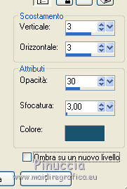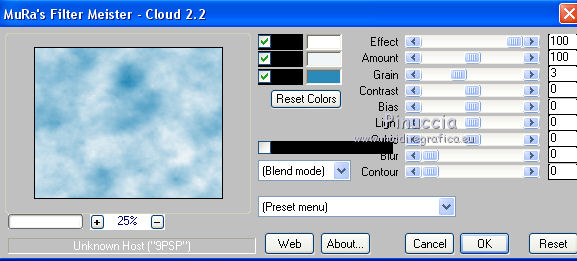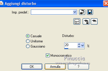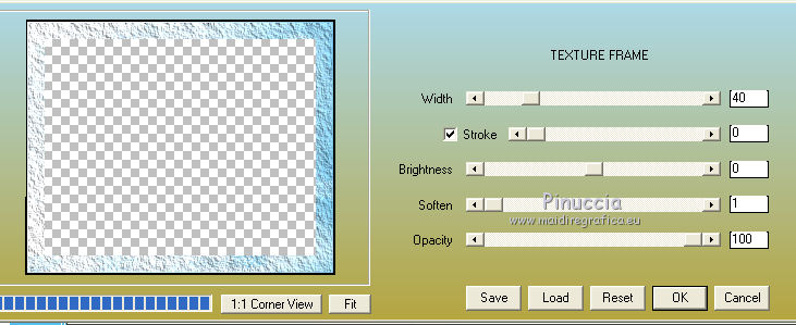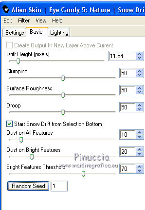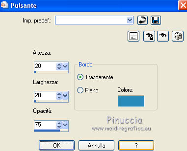qui puoi trovare qualche risposta ai tuoi dubbi. Se l'argomento che ti interessa non è presente, ti prego di segnalarmelo. Questo tutorial è una creazione di ©Titoune e non può essere copiato su altri siti nè essere offerto per il download. Lo stesso vale per la mia traduzione. Il tutorial è stato creato con Corel18, ma può essere eseguito anche con le altre versioni di PSP. Secondo la versione utilizzata (anteriore a PSP X) potresti ottenere dei risultati differenti. Dalla versione X4, il comando Immagine>Rifletti è stato sostituito con Immagine>Capovolgi in orizzontale, e il comando Immagine>Capovolgi con Immagine>Capovolgi in verticale. Nelle versioni X5 e X6, le funzioni sono state migliorate rendendo disponibile il menu Oggetti. Con il nuovo X7 sono tornati i comandi Rifletti/Capovolgi, ma con nuove differenze. Vedi la scheda sull'argomento qui Per tradurre il tutorial ho usato PSP X. Occorrente: Un tube a scelta. Il resto del materiale qui Filtri in caso di dubbi, ricorda di consultare la mia sezione filtri qui Filters Unlimited 2.0 qui Simple - Top Left Mirror qui Mura's Meister - Cloud qui Alien Skin Eye Candy 5 Nature - Snowdrift qui AAA Frames - Texture Frame qui I filtri Simple si possono usare da soli o importati in Filters Unlimited (come fare vedi qui) Se un filtro fornito appare con questa icona ![]() Metti la selezione nella cartella Selezioni. 1. Imposta il colore di primo piano con #f0f5f8, e il colore di sfondo con #2a8bba. 2. Apri una nuova immagine trasparente 750 x 600 pixels. Effetti>Plugins>Mura's Meister - Cloud, con i settaggi standard. ![]() 3. Livelli>Nuovo livello raster. Selezione>Carica/Salva selezione>Carica selezione da disco. Cerca e carica la selezione "selection_scrap_magic_winter". ![]() Riempi la selezione con il colore di sfondo.4. Effetti>Effetti di trama>Intessitura colore intessitura #2d8ab7 - colore spazio #f5ece7. ![]() 5. Effetti>Effetti 3D>Smusso a incasso. ![]() Selezione>Deseleziona. 6. Attiva lo strumento Bacchetta magica ![]() e clicca al centro della cornice per selezionarla. Selezione>Modifica>Espandi - 3 pixels. 7. Livelli>Nuovo livello raster. Livelli>Disponi>Sposta giù. Effetti>Plugins>Mura's Meister - Cloud, con i settaggi standard. 8. Livelli>Nuovo livello raster. Apri l'elemento 0_144f40_3ae752ee_L, e vai a Modifica>Copia. Torna al tuo lavoro e vai a Modifica>Incolla nella selezione. Selezione>Deseleziona. 9. Livelli>Duplica. Cambia la modalità di miscelatura di questo livello in Luce diffusa. 10. Apri l'elemento Icicle_ground, e vai a Modifica>Copia. Torna al tuo lavoro e vai a Modifica>Incolla come nuovo livello. Spostalo in basso.Porta questo livello sopra il livello Raster 1. 11. Livelli>Nuovo livello raster. Attiva lo strumento Selezione ![]() (non importa il tipo di selezione impostato, perchè con la selezione personalizzata si ottiene sempre un rettangolo) clicca sull'icona Selezione personalizzata ![]() e imposta i seguenti settaggi. ![]() 12. Livelli>Nuovo livello raster. Apri l'elemento Photo-Frame-Tenderness-of-Winter, e vai a Modifica>Copia. Torna al tuo lavoro e vai a Modifica>Incolla nella selezione. Selezione>Deseleziona. 13. Attiva il livello della cornice. Apri l'elemento Icicles, e vai a Modifica>Copia. Torna al tuo lavoro e vai a Modifica>Incolla come nuovo livello. Spostalo nella parte superiore della cornice.Porta questo livello sotto il livello della cornice. 14. Effetti>Effetti 3D>Sfalsa ombra, colore #19556f. ![]() Ripeti l'Effetto Sfalsa ombra, cambiando verticale e orizzontale con -3. 15. Attiva nuovamente il livello della cornice. Effetti>Plugins>Alien Skin Eye Candy 5 Nature - Snowdrift. ![]() 16. Apri l'elemento Winter_PNG_Clip_Art_Image, e vai a Modifica>Copia. Torna al tuo lavoro e vai a Modifica>Incolla come nuovo livello. Spostalo in basso.Effetti>Effetti 3D>Sfalsa ombra, con i settaggi precedenti. 17. Apri il tuo tube, e vai a Modifica>Copia. Torna al tuo lavoro e vai a Modifica>Incolla come nuovo livello. Immagine>Ridimensiona, se e quanto necessario, tutti i livelli non selezionato. Spostalo dove preferisci o vedi il mio esempio.Effetti>Effetti 3D>Sfalsa ombra, con i settaggi precedenti. 18. Livelli>Nuovo livello raster. Riempi con il colore di primo piano.Selezione>Seleziona tutto. 19. Selezione>Modifica>Contrai - 3 pixels. Premi sulla tastiera il tasto CANC ![]() Selezione>Inverti. 20. Regola>Aggiungi/Rimuovi disturbo>Aggiungi disturbo. ![]() Effetti>Effetti 3D>Smusso a incasso, con i settaggi precedenti. Selezione>Deseleziona. Effetti>Effetti 3D>Sfalsa ombra, con i settaggi precedenti. 21. Attiva nuovamente il livello inferiore. Selezione>Seleziona tutto. Immagine>Ritaglia la selezione. 22. Immagine>Dimensioni tela - 850 x 700 pixels. ![]() 23. Livelli>Nuovo livello raster. Livelli>Disponi>Sposta giù. Selezione>Seleziona tutto. Selezione>Modifica>Contrai - 50 pixels. Selezione>Inverti. 24. Apri la trama blue-christmas-background2, e vai a Modifica>Copia. Torna al tuo lavoro e vai a Modifica>Incolla nella selezione. 25. Effetti>Plugins>AAA Frames - Texture Frame. ![]() 26. Effetti>Effetti 3D>Pulsante. ![]() Selezione>Deseleziona. 27. Apri l'elemento img-thing, e vai a Modifica>Copia. Torna al tuo lavoro e vai a Modifica>Incolla come nuovo livello. Spostalo in alto a sinistra.28. Effetti>Plugins>Simple - Top Left Mirror. Effetti>Effetti 3D>Sfalsa ombra, con i settaggi precedenti. 29. Firma il tuo lavoro. Livelli>Unisci>Unisci tutto e salva in formato jpg. ![]() Se hai problemi o dubbi, o trovi un link non funzionante, scrivimi. 16 Gennaio 2016 |