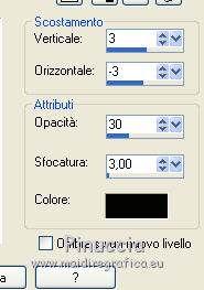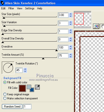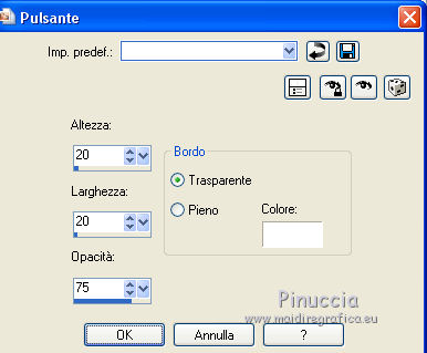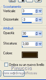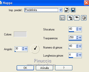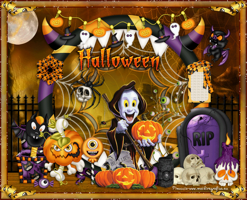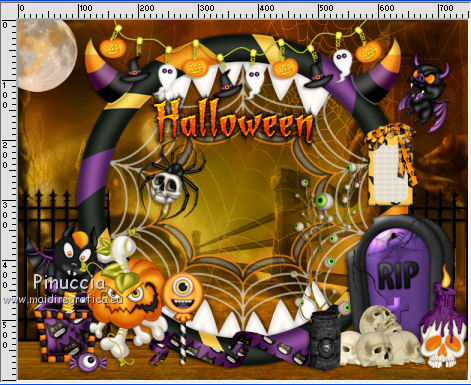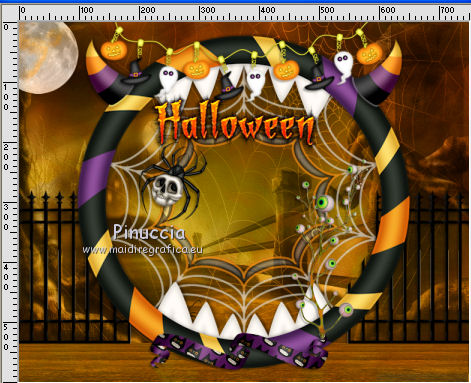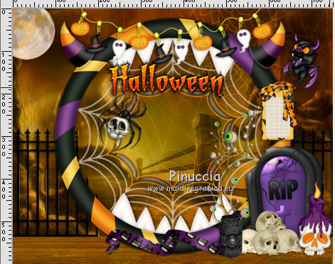 qui puoi trovare qualche risposta ai tuoi dubbi. Se l'argomento che ti interessa non è presente, ti prego di segnalarmelo. Questo tutorial è una creazione di ©Titoune e non può essere copiato su altri siti nè essere offerto per il download. Lo stesso vale per la mia traduzione. Il tutorial è stato creato con Corel17, ma può essere eseguito anche con le altre versioni di PSP. Secondo la versione utilizzata (anteriore a PSP X) potresti ottenere dei risultati differenti. Dalla versione X4, il comando Immagine>Rifletti è stato sostituito con Immagine>Capovolgi in orizzontale, e il comando Immagine>Capovolgi con Immagine>Capovolgi in verticale. Nelle versioni X5 e X6, le funzioni sono state migliorate rendendo disponibile il menu Oggetti. Con il nuovo X7 sono tornati i comandi Rifletti/Capovolgi, ma con nuove differenze. Vedi la scheda sull'argomento qui Per tradurre il tutorial ho usato PSP X. Occorrente: Un tube a scelta. Il resto del materiale qui Filtri in caso di dubbi, ricorda di consultare la mia sezione filtri qui Alien Skin Xenofex 2 - Constellation qui Animation Shop qui ![]() 1. Apri una nuova immagine trasparente 750 x 600 Pixels. Selezione>Seleziona tutto. 2. Apri l'elemento DCD_NOF_Paper04 e vai a Modifica>Copia. Torna al tuo lavoro e vai a Modifica>Incolla nella selezione. Livelli>Nuovo livello raster. 3. Apri l'immagine spider_web_hallowmas_-1920x1200 e vai a Modifica>Copia. Torna al tuo lavoro e vai a Modifica>Incolla nella selezione. Selezione>Deseleziona. Cambia la modalità di miscelatura di questo livello in Luminanza (esistente) e abbassa l'opacità al 65%. Livelli>Duplica. Cambia la modalità di miscelatura di questo livello in Luce diffusa. 4. Effetti>Effetti di trama>Nappa, con i settaggi standard. ![]() 5. Apri l'elemento ground e vai a Modifica>Copia. Torna al tuo lavoro e vai a Modifica>Incolla come nuovo livello. Spostalo in basso, vedi l'esempio finale.Cambia la modalità di miscealtura di questo livello in Luminanza. 6. Effetti>Effetti 3D>Sfalsa ombra, #301e00. ![]() 7. Apri l'elemento DCD_NOF_Frame02 e vai a Modifica>Copia. Torna al tuo lavoro e vai a Modifica>Incolla come nuovo livello. Non spostarlo. Effetti>Effetti 3D>Sfalsa ombra, colore #060503. ![]() Ripeti l'Effetto Sfalsa ombra, ma orizzontale e verticale -3/3. 8. Apri l'elemento DCD_NOF_Frame01 e vai a Modifica>Copia. Torna al tuo lavoro e vai a Modifica>Incolla come nuovo livello. Non spostarlo. Livelli>Disponi>Sposta giù. Abbassa l'opacità di questo livello al 65%. 9. Rimani sotto il livello della cornice. Apri l'elemento DCD_NOF_CemetaryFence e vai a Modifica>Copia. Torna al tuo lavoro e vai a Modifica>Incolla come nuovo livello. Posiziona il tube come nel mio esempio.Vedi l'esempio finale. Effetti>Effetti 3D>Sfalsa ombra, colore #060503. ![]() 10. Apri l'elemento DCD_NOF_SpiderSkull e vai a Modifica>Copia. Torna al tuo lavoro e vai a Modifica>Incolla come nuovo livello. Posiziona il tube come nel mio esempio.Vedi l'esempio finale. Effetti>Effetti 3D>Sfalsa ombra, colore #060503. ![]() 11. Apri l'elemento DCD_NOF_FullMoon e vai a Modifica>Copia. Torna al tuo lavoro e vai a Modifica>Incolla come nuovo livello. Spostalo nella parte superiore sinistra.Vedi l'esempio finale. Cambia la modalità di miscelatura di questo livello in Luminanza (esistente). Attiva nuovamente il livello superiore. 12. Apri l'elemento DCD_NOF_Ribbon02 e vai a Modifica>Copia. Torna al tuo lavoro e vai a Modifica>Incolla come nuovo livello. Spostalo nella parte inferiore della cornice.Vedi l'esempio finale. Effetti>Effetti 3D>Sfalsa ombra, con i settaggi precedenti. 13. Apri l'elemento DCD_NOF_EyestalkVine e vai a Modifica>Copia. Torna al tuo lavoro e vai a Modifica>Incolla come nuovo livello. Spostalo nella parte inferiore della cornice.Vedi l'esempio finale. Effetti>Effetti 3D>Sfalsa ombra, con i settaggi precedenti. 14. Apri l'elemento DCD_NOF_LightString e vai a Modifica>Copia. Torna al tuo lavoro e vai a Modifica>Incolla come nuovo livello. Spostalo nella parte superiore della cornice.Vedi l'esempio finale. Effetti>Effetti 3D>Sfalsa ombra, con i settaggi precedenti. 15. Apri l'elemento Fire_Halloween_PNG_Picture e vai a Modifica>Copia. Torna al tuo lavoro e vai a Modifica>Incolla come nuovo livello. Spostalo nella parte superiore della cornice.![]() Effetti>Effetti 3D>Sfalsa ombra, con i settaggi precedenti. 16. Apri l'elemento DCD_NOF_DevilBat e vai a Modifica>Copia. Torna al tuo lavoro e vai a Modifica>Incolla come nuovo livello. Spostalo nella parte superiore destra.Vedi l'esempio finale. Effetti>Effetti 3D>Sfalsa ombra, con i settaggi precedenti. 17. Apri l'elemento DCD_NOF_Tag e vai a Modifica>Copia. Torna al tuo lavoro e vai a Modifica>Incolla come nuovo livello. Spostalo nella parte destra della cornice.Vedi l'esempio finale. Effetti>Effetti 3D>Sfalsa ombra, con i settaggi precedenti. 18. Apri l'elemento DCD_NOF_Tombstone e vai a Modifica>Copia. Torna al tuo lavoro e vai a Modifica>Incolla come nuovo livello. Spostalo nella parte inferiore destra della cornice.Vedi l'esempio finale. Effetti>Effetti 3D>Sfalsa ombra, con i settaggi precedenti. 19. Apri l'elemento DCD_NOF_SkullPile e vai a Modifica>Copia. Torna al tuo lavoro e vai a Modifica>Incolla come nuovo livello. Spostalo nella parte inferiore destra della cornice.Vedi l'esempio finale. Effetti>Effetti 3D>Sfalsa ombra, con i settaggi precedenti. 20. Apri l'elemento DCD_NOF_SkullCandle e vai a Modifica>Copia. Torna al tuo lavoro e vai a Modifica>Incolla come nuovo livello. Spostalo nella parte inferiore destra della cornice.Vedi l'esempio finale. Effetti>Effetti 3D>Sfalsa ombra, con i settaggi precedenti. 21. Apri l'elemento DCD_NOF_Poison e vai a Modifica>Copia. Torna al tuo lavoro e vai a Modifica>Incolla come nuovo livello. Spostalo nella parte inferiore destra della cornice.![]() Effetti>Effetti 3D>Sfalsa ombra, con i settaggi precedenti. 22. Apri l'elemento DCD_NOF_BatInABox e vai a Modifica>Copia. Torna al tuo lavoro e vai a Modifica>Incolla come nu