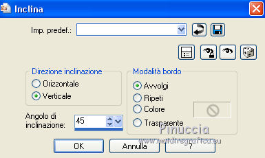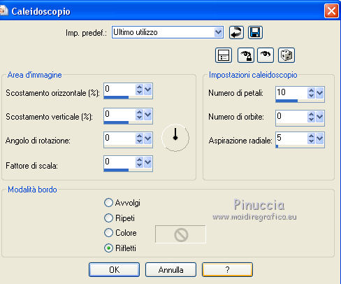 qui puoi trovare qualche risposta ai tuoi dubbi. Se l'argomento che ti interessa non è presente, ti prego di segnalarmelo. Questo tutorial è una creazione di ©Titoune e non può essere copiato su altri siti nè essere offerto per il download. Lo stesso vale per la mia traduzione. Il tutorial è stato creato con Corel17, ma può essere eseguito anche con le altre versioni di PSP. Secondo la versione utilizzata (anteriore a PSP X) potresti ottenere dei risultati differenti. Dalla versione X4, il comando Immagine>Rifletti è stato sostituito con Immagine>Capovolgi in orizzontale, e il comando Immagine>Capovolgi con Immagine>Capovolgi in verticale. Nelle versioni X5 e X6, le funzioni sono state migliorate rendendo disponibile il menu Oggetti. Con il nuovo X7 sono tornati i comandi Rifletti/Capovolgi, ma con nuove differenze. Vedi la scheda sull'argomento qui Per tradurre il tutorial ho usato PSP X. Occorrente: Un tube a scelta. Il resto del materiale qui Tube utilizzato SpringAngel_cookie49. Filtri in caso di dubbi, ricorda di consultare la mia sezione filtri qui Filters Unlimited 2.0 qui Simple - Left Right Wrap (bonus) qui I filtri Simple si possono usare da soli o importati in Filters Unlimited (come fare vedi qui) Se un filtro fornito appare con questa icona ![]() 1. Apri una nuova immagine trasparente 750 x 600 Pixels. Selezione>Seleziona tutto. 2. Apri l'immagine 2008229114414855_2 e vai a Modifica>Copia. Torna al tuo lavoro e vai a Modifica>Incolla nella selezione. 3. Selezione>Deseleziona. 4. Regola>Sfocatura>Sfocatura gaussiana - raggio 40. ![]() 5. Livelli>Duplica. Immagine>Ridimensiona, al 90%, tutti i livelli non selezionato. 6. Effetti>Effetti geometrici>Inclina. ![]() 7. Effetti>Plugins>Mehdi - Sorting Tiles. ![]() Effetti>Plugins>Simple - Left Right Wrap. 8. Effetti>Effetti geometrici>Prospettiva verticale. ![]() Immagine>Rifletti. 9. Effetti>Effetti di riflesso>Specchio rotante. ![]() Effetti>Effetti di bordo>Aumenta. 10. Effetti>Effetti 3D>Sfalsa ombra, colore #2e6fa8. ![]() Ripeti l'Effetto Sfalsa ombra, cambiando verticale e orizzontale con -3. 11. Apri l'elemento snpkgu_OSLS_CC_March_tag1 e vai a Modifica>Copia. Torna al tuo lavoro e vai a Modifica>Incolla come nuovo livello. 12. Effetti>Effetti di riflesso>Caleidoscopio. ![]() 13. Attiva lo strumento Bacchetta magica ![]() clicca al centro della cornice per selezionarla. ![]() Selezione>Modifica>Contrai - 10 pixels. Selezione>Modifica>Sfuma - 20 pixels. 14. Livelli>Nuovo livello raster. 15. Attiva nuovamente l'immagine 2008229114414855_2. Immagine>Immagine>Rifletti. Modifica>Copia. Torna al tuo lavoro e vai a Modifica>Incolla nella selezione. Selezione>Inverti. 16. Attiva il livello della cornice. Effetti>Effetti 3D>Smusso a incasso. ![]() Selezione>Deseleziona. Effetti>Effetti 3D>Sfalsa ombra, con i settaggi precedenti. 17. Livelli>Nuovo livello raster. Selezione>Seleziona tutto. Apri l'elemento snpkgu_OSLS_CC_March_stitches e vai a Modifica>Copia. Torna al tuo lavoro e vai a Modifica>Incolla nella selezione. Selezione>Deseleziona. Effetti>Effetti 3D>Sfalsa ombra, con i settaggi precedenti. 18. Apri l'elemento snpkgu_OSLS_CC_March_candy ray e vai a Modifica>Copia. Torna al tuo lavoro e vai a Modifica>Incolla come nuovo livello. Spostalo nell'angolo in alto a sinistra.Vedi l'esempio finale. Effetti>Effetti 3D>Sfalsa ombra, con i settaggi precedenti. Livelli>Duplica. Immagine>Rifletti. 19. Attiva il livello superiore. Apri l'elemento snpkgu_OSLS_CC_March_wordart e vai a Modifica>Copia. Torna al tuo lavoro e vai a Modifica>Incolla come nuovo livello. Spostalo nel paesaggio.Vedi l'esempio finale. Effetti>Effetti 3D>Sfalsa ombra, con i settaggi precedenti. 20. Apri l'elemento snpkgu_OSLS_CC_March_star1 e vai a Modifica>Copia. Torna al tuo lavoro e vai a Modifica>Incolla come nuovo livello. Spostalo in alto a sinistra.Vedi l'esempio finale. Effetti>Effetti 3D>Sfalsa ombra, con i settaggi precedenti. 21. Apri l'elemento snpkgu_OSLS_CC_March_beads e vai a Modifica>Copia. Torna al tuo lavoro e vai a Modifica>Incolla come nuovo livello. Spostalo nella parte superiore della cornice.Vedi l'esempio finale. Effetti>Effetti 3D>Sfalsa ombra, con i settaggi precedenti. 22. Apri l'elemento snpkgu_OSLS_CC_March_star6 e vai a Modifica>Copia. Torna al tuo lavoro e vai a Modifica>Incolla come nuovo livello. Spostalo nella parte superiore della cornice.Vedi l'esempio finale. Effetti>Effetti 3D>Sfalsa ombra, con i settaggi precedenti. Livelli>Duplica. Immagine>Rifletti. 23. Apri l'elemento snpkgu_OSLS_CC_March_star3 e vai a Modifica>Copia. Torna al tuo lavoro e vai a Modifica>Incolla come nuovo livello. Spostalo nella parte destra della cornice.Vedi l'esempio finale. Effetti>Effetti 3D>Sfalsa ombra, con i settaggi precedenti. 24.Apri l'elemento Love_Birds_Cartoon_Image_9 e vai a Modifica>Copia. Torna al tuo lavoro e vai a Modifica>Incolla come nuovo livello. Immagine>Ridimensiona, al 55%, tutti i livelli non selezionato. Regola>Messa a fuoco>Metti a fuoco. Spostalo nella parte destra della cornice.Vedi l'esempio finale. Effetti>Effetti 3D>Sfalsa ombra, con i settaggi precedenti. 25. Apri l'elemento snpkgu_OSLS_CC_March_flower2 e vai a Modifica>Copia. Torna al tuo lavoro e vai a Modifica>Incolla come nuovo livello. Spostalo nella parte inferiore destra della cornice.Vedi l'esempio finale. Effetti>Effetti 3D>Sfalsa ombra, con i settaggi precedenti. 26. Apri l'elemento snpkgu_OSLS_CC_March_candy e vai a Modifica>Copia. Torna al tuo lavoro e vai a Modifica>Incolla come nuovo livello. Spostalo nella parte inferiore destra della cornice.Vedi l'esempio finale. Effetti>Effetti 3D>Sfalsa ombra, con i settaggi precedenti. 27. Apri l'elemento snpkgu_OSLS_CC_March_teapot e vai a Modifica>Copia. Torna al tuo lavoro e vai a Modifica>Incolla come nuovo livello. Spostalo nella parte inferiore destra della cornice.![]() Effetti>Effetti 3D>Sfalsa ombra, con i settaggi precedenti. 28. Apri l'elemento snpkgu_OSLS_CC_March_bow e vai a Modifica>Copia. Torna al t