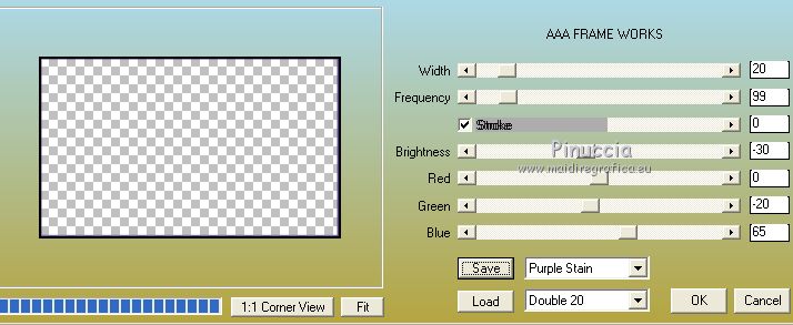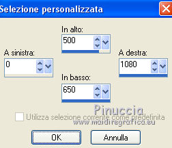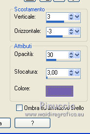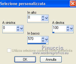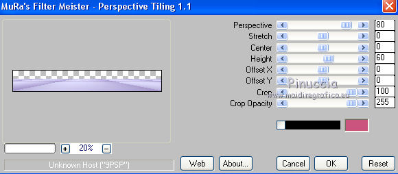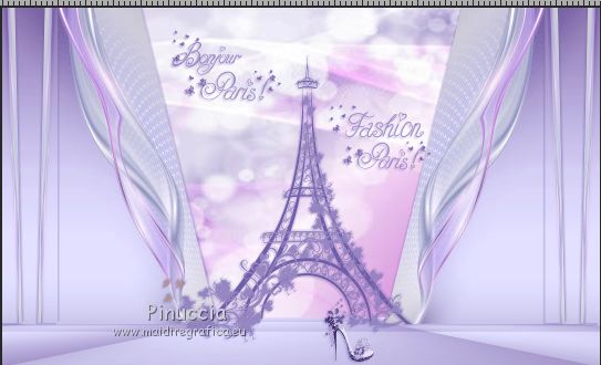 qui puoi trovare qualche risposta ai tuoi dubbi. Se l'argomento che ti interessa non è presente, ti prego di segnalarmelo. Questo tutorial è una creazione di ©Titoune e non può essere copiato su altri siti nè essere offerto per il download. Lo stesso vale per la mia traduzione. Il tutorial è stato creato con Corel17, ma può essere eseguito anche con le altre versioni di PSP. Secondo la versione utilizzata (anteriore a PSP X) potresti ottenere dei risultati differenti. Dalla versione X4, il comando Immagine>Rifletti è stato sostituito con Immagine>Capovolgi in orizzontale, e il comando Immagine>Capovolgi con Immagine>Capovolgi in verticale. Nelle versioni X5 e X6, le funzioni sono state migliorate rendendo disponibile il menu Oggetti. Con il nuovo X7 sono tornati i comandi Rifletti/Capovolgi, ma con nuove differenze. Vedi la scheda sull'argomento qui Per tradurre il tutorial ho usato PSP X. Occorrente: Un tube a scelta. Il resto del materiale qui Il tube utilizzato è di Resy Filtri in caso di dubbi, ricorda di consultare la mia sezione filtri qui Filters Unlimited 2.0 qui Simple - Left Right Wrap (bonus) qui AAA Frames - Frame Works, Texture Frame qui Mura's Meister - Perspective Tiling qui I filtri Simple si possono usare da soli o importati in Filters Unlimited (come fare vedi qui) Se un filtro fornito appare con questa icona ![]() 1. Apri una nuova immagine trasparente 1080 x 650 pixels. Apri l'elemento Shiny-purple-wave-abstract-background-vector-02, e vai a Modifica>Copia. Torna al tuo lavoro e vai a Modifica>Incolla come nuovo livello. Sposta l'immagine in alto a sinistra.dalla versione X5: Oggetti>Allinea>Superiore. Oggetti>Allinea>Sinistra. ![]() 2. Effetti>Effetti di riflesso>Specchio rotante. ![]() Attenzione Dalla versione X5 il risultato di questo effetto, può essere differente dalle versioni precedenti, a seconda della posizione dell'elemento sul quale viene applicato. Nelle versioni precedenti, avrai questo ![]() Dalla versione X5 invece il risultato è questo ![]() ed è il risultato corretto per poter eseguire il tutorial. Pertanto, se stai usando una versione precedente alla 5, apri questa immagine di partenza e prosegui il tutorial da qui. 3. Modifica>Taglia. Modifica>Incolla come nuovo livello. E avrai l'immagine perfettamente centrata. Elimina il livello Raster 2 rimasto vuoto (se stai usando una versione da X5 in poi). Se stai usando una versione precedente, puoi lasciare il livello vuoto che ti servirà come livello di sfondo. Assicurati di essere posizionato sul livello superiore dell'immagine. Effetti>Plugins>Simple - Left Right Wrap. Sposta l'immagine in alto.(da CorelX5: Oggetti>Allinea>Superiore). ![]() 4. Attiva il livello inferiore ancora trasparente. Selezione>Seleziona tutto. Apri l'elemento Motif e vai a Modifica>Copia. Torna al tuo lavoro e vai a Modifica>Incolla nella selezione. Selezione>Deseleziona. 5. Rimani posizionato su questo livello. Attiva lo strumento Selezione ![]() (non importa il tipo di selezione impostato, perchè con la selezione personalizzata si ottiene sempre un rettangolo) clicca sull'icona Selezione personalizzata ![]() e imposta i seguenti settaggi. ![]() Selezione>Innalza selezione a livello. 6. Effetti>Plugins>Mura's Meister - Perspective Tiling. ![]() Selezione>Deseleziona. 7. Attiva nuovamente il livello superiore. Rinomina questo livello "bordi". 8. Effetti>Effetti geometrici>Prospettiva verticale. ![]() Modifica>Copia. 9. Livelli>Nuovo livello raster. Selezione personalizzata ![]() ![]() Modifica>Incolla nella selezione. Selezione>Deseleziona. Effetti>Effetti di riflesso>Specchio rotante, con i settaggi precedenti. In questo caso il risultato è lo stesso per tutte le versioni di PSP. ![]() 10. Effetti>Effetti 3D>Sfalsa ombra, colore #7360ae. ![]() Ripeti l'Effetto Sfalsa ombra, cambiando verticale e orizzontale con -3/3. 11. Ritorna sul livello "bordi". Effetti>Effetti 3D>Sfalsa ombra, con i settaggi precedenti. 12. Attiva il livello inferiore. Selezione personalizzata ![]() ![]() 13. Livelli>Nuovo livello raster. Apri l'elemento thumbs2. Immagine>Rifletti. Modifica>Copia. Torna al tuo lavoro e vai a Modifica>Incolla nella selezione. Selezione>Deseleziona. 14. Attiva nuovamente il livello superiore. Apri l'immagine snsparissheet, che è composta da vari livelli. 15. Attiva il livello Raster 1 (la torre Eiffel). Modifica>Copia. Torna al tuo lavoro e vai a Modifica>Incolla come nuovo livello. Posiziona l'immagine al centro.Vedi l'esempio finale. 16. Livelli>Duplica. Cambia la modalità di miscelatura di questo livello in Moltiplica, e abbassa l'opacità al 70%. Effetti>Effetti 3D>Sfalsa ombra, con i settaggi precedenti. 17. Attiva il livello sottostante dell'originale. Effetti>Effetti 3D>Sfalsa ombra, con i settaggi precedenti. 18. Attiva il livello superiore. Attiva nuovamente l'immagine snsparissheet e copia il livello Layer 3. Modifica>Copia. Torna al tuo lavoro e vai a Modifica>Incolla come nuovo livello. Sposta il testo dove preferisci,o vedi il mio esempio. Effetti>Effetti 3D>Sfalsa ombra, colore #7360ae. ![]() 19. Ritorna sull'immagine snsparissheet e copia il livello Layer 2. Modifica>Copia. Torna al tuo lavoro e vai a Modifica>Incolla come nuovo livello. Sposta il testo dove preferisci,o vedi il mio esempio. Effetti>Effetti 3D>Sfalsa ombra, con i settaggi precedenti. 20. Attiva nuovamente l'immagine snsparissheet e copia il livello Layer 1. Modifica>Copia. Torna al tuo lavoro e vai a Modifica>Incolla come nuovo livello. Immagine>Rifletti. 21. Immagine>Ridimensiona, al 30%, tutti i livelli non selezionato. Sposta l'immagine dove preferisci,o vedi il mio esempio. ![]() Effetti>Effetti 3D>Sfalsa ombra, colore #7360ae. ![]() 22. Apri l'elemento heartstickpin e vai a Modifica>Copia. Torna al tuo lavoro e vai a Modifica>Incolla come nuovo livello. Sposta l'elemento a destra.Vedi l'esempio finale. Effetti>Effetti 3D>Sfalsa ombra, con i settaggi precedenti. 23. Apri l'elemento 34-1-SueDawe_GentleTouch e vai a Modifica