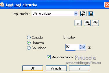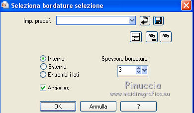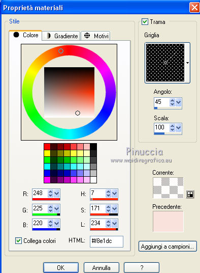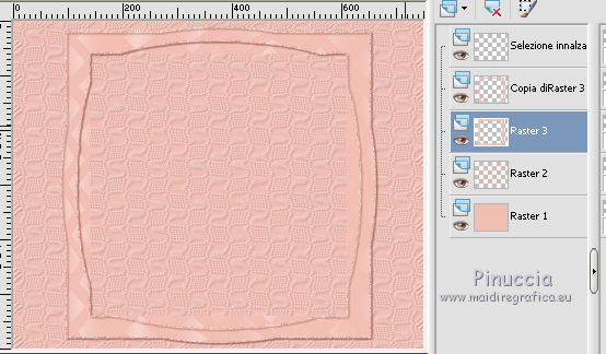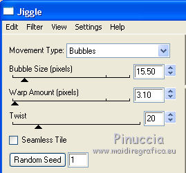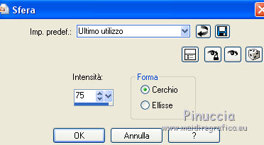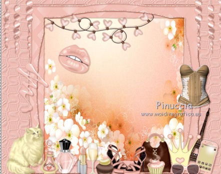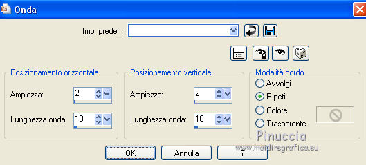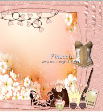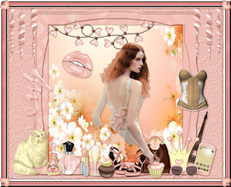 qui puoi trovare qualche risposta ai tuoi dubbi. Se l'argomento che ti interessa non è presente, ti prego di segnalarmelo. Questo tutorial è una creazione di ©Titoune e non può essere copiato su altri siti nè essere offerto per il download. Lo stesso vale per la mia traduzione. Il tutorial è stato creato con Corel18, ma può essere eseguito anche con le altre versioni di PSP. Secondo la versione utilizzata (anteriore a PSP X) potresti ottenere dei risultati differenti. Dalla versione X4, il comando Immagine>Rifletti è stato sostituito con Immagine>Capovolgi in orizzontale, e il comando Immagine>Capovolgi con Immagine>Capovolgi in verticale. Nelle versioni X5 e X6, le funzioni sono state migliorate rendendo disponibile il menu Oggetti. Con il nuovo X7 sono tornati i comandi Rifletti/Capovolgi, ma con nuove differenze. Vedi la scheda sull'argomento qui Per tradurre il tutorial ho usato PSP X. Occorrente: Un tube a scelta. Il resto del materiale qui Il tube utilizzato è di Min@ Filtri in caso di dubbi, ricorda di consultare la mia sezione filtri qui Filters Unlimited 2.0 qui Penta.com - Jeans qui Eye Candy 4000 - Jiggle qui I filtri Penta.com si possono usare da soli o importati in Filters Unlimited (come fare vedi qui) Se un filtro fornito appare con questa icona ![]() 1. Imposta il colore di primo piano con #f8e1dc, e il colore di sfondo con #f0beb4. 2. Apri una nuova immagine trasparente transparente 750 x 600 pixels, e riempila con il colore di sfondo.3. Livelli>Nuovo livello raster. Apri il colore di primo piano e seleziona Trama. Cerca e seleziona la trama Griglia con i seguenti settaggi. ![]() Riempi il livello con questo colore tramato - Clicca due volte.4. Effetti>Effetti di distorsione>Onda. ![]() 5. Effetti>Effetti 3D>Sfalsa ombra, colore #6d2515. ![]() 6. Livelli>Nuovo livello raster. Selezione>Deseleziona. Apri l'elemento MC_FF_Blush_P01 e vai a Modifica>Copia. Torna al tuo lavoro e vai a Modifica>Incolla nella selezione. 7. Selezoine>Modifica>Contrai - 55 pixels. Premi sulla tastiera il tasto CANC ![]() 8. Effetti>Plugins>Eye Candy 4000 - Jiggle. ![]() Selezione>Deseleziona. 9. Immagine>Ridimensiona, al 75%, tutti i livelli non selezionato. 10. Immagine>Ruota per gradi - 90 gradi a sinistra. ![]() 11. Effetti>Effetti geometrici>Cilindro verticale. ![]() Livelli>Duplica. 12. Effetti>Effetti geometrici>Sfera. ![]() 13. Selezione>Seleziona tutto. Selezione>Mobile. Selezione>Immobilizza. Selezione>Modifica>Seleziona bordature selezione. ![]() Selezione>Innalza selezione a livello. 14. Regola>Aggiungi/Rimuovi disturbo>Aggiungi disturbo. ![]() Selezione>Deseleziona. Effetti>Effetti 3D>Sfalsa ombra, colore #6d2515. ![]() Attiva il livello con l'effetto Sfera. Modifica>Ripeti Sfalsa ombra. 15. Attiva il secondo livello cornice (il terzo partendo dal basso). ![]() Attiva lo strumento Bacchetta magica ![]() e clicca al centro della cornice per selezionarla. Selezione>Modifica>Espandi - 3 pixels. 16. Livelli>Nuovo livello raster. Livelli>Disponi>Sposta giù. Apri l'immagine flower-background-flowering-peach-branches, e vai a Modifica>Copia. Torna al tuo lavoro e vai a Modifica>Incolla nella selezione. Selezione>Deseleziona. 17. Ritorna sul livello della cornice. Effetti>Effetti 3D>Sfalsa ombra, colore #6d2515. ![]() Ripeti l'Effetto Sfalsa ombra, cambiando verticale e orizzontale con -3. 18. Attiva il livello superiore. Apri l'elemento MC_FF_BlushE01, e vai a Modifica>Copia. Torna al tuo lavoro e vai a Modifica>Incolla come nuovo livello. Spostalo nella parte interna destra della cornice.Vedi l'esempio finale. Effetti>Effetti 3D>Sfalsa ombra, colore #6d2515. ![]() 19. Apri l'elemento MC_FF_BlushE05, e vai a Modifica>Copia. Torna al tuo lavoro e vai a Modifica>Incolla come nuovo livello. 20. Immagine>Ridimensiona, al 25%, tutti i livelli non selezionato. 21. Effetti>Effetti di immagine>Scostamento. ![]() Effetti>Effetti 3D>Sfalsa ombra, con i settaggi precedenti. Livelli>Duplica. Immagine>Rifletti. 22. Apri l'elemento MC_FF_BlushE06, e vai a Modifica>Copia. Torna al tuo lavoro e vai a Modifica>Incolla come nuovo livello. Spostalo nella parte superiore della cornice.Vedi l'esempio finale. Effetti>Effetti 3D>Sfalsa ombra, con i settaggi precedenti. 23. Apri l'elemento MC_FF_BlushE13, e vai a Modifica>Copia. Torna al tuo lavoro e vai a Modifica>Incolla come nuovo livello. Spostalo nella parte destra della cornice.Vedi l'esempio finale. Effetti>Effetti 3D>Sfalsa ombra, con i settaggi precedenti. 24. Apri l'elemento MC_FF_BlushE15, e vai a Modifica>Copia. Torna al tuo lavoro e vai a Modifica>Incolla come nuovo livello. Spostalo nella parte inferiore destra della cornice.Vedi l'esempio finale. Effetti>Effetti 3D>Sfalsa ombra, con i settaggi precedenti. 25. Apri l'elemento MC_FF_BlushE14, e vai a Modifica>Copia. Torna al tuo lavoro e vai a Modifica>Incolla come nuovo livello. Spostalo nella parte inferiore destra della cornice.Vedi l'esempio finale. Effetti>Effetti 3D>Sfalsa ombra, con i settaggi precedenti. 26. Apri l'elemento MC_FF_BlushE27, e vai a Modifica>Copia. Torna al tuo lavoro e vai a Modifica>Incolla come nuovo livello. Spostalo nella parte inferiore destra della cornice.Vedi l'esempio finale. Effetti>Effetti 3D>Sfalsa ombra, con i settaggi precedenti. 27. Apri l'elemento MC_FF_BlushE28, e vai a Modifica>Copia. Torna al tuo lavoro e vai a Modifica>Incolla come nuovo livello. Spostalo nella parte inferiore destra della cornice.Vedi l'esempio finale. Effetti>Effetti 3D>Sfalsa ombra, con i settaggi precedenti. 28. Apri l'elemento MC_FF_BlushE16, e vai a Modifica>Copia. Torna al tuo lavoro e vai a Modifica>Incolla come nuovo livello. Spostalo nella parte inferiore destra della cornice.Vedi l'esempio finale. Effetti>Effetti 3D>Sfalsa ombra, con i settaggi precedenti. 29. Apri l'elemento MC_FF_BlushE26, e vai a Modifica>Copia. Torna al tuo lavoro e vai a Modifica>Incolla come nuovo livello. Spostalo nella parte inferiore della cornice.Vedi l'esempio finale. Effetti>Effetti 3D>Sfalsa