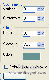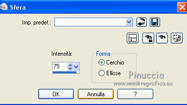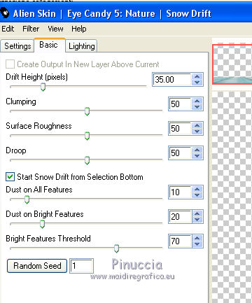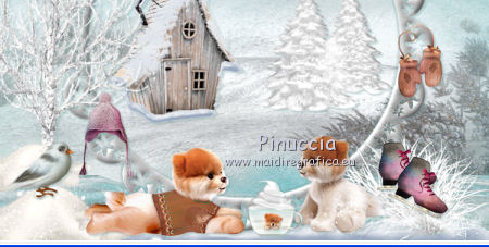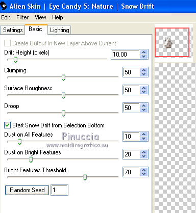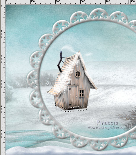 qui puoi trovare qualche risposta ai tuoi dubbi. Se l'argomento che ti interessa non è presente, ti prego di segnalarmelo. Questo tutorial è una creazione di ©Titoune e non può essere copiato su altri siti nè essere offerto per il download. Lo stesso vale per la mia traduzione. Il tutorial è stato creato con Corel18, ma può essere eseguito anche con le altre versioni di PSP. Secondo la versione utilizzata (anteriore a PSP X) potresti ottenere dei risultati differenti. Dalla versione X4, il comando Immagine>Rifletti è stato sostituito con Immagine>Capovolgi in orizzontale, e il comando Immagine>Capovolgi con Immagine>Capovolgi in verticale. Nelle versioni X5 e X6, le funzioni sono state migliorate rendendo disponibile il menu Oggetti. Con il nuovo X7 sono tornati i comandi Rifletti/Capovolgi, ma con nuove differenze. Vedi la scheda sull'argomento qui Per tradurre il tutorial ho usato PSP X. Occorrente: Un tube a scelta. Il resto del materiale qui Il tube utilizzato è Yoka. Filtri in caso di dubbi, ricorda di consultare la mia sezione filtri qui Alien Skin Eye Candy 5 Nature - Snowdrift qui Mura's Meister - Perspective Tiling qui ![]() 1. Apri una nuova immagine trasparente transparente 750 x 600 pixels. Selezione>Seleziona tutto. 2. Apri l'elemento sl-p5, e vai a Modifica>Copia. Torna al tuo lavoro e vai a Modifica>Incolla nella selezione. Selezione>Deseleziona. 3. Apri l'elemento sl-f1, e vai a Modifica>Copia. Torna al tuo lavoro e vai a Modifica>Incolla come nuovo livello. Non spostarlo. 4. Effetti>Effetti 3D>Sfalsa ombra, colore #679392. ![]() Ripeti l'Effetto Sfalsa ombra, cambiando verticale e orizzontale con -3. 5. Attiva lo strumento Selezione ![]() (non importa il tipo di selezione impostato, perchè con la selezione personalizzata si ottiene sempre un rettangolo) clicca sull'icona Selezione personalizzata ![]() e imposta i seguenti settaggi. ![]() 6. Attiva il livello inferiore. Selezione>Innalza selezione a livello. 7. Effetti>Plugins>Mura's Meister - Perspective Tiling, con i settaggi standard. ![]() 8. Effetti>Plugins>Alien Skin Eye Candy 5 Nature - Snowdrift. ![]() Selezione>Deseleziona. 9. Effetti>Effetti geometrici>Sfera. ![]() 10. Apri l'elemento sl-24 e vai a Modifica>Copia. Torna al tuo lavoro e vai a Modifica>Incolla come nuovo livello. Spostalo nel paesaggio.11. Attiva lo strumento Selezione a mano libera , da punto a punto,e seleziona la base dello chalet ![]() Selezione>Modifica>Sfuma - 3 pixels. Premi sulla tastiera il tasto CANC ![]() Selezione>Deseleziona. Risultato ![]() 12. Effetti>Plugins>Alien Skin Eye Candy 5 Nature - Snowdrift. ![]() 13. Effetti>Effetti 3D>Sfalsa ombra, colore #679392. ![]() 14. Apri l'elemento sl-15 e vai a Modifica>Copia. Torna al tuo lavoro e vai a Modifica>Incolla come nuovo livello. Spostalo nel paesaggio.Vedi l'esempio finale. Effetti>Effetti 3D>Sfalsa ombra, con i settaggi precedenti. 15. Apri l'elemento let_it_snow_by_psycojimi-d6xxg9j e vai a Modifica>Copia. Torna al tuo lavoro e vai a Modifica>Incolla come nuovo livello. Spostalo nel paesaggio.Vedi l'esempio finale. Effetti>Effetti 3D>Sfalsa ombra, con i settaggi precedenti. 16. Attiva nuovamente il livello superiore. Apri l'elemento sl-2 e vai a Modifica>Copia. Torna al tuo lavoro e vai a Modifica>Incolla come nuovo livello. Spostalo nella parte superiore della cornice.Vedi l'esempio finale. Effetti>Effetti 3D>Sfalsa ombra, con i settaggi precedenti. 17. Apri l'elemento sl-8 e vai a Modifica>Copia. Torna al tuo lavoro e vai a Modifica>Incolla come nuovo livello. Spostalo nella parte superiore destra della cornice.Vedi l'esempio finale. Effetti>Effetti 3D>Sfalsa ombra, con i settaggi precedenti. 18. Apri l'elemento sl-12 e vai a Modifica>Copia. Torna al tuo lavoro e vai a Modifica>Incolla come nuovo livello. Spostalo nella parte destra della cornice.Vedi l'esempio finale. Effetti>Effetti 3D>Sfalsa ombra, con i settaggi precedenti. 19. Apri l'elemento sl-11 e vai a Modifica>Copia. Torna al tuo lavoro e vai a Modifica>Incolla come nuovo livello. Spostalo nella parte inferiore destra della cornice.Vedi l'esempio finale. Effetti>Effetti 3D>Sfalsa ombra, con i settaggi precedenti. 20. Apri l'elemento sl-18 e vai a Modifica>Copia. Torna al tuo lavoro e vai a Modifica>Incolla come nuovo livello. Spostalo nella parte inferiore della cornice.![]() Effetti>Effetti 3D>Sfalsa ombra, con i settaggi precedenti. 21. Apri l'elemento sl-13 e vai a Modifica>Copia. Torna al tuo lavoro e vai a Modifica>Incolla come nuovo livello. Spostalo nella parte sinistra della cornice.Vedi l'esempio finale. Effetti>Effetti 3D>Sfalsa ombra, con i settaggi precedenti. 22. Apri l'elemento sl-17 e vai a Modifica>Copia. Torna al tuo lavoro e vai a Modifica>Incolla come nuovo livello. Spostalo nella parte inferiore sinistra della cornice.Vedi l'esempio finale. Livelli>Duplica. 23. Immagine>Ridimensiona, al 65%, tutti i livelli non selezionato. Spostalo ai piedi dell'albero.Vedi l'esempio finale. Livelli>Duplica. Livelli>Disponi>Sposta su (il livello dell'albero). Vedi l'esempio finale. 24. Attiva lo strumento Bacchetta magica ![]() e cancella la parte di neve che deborda sulla cornice. Vedi l'esempio finale. Effetti>Effetti 3D>sfalsa ombra, con i settaggi precedenti. 25. Apri l'elemento sl-5 e vai a Modifica>Copia. Torna al tuo lavoro e vai a Modifica>Incolla come nuovo livello. Spostalo nella parte inferiore sinistra della cornice.Vedi l'esempio finale. Effetti>Effetti 3D>Sfalsa ombra, con i settaggi precedenti. 26. apri l'elemento sl-10 e vai a Modifica>Copia. Torna al tuo lavoro e vai a Modifica>Incolla come nuovo livello. Spostalo nella parte inferiore sinistra della cornice.Vedi l'esempio finale. Effetti>Effetti 3D>Sfalsa ombra, con i settaggi precedenti. 27. Apri l'elemento sl-1 e vai a Modifica>Copia. Torna al tuo lavoro e vai a Modifica>Incolla come nuovo livello. Spostalo nella parte inferiore della cornice.Vedi l'esempio finale. Effetti>Effetti 3D>Sfalsa ombra, con i settaggi precedenti. 28. Apri l'e