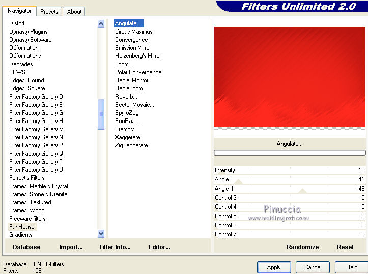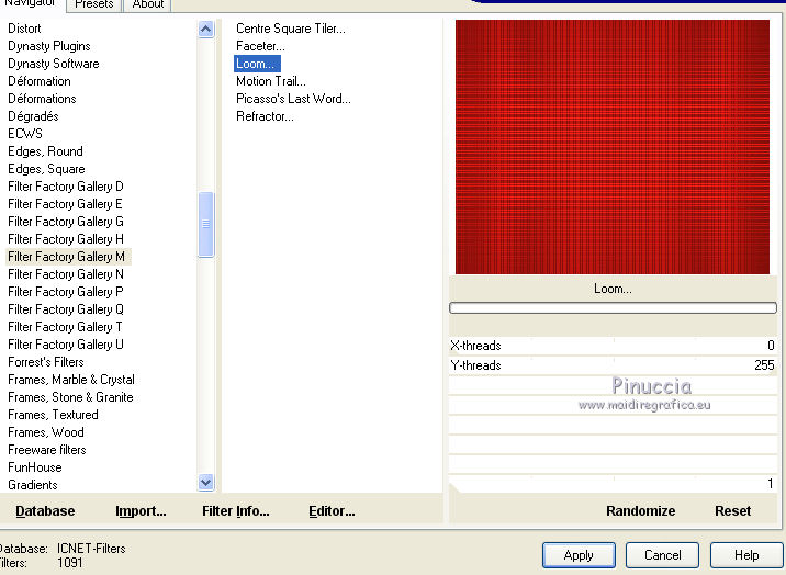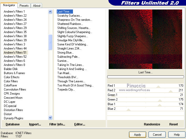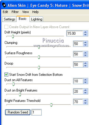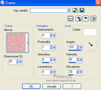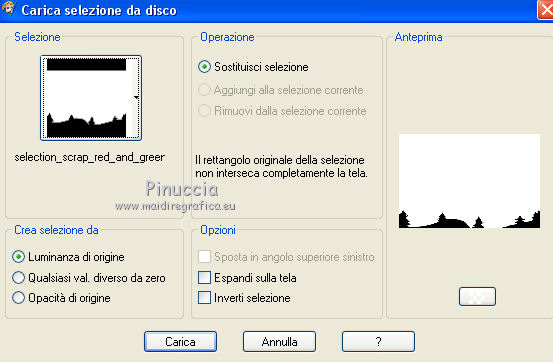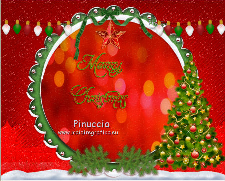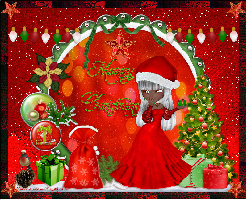 qui puoi trovare qualche risposta ai tuoi dubbi. Se l'argomento che ti interessa non è presente, ti prego di segnalarmelo. Questo tutorial è una creazione di ©Titoune e non può essere copiato su altri siti nè essere offerto per il download. Lo stesso vale per la mia traduzione. Il tutorial è stato creato con Corel18, ma può essere eseguito anche con le altre versioni di PSP. Secondo la versione utilizzata (anteriore a PSP X) potresti ottenere dei risultati differenti. Dalla versione X4, il comando Immagine>Rifletti è stato sostituito con Immagine>Capovolgi in orizzontale, e il comando Immagine>Capovolgi con Immagine>Capovolgi in verticale. Nelle versioni X5 e X6, le funzioni sono state migliorate rendendo disponibile il menu Oggetti. Con il nuovo X7 sono tornati i comandi Rifletti/Capovolgi, ma con nuove differenze. Vedi la scheda sull'argomento qui Per tradurre il tutorial ho usato PSP X. Occorrente: Un tube a scelta. Il resto del materiale qui Filtri in caso di dubbi, ricorda di consultare la mia sezione filtri qui Filters Unlimited 2.0 qui Funhouse - Angulate qui Alien Skin Eye Candy 5 Nature - Snowdrift qui Simple - Top Left Mirror qui Filter Factory Gallery M - Loom qui Andrew's Filter 51 - Last Time qui I filtri Simple, Funhouse, Factory Gallery e Andrew's si possono usare da soli o importati in Filters Unlimited (come fare vedi qui) Se un filtro fornito appare con questa icona ![]() Metti la selezione nella cartella Selezioni. Metti la trama nella cartella Trame. 1. Apri una nuova immagine trasparente 750 x 600 pixels. Selezione>Seleziona tutto. 2. Apri l'elemento paper6, e vai a Modifica>Copia. Torna al tuo lavoro e vai a Modifica>Incolla nella selezione. Selezione>Deseleziona. 3. Selezione>Carica/Salva selezione>Carica selezione da disco. Cerca e carica la selezione "selection_scrap_red_and_green". ![]() 4. Effetti>Plugins>Filters Unlimited 2.0 - Funhouse - Angulate, con i settaggi standard. ![]() Effetti>Effetti di bordo>Aumenta. Selezione>Inverti. 5. Effetti>Effetti di trama>Trama - seleziona la trama Tilerose, con i seguenti settaggi. ![]() 6. Effetti>Effetti 3D>Sfalsa ombra, colore #640200. ![]() Effetti>Effetti di bordo>Aumenta. Selezione>Deseleziona. Livelli>Duplica. Cambia la modalità di miscelatura di questo livello in Moltiplica. 7. Livelli>Nuovo livello raster. Imposta il colore di primo piano con il colore bianco e riempi il livello con questo colore.Cambia la modalità di miscelatura di questo livello in Dissolvi e abbassa l'opacità all'1%. 8. Apri l'elemento snow e vai a Modifica>Copia. Torna al tuo lavoro e vai a Modifica>Incolla come nuovo livello. Spostalo in basso.Vedi l'esempio finale. Effetti>Effetti 3D>Sfalsa ombra, con i settaggi precedenti. 9. Apri l'elemento frame, e vai a Modifica>Copia. Torna al tuo lavoro e vai a Modifica>Incolla come nuovo livello. 10. Immagine>Ridimensiona, al 110%, tutti i livelli non selezionato. 11. Attiva lo strumento Bacchetta magica ![]() e clicca al centro della cornice per selezionarla. Selezione>Modifica>Espandi - 3 pixels. 12. Livelli>Nuovo livello raster. Livelli>Disponi>Sposta giù. Apri l'elemento red-christmas-background-wallpaper-bokeh e vai a Modifica>Copia. Torna al tuo lavoro e vai a Modifica>Incolla nella selezione. Selezione>Deseleziona. Abbassa l'opacità di questo livello al 60%. 13. Attiva nuovamente il livello della cornice. Effetti>Plugins>Alien Skin Eye Candy 5 Nature - Snow Drift. ![]() Effetti>Effetti 3D>Sfalsa ombra, con i settaggi precedenti. 14. Apri l'elemento wordart, e vai a Modifica>Copia. Torna al tuo lavoro e vai a Modifica>Incolla come nuovo livello. Spostalo nella cornice, a sinistra.Vedi l'esempio finale. Effetti>Effetti 3D>Sfalsa ombra, con i settaggi precedenti. Livelli>Duplica. Cambia la modalità di miscelatura di questo livello in Luce netta. 15. Apri l'elemento star, e vai a Modifica>Copia. Torna al tuo lavoro e vai a Modifica>Incolla come nuovo livello. Spostalo nella parte superiore della cornice.Vedi l'esempio finale. Effetti>Effetti 3D>Sfalsa ombra, con i settaggi precedenti. 16. Apri l'elemento ribbon, e vai a Modifica>Copia. Torna al tuo lavoro e vai a Modifica>Incolla come nuovo livello. Spostalo nella parte superiore della cornice.Vedi l'esempio finale. Effetti>Effetti 3D>Sfalsa ombra, con i settaggi precedenti. 17. Apri l'elemento lightd2, e vai a Modifica>Copia. Torna al tuo lavoro e vai a Modifica>Incolla come nuovo livello. Spostalo nella parte superiore sinistra della cornice.Vedi l'esempio finale. Effetti>Effetti 3D>Sfalsa ombra, con i settaggi precedenti. Livelli>Duplica. Immagine>Rifletti. Livelli>Unisci>Unisci giù. 18. Apri l'elemento tree, e vai a Modifica>Copia. Torna al tuo lavoro e vai a Modifica>Incolla come nuovo livello. Spostalo nella parte destra della cornice.Vedi l'esempio finale. Effetti>Effetti 3D>Sfalsa ombra, con i settaggi precedenti. 19. Apri l'elemento branch3, e vai a Modifica>Copia. Torna al tuo lavoro e vai a Modifica>Incolla come nuovo livello. Spostalo nella parte inferiore nella cornice.Vedi l'esempio finale. Effetti>Effetti 3D>Sfalsa ombra, con i settaggi precedenti. Livelli>Duplica. Immagine>Rifletti. ![]() 20. Apri l'elemento present2 e vai a Modifica>Copia. Torna al tuo lavoro e vai a Modifica>Incolla come nuovo livello. Spostalo nella parte inferiore destra della cornice.Vedi l'esempio finale. Effetti>Effetti 3D>Sfalsa ombra, con i settaggi precedenti. 21. Apri l'elemento present3, e vai a Modifica>Copia. Torna al tuo lavoro e vai a Modifica>Incolla come nuovo livello. Spostalo nella parte inferiore destra della cornice.Vedi l'esempio finale. Effetti>Effetti 3D>Sfalsa ombra, con i settaggi precedenti. 22. Apri l'elemento glass, e vai a Modifica>Copia. Torna al tuo lavoro e vai a Modifica>Incolla come nuovo livello. Spostalo in basso a destra.Vedi l'esempio finale. Effetti>Effetti 3D>Sfalsa ombra, con i settaggi precedenti. 23. Apri l'elemento poinsettia, e vai a Modifica>Copia. Torna al tuo lavoro e vai a Modifica>Incolla come nuovo 