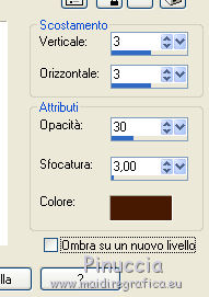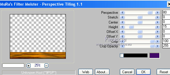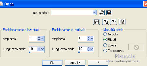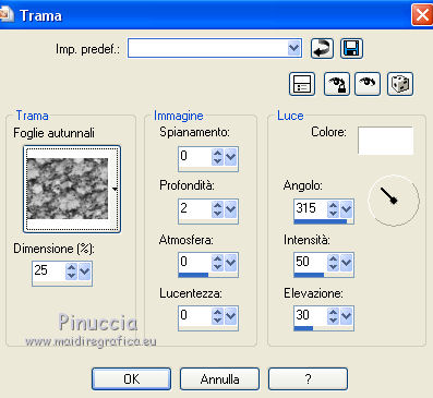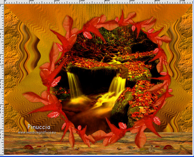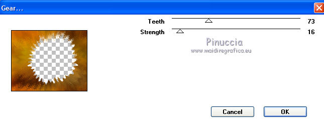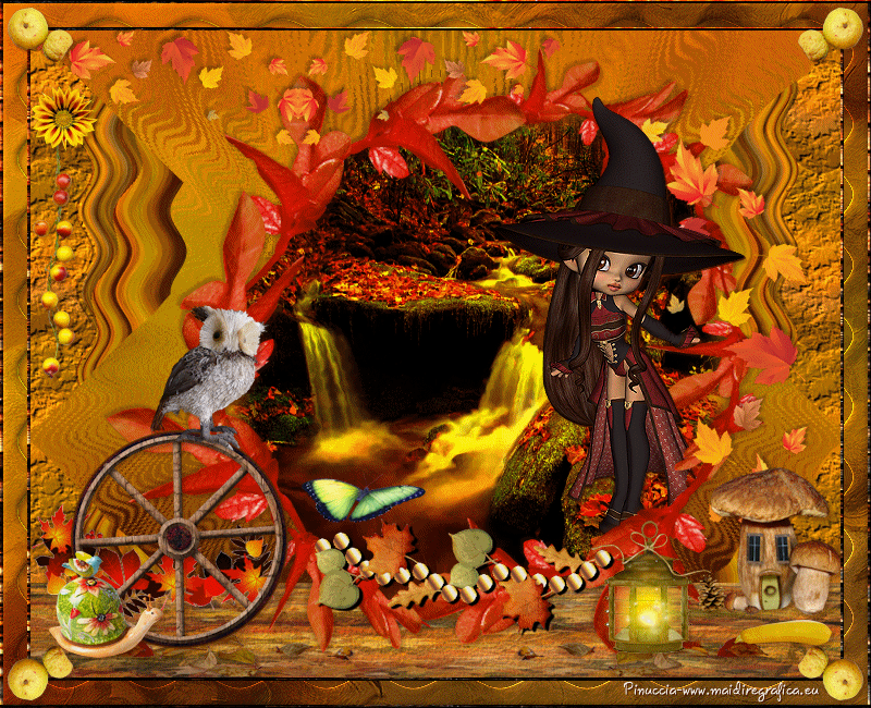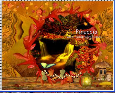 qui puoi trovare qualche risposta ai tuoi dubbi. Se l'argomento che ti interessa non è presente, ti prego di segnalarmelo. Questo tutorial è una creazione di ©Titoune e non può essere copiato su altri siti nè essere offerto per il download. Lo stesso vale per la mia traduzione. Il tutorial è stato creato con Corel17, ma può essere eseguito anche con le altre versioni di PSP. Secondo la versione utilizzata (anteriore a PSP X) potresti ottenere dei risultati differenti. Dalla versione X4, il comando Immagine>Rifletti è stato sostituito con Immagine>Capovolgi in orizzontale, e il comando Immagine>Capovolgi con Immagine>Capovolgi in verticale. Nelle versioni X5 e X6, le funzioni sono state migliorate rendendo disponibile il menu Oggetti. Con il nuovo X7 sono tornati i comandi Rifletti/Capovolgi, ma con nuove differenze. Vedi la scheda sull'argomento qui Per tradurre il tutorial ho usato PSP X. Occorrente: Un tube a scelta. Il resto del materiale qui Il tube utilizzato è di Tyna Reagen. Filtri in caso di dubbi, ricorda di consultare la mia sezione filtri qui Eye Candy 4000 - Jiggle qui Mura's Seamless - Shift at zig zag qui Mura's Meister - Perspective Tiling qui VM Instant Art - Tripolis qui VM Distortion - Gear qui Filters Unlimited 2.0 qui I filtri Mura's Seamless, VM Instant Art e VM Distortion si possono usare da soli o importati in Filters Unlimited (come fare vedi qui) Se un filtro fornito appare con questa icona Animation Shop qui ![]() Metti la trama nella cartella Trame. Metti le selezioni nella cartella Selezioni. 1. Apri una nuova immagine trasparente 750 x 600 pixels. 2. Apri l'element Frame2 e vai a Modifica>Copia. Torna al tuo lavoro e vai a Modifica>Incolla come nuovo livello. Non spostarlo. 3. Attiva lo strumento Bacchetta magica e clicca al centro della cornice per selezionarla. Selezione>Modifica>Espandi - 3 pixels. 4. Attiva il livello Raster 1. Apri l'elemento Paper 3 e vai a Modifica>Copia. Torna al tuo lavoro e vai a Modifica>Incolla nella selezione. Selezione>Inverti. 5. Livelli>Nuovo livello raster. Livelli>Disponi>Porta sotto. Modifica>Incolla nella selezione (l'elemento è ancora in memoria). 6. Livelli>Duplica. Effetti>Plugins>Mura's Seamless - Shift at zig zag. ![]() Effetti>Plugins>VM Distortion - Gear, con i settaggi standard. ![]() Selezione>Deseleziona. 7. Effetti>Effetti di riflesso>Specchio rotante. ![]() Rinomina questo livello "Gear" 8. Effetti>Effetti 3D>Sfalsa ombra, colore #471902. ![]() Ripeti l'Effetto Sfalsa ombra, cambiando verticale e orizzontale con -3. 9. Attiva nuovamente il livello della cornice. Clicca al centro della cornice con la bacchetta magica ![]() Selezione>Modifica>Espandi - 3 pixels. 10. Livelli>Nuovo livello raster. Livelli>Disponi>Sposta giù. Apri l'immagine Autumn2 e vai a Modifica>Copia. Torna al tuo lavoro e vai a Modifica>Incolla nella selezione. Selezione>Deseleziona. Cambia la modalità di miscelatura di questo livello in Sovrapponi. Livelli>Duplica. Cambia la modalità di miscelatura di questo livello in Moltiplica. Rinomina questo livello "animazione". 11. Attiva il livello della cornice. Effetti>Effetti 3D>Sfalsa ombra, con i settaggi precedenti. 12. Attiva il livello "Gear". Selezione>Carica/Salva selezione>Carica selezione da disco. Cerca e carica la selezione "selection_scrap_estrelita". ![]() 13. Livelli>Nuovo livello raster. Apri l'immagine Paper3 e vai a Modifica>Copia. Torna al tuo lavoro e vai a Modifica>Incolla nella selezione. Selezione>Deseleziona. 14. Effetti>Plugins>Mura's Meister - Perspective Tiling. ![]() Rinomina questo livello "pavimento". Livelli>Duplica. 15. Immagine>Ruota per gradi - 90 gradi a sinistra. ![]() Effetti>Effetti di immagine>Scostamento. ![]() Porta questo livello sotto il livello "pavimento". Livelli>Duplica. Immagine>Rifletti Livelli>Unisci>Unisci giù. Effetti>Effetti 3D>Sfalsa ombra, colore #471902. ![]() 16. Effetti>Plugins>VM Instant Art - Tripolis, 2 volte con i settaggi standard. 17. Effetti>Effetti di distorsione>Onda. ![]() 18. Selezione>Carica/Salva selezione>Carica selezione da disco. Cerca e carica la selezione "selection_scrap_estrelita2". ![]() 19. Effetti>Effetti di trama>Trama - seleziona la trama Foglie autunnali con i seguenti settaggi. ![]() Selezione>Deseleziona. Ritorna sul livello "pavimento". Effetti>Effetti di trama>Trama - trama tilerose con i seguenti settaggi. ![]() 20. Apri l'elemento leaves_ground e vai a Modifica>Copia. Torna al tuo lavoro e vai a Modifica>Incolla come nuovo livello. Spostalo in basso.Vedi l'esempio finale. Porta questo livello sopra il livello "pavimento". Attiva nuovamente il livello superiore. 21. Apri l'elemento FallenLeaves e vai a Modifica>Copia. Torna al tuo lavoro e vai a Modifica>Incolla come nuovo livello. Spostalo in basso a sinistra.Vedi l'esempio finale. Effetti>Effetti 3D>Sfalsa ombra, con i settaggi precedenti. Livelli>Duplica. Immagine>Rifletti. Dovresti avere questo ![]() 22. Apri l'elemento leaves e vai a Modifica>Copia. Torna al tuo lavoro e vai a Modifica>Incolla come nuovo livello. Spostalo in alto a sinistra.Vedi l'esempio finale. Niente Sfalsa ombra. 23. Apri l'elemento leaves2 e vai a Modifica>Copia. Torna al tuo lavoro e vai a Modifica>Incolla come nuovo livello. Spostalo a destra.Vedi l'esempio finale. Niente Sfalsa ombra. 24. Apri l'elemento MushroomHouse e vai a Modifica>Copia. Torna al tuo lavoro e vai a Modifica>Incolla come nuovo livello. Spostalo in basso a destra.Vedi l'esempio finale. Effetti>Effetti 3D>Sfalsa ombra, con i settaggi precedenti. 25. Apri l'elemento Squash e vai a Modifica>Copia. Torna al tuo lavoro e vai a Modifica>Incolla come nuovo livello. Spostalo in basso a destra.Vedi l'esempio finale. Effetti>Effetti 3D>Sfalsa ombra, con i settaggi precedenti. 26. Apri l'elemento FALLBEA e vai a Modifica>Copia. Torna al tuo lavoro e vai a Modifica>Incolla come nuovo livello. Spostalo nella parte inferiore della cornice.Vedi l'esempio finale. Niente Sfalsa ombra. 27. Apri l'elemento Lantern e va