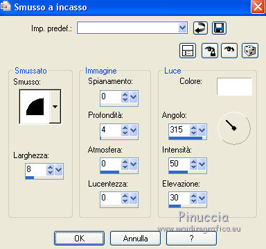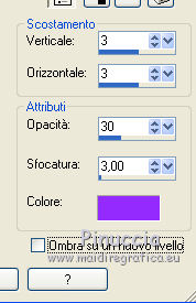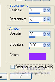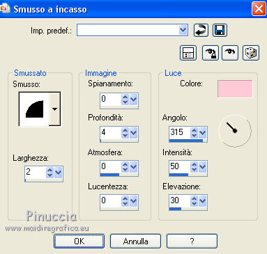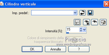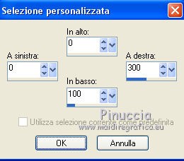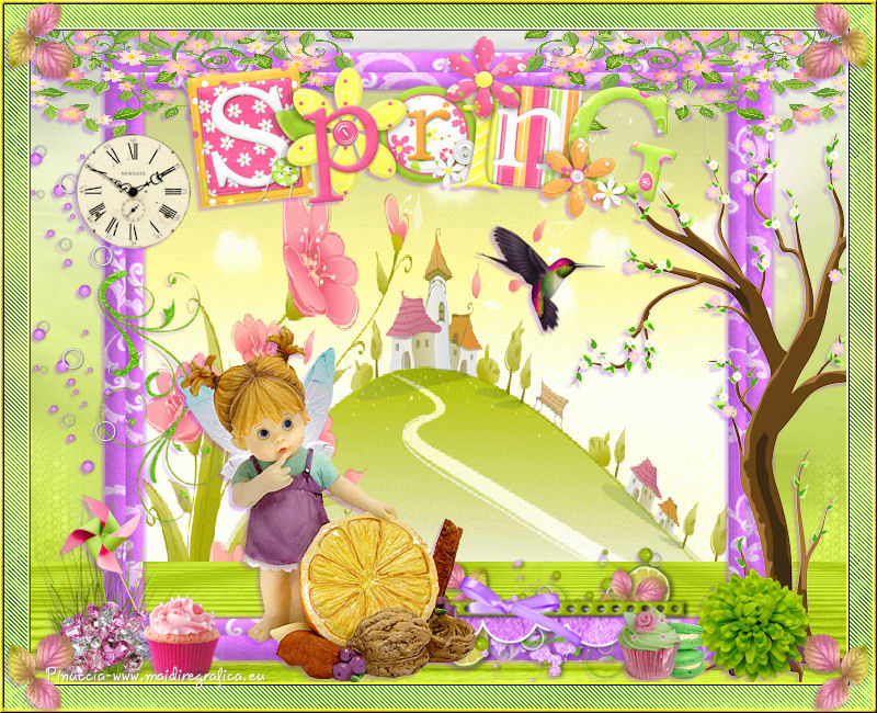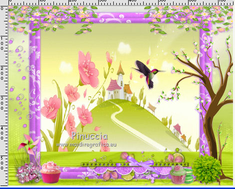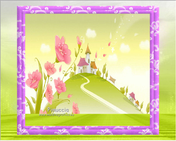 qui puoi trovare qualche risposta ai tuoi dubbi. Se l'argomento che ti interessa non è presente, ti prego di segnalarmelo. Questo tutorial è una creazione di ©Titoune e non può essere copiato su altri siti nè essere offerto per il download. Lo stesso vale per la mia traduzione. Il tutorial è stato creato con Corel17, ma può essere eseguito anche con le altre versioni di PSP. Secondo la versione utilizzata (anteriore a PSP X) potresti ottenere dei risultati differenti. Dalla versione X4, il comando Immagine>Rifletti è stato sostituito con Immagine>Capovolgi in orizzontale, e il comando Immagine>Capovolgi con Immagine>Capovolgi in verticale. Nelle versioni X5 e X6, le funzioni sono state migliorate rendendo disponibile il menu Oggetti. Con il nuovo X7 sono tornati i comandi Rifletti/Capovolgi, ma con nuove differenze. Vedi la scheda sull'argomento qui Per tradurre il tutorial ho usato PSP X. Occorrente: Un tube a scelta. Il resto del materiale qui Il tube è di Maryse. Filtri in caso di dubbi, ricorda di consultare la mia sezione filtri qui Filters Unlimited 2.0 qui Simple qui Penta.com - Jeans qui I filtri Simple e Penta.com si possono usare da soli o importati in Filters Unlimited (come fare vedi qui) Se un filtro fornito appare con questa icona ![]() 1. Apri una nuova immagine trasparente 750 x 600 pixels. Selezione>Seleziona tutto. 2. Apri l'elemento Miz_SL_paper14 e vai a Modifica>Copia. minimizza l'elemento perchè ti servirà per creare un motivo Torna al tuo lavoro e vai a Modifica>Incolla nella selezione. Selezione>Deseleziona. 3. Apri l'elemento Miz_SL_element 35 e vai a Modifica>Copia. Torna al tuo lavoro e vai a Modifica>Incolla come nuovo livello. Non spostarlo. 4. Effetti>Effetti geometrici>Cilindro verticale. ![]() 5. Attiva lo strumento Bacchetta magica ![]() e clicca al centro della cornice per selezionarla. Selezione>Modifica>Espandi - 3 pixels. 6. Livelli>Nuovo livello raster. Livelli>Disponi>Sposta giù. Apri l'immagine slwenyang372 e vai a Modifica>Copia. Torna al tuo lavoro e vai a Modifica>Incolla nella selezione. Selezione>Deseleziona. 7. Rimani su questo livello. Apri l'elemento Ground e vai a Modifica>Copia. Torna al tuo lavoro e vai a Modifica>Incolla come nuovo livello. Spostalo in basso.![]() 8. Attiva il livello della cornice. Effetti>Effetti 3D>Sfalsa ombra, colore #942bfd. ![]() Ripeti l'Effetto Sfalsa ombra, cambiando verticale e orizzontale con -3. 9. Attiva lo strumento Selezione ![]() (non importa il tipo di selezione impostato, perchè con la selezione personalizzata si ottiene sempre un rettangolo) clicca sull'icona Selezione personalizzata ![]() e imposta i seguenti settaggi. ![]() 10. Livelli>Nuovo livello raster. Apri l'elemento Spring_Blossom_Decoration_with_Leaves_Transparent_PNG_Clip_Art_Image e vai a Modifica>Copia. Torna al tuo lavoro e vai a Modifica>Incolla nella selezione. Selezione>Deseleziona. 11. Effetti>Effetti 3D>Sfalsa ombra, colore #942bfd. ![]() 12. Effetti>Effetti di riflesso>Specchio rotante. ![]() 13. Apri l'elemento Spring_Tree_PNG_Clipart_Picture e vai a Modifica>Copia. Torna al tuo lavoro e vai a Modifica>Incolla come nuovo livello. Spostalo nella parte destra.Vedi l'esempio finale. Effetti>Effetti 3D>Sfalsa ombra, con i settaggi precedenti. 14. Apri l'elemento Miz_SL_element 16 e vai a Modifica>Copia. Torna al tuo lavoro e vai a Modifica>Incolla come nuovo livello. Spostalo nel paesaggio.Vedi l'esempio finale. Effetti>Effetti 3D>Sfalsa ombra, con i settaggi precedenti. 15. Apri l'elemento Miz_SL_element 8 e vai a Modifica>Copia. Torna al tuo lavoro e vai a Modifica>Incolla come nuovo livello. Spostalo nella parte inferiore destra.Vedi l'esempio finale. Effetti>Effetti 3D>Sfalsa ombra, con i settaggi precedenti. 16. Apri l'elemento Miz_SL_element 53 e vai a Modifica>Copia. Torna al tuo lavoro e vai a Modifica>Incolla come nuovo livello. Spostalo in basso a destra.Vedi l'esempio finale. Effetti>Effetti 3D>Sfalsa ombra, con i settaggi precedenti. 17. Apri l'elemento Miz_SL_element 50 e vai a Modifica>Copia. Torna al tuo lavoro e vai a Modifica>Incolla come nuovo livello. Spostalo nella parte inferiore.Vedi l'esempio finale. Effetti>Effetti 3D>Sfalsa ombra, con i settaggi precedenti. 18. Apri l'elemento Miz_SL_element 32 e vai a Modifica>Copia. Torna al tuo lavoro e vai a Modifica>Incolla come nuovo livello. Spostalo nella parte inferiore della cornice.Vedi l'esempio finale. Effetti>Effetti 3D>Sfalsa ombra, con i settaggi precedenti. 19. Apri l'elemento Miz_SL_element 22 e vai a Modifica>Copia. Torna al tuo lavoro e vai a Modifica>Incolla come nuovo livello. Spostalo nella parte inferiore sinistra della cornice.Vedi l'esempio finale. Effetti>Effetti 3D>Sfalsa ombra, con i settaggi precedenti. 20. Apri l'elemento Miz_SL_element 25 e vai a Modifica>Copia. Torna al tuo lavoro e vai a Modifica>Incolla come nuovo livello. Spostalo nella parte inferiore sinistra della cornice.Vedi l'esempio finale. Effetti>Effetti 3D>Sfalsa ombra, con i settaggi precedenti. 21. Apri l'elemento Miz_SL_element 48 e vai a Modifica>Copia. Torna al tuo lavoro e vai a Modifica>Incolla come nuovo livello. Spostalo nella parte inferiore sinistra della cornice.Vedi l'esempio finale. Effetti>Effetti 3D>Sfalsa ombra, con i settaggi precedenti. 22. Apri l'elemento Miz_SL_element 49 e vai a Modifica>Copia. Torna al tuo lavoro e vai a Modifica>Incolla come nuovo livello. Spostalo nella parte inferiore sinistra della cornice.Vedi l'esempio finale. Effetti>Effetti 3D>Sfalsa ombra, con i settaggi precedenti. 23. Apri l'elemento Miz_SL_element 31 e vai a Modifica>Copia. Torna al tuo lavoro e vai a Modifica>Incolla come nuovo livello. Spostalo nella parte sinistra della cornice.Vedi l'esempio finale. Effetti>Effetti 3D>Sfalsa ombra, con i settaggi precedenti. Livelli>Duplica. Sposta questo elemento un po' più in alto.![]() 24. Apri l'elemento Miz_SL_element 17 e vai a Modifica>Copia. Torna al tuo lavoro e vai a Modifica>Incolla come nuovo livello. Spostalo nella 