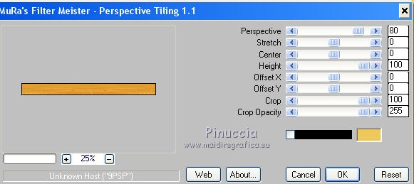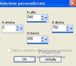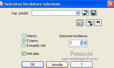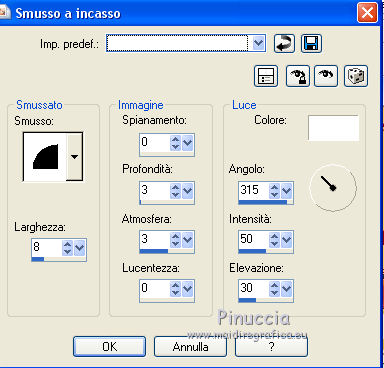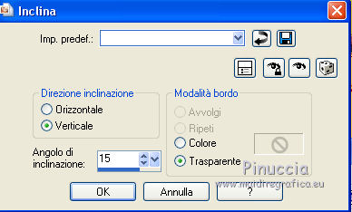qui puoi trovare qualche risposta ai tuoi dubbi. Se l'argomento che ti interessa non è presente, ti prego di segnalarmelo. Questo tutorial è una creazione di ©Titoune e non può essere copiato su altri siti nè essere offerto per il download. Lo stesso vale per la mia traduzione. Il tutorial è stato creato con Corel17, ma può essere eseguito anche con le altre versioni di PSP. Secondo la versione utilizzata (anteriore a PSP X) potresti ottenere dei risultati differenti. Dalla versione X4, il comando Immagine>Rifletti è stato sostituito con Immagine>Capovolgi in orizzontale, e il comando Immagine>Capovolgi con Immagine>Capovolgi in verticale. Nelle versioni X5 e X6, le funzioni sono state migliorate rendendo disponibile il menu Oggetti. Con il nuovo X7 sono tornati i comandi Rifletti/Capovolgi, ma con nuove differenze. Vedi la scheda sull'argomento qui Per tradurre il tutorial ho usato PSP X. Occorrente: Un tube a scelta. Il resto del materiale qui Filtri in caso di dubbi, ricorda di consultare la mia sezione filtri qui Filters Unlimited 2.0 qui Penta.com - Jeans qui DSB Flux - Bright Noise qui I filtri Penta.com si possono usare da soli o importati in Filters Unlimited (come fare vedi qui) Se un filtro fornito appare con questa icona ![]() Metti la selezione nella cartella Selezioni. 1. Apri una nuova immagine trasparente 750 x 600 pixels. Selezione>Seleziona tutto. 2. Apri l'immagine 2985837 e vai a Modifica>Copia. Torna al tuo lavoro e vai a Modifica>Incolla nella selezione. Selezione>Deseleziona. Immagine>Capovolgi. 3. Regola>Sfocatura>Sfocatura gaussiana - raggio 15. ![]() 4. Attiva lo strumento Selezione ![]() (non importa il tipo di selezione impostato, perchè con la selezione personalizzata si ottiene sempre un rettangolo) clicca sull'icona Selezione personalizzata ![]() e imposta i seguenti settaggi. ![]() 5. Livelli>Nuovo livello rastser. Apri l'elemento BBD_AD_PAPER_13 e vai a Modifica>Copia. Torna al tuo lavoro e vai a Modifica>Incolla nella selezione. 6. Effetti>Plugins>Mura's Meister - Perspective Tiling, con i settaggi standard. ![]() Selezione>Deseleziona. 7. Livelli>Nuovo livello raster. Selezione>Carica/Salva selezione>Carica selezione da disco. Cerca e carica la selezione "selection_scrap_tresor_automne". ![]() 8. Apri l'elemento BBD_AD_PAPER_17 e vai a Modifica>Copia. Torna al tuo lavoro e vai a Modifica>Incolla nella selezione. 9. Effetti>Effetti 3D>Smusso a incasso. ![]() 10. Selezione>Modifica>Seleziona bordature selezione. ![]() 11. Livelli>Nuovo livello raster. Apri l'elemento BBD_AD_PAPER_15 e vai a Modifica>Copia. Torna al tuo lavoro e vai a Modifica>Incolla nella selezione. Selezione>Deseleziona. Livelli>Unisci>Unisci giù. 12. Immagine>Ridimensiona, al 95%, tutti i livelli non selezionato. Regola>Messa a fuoco>Metti a fuoco. 13. Rimani posizionato sul livello della cornice. Attiva lo strumento Bacchetta magica ![]() e clicca nella parte esterna della cornice. Selezione>Modifica>Contrai - 15 pixels. 14. Attiva il livello inferiore - Raster 1. Selezione>Innalza selezione a livello. Effetti>Effetti di trama>Plastica morbida. ![]() 15. Effetti>Effetti geometrici>Inclina. ![]() Selezione>Innalza selezione a livello. Selezione>Deseleziona. 16. Effetti>Effetti di riflesso>Specchio rotante. ![]() 17. Effetti>Effetti 3D>Sfalsa ombra, colore #561608. ![]() Ripeti l'Effetto Sfalsa ombra, cambiando verticale e orizzontale con -3/3. 18. Ritorna sul livello della cornice. Attiva lo strumento Bacchetta magica ![]() e clicca al centro della cornice per selezionarla. Selezione>Modifica>Espandi - 3 pixels. 19. Livelli>Nuovo livello raster. Livelli>Disponi>Sposta giù. 20. Attiva nuovamente l'immagine 2985837 e vai a Modifica>Copia. Torna al tuo lavoro e vai a Modifica>Incolla nella selezione. Selezione>Deseleziona. 21. Ritorna sul livello della cornice. Effetti>Effetti 3D>Sfalsa ombra, colore #561608. ![]() Ripeti l'Effetto Sfalsa ombra, cambiando verticale e orizzontale con -3/3. 22. Apri l'elemento BBD_AD_GRASS_01 e vai a Modifica>Copia. Torna al tuo lavoro e vai a Modifica>Incolla come nuovo livello. Spostalo in basso a sinistra.![]() Effetti>Effetti 3D>Sfalsa ombra, colore #561608. ![]() 23. Apri l'elemento BBD_AD_LEAVES_02 e vai a Modifica>Copia. Torna al tuo lavoro e vai a Modifica>Incolla come nuovo livello. Spostalo nella parte sinistra della cornice.Vedi l'esempio finale. Effetti>Effetti 3D>Sfalsa ombra, con i settaggi precedenti. 24. Apri l'elemento BBD_SACHET BAG_01 e vai a Modifica>Copia. Torna al tuo lavoro e vai a Modifica>Incolla come nuovo livello. Spostalo nella parte inferiore sinistra della cornice.Vedi l'esempio finale. Effetti>Effetti 3D>Sfalsa ombra, con i settaggi precedenti. 25. Apri l'elemento BBD_AD_FLOWERBASKET_01 e vai a Modifica>Copia. Torna al tuo lavoro e vai a Modifica>Incolla come nuovo livello. Spostalo in basso a sinistra.Vedi l'esempio finale. Effetti>Effetti 3D>Sfalsa ombra, con i settaggi precedenti. 26. Apri l'elemento BBD_AD_LEAVES_01 e vai a Modifica>Copia. Torna al tuo lavoro e vai a Modifica>Incolla come nuovo livello. Spostalo nella parte inferiore della cornice.Vedi l'esempio finale. Effetti>Effetti 3D>Sfalsa ombra, con i settaggi precedenti. 27. Apri l'elemento BBD_AD_DECO_04 e vai a Modifica>Copia. Torna al tuo lavoro e vai a Modifica>Incolla come nuovo livello. Spostalo nella parte inferiore destra della cornice.Vedi l'esempio finale. Effetti>Effetti 3D>Sfalsa ombra, con i settaggi precedenti. 28. Apri l'elemento BBD_AD_DECO_03 e vai a Modifica>Copia. Torna al tuo lavoro e vai a Modifica>Incolla come nuovo livello. Spostalo nella parte inferiore destra della cornice.Vedi l'esempio finale. Effetti>Effetti 3D>Sfalsa ombra, con i settaggi precedenti. 29. Apri l'elemento BBD_AD_PINECONE_01 e vai a Modifica>Copia. Torna al tuo lavoro e vai a Modifica>Incolla come nuovo livello. Spostalo nella parte inferiore destra della cornice.Vedi l'esempio finale. Effetti>Effetti 3D>Sfalsa ombra, con i settaggi precedenti. 30. Apri l'element