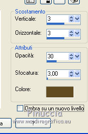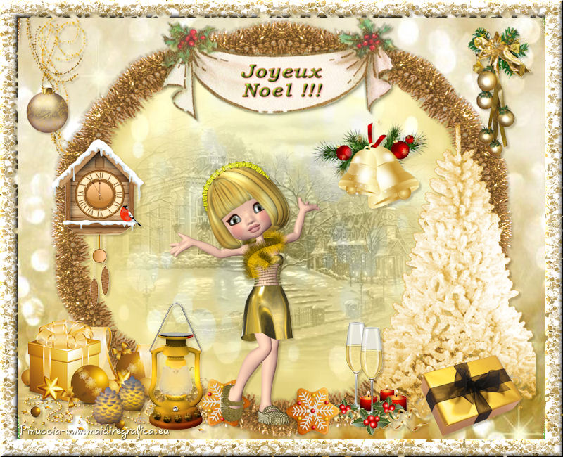 qui puoi trovare qualche risposta ai tuoi dubbi. Se l'argomento che ti interessa non è presente, ti prego di segnalarmelo. Questo tutorial è una creazione di ©Titoune e non può essere copiato su altri siti nè essere offerto per il download. Lo stesso vale per la mia traduzione. Il tutorial è stato creato con Corel17, ma può essere eseguito anche con le altre versioni di PSP. Secondo la versione utilizzata (anteriore a PSP X) potresti ottenere dei risultati differenti. Dalla versione X4, il comando Immagine>Rifletti è stato sostituito con Immagine>Capovolgi in orizzontale, e il comando Immagine>Capovolgi con Immagine>Capovolgi in verticale. Nelle versioni X5 e X6, le funzioni sono state migliorate rendendo disponibile il menu Oggetti. Con il nuovo X7 sono tornati i comandi Rifletti/Capovolgi, ma con nuove differenze. Vedi la scheda sull'argomento qui Per tradurre il tutorial ho usato PSP X. Occorrente: Un tube a scelta. Il resto del materiale qui Gli elementi utilizzati sono una creazione Yopriceville Il tube utilizzato è di Suelydam. ![]() 1. Apri una nuova immagine trasparente 750 x 600 pixels. Selezione>Seleziona tutto. 2. Apri l'immagine 2319e8f05d327fc191a073d649822519 e vai a Modifica>Copia. Torna al tuo lavoro e vai a Modifica>Incolla nella selezione. Selezione>Deseleziona. 3. Apri l'elemento garland_frame e vai a Modifica>Copia. Torna al tuo lavoro e vai a Modifica>Incolla come nuovo livello. Non spostarlo. 4. Attiva lo strumento Bacchetta magica ![]() e clicca al centro della cornice per selezionarla. Selezione>Modifica>Espandi - 3 pixels. 5. Livelli>Nuovo livello raster. Livelli>Disponi>Sposta giù. 6. Apri l'immagine 1_wdp e vai a Modifica>Copia. Torna al tuo lavoro e vai a Modifica>Incolla nella selezione. Selezione>Deseleziona. 7. Apri il tube 0_74d57_fb4eed48_L (paesaggio) e vai a Modifica>Copia. Torna al tuo lavoro e vai a Modifica>Incolla come nuovo livello. Non spostarlo. Cambia la modalità di miscelatura di questo livello in Luminanza (esistente) e abbassa l'opacità al 60%. 8. Apri l'elemento 7_85GzpDsow0-amcbE6vhkkVOsI e vai a Modifica>Copia. Torna al tuo lavoro e vai a Modifica>Incolla come nuovo livello. Spostalo nella parte destra del paesaggio.Vedi l'esempio finale. 9. Effetti>Effetti 3D>Sfalsa ombra, colore #624b20. ![]() 10. Attiva il livello della cornice. Effetti>Effetti 3D>Sfalsa ombra, colore #624b20. ![]() Ripeti l'Effetto Sfalsa ombra, cambiando verticale e orizzontale con -3. 11. Apri l'elemento 0_a4a17_363b495d_L (banner) e vai a Modifica>Copia. Torna al tuo lavoro e vai a Modifica>Incolla come nuovo livello. Spostalo nella parte superiore della cornice.Vedi l'esempio finale. Effetti>Effetti 3D>Sfalsa ombra, colore #624b20. ![]() 12. Apri l'elemento 0_9fcd8_b4271597_L (palline) e vai a Modifica>Copia. Torna al tuo lavoro e vai a Modifica>Incolla come nuovo livello. Spostalo nella parte superiore destra della cornice.Vedi l'esempio finale. Effetti>Effetti 3D>Sfalsa ombra, con i settaggi precedenti. 13. Apri l'elemento 0_a31c7_558febab_L (albero) e vai a Modifica>Copia. Torna al tuo lavoro e vai a Modifica>Incolla come nuovo livello. Spostalo nella parte destra della cornice.Vedi l'esempio finale. Effetti>Effetti 3D>Sfalsa ombra, con i settaggi precedenti. Apri l'elemento calguiscadeauor e vai a Modifica>Copia. Torna al tuo lavoro e vai a Modifica>Incolla come nuovo livello. Spostalo in basso a destra.Vedi l'esempio finale. Effetti>Effetti 3D>Sfalsa ombra, con i settaggi precedenti. 14. Apri l'elemento Christmas_Champagne_and_Candles_PNG_Clipart_Image e vai a Modifica>Copia. Torna al tuo lavoro e vai a Modifica>Incolla come nuovo livello. Spostalo nella parte inferiore.Vedi l'esempio finale. Effetti>Effetti 3D>Sfalsa ombra, con i settaggi precedenti. 15. Apri l'elemento Christmas_Cookie_Snowflake_PNG_Clipart_Image e vai a Modifica>Copia. Torna al tuo lavoro e vai a Modifica>Incolla come nuovo livello. Spostalo nella parte inferiore della cornice.Vedi l'esempio finale. Effetti>Effetti 3D>Sfalsa ombra, con i settaggi precedenti. Livelli>Duplica. Immagine>Rifletti. 16. Apri l'elemento 0_3f2db_76d3ac9b_L (pacchetti) e vai a Modifica>Copia. Torna al tuo lavoro e vai a Modifica>Incolla come nuovo livello. Spostalo nella parte inferiore sinistra della cornice.Vedi l'esempio finale. Effetti>Effetti 3D>Sfalsa ombra, con i settaggi precedenti. 17. Apri l'elemento DEC3029016-Z (pigne) e vai a Modifica>Copia. Torna al tuo lavoro e vai a Modifica>Incolla come nuovo livello. Spostalo nella parte inferiore della cornice.Vedi l'esempio finale. Effetti>Effetti 3D>Sfalsa ombra, con i settaggi precedenti. 18. Apri l'elemento 0_97563_f497d720_L (lanterna) e vai a Modifica>Copia. Torna al tuo lavoro e vai a Modifica>Incolla come nuovo livello. Spostalo nella parte inferiore della cornice.![]() Effetti>Effetti 3D>Sfalsa ombra, con i settaggi precedenti. 19. Apri l'elemento Christmas_Cuckoo_Clock_with_Snow_PNG_Clipart e vai a Modifica>Copia. Torna al tuo lavoro e vai a Modifica>Incolla come nuovo livello. Spostalo nella parte sinistra della cornice.Vedi l'esempio finale. Effetti>Effetti 3D>Sfalsa ombra, con i settaggi precedenti. 20. Apri l'elemento 0_9fc96_27f1699a_L e vai a Modifica>Copia. Torna al tuo lavoro e vai a Modifica>Incolla come nuovo livello. Spostalo nella parte superiore sinistra della cornice.Vedi l'esempio finale. Effetti>Effetti 3D>Sfalsa ombra, con i settaggi precedenti. 21. Apri il tuo tube e vai a Modifica>Copia. Torna al tuo lavoro e vai a Modifica>Incolla come nuovo livello. Immagine>Ridimensiona, se e quanto necessario, tutti i livelli non selezionato. Spostalo come preferisci o vedi il mio esempio.Effetti>Effetti 3D>Sfalsa ombra, con i settaggi precedenti. 22. Attiva il livello inferiore. Modifica>Copia. Selezione>Seleziona tutto. Immagine>Ritaglia la selezione. 23. Immagine>Dimensioni tela - 800 x 650 pixels. ![]() 24. Livelli>Nuovo livello raster. Livelli>Disponi>Sposta giù. Selezione>Seleziona tutto. Modifica>Incolla nella selezione. 25. Sel