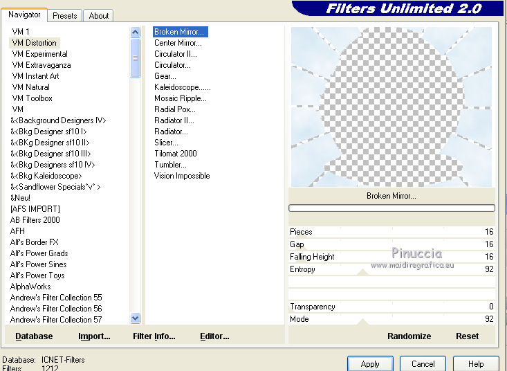 Effetti>Plugins>Filters Unlimited 2.0 - VM Distortion - Broken Mirror, con i settaggi standard.