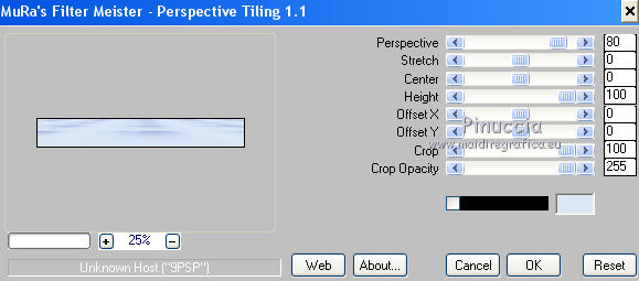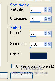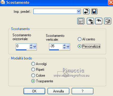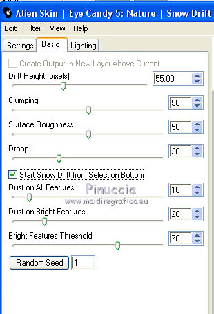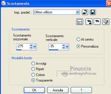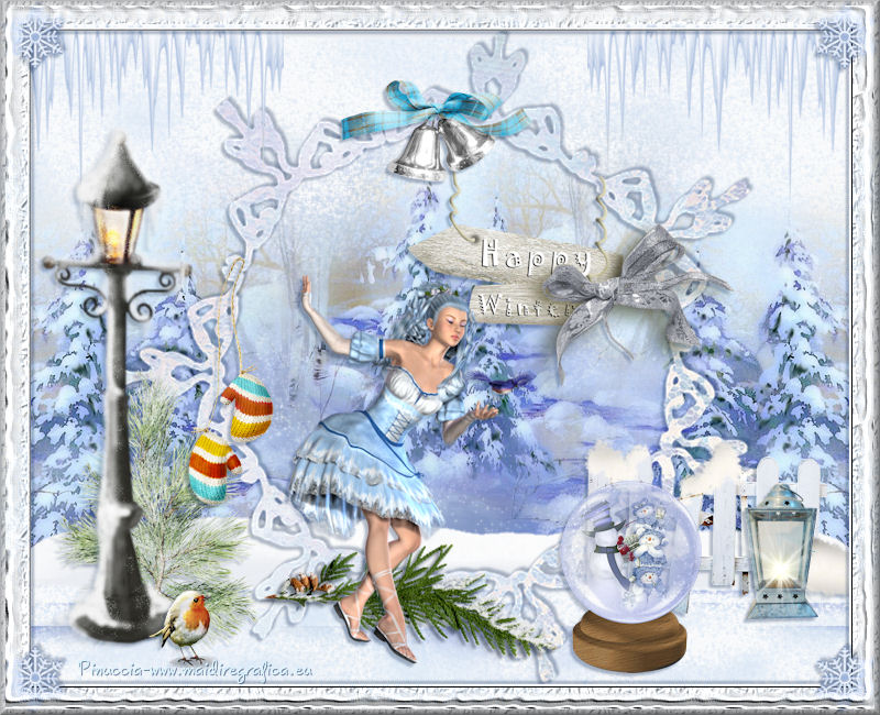 qui puoi trovare qualche risposta ai tuoi dubbi. Se l'argomento che ti interessa non è presente, ti prego di segnalarmelo. Questo tutorial è una creazione di ©Titoune e non può essere copiato su altri siti nè essere offerto per il download. Lo stesso vale per la mia traduzione. Il tutorial è stato creato con Corel17, ma può essere eseguito anche con le altre versioni di PSP. Secondo la versione utilizzata (anteriore a PSP X) potresti ottenere dei risultati differenti. Dalla versione X4, il comando Immagine>Rifletti è stato sostituito con Immagine>Capovolgi in orizzontale, e il comando Immagine>Capovolgi con Immagine>Capovolgi in verticale. Nelle versioni X5 e X6, le funzioni sono state migliorate rendendo disponibile il menu Oggetti. Con il nuovo X7 sono tornati i comandi Rifletti/Capovolgi, ma con nuove differenze. Vedi la scheda sull'argomento qui Per tradurre il tutorial ho usato PSP X. Occorrente: Un tube a scelta. Il resto del materiale qui Il tube del paesaggio è di DaisyWeb. Filtri in caso di dubbi, ricorda di consultare la mia sezione filtri qui Simple - Top Left Mirror qui Penta.com - Dot and Cross qui Filters Unlimited 2.0 qui Alien Skin Eye Candy 5 Nature - Snow Drift qui Mura's Meister - Perspective Tiling qui I filtri Simple e Penta.com si possono usare da soli o importati in Filters Unlimited (come fare vedi qui) Se un filtro fornito appare con questa icona ![]() 1. Apri una nuova immagine trasparente 750 x 600 pixels. Selezione>Seleziona tutto. 2. Apri l'immagine in jpg DaisyWeb_Blue Trees e vai a Modifica>Copia. Torna al tuo lavoro e vai a Modifica>Incolla nella selezione. 3. Effetti>Effetti di immagine>Motivo unico. ![]() 4. Regola>Sfocatura>Sfocatura gaussiana - raggio 20. ![]() 5. Attiva lo strumento Selezione ![]() (non importa il tipo di selezione impostato, perchè con la selezione personalizzata si ottiene sempre un rettangolo) clicca sull'icona Selezione personalizzata ![]() e imposta i seguenti settaggi. ![]() Selezione>Innalza selezione a livello. 6. Effetti>Plugins>Mura's Meister - Perspective tiling, con i settaggi standard. ![]() Selezione>Deseleziona. 5. Effetti>Plugins>Alien Skin Eye candy 5 Nature - Snow Drift. ![]() 6. Attiva il livello inferiore. Effetti>Plugins>Alien Skin Eye candy 5 Nature - Snow Drift, con i settaggi precedenti. 7. Ritorna sul livello superiore. Apri l'elemento 0_9cee8_d9cf9525_L e vai a Modifica>Copia. Torna al tuo lavoro e vai a Modifica>Incolla come nuovo livello. 8. Immagine>Ridimensiona, al 120%, tutti i livelli non selezionato. Non spostarlo. 9. Attiva lo strumento Bacchetta magica ![]() e clicca al centro della cornice per selezionarla. Selezione>Modifica>Contrai - 15 pixels. Selezione>Modifica>Sfuma - 15 pixels. 10. Livelli>Nuovo livello raster. Livelli>Disponi>Sposta giù. 11. Apri il tube DaisyWeb_Blue Trees e vai a Modifica>Copia. Torna al tuo lavoro e vai a Modifica>Incolla nella selezione. Selezione>Deseleziona. 12. Effetti>Effetti di immagine>Scostamento. ![]() 13. Torna sul livello della cornice. Effetti>Effetti 3D>Sfalsa ombra, colore #051f49. ![]() Ripeti l'Effetto Sfalsa ombra, ma verticale e orizzontale -3/3. 14. Modifica>Incolla come nuovo livello (il tube DaisyWeb_Blue Trees è sempre in memoria). 15. Effetti>Effetti di immagine>Scostamento. ![]() Porta questo livello sopra il livello Raster 1. Livelli>Duplica. Immagine>Rifletti. 16. Ritorna sul livello superiore. Apri il tube icicles e vai a Modifica>Copia. Torna al tuo lavoro e vai a Modifica>Incolla come nuovo livello. Spostalo in alto, contro il bordo.Apri l'elemento 0_9ce68_23d3cbb6_L (ramo) e vai a Modifica>Copia. Torna al tuo lavoro e vai a Modifica>Incolla come nuovo livello. Spostalo nella parte inferiore sinistra.Vedi l'esempio finale. Effetti>Effetti 3D>Sfalsa ombra, colore #051f49. ![]() 17. Apri l'elemento 0_9c625_7e931846_L (Fanale) e vai a Modifica>Copia. Torna al tuo lavoro e vai a Modifica>Incolla come nuovo livello. Spostalo a sinistra.Vedi l'esempio finale. Effetti>Effetti 3D>Sfalsa ombra, con i settaggi precedenti. 18. Apri l'elemento 0_9d78f_af7c7001_L (uccellino) e vai a Modifica>Copia. Torna al tuo lavoro e vai a Modifica>Incolla come nuovo livello. Spostalo nella parte inferiore sinistra.Vedi l'esempio finale. Effetti>Effetti 3D>Sfalsa ombra, con i settaggi precedenti. 19. Apri l'elemento 0_9d793_ad29e275_L (guantini) e vai a Modifica>Copia. Torna al tuo lavoro e vai a Modifica>Incolla come nuovo livello. Spostalo nella parte sinistra della cornice.Vedi l'esempio finale. Effetti>Effetti 3D>Sfalsa ombra, con i settaggi precedenti. 20. Apri l'elemento 0_9f5d8_8e522501_L (ramo2) e vai a Modifica>Copia. Torna al tuo lavoro e vai a Modifica>Incolla come nuovo livello. Spostalo nella parte inferiore della cornice.Vedi l'esempio finale. Effetti>Effetti 3D>Sfalsa ombra, con i settaggi precedenti. 21. Apri l'elemento 0_9f5e4_9a1d1345_L (steccato) e vai a Modifica>Copia. Torna al tuo lavoro e vai a Modifica>Incolla come nuovo livello. Spostalo nella parte inferiore destra della cornice.Vedi l'esempio finale. Effetti>Effetti 3D>Sfalsa ombra, con i settaggi precedenti. 22. Apri l'elemento 0_9cf09_57e8176_L (lanterna) e vai a Modifica>Copia. Torna al tuo lavoro e vai a Modifica>Incolla come nuovo livello. Spostalo nella parte inferiore destra della cornice.Vedi l'esempio finale. Effetti>Effetti 3D>Sfalsa ombra, con i settaggi precedenti. 23. Apri l'elemento Transparent_Christmas_Snowglobe_with_Snowmans_Clipart e vai a Modifica>Copia. Torna al tuo lavoro e vai a Modifica>Incolla come nuovo livello. Spostalo nella parte inferiore della cornice.Vedi l'esempio finale. Effetti>Effetti 3D>Sfalsa ombra, con i settaggi precedenti. 24. Apri l'elemento 0_9cee3_c8c5e299_L (tabella) e vai a Modifica>Copia. Torna al tuo lavoro e vai a Modifica>Incolla come nuovo livello. Spostalo nella parte superiore della cornice.Vedi l'esempio finale. Effetti>Effetti 3D>Sfalsa ombra, con i settaggi precedenti. 25. Apri l'elemento 0_9cee7_2efa8131_L (campane) e vai a Modi
