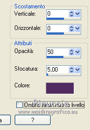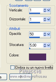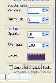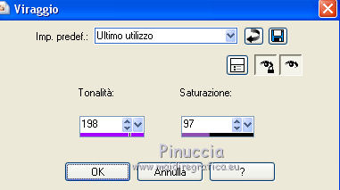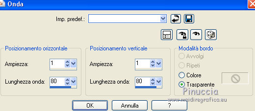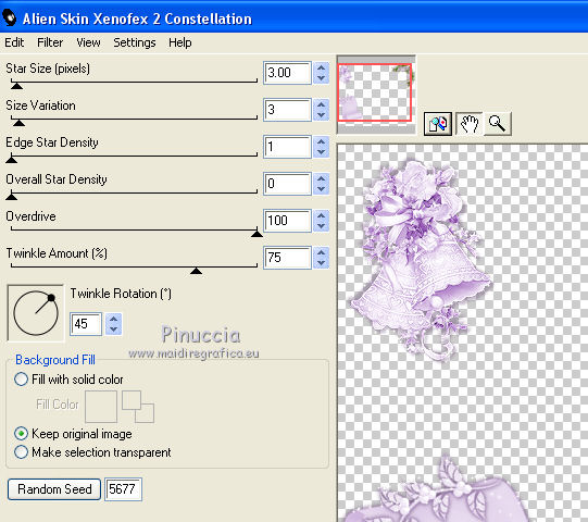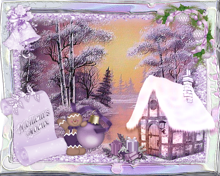 qui puoi trovare qualche risposta ai tuoi dubbi. Se l'argomento che ti interessa non è presente, ti prego di segnalarmelo. Questo tutorial è una creazione di ©Titoune e non può essere copiato su altri siti nè essere offerto per il download. Lo stesso vale per la mia traduzione. Il tutorial è stato creato con Corel17, ma può essere eseguito anche con le altre versioni di PSP. Secondo la versione utilizzata (anteriore a PSP X) potresti ottenere dei risultati differenti. Dalla versione X4, il comando Immagine>Rifletti è stato sostituito con Immagine>Capovolgi in orizzontale, e il comando Immagine>Capovolgi con Immagine>Capovolgi in verticale. Nelle versioni X5 e X6, le funzioni sono state migliorate rendendo disponibile il menu Oggetti. Con il nuovo X7 sono tornati i comandi Rifletti/Capovolgi, ma con nuove differenze. Vedi la scheda sull'argomento qui Per tradurre il tutorial ho usato PSP X. Occorrente: Un tube a scelta. Il resto del materiale qui Filtri in caso di dubbi, ricorda di consultare la mia sezione filtri qui FM Tile Tools - Blend Emboss qui Alien Skin Xenofex 2 - Constellation qui Animation Shop qui ![]() 1. Apri una nuova immagine trasparente de 750 x 600 pixels. Selezione>Seleziona tutto. 2. Apri l'elemento 331d96dd, e vai a Modifica>Copia. Torna al tuo lavoro e vai a Modifica>Incolla nella selezione. 3. Selezione>Modifica>Contrai - 45 pixels. Selezione>Innalza selezione a livello. 4. Regola>Sfocatura>Sfocatura gaussiana - raggio 25. ![]() 5. Selezione>Inverti. Attiva il livello Raster 1. Selezione>Innalza selezione a livello. Livelli>Disponi>Porta in alto. 6. Effetti>Effetti 3D>Smusso a incasso. ![]() 7. Effetti>Effetti di trama>Plastica morbida. ![]() Effetti>Effetti di bordo>Aumenta. 8. Effetti>Effetti di distorsione>Onda. ![]() 9. Di nuovo Selezione>Seleziona tutto. Selezione>Modifica>Contrai - 45 pixels. Livelli>Nuovo livello raster. Livelli>Disponi>Sposta giù. 10. Apri l'elemento Christmas in Pink_Glitter Frame_Scrap and Tubes. Regola>Tonalità e saturazione>Viraggio. ![]() 11. Modifica>Copia. Torna al tuo lavoro e vai a Modifica>Incolla nella selezione. Selezione>Modifica>Contrai - 25 pixels. Selezione>Modifica>Sfuma - 30 pixels. 12. Livelli>Nuovo livello raster. Livelli>Disponi>Sposta giù. Apri l'immagine Painting01 WINTER e vai a Modifica>Copia. Torna al tuo lavoro e vai a Modifica>Incolla nella selezione. Selezione>Deseleziona. Plugins>FM Tile Tools - Blend Emboss, con i settaggi standard. ![]() 14. Attiva il livello superiore (i bordi). Effetti>Effetti 3D>Sfalsa ombra, colore #512d60. ![]() Ripeti l'Effetto Sfalsa ombra, cambiando verticale e orizzontale con -3. 15. Apri l'elemento 419920a2 (casa) - e vai a Modifica>Copia. Torna al tuo lavoro e vai a Modifica>Incolla come nuovo livello. Spostalo in basso a sinistra.Cambia la modalità di miscelatura di questo livello in Luminanza (esistente). Niente Sfalsa ombra. 16. Apri l'elemento b3376fb7 (pacchetti) e vai a Modifica>Copia. Torna al tuo lavoro e vai a Modifica>Incolla come nuovo livello. Spostalo nella parte inferiore.Vedi l'esempio finale. Niente Sfalsa ombra. 17. Apri l'elemento c5c86ba3 (palline) e vai a Modifica>Copia. Torna al tuo lavoro e vai a Modifica>Incolla come nuovo livello. Spostalo in alto a destra.Vedi l'esempio finale. Niente sfalsa ombra. 18. Apri l'elemento FAH~PP~Wedding Bells 4-15-04 pink e vai a Modifica>Copia. Torna al tuo lavoro e vai a Modifica>Incolla come nuovo livello. Spostalo in alto a sinistra.Vedi l'esempio finale. Effetti>Effetti 3D>Sfalsa ombra, con i settaggi precedenti. 19. Apri l'elemento 9dfa01f2 (pergamena) e vai a Modifica>Copia. Torna al tuo lavoro e vai a Modifica>Incolla come nuovo livello. Spostalo in basso a sinistra.Vedi l'esempio finale. 20. Effetti>Effetti 3D>Sfalsa ombra, colore #512d60. ![]() Ripeti l'Effetto Sfalsa ombra, cambiando verticale e orizzontale con -1. 21. Apri l'elemento Christmas in Pink_Branch_Scrap and Tubes e vai a Modifica>Copia. Torna al tuo lavoro e vai a Modifica>Incolla come nuovo livello. Spostalo sulla pergamena.Vedi l'esempio finale. Effetti>Effetti 3D>Sfalsa ombra, con i settaggi precedenti. Regola>Tonalità e saturazione>Viraggio, con i settaggi precedenti. ![]() Effetti>Effetti 3D>Sfalsa ombra, con i settaggi precedenti. Livelli>Unisci>Unisci giù. Ripeti Livelli>Unisci>Unisci giù - 2 volte, per unire in un unico livello il livello della pergamena, delle palline e delle campane. ![]() Rinomina questo livello "animazione". 22. Apri l'elemento 33214133 (testo) e vai a Modifica>Copia. Torna al tuo lavoro e vai a Modifica>Incolla come nuovo livello. Spostalo al centro della pergamena.Vedi l'esempio finale. Cambia la modalità di miscelatura di questo livello in Luminanza (esistente). Effetti>Effetti 3D>Sfalsa ombra, colore #512d60. ![]() 24. Apri l'elemento 9d810f7d (pupazzo) e vai a Modifica>Copia. Torna al tuo lavoro e vai a Modifica>Incolla come nuovo livello. Spostalo a destra della pergamena.Vedi l'esempio finale. Effetti>Effetti 3D>Sfalsa ombra, colore #512d60. ![]() Ripeti l'Effetto Sfalsa ombra, cambiando verticale e orizzontale con -1. Firma il tuo lavoro. 25. Animazione. Attiva il livello "animazione". Effetti>Plugins>Alien Skin Xenofex 2 - Constellation. ![]() Modifica>Copia Unione. Apri Animation Shop e vai a Modifica>Incolla>Incolla come nuova animazione. 26. Torna in PSP. Modifica>Annulla azione Constellation. Ripeti Effetti>Plugins>Alien Skin Xenofex 2 - Constellation, con gli stessi settaggi, ma cliccando una volta su Random Seed. Modifica>Copia Unione. Torna in Animation Shop e vai a Modifica>Incolla>Incolla dopo il fotogramma corrente. 27. Di nuovo in PSp. Modifica>Annulla azione Constellation. Effetti>Plugins>Alien Skin Xenofex 2 - Constellation, clicca su Random Seed e ok. Modifica>Copia Unione. Torna in Animation Shop e vai a Modifica>Incolla>Incolla dopo il fotogramma corrente. 28. Modifica>Seleziona tutto. Animazione Proprietà del fotogramma e imposta la velocità a 15. ![]() Controlla il risultato cliccand