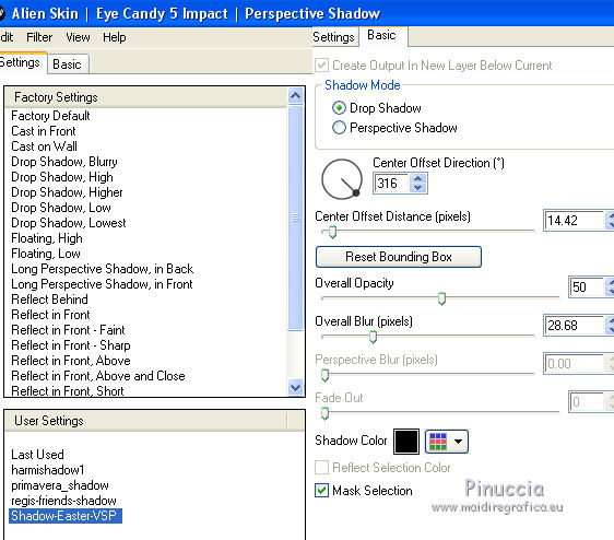 Effetti>Plugins>Alien Skin Eye Candy 5 Impact - Perspective Shadow, con i settaggi precedenti.