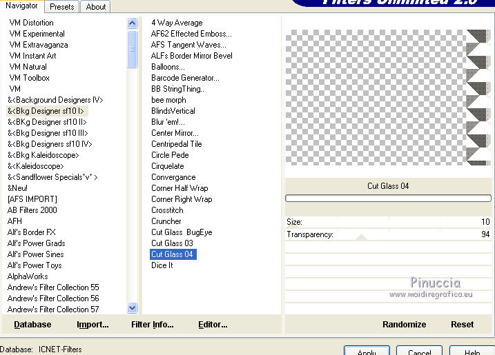 Effetti>Plugins><I.C.NET Software>, Filters Unlimited 2.0, - &<Bkg Designer sf10I> - Cut Glass 04, con i settaggi standard.