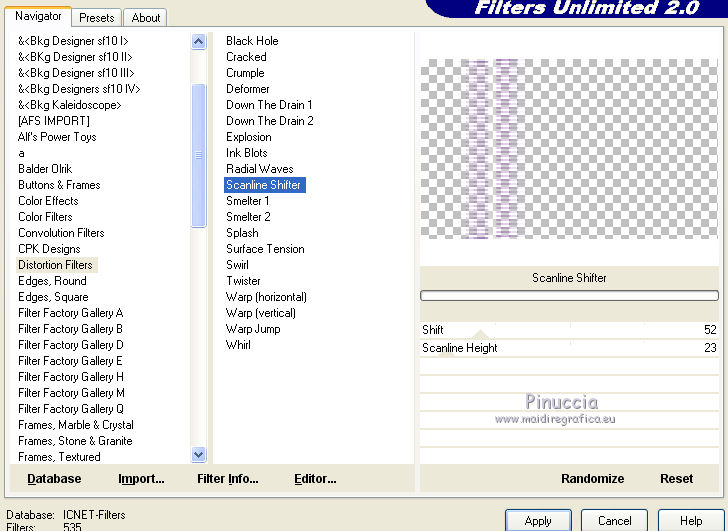 Effetti>Plugins>Filters Unlimited 2.0 - Distortion Filters - Scanline Shifter.