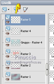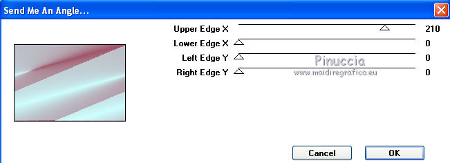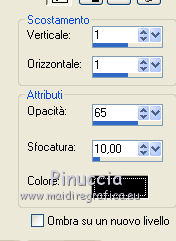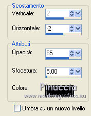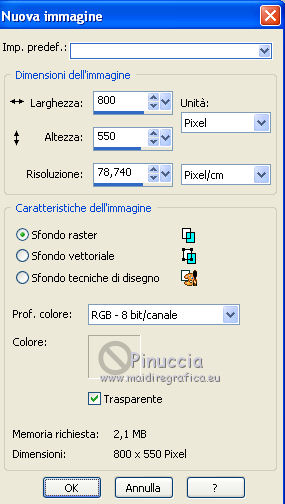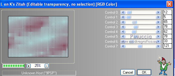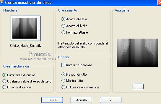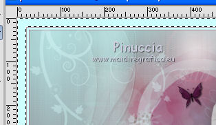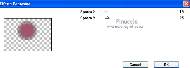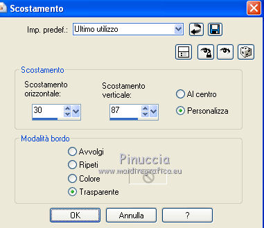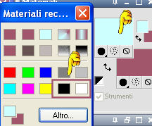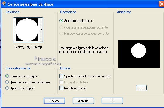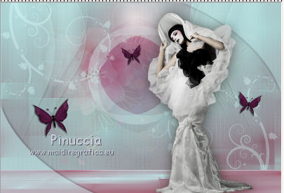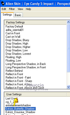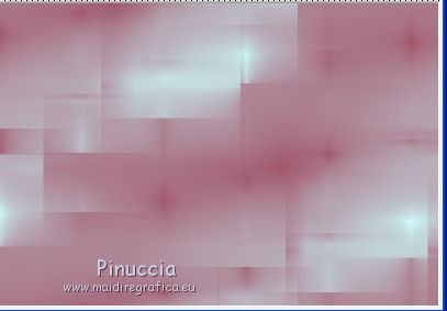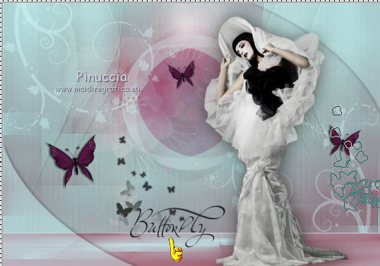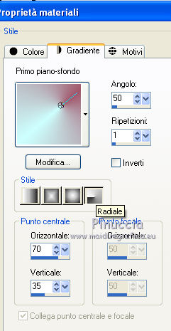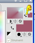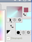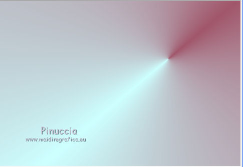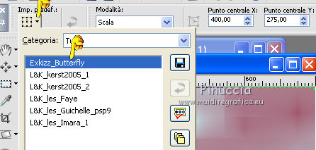 qui puoi trovare qualche risposta ai tuoi dubbi. Se l'argomento che ti interessa non è presente, ti prego di segnalarmelo. Questo tutorial è stato creato con PSP X2, ma può essere eseguito anche con le altre versioni di PSP. Per tradurlo, ho usato PSP X. Questo tutorial è una creazione di ©Exkizz Eskiss e non può essere copiato su altri siti nè essere offerto per il download. Lo stesso vale per la mia traduzione. Il materiale viene da vari gruppi di condivisione. Il copyright appartiene ai rispettivi autori. Grazie ai creatori dei tubes che mettono a disposizione il loro lavoro in vari gruppi di condivisione. Rispetta il lavoro degli autori, non cambiare il nome del file e non cancellare il watermark. Occorrente: Materiale qui Scompattato il materiale, troverai 6 cartelle: Masque che contiene la maschera Exkizz_Mask_Butterfly. Filtri: in caso di dubbi, ricorda di consultare la mia sezione filtri qui Mehdi - Weaver qui L&K - L&K Zitah qui Rendu - Nuages e Halo (incluso nel materiale). Italian Editors Effect - Effetto Fantasma qui Alien Skin Eye Candy 5 Impact - Perspective Shadow qui Filters Factory Gallery L - Send me an angle qui Il filtro "Send me an angle" circola anche in una lista di filtri denominati "Deformation" qui Vedi alcune note su questo argomento nella scheda del filtro qui Metti la maschera Exkizz_Mask_Butterfly nella cartella Maschere. Metti la selezione nella cartella Selezioni. Metti il preset Preset_RasterDeform_Exkizz nella cartella Impostazioni predefinite. Metti i pennelli della cartella "Pinceaux" nella cartella Pennelli. Ricorda che i due files di ogni pennelli non vanno separati. se preferisci, per non appesantire le cartelle di PSP, puoi inserire nei Percorsi Files le rispettive cartelle del materiale. In questo modo, avrai ti sarà più facile selezionare il materiale quando ti servirà e, una volta terminato il tutorial, potrai rimuovere le cartelle dai Percorsi Metti il preset Exkizz_Butterfly_Shadow nella cartella filtro: Alien Skin Eye Candy 5 Impact>Settings... (Backlight, Glass, Gradient Glow, Shadow). Se preferisci puoi importarlo, quando ti servirà, dalla cartella in cui hai scompattato il materiale. Vedi la scheda del filtro qui e come importare un preset in Eye Candy qui Colori utilizzati Apri la paletta "Palette_butterfly" in PSP. Attiva lo strumento Contagocce ![]() Clicca con il tasto sinistro del mouse per impostare il colore di primo piano, e con il tasto destro per impostare il colore di sfondo. (Nota: Nel materiale trovi una paletta Template, nel caso volessi usare altri colori. Seleziona ogni casella con la bacchetta magica , modalità Sostituisci, corrispondenza Valore RGB, sfumatura e tolleranza0),e riempi la casella con i tuoi colori).Per questo tutorial sono stati usati: il colore chiaro luminoso #cdffff ![]() il colore scuro #a1566b ![]() Inoltre i colori bianco e nero; cliccando con il tasto destro del mouse sulla paletta che ti interessa, per avere la tabella dei colori recenti, il bianco e il nero si trovano sempre in fondo alla lista. ![]() Per scegliere altri colori in armonia con i tuoi tubes, scegli due colore molto contrastanti. Ecco paletta dei colori. ![]() 1. Con l'aiuto della paletta, o impostandoli manualmente, imposta il colore di primo piano con il colore scuro #a1566b ![]() e il colore di sfondo con il colore chiaro #cdffff ![]() Passa il colore di primo piano a Gradiente Radiale, con i seguenti settaggi. ![]() 1. Apri una nuova immagine trasparente 800 x 550 pixels. ![]() Riempi l'immagine trasparente con il gradiente.![]() Effetti>Plugins>Filter Factory Gallery L - Send me an Angle..., con i settaggi standard. ![]() Effetti>Effetti di immagine>Motivo unico. ![]() Effetti>Plugins>Mehdi - Weaver: ![]() Effetti>Effetti di bordo>Aumenta. Effetti>Plugins>L&K - L&K Zitah. ![]() 2. Livelli>Nuovo livello raster - Raster 2. Inverti i colori della paletta; cliccando sulla freccia tra le palette piccole, avrai invertito anche i colori del gradiente. ![]() Riempi il nuovo livello con questo gradiente.Effetti>Plugins>Filter Factory Gallery L - Send me an angle, come al punto 1. Effetti>Effetti di immagine>Motivo unico, con i settaggi precedenti. Effetti>Plugins>Mehdi - Weaver, con i settaggi precedenti. Dovresti avere questo. ![]() Premi sulla tastiera il tasto D per attivare lo strumento Deformazione ![]() Apri il menu dello strumento cliccando sulla piccola freccia a fianco dell'icona, e seleziona il preset Exkizz_Butterfly. ![]() Avrai questo. ![]() Effetti>Effetti di immagine>Scostamento. ![]() Per liberarti della griglia dello strumento clicca sulla manina ![]() Effetti>Effetti di bordo>Aumenta. Dovresti avere questo. ![]() 3. Apri il tube con i fiori "Tube Jring's Redimensionné" e vai a Modifica>Copia. Torna al tuo lavoro e vai a Modifica>Incolla come nuovo livello - Raster 3. La modalità di miscelatura di questo tube è impostata in Luce diffusa. Se stai utilizzando un altro tube, scegli la modalità che preferisci. Effetti>Effetti di immagine>Scostamento. ![]() Risultato. ![]() 4. Livelli>Nuovo livello raster - Raster 4. Porta il colore di primo piano al colore #cdffff. ![]() Riempi il livello con questo colore.Livelli>Carica/Salva maschera>Carica maschera da disco. Cerca e carica la maschera Exkizz_Mask_Butterfly. ![]() Prima di unire: Regola>Messa a fuoco>Metti a fuoco. Livelli>Unisci>Unisci gruppo. Effetti>Effetti 3D>Sfalsa ombra, con il colore nero. ![]() Per colmare il piccolo scostamento creato dall'ombra: ![]() Effetti>Effetti di immagine>Scostamento. ![]() Dovresti avere questo. ![]() Effetti>Plugins>Rendu - Halo: dopo aver impostato la Luminosité a 100 e l'Objectif a 50-300mm, con il mouse sposta la piccola croce sulla parte centrale e superiore dell'immagine. ![]() Risultato. ![]() 5. Livelli>Nuovo livello raster - Raster 4. Attiva lo strumento Pennello ![]() cerca e seleziona il pennello "Git1", con i settaggi standard, e applica il pennello in alto a sinistra, cliccando con il tasto sinistro del mouse p