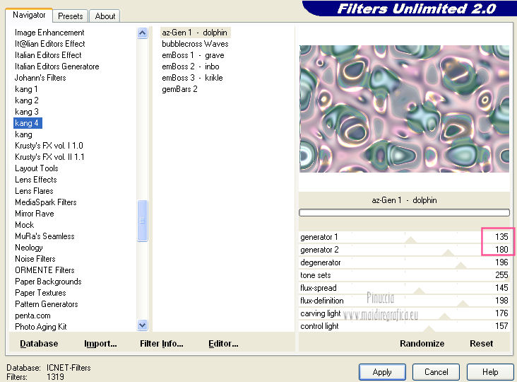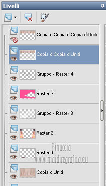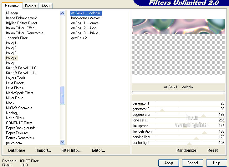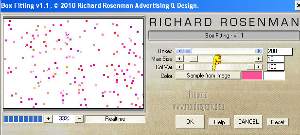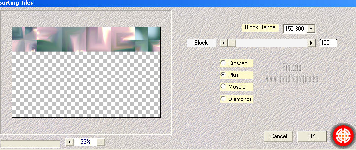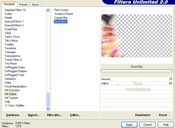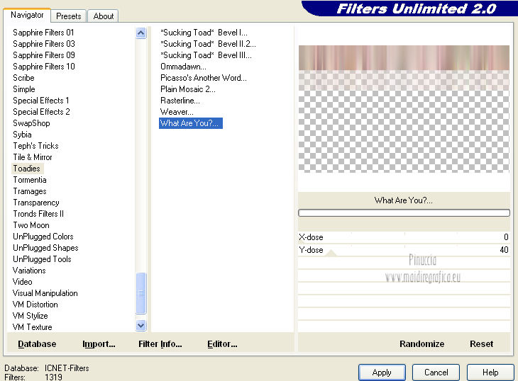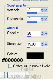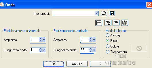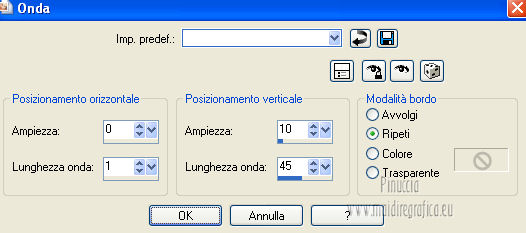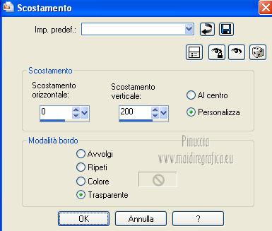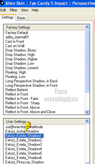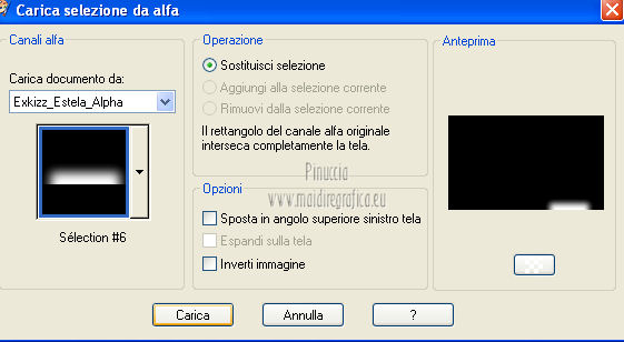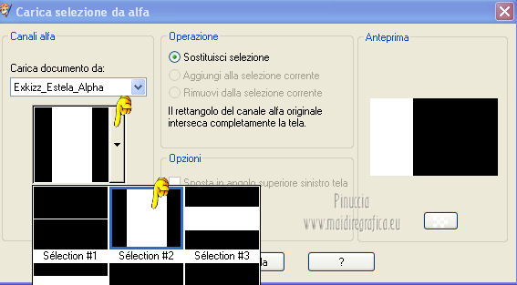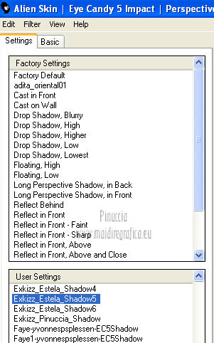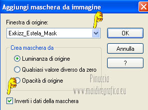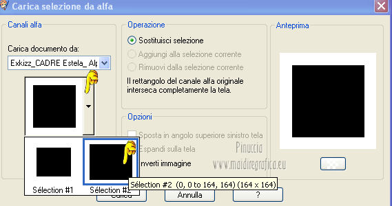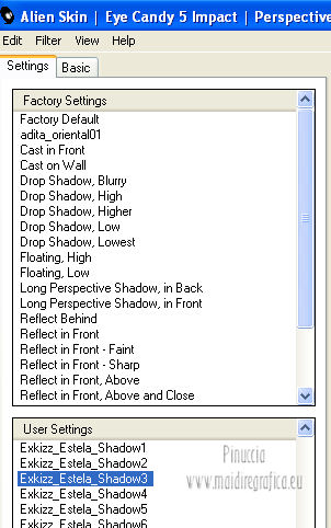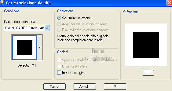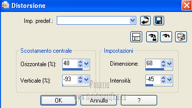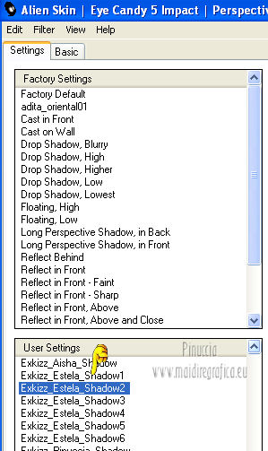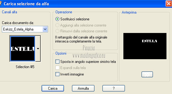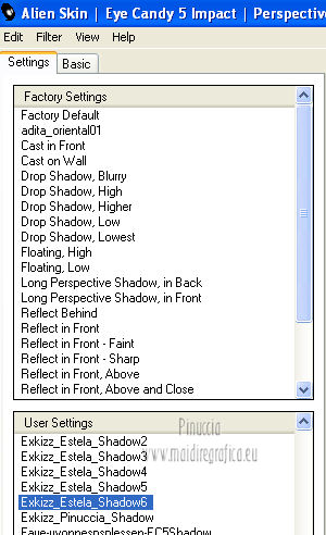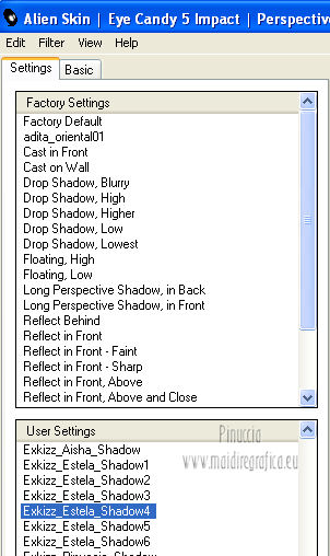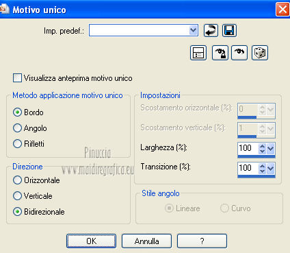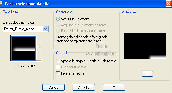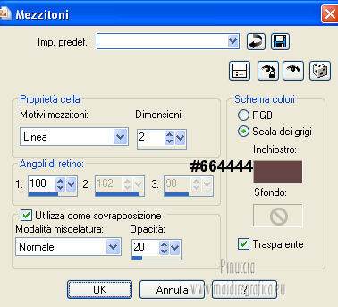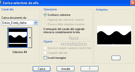 qui puoi trovare qualche risposta ai tuoi dubbi. Se l'argomento che ti interessa non è presente, ti prego di segnalarmelo. Questo tutorial è stato creato con PSP X2, ma può essere eseguito anche con le altre versioni di PSP. Per tradurlo, ho usato PSP X. Questo tutorial è una creazione di ©Exkizz Eskiss e non può essere copiato su altri siti nè essere offerto per il download. Lo stesso vale per la mia traduzione. Il materiale viene da vari gruppi di condivisione. Il copyright appartiene ai rispettivi autori. Grazie ai creatori dei tubes che mettono a disposizione il loro lavoro in vari gruppi di condivisione. Rispetta il lavoro degli autori, non cambiare il nome del file e non cancellare il watermark. Occorrente: Materiale qui Il tube della donna è di Mary Grazie Mary per l'autorizzazione ad usare questo bel tube. La maschera @nn_061012_mask_183_tdstudio è di @nn Tdstudio. Grazie Ann per l'autorizzazione ad usare questa maschera. E' vietato modificare, rinominare o togliere il watermark dai tubes. in caso di dubbi, ricorda di consultare la mia sezione filtri qui Filters Unlimited 2.0 qui Mehdi 2 - Flat median qui Mehdi - Sorting Tiles qui Toadies - What are you qui VM Stylize - Zoom blur qui Richard Rosenman - Box Fitting qui Transparency - Eliminate White qui Kang 4 qui Alien Skin Eye Candy 5 Impact - Perspective Shadow qui I filtri Kang, Toadies, Transparency e VM Stylize si possono usare da soli o importati in Filters Unlimited. A volte il diverso uso può dare risultati differenti, come in questo tutorial, nel caso dell'effetto What are you. E' quindi obbligatorio importare l'effetto in Unlimited per ottenere il risultato del lavoro finale. ![]() Metti i 5 preset nella cartella del filtro Alien Skin Eye Candy 5 Impact>Settings>Shadow. Cliccando sul files, automaticamente il preset si installerà nella cartella corretta. Apri le maschere in PSP e minimizzale con il resto del materiale. Colori utilizzati Apri la paletta "Exkizz_Palette_Estela" in PSP. Attiva lo strumento Contagocce ![]() e clicca con il tasto sinistro del mouse per impostare il colore di primo piano, e con il tasto destro per impostare il colore di sfondo. (Nota: Nel materiale trovi una paletta Template, nel caso volessi usare altri colori. Seleziona ogni casella con la bacchetta magica , modalità Sostituisci, corrispondenza Valore RGB, sfumatura e tolleranza0),e riempi la casella con i tuoi colori).***** Scegli tre colori, uno scuro, uno chiaro e un colore vivo in armonia con il tuo tube. Questa la mia paletta dei colori. ![]() ***** Passo 1. 1. Apri la paletta "Exkizz_Palette_Estela". Strumento Contagocce (E) ![]() Clicca con il tasto sinistro del mouse sul colore chiaro #ffe7ba ![]() per impostarlo come colore di primo piano. Clicca con il tasto destro del mouse sul colore scuro #664444 ![]() per impostarlo come colore di sfondo. ![]() Passo 2 Passa il colore di primo piano a Gradiente, stile Lineare, con i seguenti settaggi. ![]() Passo 3 1. Apri "Exkizz_CADRE_Estela_Alpha". ![]() Finestra>Duplica (o, sulla tastiera, maiuscola+D) per fare una copia, e chiudi l'originale. Questa immagine contiene due selezioni salvate sul canale alfa. Elimina il livello "watermark". Nota: il livello Raster 1 è in modalità Sovrapponi. 2. Livelli>Nuovo livello raster - Raster 2. 3. Riempi il livello con il gradiente lineare (tasto sinistro).4. Effetti>Effetti di immagine>Motivo unico. ![]() 5. Selezione>Carica/Salva selezione>Carica selezione da canale alfa. La selezione Selection#1 è subito disponibile, devi soltanto cliccare Carica. ![]() Premi sulla tastiera il tasto CANC. Selezione>Deseleziona. 6. Livelli>Disponi>Sposta giù. 7. Livelli>Nuovo livello raster - Raster 3. 8. Imposta il colore di primo piano con il colore #ff5095 ![]() ![]() 9. Selezione>Carica/Salva selezione>Carica selezione da canale alfa. Apri il menu delle selezioni e carica Selection#2. ![]() 10. Attiva lo strumento Riempimento ![]() e imposta l'opacità a 80. ![]() Riempi la selezione con il colore di primo piano #ff5095 ![]() Selezione>Deseleziona. 11. Livelli>Unisci>Unisci visibile. Dovresti avere questo. ![]() Lascia il lavoro in attesa. Passo 4 1. Apri "Exkizz_Estela_Alpha". ![]() Finestra>Duplica (o, sulla tastiera, maiuscola+D) per fare una copia, e chiudi l'originale. Lavora sulla copia. L'immagine non è vuota, ma contiene le selezioni salvate sul canale alfa. Per eliminare il watermark, premi sulla tastiera il tasto CANC. 2. Riporta il colore di primo al colore #ffe7ba ![]() il colore di sfondo è sempre #664444 ![]() ![]() Passa il colore di primo piano a Gradiente, mantenendo i settaggi iniziali. ![]() 3. Attiva lo strumento Riempimento ![]() riporta l'opacità a 100 ![]() e riempi l'immagine trasparente con il gradiente.4. Effetti>Effetti di immagine>Motivo unico. ![]() 5. Livelli>Duplica - Copia di Raster 1. 6. Effetti>Plugins>Filters Unlimited 2.0 - Kang - as-Gen1-dolphin. ![]() 7. Effetti>Plugins>Mehdi 2 - Flat Median. ![]() 8. Cambia la modalità di miscelatura di questo livello in Sovrapponi. 9. Livelli>Unisci>Unisci visibile. 10. Livelli>Duplica (copia di Uniti). 11. Chiudi questo livello e attiva il livello sottostante dell'originale "Uniti". ![]() 12. Regola>Messa a fuoco>Accentua messa a fuoco. 13. Effetti>Effetti artistici>Mezzitoni - colore di sfondo #664444 ![]() ![]() Passo 5 1. Apri e attiva il livello Copia di Uniti. ![]() 2. Effetti>Effetti di immagine>Scostamento. ![]() 3. Livelli>Duplica - Copia di Copia di Uniti. Chiudi questo livello e attiva il livello sottostante Copia di Uniti. ![]() 4. Regola>Messa a fuoco>Metti a fuoco. 5. Effetti>Plugins>Alien Skin Eye Candy 5 Impact - Perspective Shadow. Seleziona il preset Exkizz_Estela_Shadow 1 e ok. ![]() Risultato. ![]() 6. Regola>Messa a fuoco>Accentua messa a fuoco. 7. Regola>Morbidezza>Attenua. Passo 6 1. Livelli>Nuovo livello raster - Raster 1. 2. Selezione>Carica/Salva selezione>Carica selezione da canale alfa. La selezione Selection#1 è subito disponibile. Devi solt