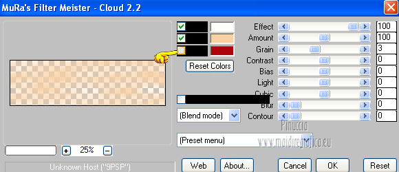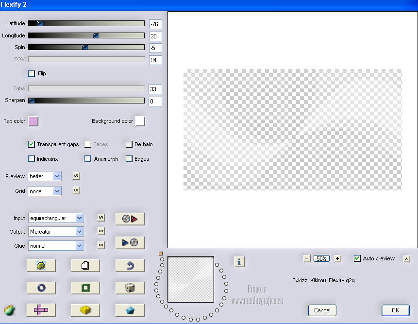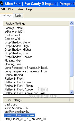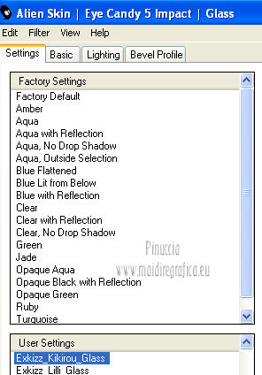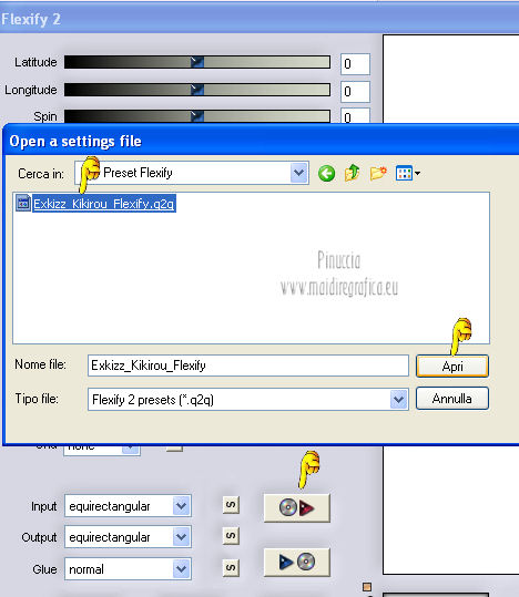 qui puoi trovare qualche risposta ai tuoi dubbi. Se l'argomento che ti interessa non è presente, ti prego di segnalarmelo. Questo tutorial è stato creato con PSP X2, ma può essere eseguito anche con le altre versioni di PSP. Per tradurlo ho usato PSPX. Questo tutorial è una creazione di ©Exkizz Eskiss e non può essere copiato su altri siti nè essere offerto per il download. Lo stesso vale per la mia traduzione. Il materiale viene da vari gruppi di condivisione. Il copyright appartiene ai rispettivi autori. Grazie ai creatori dei tubes che mettono a disposizione il loro lavoro in vari gruppi di condivisione. Rispetta il lavoro degli autori, non cambiare il nome del file e non cancellare il watermark. Occorrente: Materiale qui Il tube usato è di Kikirou, che ringrazio per il permesso ad usare il suo materiale. E' vietato modificare, rinominare o togliere il watermark dai tubes. in caso di dubbi, ricorda di consultare la mia sezione filtri qui Filters Unlimited 2.0 qui °v° Kiwi's Oelfilter - 3,5 Promille qui Jeux de lignes - Entrelacement qui VanDerLee - Unplugged-X qui Mura's Meister - Cloud qui Toadies - What are you qui Flaming Pear - Flexify 2 qui Alien Skin Eye Candy 5 Impact - Perspective Shadow, Glass qui I filtri Kiwi, Jeux de lignes e Toadies si possono usare da soli o importati in Filters Unlimited (come fare vedi qui). Se un filtro fornito appare con questa icona ![]() Metti i preset nelle rispettive cartelle del filtro Alien Skin Eye Candy 5 Impact>Settings>Shadow/Glass. Cliccando sul file una o due volte (a seconda delle tue impostazioni), automaticamente il preset si installerà nella cartella corretta. perchè uno o due clic vedi qui Metti il pennello nella cartella Pennelli. Attenzione, il pennello è composto da due files che non devono essere separati. Vedi gli appunti sui pennelli qui Metti il preset per Flexify in una cartella a scelta. Lo importerai da questa cartella quando ti servirà. Metti le Selezioni nella cartella Selezioni. Colori utilizzati Scegli due colori: un colore chiaro e un colore scuro in armonia con il tuo tube. Questa la paletta dei colori utilizzati. ![]() (Nota: Nel materiale trovi una paletta Template, nel caso volessi usare altri colori. Seleziona ogni casella con la bacchetta magica , modalità Sostituisci, corrispondenza Valore RGB, sfumatura e tolleranza0),e riempi la casella con i tuoi colori).Attenzione! Questo tutorial comporta numerosi passaggi, ti consiglio di salvare regolarmente il lavoro nel corso dell'esecuzione. ***** Passo 1 1. Apri la paletta "Exkizz_Palette_kikirou". Attiva lo strumento Contagocce ![]() clicca con il tasto sinistro del mouse sul colore chiaro #f8d0a4