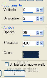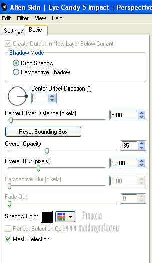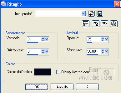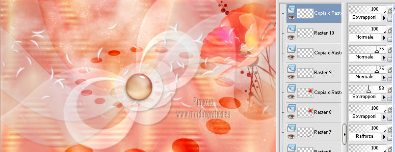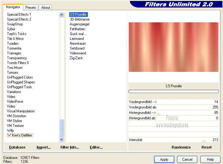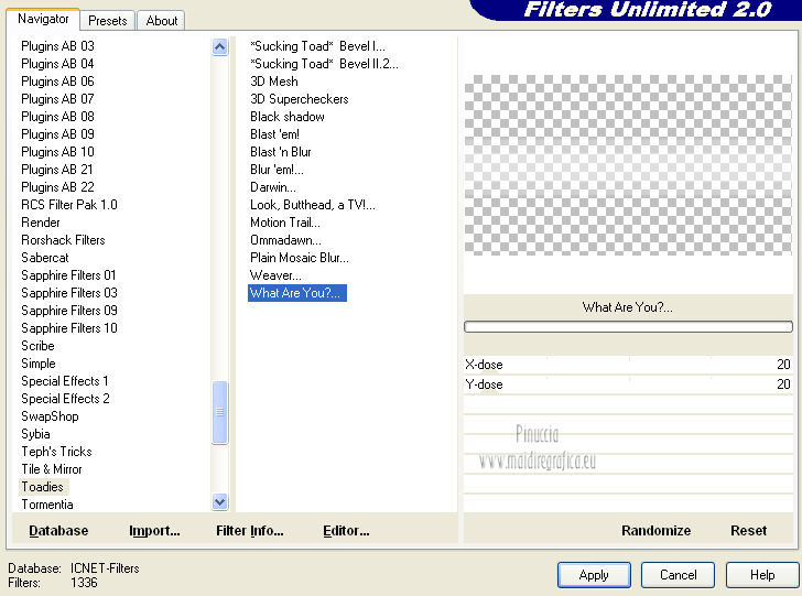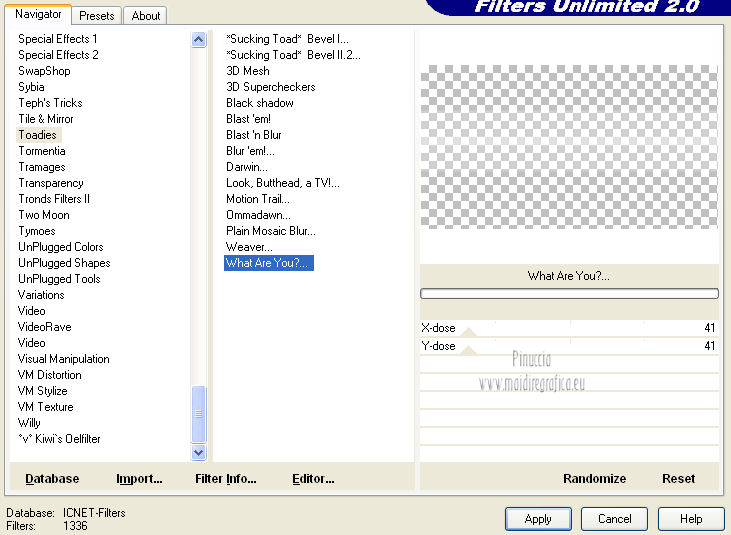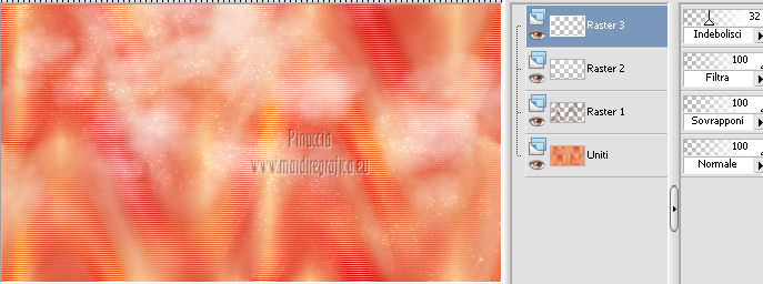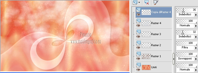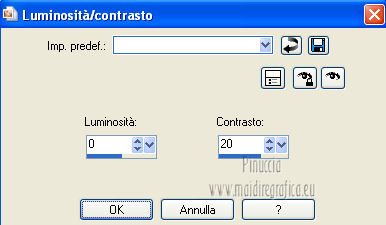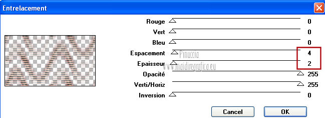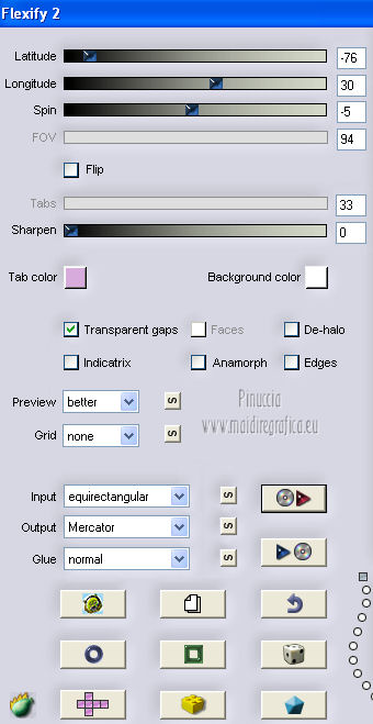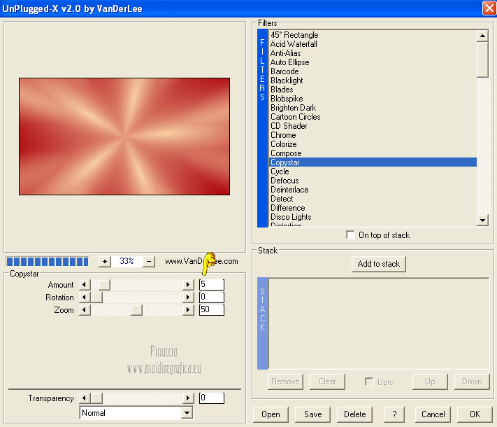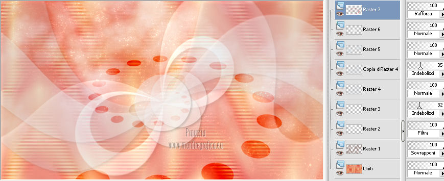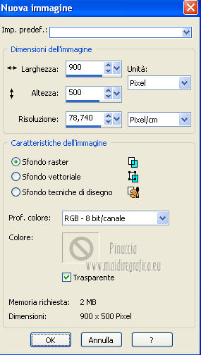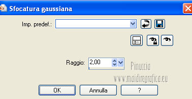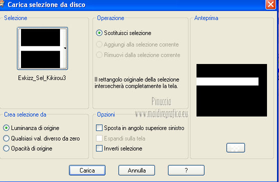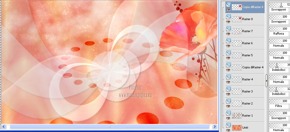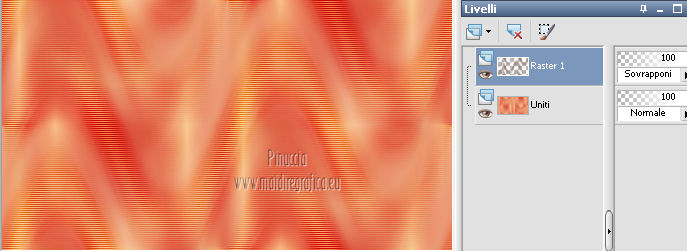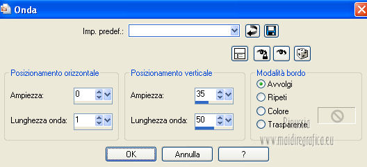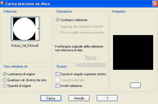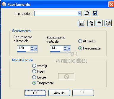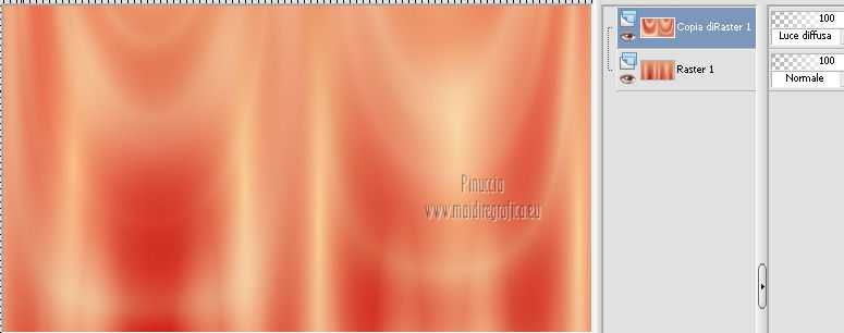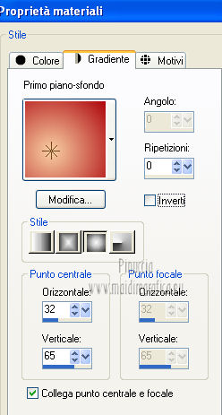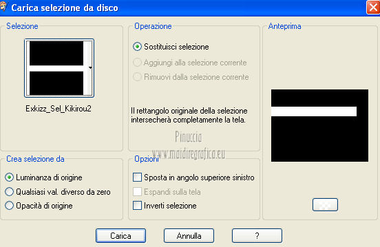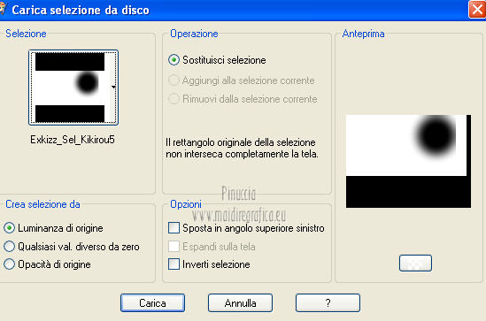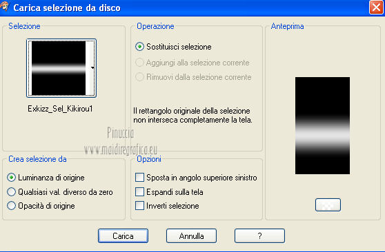 per impostarlo come colore di primo piano,e con il tasto destro del mouse sul colore scuro #ad040b ![]() per impostarlo come colore di sfondo. naturalmente, puoi anche scrivere manualmente i codici nella paletta dei materiali ![]() 2. Passa il colore di primo piano a Gradiente di primo piano/sfondo, stile Sprazzo di luce, con i seguenti settaggi: ![]() Passo 2 1. Apri una nuova immagine trasparente 900 x 500 pixels. ![]() 2. Riempi l'immagine trasparente con il gradiente.3. Effetti>Plugins>VanDerLee - Unplugged-X - Copystar. ![]() 4. Effetti>Effetti di distorsione>Coordinate polari. ![]() 5. Livelli>Duplica (copia di Raster 1). 6. Effetti>Plugins>Filters Unlimited 2.0 - °V° Kiwi's Oelfilter - 3,5 Promille. ![]() Attenzione! In base ai tuoi colori, dovrai regolare la linea "Intensität". Sarà più chiaro verso sinistra e più scuro verso destra. Sarà necessario scegliere un tono molto scuro perchè gli effetti dei filtri tendono a schiarire. 7. Effetti>Effetti di distorsione>Coordinate polari, con i settaggi precedenti. ![]() 8. Immagine>Capovolgi. Cambia la modalità di miscelatura di questo livello in Luce diffusa. ![]() 9. Livelli>Unisci>Unisci visibile. 10. Effetti>Effetti di immagine>Motivo unico. ![]() NotaI differenti effetti del filtro possono rendere pallidi i tuoi colori. Se necessario, regola con Luminosità e contrasto per accentuarli. Per la Luminosità intorno a 0 o meno, e per il Contrasto a 20 o più. Risultato. ![]() Passo 3 1. Livelli>Nuovo livello raster (Raster 1). 2. Selezione>Carica/Salva selezione>Carica selezione da disco. Cerca e carica la selezione Exkizz_Sel_Kikirou 1. ![]() 3. Effetti>Plugins>Mura's Meister - Cloud. clicca su Reset per impostare i tuoi colori di primo piano e sfondo, lascia i settaggi standard ma deseleziona il colore scuro. ![]() 4. Selezione>Deseleziona. 5. Effetti>Effetti di distorsione>Onda. ![]() 6. Effetti>Effetti di immagine>Motivo unico, con i settaggi precedenti. ![]() 7. Effetti>Plugins>Jeux de lignes - Entrelacement. ![]() 8. Cambia la modalità di miscelatura di questo livello in Sovrapponi. ![]() Passo 4 1. Dalla cartella "Décoration", apri "Exkizz_Kikirou_1" e vai a Modifica>Copia. Torna al tuo lavoro e vai a Modifica>Incolla come nuovo livello (Raster 2). Nota. la modalità di miscelatura di questo tube è impostata in Filtra. Non esitare ad abbassare l'opacità del livello se l'effetto è troppo forte. 2. Dalla cartella "Décoration" apri "Exkizz_Kikirou_2" e vai a Modifica>Copia. Torna al tuo lavoro e vai a Modifica>Incolla come nuovo livello (Raster 3). Già impostati modalità di miscelatura in Indebolisci e opacità al 32%. ![]() Passo 5 1. Imposta il colore di primo piano con il colore bianco #ffffff. ![]() 2. Livelli>Nuovo livello raster (Raster 4). 3. Selezione>Carica/Salva selezione>Carica selezione da disco. Cerca e carica la selezione Exkizz_Sel_Kikirou 2. ![]() 4. Imposta l'opacità dello strumento Riempimento al 50%. ![]() Riempi ![]() la selezione con il colore bianco #ffffff. Selezione>Deseleziona. ![]() 5. Effetti>Plugins>Filters Unlimited 2.0 - Toadies - What are you. ![]() 6. Effetti>Effetti di distorsione>Coordinate polari, con i settaggi precedenti. ![]() 7. Modifica>Ripeti Coordinate polari. ![]() 8. Effetti>Plugins>Flaming Pear - Flexify 2. Clicca sull'icona con la freccia rossa, cerca e seleziona - nella cartella in cui lo hai salvato, il preset "Exkizz_Kikirou_Flexify". Apri per applicarlo. ![]() Questi i settaggi che, in caso di problemi con il preset, puoi impostare manualmente. ![]() 9. Effetti>Effetti 3D>Sfalsa ombra, con il colore nero. ![]() 10. Livelli>Duplica (copia di Raster 4). Cambia la modalità di miscelatura di questo livello in Indebolisci, e abbassa l'opacità al 35%. ![]() Passo 6 1. Livelli>Nuovo livello raster (Raster 5). 2. Selezione>Carica/Salva selezione>Carica selezione da disco. Cerca e carica la selezione Exkizz_Sel_Kikirou 3. ![]() 3. Riempi ![]() la selezione con il colore bianco #ffffff, opacità 50 .Selezione>Deseleziona. 4. Effetti>Plugins>Filters Unlimited 2.0 - Toadies - What are you, con i settaggi standard. ![]() 5. Effetti>Effetti di distorsione>Coordinate polari, con i settaggi precedenti. ![]() 6. Effetti>Plugins>Flaming Pear - Flexify 2, con i settaggi precedenti. Il preset è ancora in memoria. Devi soltanto cliccare ok. ![]() 7. Effetti>Effetti 3D>Sfalsa ombra, con il colore nero. ![]() 8. Regola>Luminosità e contrasto>Luminosità e contrasto. ![]() Risultato. ![]() Passo 7 1. Dalla cartella "Décoration" apri "Exkizz_Kikirou_3" e vai a Modifica>Copia. Torna al tuo lavoro e vai a Modifica>Incolla come nuovo livello (Raster 6). 2. Effetti>Effetti di immagine>Scostamento. ![]() Risultato. ![]() Passo 8 1. Livelli>Nuovo livello raster (Raster 7). 2. Selezione>Carica/Salva selezione>Carica selezione da disco. Cerca e carica la selezione Exkizz_Sel_Kikirou 4. ![]() 3. Riempi la selezione con il colore scuro di sfondo #ad040b ,opacità al 50% .Selezione>Deseleziona. 4. Cambia la modalità di miscelatura di questo livello in Rafforza. ![]() Passo 9 1. Apri il tube "KikiRou156" e vai a Modifica>Copia. non chiuderlo perchè ti servirà ancora Torna al tuo lavoro e vai a Modifica>Incolla come nuovo livello (Raster 8). 2. Immagine>Rifletti. Immagine>Ridimensiona, al 50%, tutti i livelli non selezionato. 3. Spostalo nell'angolo in alto a destra.![]() 4. Selezione>Carica/Salva selezione>Carica selezione da disco. Cerca e carica la selezione Exkizz_Sel_Kikirou 5. ![]() Premi sulla tastiera il tasto CANC ![]() Selezione>Deseleziona. 5. Cambia la modalità di miscelatura di questo livello in Sovrapponi, o in base ai tuoi colori. Non esitare a diminuire l'opacità del livello, in modo che il tube sia appena visibile. Per il mio esempio, ho duplicato il livello e abbassato l'opacità al 53%, lasciando la modalità Sovrapponi. ![]() Passo 10 1. Dalla cartella "Décoration", apri "Exkizz_Kikirou_4" e vai a Modifica>Copia. Torna al tuo lavoro e vai a Modifica>Incolla come nuovo liv