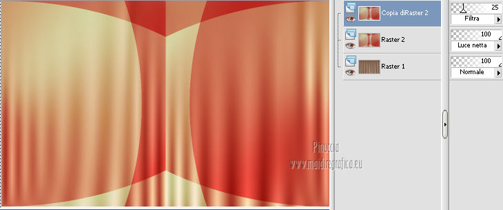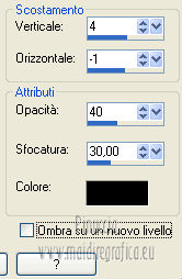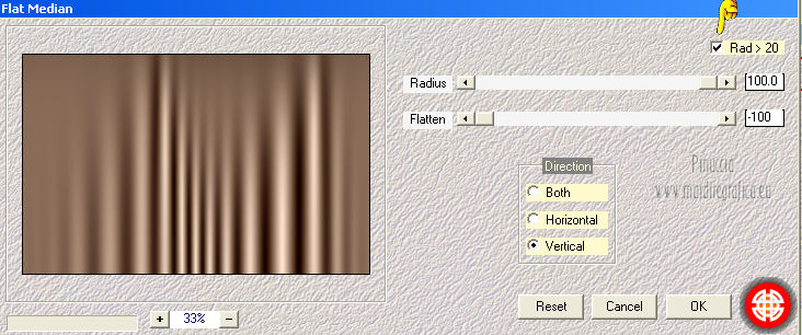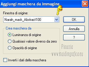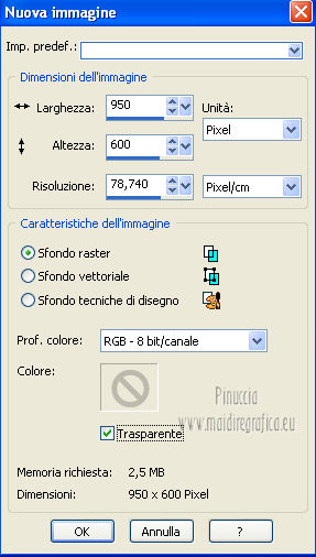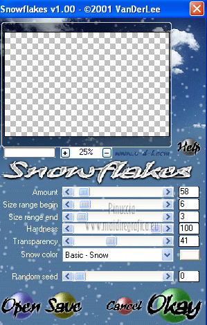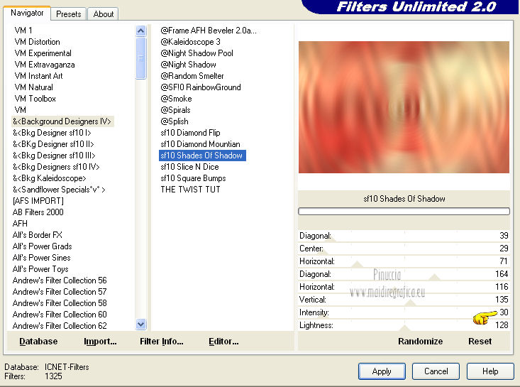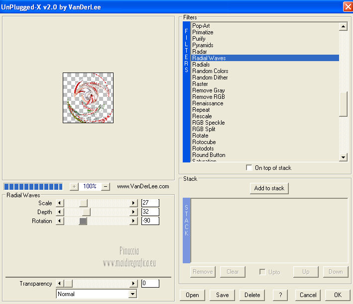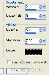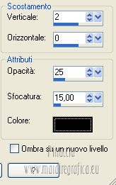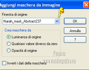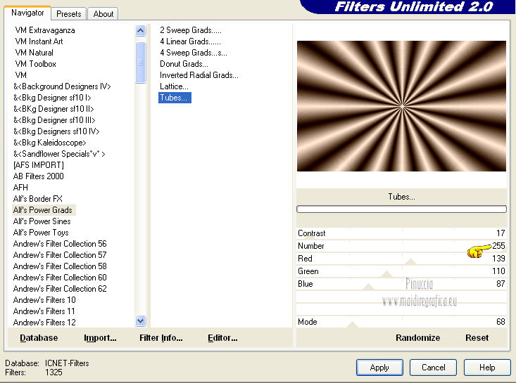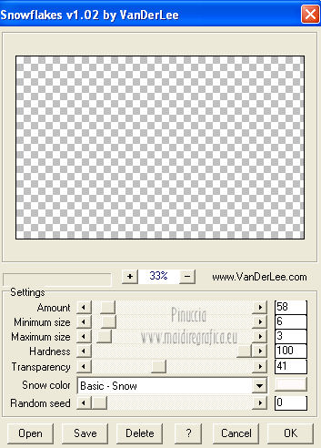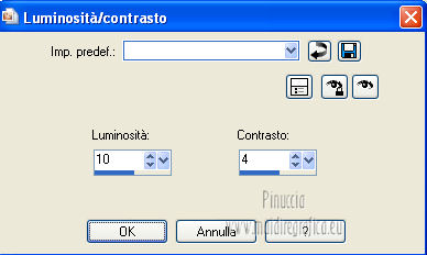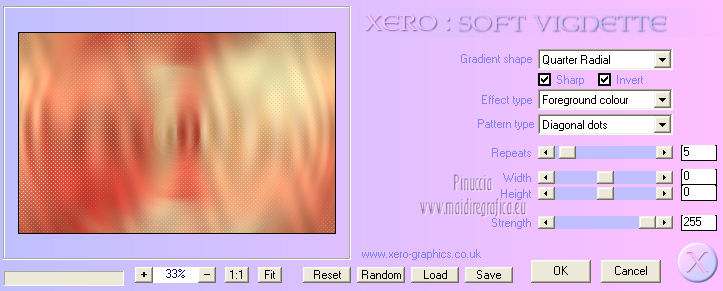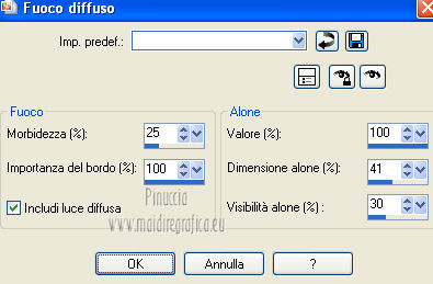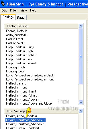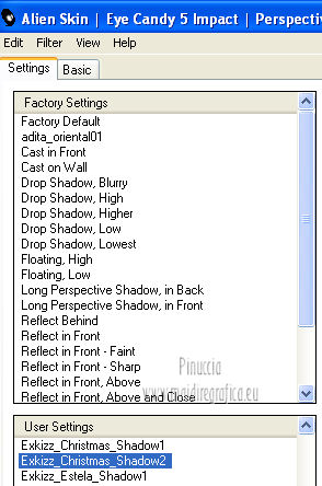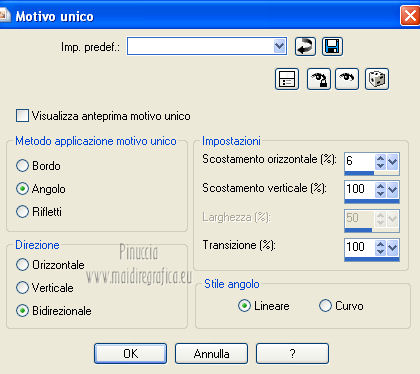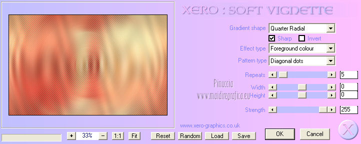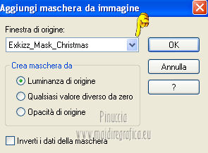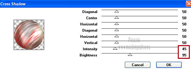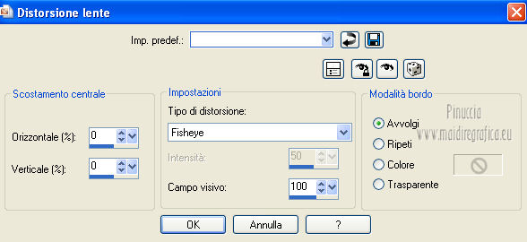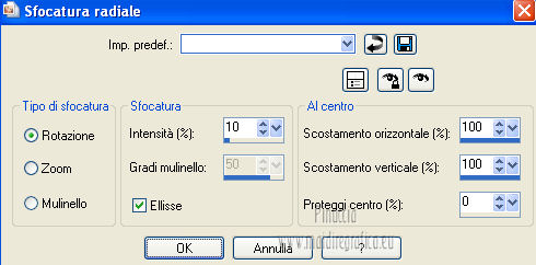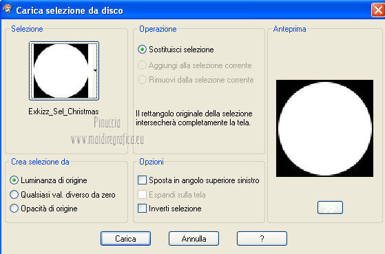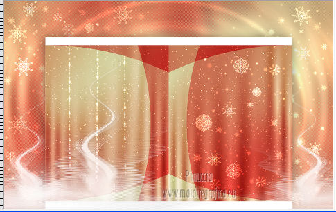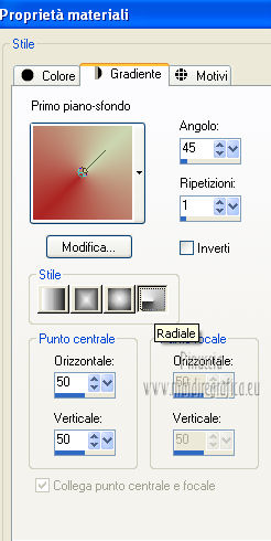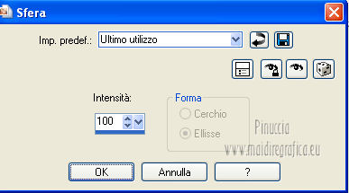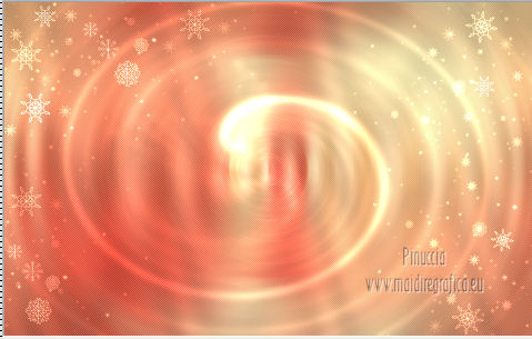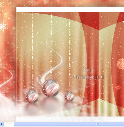 qui puoi trovare qualche risposta ai tuoi dubbi. Se l'argomento che ti interessa non è presente, ti prego di segnalarmelo. Questo tutorial è stato creato con PSP X2, ma può essere eseguito anche con le altre versioni di PSP. Per tradurlo, ho usato PSP X. Questo tutorial è una creazione di ©Exkizz Eskiss e non può essere copiato su altri siti nè essere offerto per il download. Lo stesso vale per la mia traduzione. Il materiale viene da vari gruppi di condivisione. Il copyright appartiene ai rispettivi autori. Grazie ai creatori dei tubes che mettono a disposizione il loro lavoro in vari gruppi di condivisione. Rispetta il lavoro degli autori, non cambiare il nome del file e non cancellare il watermark. Occorrente: Materiale qui Per i tubes usati, grazie Gerry Grazie Gerry per l'autorizzazione a usare questo tube. Due delle tre maschere usate sono una creazione di Narah Grazie Narah per l'autorizzazione ad usare queste maschere. E' vietato modificare, rinominare o togliere il watermark dai tubes. in caso di dubbi, ricorda di consultare la mia sezione filtri qui VanDerLee - Unplugged X qui Filters Unlimited 2.0 qui &<Background Designers IV> - sf10 Shades of Shadow (da importare in Unlimited) qui Alf's Power Grads - Tubes qui Graphics Plus - Cross Shadow qui Mehdi 2 - Flat median qui Simple - Left Right Wrap (bonus) qui VDL Adrenaline - Snowflakes qui Xero - Soft Vignette qui Alien Skin Eye Candy 5 Impact - Perspective Shadow qui I filtri Alf's Power Grads, Graphics Plus e Simple si possono usare da soli o importati in Filters Unlimited. A volte il diverso uso può dare risultati differenti, ma questi si possono verificare soltanto caso per caso ![]() Metti i 2 preset nella cartella del filtro Alien Skin Eye Candy 5 Impact>Settings>Shadow. Cliccando sul files una o due volte (a seconda delle tue impostazioni), automaticamente il preset si installerà nella cartella corretta. Metti l'ornamento Exkizz_neige nella cartella Ornamenti. Nel materiale trovi anche l'ornamento per le versioni meno recenti di PSP (cartella psp7). Apri le maschere in PSP e minimizzale con il resto del materiale. Colori utilizzati Apri la paletta "Exkizz_Palette_Christmas" in PSP. Attiva lo strumento Contagocce ![]() e clicca con il tasto sinistro del mouse per impostare il colore di primo piano, e con il tasto destro per impostare il colore di sfondo. (Nota: Nel materiale trovi una paletta Template, nel caso volessi usare altri colori. Seleziona ogni casella con la bacchetta magica , modalità Sostituisci, corrispondenza Valore RGB, sfumatura e tolleranza0),e riempi la casella con i tuoi colori).***** Scegli due colori, uno scuro e uno chiaro in armonia con il tuo tube. Questa la mia paletta dei colori. ![]() ***** Parte Prima Iniziamo con il creare una pallina di Natale. Passo 1 Apri la paletta "Exkizz_Palette_Christmas". Strumento Contagocce (E) ![]() Clicca con il tasto sinistro del mouse sul colore chiaro #cbd7b0 ![]() per impostarlo come colore di primo piano. Clicca con il tasto destro del mouse sul colore scuro #ac2423 ![]() per impostarlo come colore di sfondo. Passo 2 Passa il colore di primo piano a Gradiente, stile Radiale, con i seguenti settaggi. ![]() Passo 3 1. Apri (File>Nuova...) una nuova immagine trasparente 100 x 100 pixels. ![]() Riempi l'immagine trasparente con il gradiente radiale.2. Livelli>Nuovo livello raster - Raster 2. 3. Selezione>Seleziona tutto. Apri il tube "Gerry-Kerst 47-mouse - 13 november 2008" e vai a Modifica>Copia. non chiudere il tube perchè ti servirà ancora Torna al tuo lavoro e vai a Modifica>Incolla nella selezione. Selezione>Deseleziona. 4. Effetti>Plugins>VanDerLee - Unplugged X - Radial Waves. ![]() 5. Regola>Sfocatura>Sfocatura radiale. ![]() 6. Effetti>Effetti di bordo>Aumenta. 7. Effetti>Effetti 3D>Sfalsa ombra, con il colore nero #000000. ![]() 8. Livelli>Unisci>Unisci visibile. Risultato. ![]() Passo 4 1. Effetti>Effetti geometrici>Cerchio. ![]() 2. Effetti>Effetti geometrici>Sfera. ![]() Modifica>Ripeti Sfera. Risultato. ![]() Pass 5 1. Effetti>Plugins>Graphics Plus - Cross Shadow. Regola gli ultimi due valori in funzione dei tuoi colori ![]() Regola>Luminosità e contrasto>Luminosità e contrasto. anche in questo caso non esitare a cambiare i settaggi in funzione dei tuoi colori ![]() Passo 6 1. Selezione>Carica/Salva selezione>Carica selezione da disco. Cerca e carica la selezione Exkizz_Sel_Christmas. ![]() 2. Attiva lo strumento Ornamento ![]() cerca e seleziona l'ornamento Exkizz_neige, con i seguenti settaggi. ![]() Applica l'ornamento cliccando tre volte in punti differenti della sfera. Risultato. ![]() 3. Mantieni selezionato. Trasformeremo la selezione in modo da eliminare i bordi irregolari del cerchio. 4. Selezione>Innalza selezione a livello. Selezione>Deseleziona. 5. Attiva il livello sottostante - il livello Uniti. Livelli>Elimina, o clicca sulla croce in cima alla paletta dei livelli. ![]() La pallina di Natale è terminata. Minimizza l'immagine, che userai più tardi. Parte 2 Passo 1 1. Apri (File>Nuova...) una nuova immagine trasparente 950 x 600 pixels. ![]() Riempi l'immagine trasparente con il gradiente radiale.2. Effetti>Plugins>Filters Unlimited 2.0 - Alf's Power Grads - Tubes. ![]() 3. Regola>Sfocatura>Sfocatura radiale, con i settaggi precedenti. ![]() 4. Effetti>Effetti di distorsione>Coordinate polari. ![]() 5. Effetti>Plugins>Mehdi 2 - Flat Median. ![]() 6. Effetti>Effetti di immagine>Motivo unico. ![]() 7. Regola>Morbidezza>Fuoco diffuso. ![]() Risultato. ![]() Passo 2 1. Livelli>Nuovo livello raster - Raster 2. Riempi con il gradiente radiale.2. Regola>Sfocatura>Sfocatura gaussiana - raggio 50. ![]() 3. Effetti>Effetti di distorsione>Distorsione lente. ![]() Risultato. ![]() 4. Effetti>Plugins>Simple - Left Right Wrap. ![]() 5. Cambia la modalità di miscelatura di questo livello in Luce netta. 6. Livelli>Duplica. Per schiarire un po' l'immagine, cambia la modalità di miscelatura di questo livello in Filtra, e abbassa l'opacit