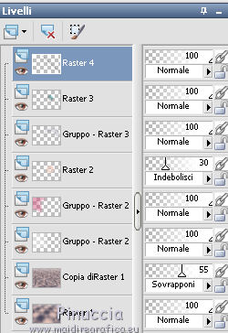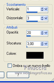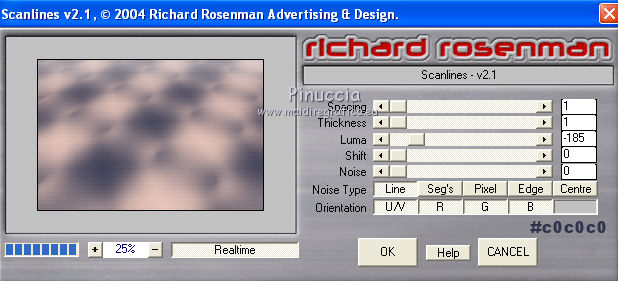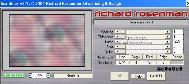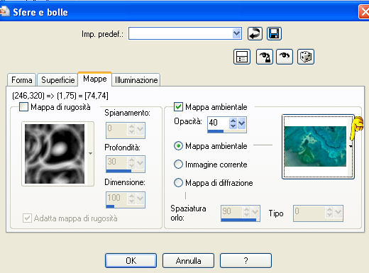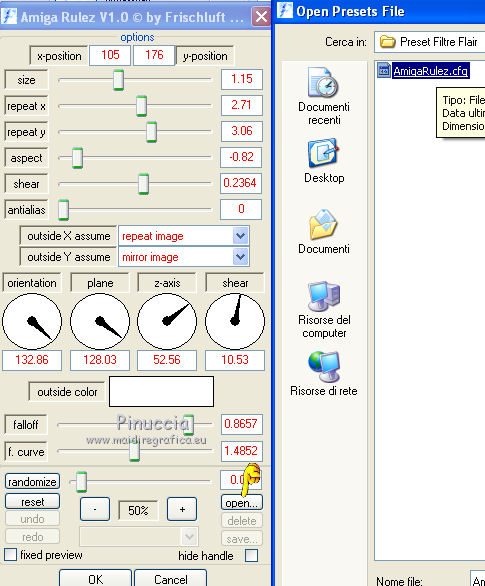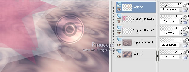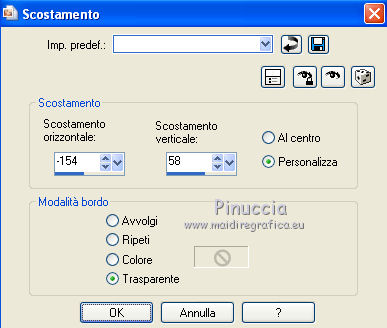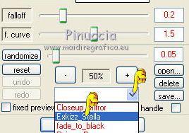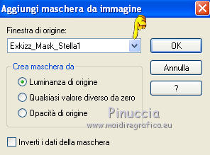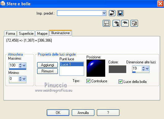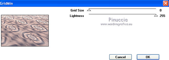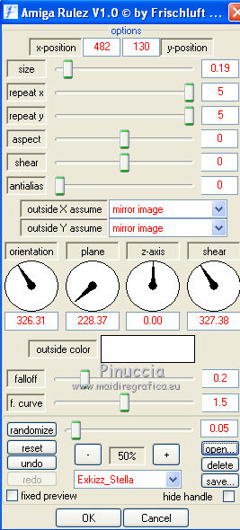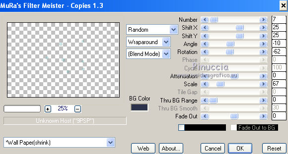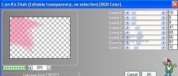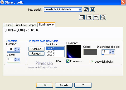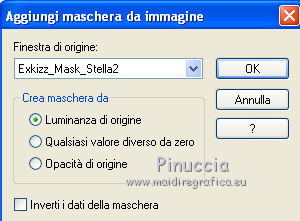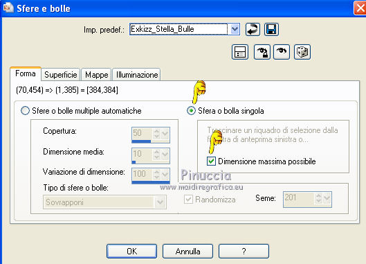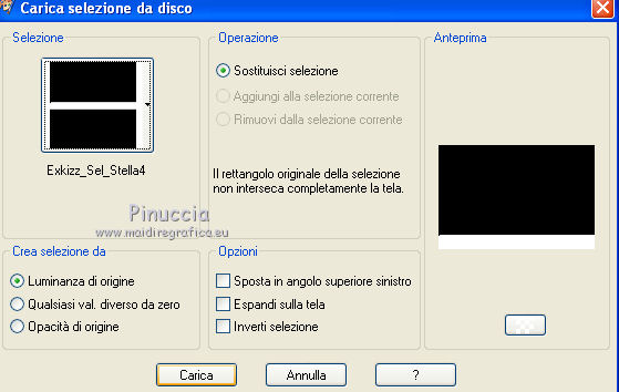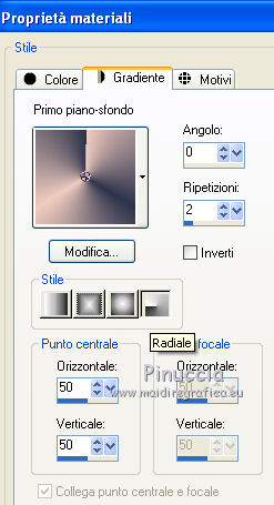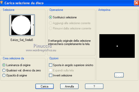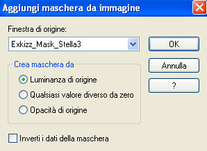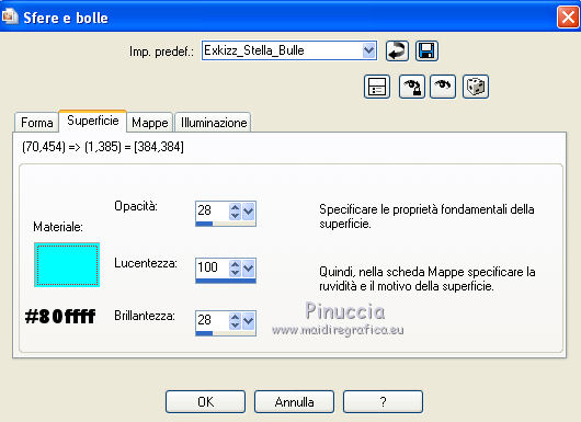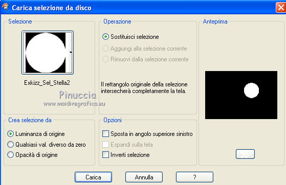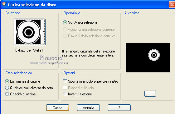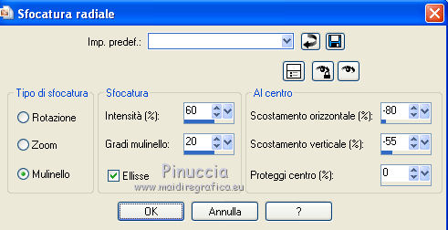 qui puoi trovare qualche risposta ai tuoi dubbi. Se l'argomento che ti interessa non è presente, ti prego di segnalarmelo. Questo tutorial è stato creato con PSP X2, ma può essere eseguito anche con le altre versioni di PSP. Per tradurlo, ho usato PSP X. Questo tutorial è una creazione di ©Exkizz Eskiss e non può essere copiato su altri siti nè essere offerto per il download. Lo stesso vale per la mia traduzione. Il materiale viene da vari gruppi di condivisione. Il copyright appartiene ai rispettivi autori. Grazie ai creatori dei tubes che mettono a disposizione il loro lavoro in vari gruppi di condivisione. Rispetta il lavoro degli autori, non cambiare il nome del file e non cancellare il watermark. Le vostre versioni quiOccorrente: Materiale qui Il tube della donna è di Gerry che ringrazio per l'autorizzazione a usare i suoi bellissimi tubes. E' vietato modificare, rinominare o togliere il watermark dai tubes. in caso di dubbi, ricorda di consultare la mia sezione filtri qui Frischluft - Flair - Amiga Rulez qui L&K Zitah qui Mura's Meister - Copies qui Filter Factory H - GridMin qui Richard Rosenman - Scanlines qui I filtri Factory Gallery per essere usati devono prima essere convertiti. Come fare vedi qui Si usano importandoli in Filters Unlimited (come fare vedi qui) ma possono funzionare anche da soli Se intendi usare il font, aprilo e minimizzalo. Lo troverai nella lista dei font disponibili quando ti servirà. Metti i pennelli (cartella Pinceau) nella cartella Pennelli. Attenzione, il pennello è composto da due files che non devono essere separati. (Vedi gli appunti sui Pennelli qui). Metti il preset "AmigaRulez.cfg" (cartella Preset Filtre Flair) nella cartella "configs" del filtro Flair. Se preferisci, puoi importarlo - quando ti servirà - direttamente dalla cartella in cui hai scompattato il materiale. Metti le selezioni (cartella Sélections) nella cartella Selezioni. La mappa ambientale Corel_15_001 (cartella Texture) è standard nelle versioni più recenti di PSP, e corrisponde - nelle versioni meno recenti - alla mappa ambientale standard Frattali acquei. Se non la trovi nel tuo PSP, metti quella fornita nella cartella Mappe ambientali di PSP. Metti il preset "Preset_BallAndBubbles_Exkizz_Stella_Bulle.PSPScript" (cartella Preset PSP) nella cartella Impostazioni Predefinite. Apri le maschere (cartella Masques) in PSP e minimizzale con il resto del materiale (cartella Tubes et Palette). Colori utilizzati Apri la paletta "Exkizz_Palette_stella" in PSP. Attiva lo strumento Contagocce ![]() e clicca con il tasto sinistro del mouse per impostare il colore di primo piano, e con il tasto destro per impostare il colore di sfondo. (Nota: Nel materiale trovi una paletta Template, nel caso volessi usare altri colori. Seleziona ogni casella con la bacchetta magica , modalità Sostituisci, corrispondenza Valore RGB, sfumatura e tolleranza0),e riempi la casella con i tuoi colori).Per questo tutorial devi scegliere un colore scuro, un colore chiaro, e due colori vivi. Per il mio esempio: colore scuro #2e334c - colore chiaro #f1ccbf ;colori vivi n. 1 #fb5a90 - n.2 #80ffff .La mia paletta. ![]() ***** Passo 1. 1. Apri la paletta "Exkizz_Palette_Stella". Strumento Contagocce (E) ![]() Clicca con il tasto sinistro del mouse sul colore chiaro #f1ccbf per impostarlo come colore di primo piano. Clicca con il tasto destro del mouse sul colore scuro #2e334c per impostarlo come colore di sfondo. Passa il colore di primo piano a Gradiente, stile Radiale, con i seguenti settaggi. ![]() Passo 2. 1. Apri una nuova immagine trasparente 900 x 600 pixels (File>Nuova). ![]() 2. Riempi l'immagine trasparente con il gradiente.![]() 3. Regola>Sfocatura>Sfocatura radiale. ![]() 4. Effetti>Plugins>Frischluft - Amiga Rulez trovi il filtro Flair sotto la denominazione Frischluft Seleziona il preset "Exkizz_Stella" e ok. se hai messo il preset nella cartella del filtro, lo trovi nella lista dei preset: apri il menu a discesa ![]() e seleziona il preset. ![]() Se lo hai lasciato nella cartella del materiale, clicca su Open, e cerca il preset nella cartella del materiale, clicca Apri ![]() Apri il menu a discesa e seleziona il preset. ![]() Questi sono i settaggi relativi al preset. Se hai problemi con l'applicazione del preset, puoi impostare i settaggi manualmente. ![]() Risultato. ![]() 5. Livelli>Duplica - Copia di Raster 1. 6. Regola>Sfocatura>Sfocatura radiale, con i settaggi precedenti. 7. Effetti>Plugins>Frischluft - Flair - Amiga Rulez, con i settaggi precedenti. Risultato. ![]() 8. Effetti>Plugins>Filters Unlimited - Filter Factory Gallery H - GridMin. ![]() 9. Cambia la modalità di miscelatura di questo livello in Sovrapponi, e abbassa l'opacità al 55%. ![]() Passo 3. 1. Attiva il livello sottostante - Raster 1. 2. Regola>Morbidezza>Fuoco diffuso. ![]() 3. Effetti>Plugins>Richard Rosenman - Scanlines colore #c0c0c0. ![]() Risultato ![]() Passo 4. 1. Se non lo hai già fatto, apri la maschera "Exkizz_Mask_Stella1" e minimizzala. 2. Imposta il colore di primo piano con il colore bianco #ffffff. 3. Attiva il livello "Copia di Raster 1". Livelli>Nuovo livello raster - Raster 2. 4. Riempi il livello con il colore bianco.5. Livelli>Nuovo livello maschera>Da immagine. Apri il menu sotto la finestra di origine e vedrai la lista dei files aperti. Seleziona la maschera Exkizz_Mask_Stella 1 con i seguenti settaggi. ![]() 6. Regola>Messa a fuoco>Metti a fuoco. 7. Livelli>Unisci>Unisci gruppo. Risultato. ![]() Passo 5 1. Livelli>Nuovo livello raster - Raster 2. 2. Imposta il colore di primo piano con il colore vivo n.1 #fb5a90 ![]() 3. Riempi il livello con il colore #fb5a90 .4. Livelli>Nuovo livello maschera>Da immagine. Apri il menu sotto la finestra di origine e seleziona nuovamente la maschera Exkizz_Mask_Stella 1 con i settaggi precedenti. ![]() 5. Regola>Messa a fuoco>Metti a fuoco. 6. Livelli>Unisci>Unisci gruppo. 7. Immagine>Ruota per gradi - 20 gradi a destra. ![]() 8. Effetti>Effetti di immagine>