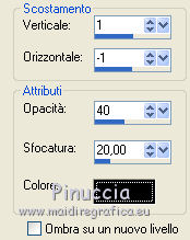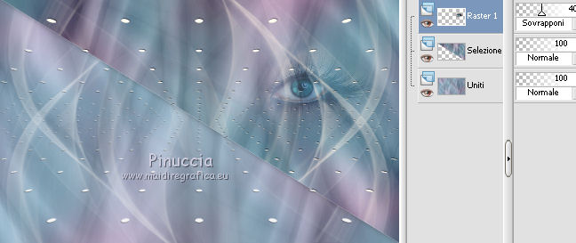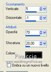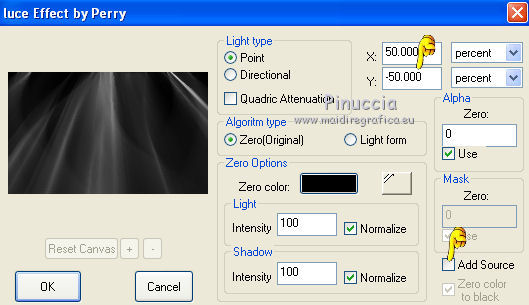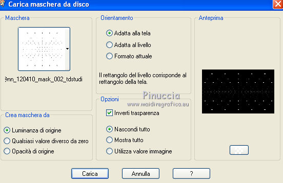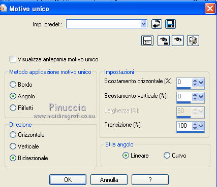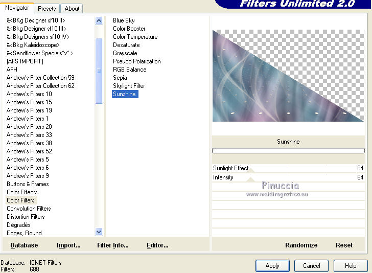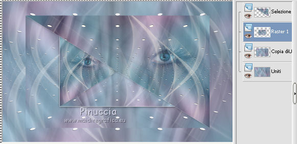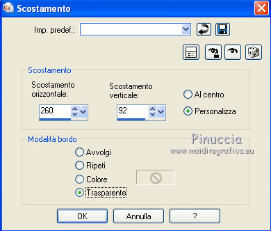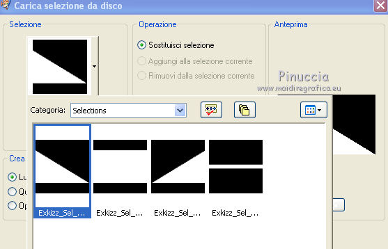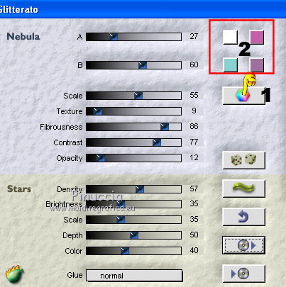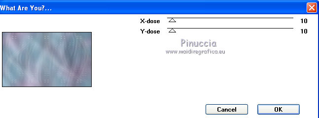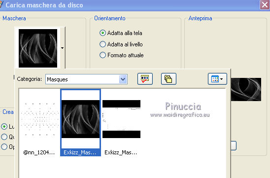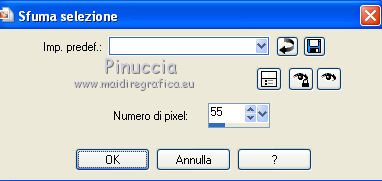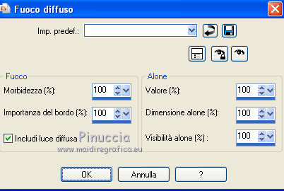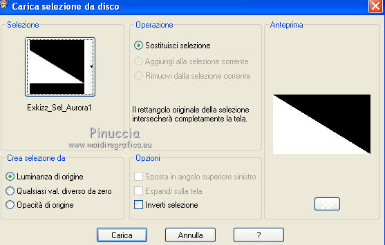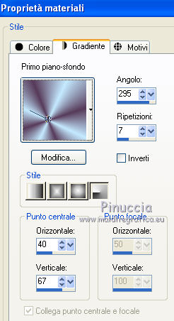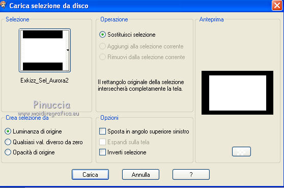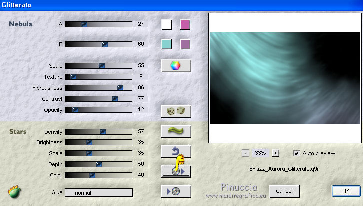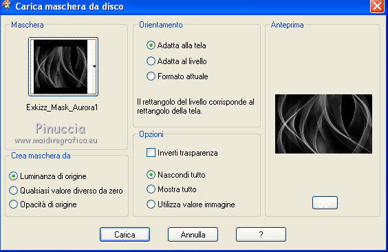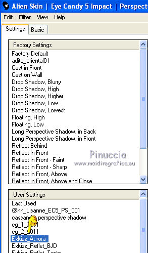 qui puoi trovare qualche risposta ai tuoi dubbi. Se l'argomento che ti interessa non è presente, ti prego di segnalarmelo. Questo tutorial è stato creato con PSP X2, ma può essere eseguito anche con le altre versioni di PSP, con qualche piccolo aggiustamento. Per tradurlo, ho usato PSP X. Questo tutorial è una creazione di ©Exkizz Eskiss e non può essere copiato su altri siti nè essere offerto per il download. Lo stesso vale per la mia traduzione. Il materiale viene da vari gruppi di condivisione. Il copyright appartiene ai rispettivi autori. Grazie ai creatori dei tubes che mettono a disposizione il loro lavoro in vari gruppi di condivisione. Rispetta il lavoro degli autori, non cambiare il nome del file e non cancellare il watermark. Occorrente: Materiale qui Scompattato il materiale, avrai la paletta dei colori Exkizz_Palette_aurora e sette cartelle: Masques che contiene 3 maschere; la maschera @nn_120410_mask_002_tdstudio appartiene ad @nn TDstudio. Pinceau che contiene 1 pennello, composto da due files che non devono essere separati (vedi gli appunti sui Pennelli qui Preset Eye Candy 5 Impact.Shadow, che contiene il preset Exkizz_Aurora. Preset Flaming Pear Glitterato, che contiene il preset Exkizz_Aurora_Glitterato.q9r Sélections, che contiene 4 selezioni. Template, che contiene il template Exkizz_Aurora_template. Tubes che contiene il tube calguiseyes2939 di Guismo, che ringrazio per l'autorizzazione ad usare questo tube; e il tube Exkizz_Eskiss_Beuty-5-4-10, realizzato dall'autrice del tutorial da una immagine dell'artista Filtri: in caso di dubbi, ricorda di consultare la mia sezione filtri qui L'amico Perry - Luce qui Alien Skin Eye Candy 5 Impact - Perspective Shadow qui Toadies - What are you qui Transparency - Eliminate black qui Flaming Pear - Glitterato qui Filters Unlimited 2.0 qui FM Tile Tools - Blend Emboss qui ![]() Metti il preset Exkizz_Aurora nella cartella del filtro: Alien Skin Eye Candy 5 Impact>Settings>Shadow. Se preferisci puoi importarlo, quando ti servirà, dalla cartella in cui hai scompattato il materiale. Vedi la scheda del filtro qui e come importare un preset in Eye Candy qui Metti le selezioni nella cartella Selezioni. Metti le maschere nella cartella Maschere. un piccolo consiglio che ti permetterà di guadagnare tempo quando dovrai cercare le maschere e le selezioni. Invece di copiarli nelle cartelle di PSP, inserisci direttamente le cartelle nei Percorsi files, lasciandole nella cartella dove hai scompattato il materiale. Metti il pennello nella cartella Pennelli. Metti il preset Exkizz_Aurora_Glitterato nella cartella del filtro. Anche in questo caso, se vuoi, quando ti servirà, puoi importare il preset direttamente dalla cartella in cui hai scompattato il materiale Apri il resto del materiale in PSP. Se non vuoi sentire la musica premi il tasto ESC Colori utilizzati Apri la paletta "Exkiss_Palette_aurora" in PSP. ![]() Attiva lo strumento Contagocce ![]() Clicca con il tasto sinistro del mouse per impostare il colore di primo piano, e con il tasto destro per impostare il colore di sfondo. 1. Imposta il colore di primo piano con il colore chiaro #c4eaff, e il colore di sfondo con il colore scuro #573a5a. Passa il colore di primo piano a Gradiente Radiale, con i seguenti settaggi. ![]() Apri una nuova immagine trasparente 900 x 550 pixels, e riempila con il gradiente.2. Effetti>Effetti di immagine>Motivo unico. ![]() Effetti>Effetti di distorsione>Onda. ![]() Regola>Morbidezza>Fuoco diffuso. ![]() 3. Apri Exkizz_Aurora_Template e vai a Modifica>Copia. Torna al tuo lavoro e vai a Modifica>Incolla come nuovo livello. Cambia la modalità di miscelatura di questo livello in Luminanza (esistente). ![]() Livelli>Nuovo livello raster. Imposta il colore di primo piano con il colore bianco #ffffff. Riempi il nuovo livello con il colore bianco.Livelli>Carica/Salva maschera>Carica maschera da disco. Cerca e carica la maschera Exkizz_Mask_Aurora1; inverti trasparenza non selezionato. come puoi vedere, se hai seguito il mio consiglio, non dovrai cercare la maschera, ma l'avrai già immediatamente visibile nella cartella del materiale. ![]() ![]() Livelli>Unisci>Unisci gruppo. Abbassa l'opacità di questo livello al 65%. Livelli>Duplica, e rimani sul livello della copia. Effetti>Plugins>L'amico Perry - Luce. Prima clicca su Add Source per deselezionare la casellina, poi regola la casella Y a -50. ![]() Premi il tasto K per attivare lo strumento Puntatore ![]() o il tasto K per attivare lo strumento Deformazione se stai usando PSP 9,e usa il nodo superiore centrale ![]() per tirare l'immagine verso l'alto in modo da togliere qualche traccia grigia. ![]() Clicca sulla manina per deselezionare lo strumento.Selezione>Seleziona tutto. Selezione>Espandi sulla tela. Selezione>Inverti. Premi sulla tastiera il tasto CANC. Selezione>Deseleziona. Immagine>Rifletti. 4. Livelli>Nuovo livello raster. Riempi con il colore bianco.Livelli>Carica/Salva maschera>Carica maschera da disco. Cerca e carica la maschera @nn_120410_mask_002_tdstudio, inverti trasparenza seleizonato. ![]() Livelli>Unisci>Unisci gruppo. Effetti>Effetti 3D>Sfalsa ombra, con il colore nero. ![]() Effetti>Plugins>FM Tile Tools - Blend Emboss, con i settaggi standard. ![]() Livelli>Unisci>Unisci visibile. Finestra>Duplica, minimizza l'originale e lavora sulla copia. 5. Selezione>Carica/Salva selezione>Carica selezione da disco. Cerca e carica la selezione Exkizz_Sel_Aurora1. anche in questo caso, se hai seguito il mio consiglio, non avrai bisogno di cercare le selezioni, perchè le avrai subito disponibili nella loro cartella ![]() ![]() Selezione>Innalza selezione a livello. Selezione>Deseleziona. Regola>Luminosità e contrasto>Luminosità e contrasto. ![]() Effetti>Plugins>Filters Unlimited 2.0 - Colors Filter - Sunshine. ![]() (in base ai tuoi colori, puoi provare altri settaggi). Regola>Messa a fuoco>Metti a fuoco. Effetti>Effetti 3D>Sfalsa ombra, con il colore nero. ![]() Immagine>Rifletti. Immag