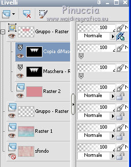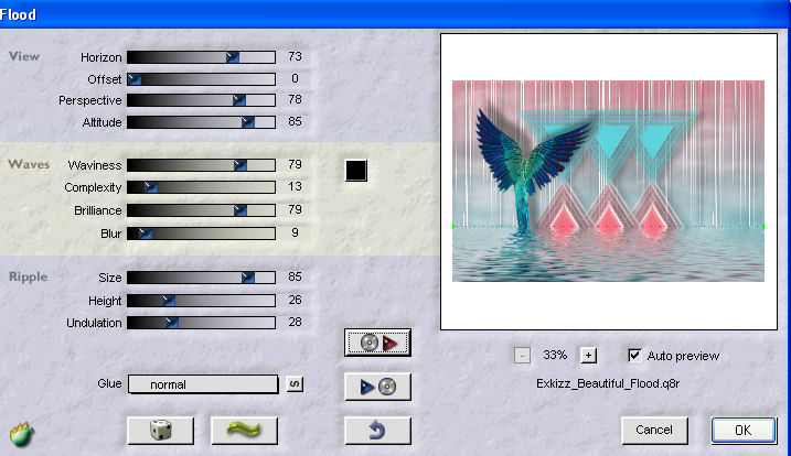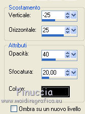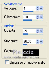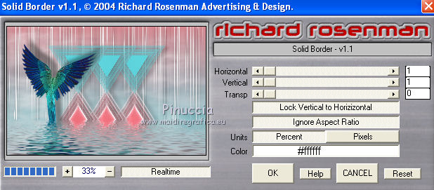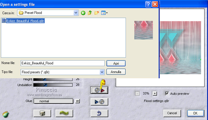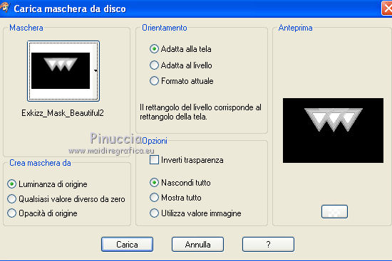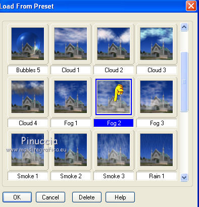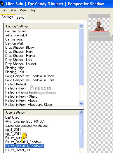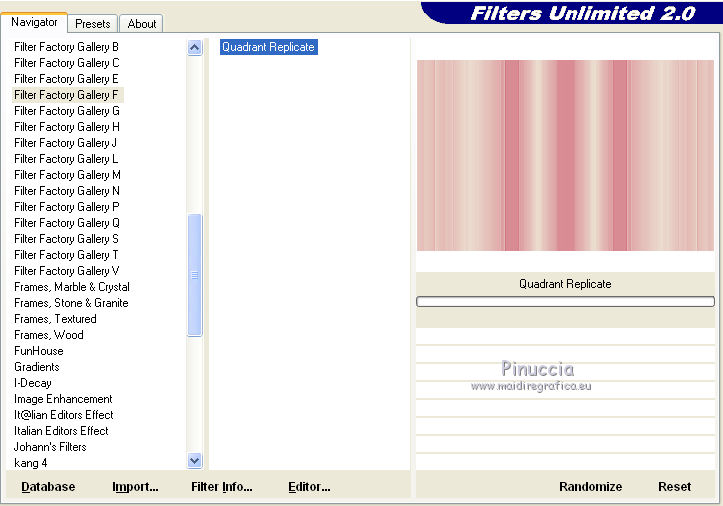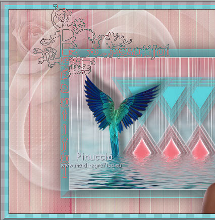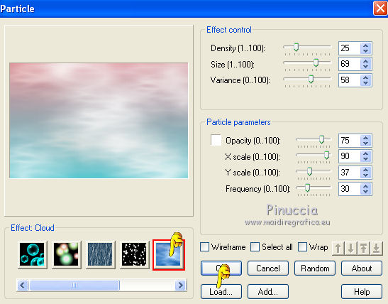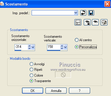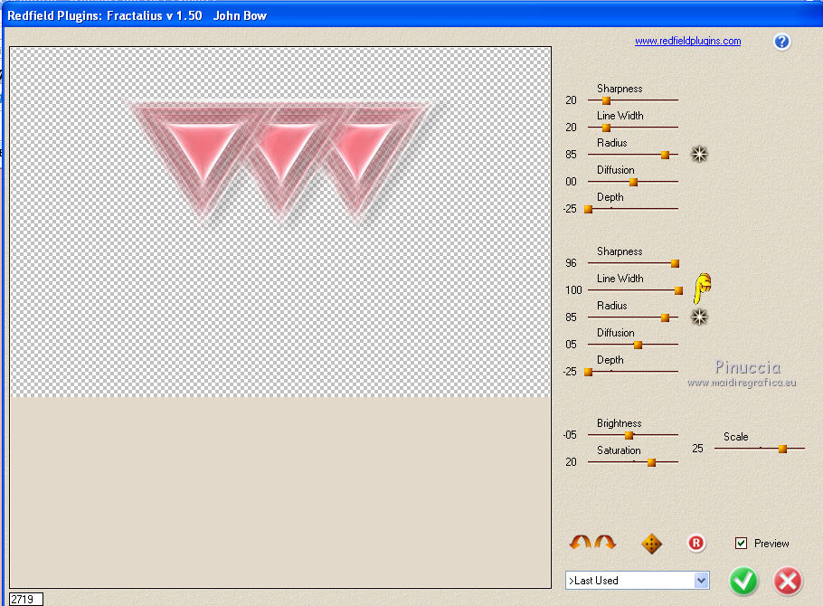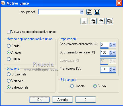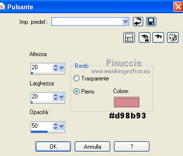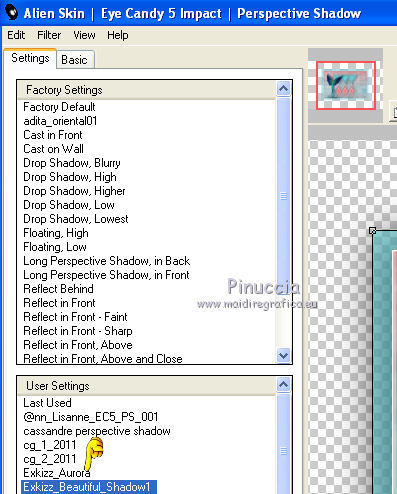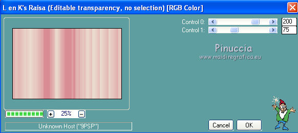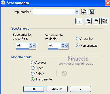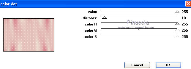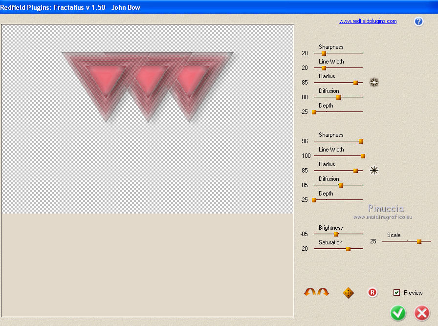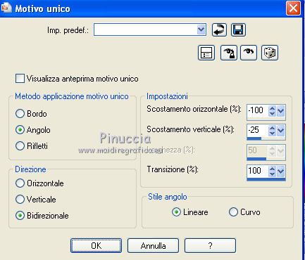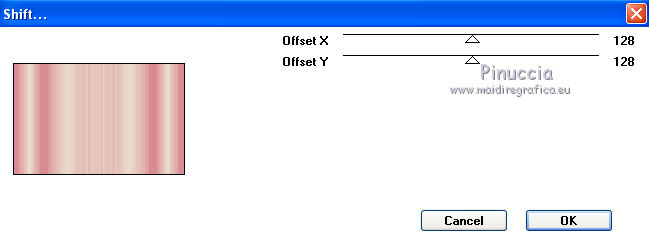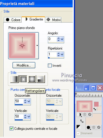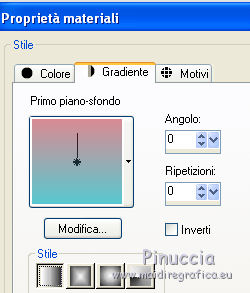 qui puoi trovare qualche risposta ai tuoi dubbi. Se l'argomento che ti interessa non è presente, ti prego di segnalarmelo. Questo tutorial è stato creato con PSP X2, ma può essere eseguito anche con le altre versioni di PSP. Per tradurlo, ho usato PSP X. Questo tutorial è una creazione di ©Exkizz Eskiss e non può essere copiato su altri siti nè essere offerto per il download. Lo stesso vale per la mia traduzione. Il materiale viene da vari gruppi di condivisione. Il copyright appartiene ai rispettivi autori. Grazie ai creatori dei tubes che mettono a disposizione il loro lavoro in vari gruppi di condivisione. Rispetta il lavoro degli autori, non cambiare il nome del file e non cancellare il watermark. Occorrente: Materiale qui Scompattato il materiale, avrai la paletta dei colori Exkizz_Palette_Beautiful, la Palette_Template, e 5 cartelle: Masques che contiene 2 maschere. in caso di dubbi, ricorda di consultare la mia sezione filtri qui Penta.com - Color Dot qui Alien Skin Eye Candy 5 Impact - Perspective Shadow qui L & K Raisa qui Mura' Seamless - Shift qui FM Tile Tools - Blend Emboss qui Ulead Effects - Particle qui Redfield - Fractalius qui Flaming Pear - Flood qui AAA Frames - Transparent Frame qui Richard Rosenman - Solid Border qui Filters Unlimited 2.0 qui Filter Factory Gallery F - Quadrant Replicate qui I filtri Factory Gallery per essere usati devono prima essere convertiti. Come fare vedi qui Si usano importandoli in Filters Unlimited (come fare vedi qui) ma possono funzionare anche da soli Metti le maschere nella cartella Maschere. Metti i due files del pennello nella cartella Pennelli. Metti i preset "Exkiss_Beautiful_Shadow1" e "Exkizz_Beautiful_Shadow2" nella cartella del filtro: Alien Skin Eye Candy 5 Impact>Settings>Shadow. Se preferisci puoi importarlo, quando ti servirà, dalla cartella in cui hai scompattato il materiale. Vedi la scheda del filtro qui e come importare un preset in Eye Candy qui Metti il preset "Exkizz_Beautiful_Flood" nella cartella del filtro Flood o in una cartella a tua scelta. ![]() Colori utilizzati Apri la paletta "Exkizz_Palette_Beautiful" in PSP. ![]() Attiva lo strumento Contagocce ![]() Clicca con il tasto sinistro del mouse per impostare il colore di primo piano, e con il tasto destro per impostare il colore di sfondo. (Nota. Se desideri cambiare colori, trovi nel materiale una paletta template. Seleziona ogni riquadro con la bacchetta magica (tolleranza 0 e sfumatura 0) e riempi con i tuoi colori).Per questo tutorial, scegli 2 colori di tonalità media, nè troppo scuri nè troppo chiari e un colore chiaro. Preparazione del gradiente Imposta il colore di primo piano con #d98b93 ![]() e il colore di sfondo con #ebdccf ![]() Passa il colore di primo piano a Gradiente Rettangolare, con i seguenti settaggi. ![]() 1. Apri una nuova immagine trasparente 850 x 550 pixels, e riempila con il gradiente.Risultato. ![]() 2. Effetti>Plugins>L & K - L&K Raisa. ![]() Effetti>Effetti di bordo>Aumenta di più. Effetti>Plugins>Filters Unlimited - Filter Factory Gallery F - Quadrant Replicate. ![]() Effetti>Plugins>Mura's Seamless - Shift, con i settaggi standard. ![]() Effetti>Effetti di immagine>Motivo unico. ![]() Modifica>Ripeti Motivo unico. ![]() Risultato. ![]() Effetti>Plugins>Penta.com - Color Dot. ![]() Effetti>Plugins>FM Tile Tools - Blend Emboss, con i settaggi standard. ![]() 3. Apri il tube del fiore "WD-THEROSE" e vai a Modifica>Copia. Torna al tuo lavoro e vai a Modifica>Incolla come nuovo livello. Immagine>Ridimensiona al 70%, tutti i livelli non selezionato. ![]() Regola>Messa a fuoco>Metti a fuoco. Nelle versioni superiori di PSP, la Messa a fuoco è stata inserita nel Ridimensionamento. ![]() Abbassa l'opacità di questo livello al 30%. (in base al tuo tube, puoi variare questo settaggio). Effetti>Effetti di immagine>Scostamento: ![]() Livelli>Duplica. Immagine>Rifletti. Immagine>Capovolgi. Livelli>Unisci>Unisci giù. Effetti>Effetti di immagine>Motivo unico. ![]() 4. Apri il tube "Exkizz_Fractale" e vai a Modifica>Copia. Torna al tuo lavoro e vai a Modifica>Incolla come nuovo livello. Effetti>Effetti di immagine>Scostamento. ![]() Effetti>Effetti 3D>Sfalsa ombra, con il colore nero. ![]() Livelli>Unisci>Unisci visibile. Risultato. ![]() Rinomina questo livello "Sfondo" e chiudilo. ![]() 5. Preparazione di un gradiente lineare Imposta il colore di primo piano con #58c8d0 ![]() e il colore di sfondo con #d98b93 ![]() Passa il colore di primo piano a Gradiente lineare, con i seguenti settaggi. ![]() Livelli>Nuovo livello raster. Riempi il nuovo livello con il gradiente.Effetti>Plugins>Ulead Effects - Particle. Seleziona l'Effetto Cloud, poi clicca su Load. ![]() Nella finestra che si apre seleziona il Preset Fog 2 e ok. Di nuovo ok nella finestra principale del filtro. ![]() 6. Livelli>Nuovo livello raster. Imposta il colore di primo piano con il colore bianco #ffffff. Riempi il livello con il colore bianco.Livelli>Carica/Salva maschera>Carica maschera da disco. Cerca e carica la maschera Exkizz_Mask_Beautiful1. ![]() Regola>Messa a fuoco>Accentua messa a fuoco. Livelli>Unisci>Unisci gruppo. Effetti>Effetti 3D>Sfalsa ombra, con il colore nero. ![]() Risultato: ![]() 7. Livelli>Nuovo livello raster. Riempi con il colore di sfondo #d98b93 ![]() Livelli>Carica/Salva maschera>Carica maschera da disco. Cerca e carica la maschera Exkizz_Mask_Beautiful2. ![]() Regola>Messa a fuoco>Accentua messa a fuoco. Livelli>Duplica. Nella paletta dei livelli avrai questo. ![]() Livelli>Unisci>Unisci gruppo. Effetti>Effetti 3D>Sfalsa ombra, con il colore nero. ![]() Regola>Luminosità e contrasto>Nitidezza. ![]() Effetti>Plugins>Redfield - Fractalius. ![]() Questa è la schermata dell'autrice del tutorial; Se, come nel mio esempio, hai un'altra versione di Redfield con l'aggiunta del parametro Depth, regola questo settaggio a -25. ![]() Se e solamente se il risultato è differente dal mio annulla il passaggio (Modifica>Annulla azione Fractalius), e rip