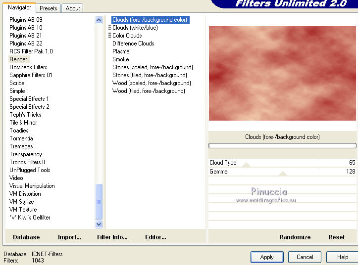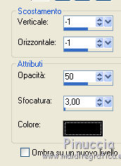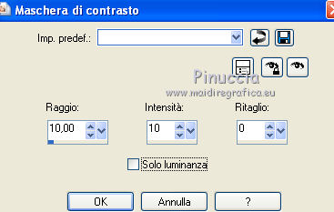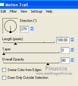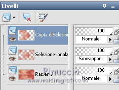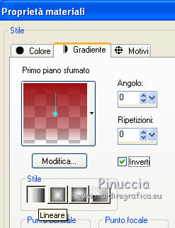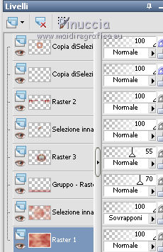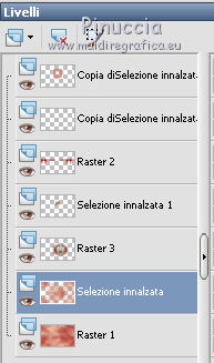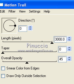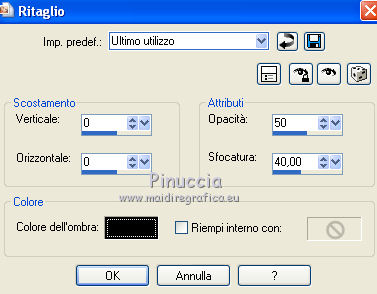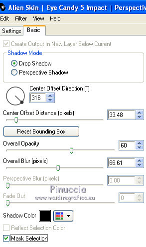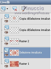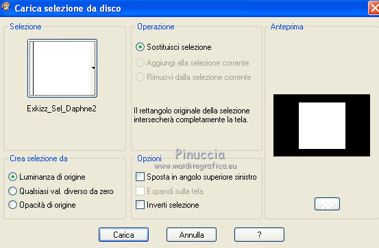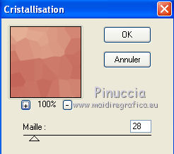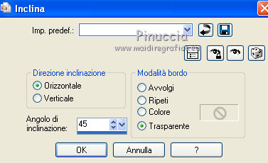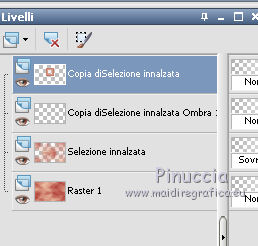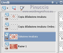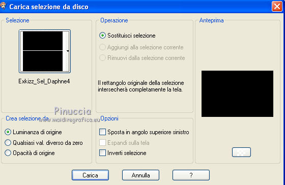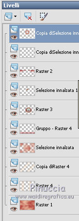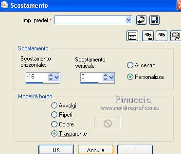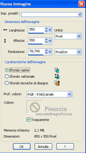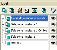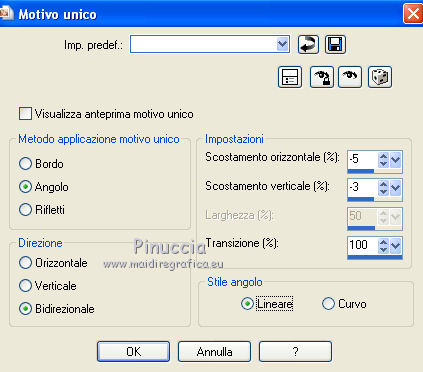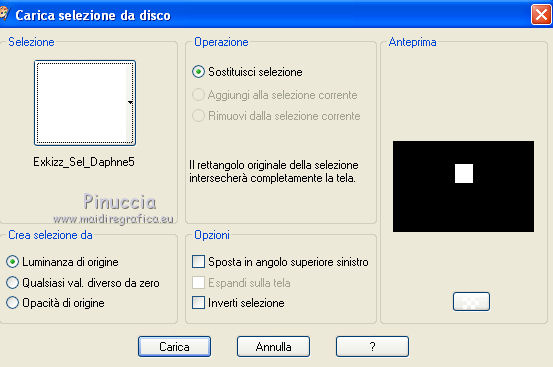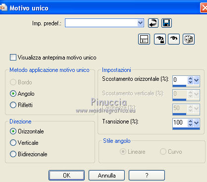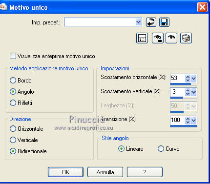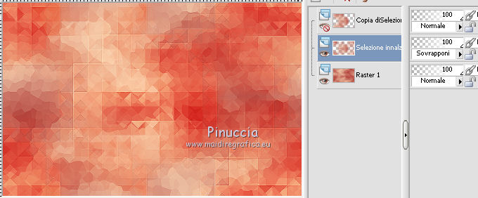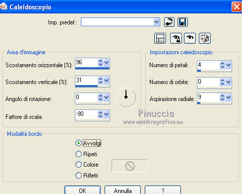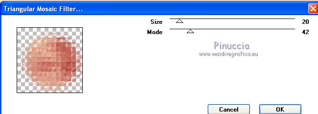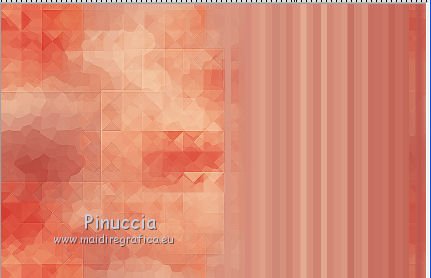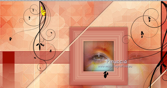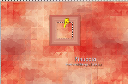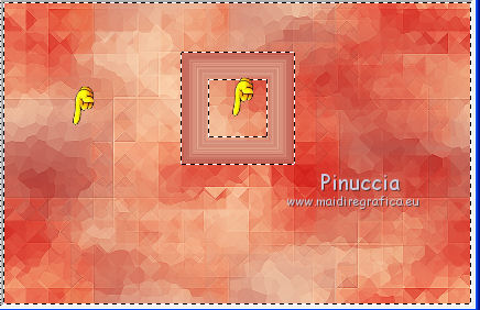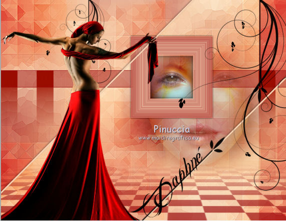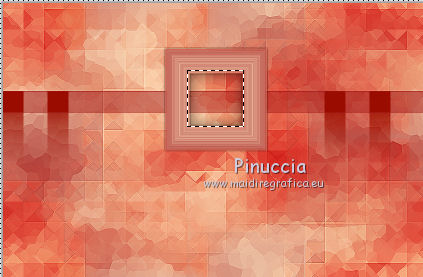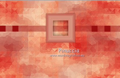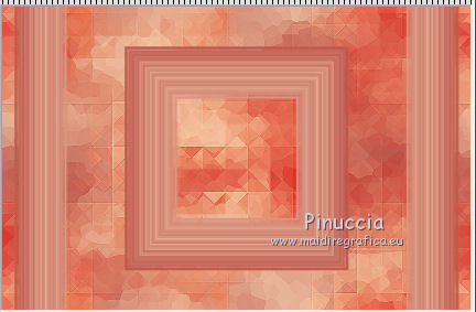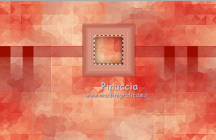 qui puoi trovare qualche risposta ai tuoi dubbi. Se l'argomento che ti interessa non è presente, ti prego di segnalarmelo. Questo tutorial è stato creato con PSP X2, ma può essere eseguito anche con le altre versioni di PSP. Per tradurlo, ho usato PSP X. Questo tutorial è una creazione di ©Exkizz Eskiss e non può essere copiato su altri siti nè essere offerto per il download. Lo stesso vale per la mia traduzione. Il materiale viene da vari gruppi di condivisione. Il copyright appartiene ai rispettivi autori. Grazie ai creatori dei tubes che mettono a disposizione il loro lavoro in vari gruppi di condivisione. Rispetta il lavoro degli autori, non cambiare il nome del file e non cancellare il watermark. Occorrente: Materiale qui Il tube "Dama_de_Rojo" è di Il tube "TReagen_2504" è di in caso di dubbi, ricorda di consultare la mia sezione filtri qui Filters Unlimited 2.0 qui Pixellisation - Cristallisation qui Eye Candy 4000 - Motion Trail qui Filter Factory Gallery A - Triangular Mosaic Filter qui Alien Skin Eye Candy 5 Impact - Perspective shadow qui Apri il font e minimizzalo. Lo troverai nella lista dei font disponibili quando ti servirà. Metti le maschere nella cartella Maschere. Metti le selezioni nella cartella Selezioni. Metti i pennelli nella cartella Pennelli. Attenzione, ciascun pennello è composto da due files che non devono essere separati. (Vedi gli appunti sui Pennelli qui). Apri il resto del materiale in PSP. Colori utilizzati Apri la paletta "Exkizz_Palette_daphne" in PSP. Attiva lo strumento Contagocce ![]() Clicca con il tasto sinistro del mouse per impostare il colore di primo piano, e con il tasto destro per impostare il colore di sfondo. (Nota: Nel materiale trovi una paletta Template, nel caso volessi usare altri colori. Seleziona ogni casella con la bacchetta magica , modalità Sostituisci, corrispondenza Valore RGB, sfumatura e tolleranza0),e riempi la casella con i tuoi colori).Per questo tutorial sono stati usati due colori scelti dal tube principale: il colore scuro #9c0f12, e il colore chiaro #f6d2b2. Se il tuo tube non è molto colorato, scegli due colori che si armonizzano con la tua immagine. Questa la mia paletta. ![]() ***** 1. Apri la paletta "Exkizz_Palette_daphne". Attiva lo strumento Contagocce ,clicca con il tasto sinistro del mouse sul colore scuro #9c0f12 per impostarlo come colore di primo piano.Clicca con il tasto destro del mouse sul colore chiaro #f6d2b2 per impostarlo come colore di sfondo.Questa dovrebbe essere la tua paletta dei Materiali. ![]() 2. Apri una nuova immagine trasparente 850 x 550 pixels. ![]() Riempi l'immagine trasparente con il colore di primo piano(per l'effetto successivo il colore non ha importanza) Effetti>Plugins>Filters Unlimited 2.0 - Render - Clouds (fore-/background color). ![]() Effetti>Plugins>Pixellisation - Cristallisation. ![]() Effetti>Effetti di bordo>Aumenta. Selezione>Carica/Salva selezione>Carica selezione da disco. Cerca e carica la selezione Exkizz_Sel_Daphne 1. ![]() Selezione>Innalza selezione a livello. Mantieni selezionato. E' attivo il livello "Selezione innalzata". ![]() Effetti>Plugins>Filter Factory Gallery A - Triangular Mosaic Filter. ![]() Selezione>Deseleziona. Effetti>Effetti di immagine>Motivo unico. ![]() Livelli>Duplica. Chiudi la visibilità di questa copia che userai più tardi e attiva il livello originale. ![]() Effetti>Effetti di immagine>Scostamento. ![]() Effetti>Effetti di immagine>Motivo unico. ![]() Effetti>Effetti di bordo>Aumenta. Cambia la modalità di miscelatura di questo livello in Sovrapponi. ![]() 3. Riapri e attiva il livello di Copia di Selezione innalzata. ![]() Effetti>Effetti di immagine>Scostamento. ![]() Dovresti avere questo. ![]() Effetti>Effetti di riflesso>Caleidoscopio. ![]() Risultato. ![]() Selezione>Carica/Salva selezione>Carica selezione da disco. Cerca e carica la selezione Exkizz_Sel_Daphne 2. ![]() Selezione>Inverti. Premi sulla tastiera il tasto CANC. Selezione>Deseleziona. Immagine>Ridimensiona, al 50%, tutti i livelli non selezionato. Effetti>Effetti di immagine>Scostamento. ![]() Risultato. ![]() Regola>Correzione fotografica intelligente (il settaggio si applica automaticamente; se il risultato non ti piace, puoi modificare i settaggi). se stai usando PSP 9, potrai usare soltanto Regola>Correzione fotografica in un passaggio; n questo caso se il risultato non ti piace puoi saltare il passaggio Regola>Messa a fuoco>Metti a fuoco. Attiva lo strumento Bacchetta magica ![]() ![]() e clicca al centro e all'esterno del piccolo quadro. ![]() Selezione>Inverti. Effetti>Effetti 3D>Sfalsa ombra, con il colore nero - ombra su nuovo livello selezionato. ![]() Selezione>Deseleziona. Se stai usando PSP 9, non ti sarà possibile impostare ombra su nuovo livello selezionato. Prima di applicare l'Effetto Sfalsa ombra, propongo questa variante: Selezione>Innalza selezione a livello. Selezione>Deseleziona. Livelli>Disponi>Sposta giù. Attiva nuovamente il livello superiore di Copia di Selezione innalzata. ![]() se stai usando PSP 9 e hai seguito la mia variante, questa dovrebbe essere la tua paletta dei livelli: ![]() Clicca al centro del quadro con la bacchetta magica ; con i settaggi precedenti.![]() Effetti>Effetti 3D>Ritaglio - colore dell'ombra nero. ![]() Selezione>Deseleziona. Risultato. ![]() Questo il risultato con la mia variante per PSP 9. ![]() 4. Attiva il livello originale della Selezione Innalzata. ![]() Livelli>Nuovo livello raster - Raster 2. Selezione>Carica/Salva selezione>Carica selezione da disco. Cerca e carica la selezione Exkizz_Sel_Daphne 3. ![]() Per riempire le selezioni con un solo clic, imposta la modalità di corrispondenza dello strumento Riempimento in Nessuno.![]() Riempi la selezione con il colore scuro di primo piano #9c0f12 ![]() Selezione>Deseleziona. Livelli>Duplica, e attiva il livello sottostante dell'originale. Effetti>Plugins>Eye Candy 4000 - Motion Trail. ![]() Risultato. ![]() Attiva nuovamente il livello soprastan