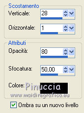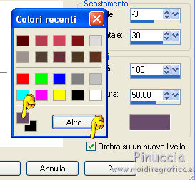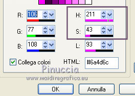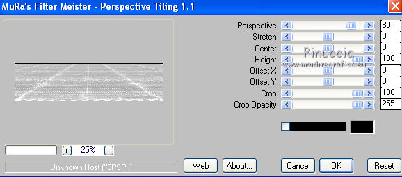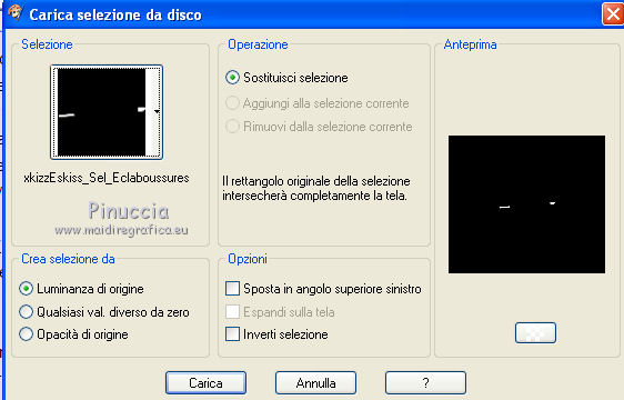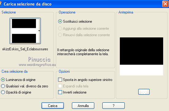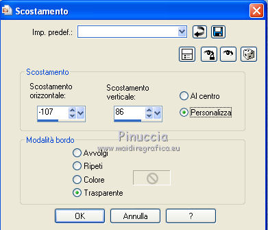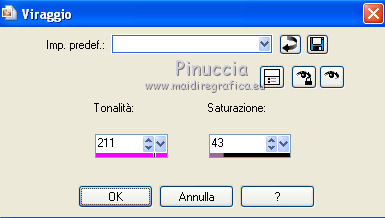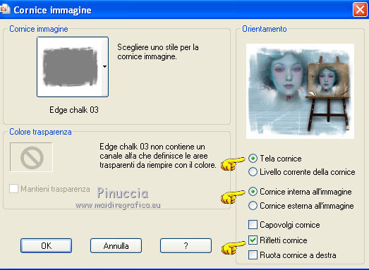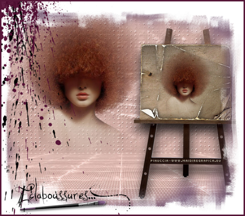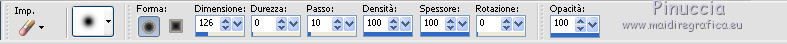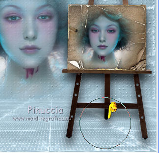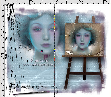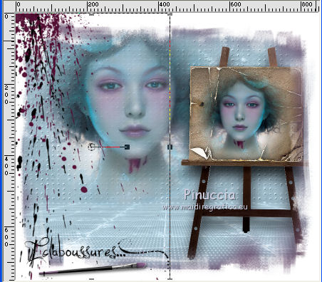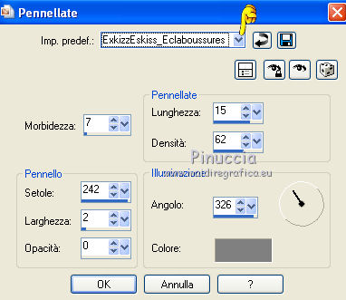 qui puoi trovare qualche risposta ai tuoi dubbi. Se l'argomento che ti interessa non è presente, ti prego di segnalarmelo. Questo tutorial è stato creato con PSP X2, ma può essere eseguito anche con le altre versioni di PSP. Per tradurlo, ho usato PSP X. Questo tutorial è una creazione di ©Exkizz Eskiss e non può essere copiato su altri siti nè essere offerto per il download. Lo stesso vale per la mia traduzione. Il materiale viene da vari gruppi di condivisione. Il copyright appartiene ai rispettivi autori. Grazie ai creatori dei tubes che mettono a disposizione il loro lavoro in vari gruppi di condivisione. Rispetta il lavoro degli autori, non cambiare il nome del file e non cancellare il watermark. Occorrente: Materiale qui Il tube del cavalletto è di Filtri: in caso di dubbi, ricorda di consultare la mia sezione filtri qui Mura's Meister - Perspective Tiling qui ![]() Metti la cornice-immagine Edge_chalk03 (cartella Cadre) nella cartella Cornici-immagine. Metti il preset_BrushStrokes_ExkizzEskiss nella cartella Impostazioni predefinite. Metti le selezioni nella cartella Selezioni. Metti i pennelli (cartella Pinceaux) nella cartella Pennelli. Attenzione, ogni pennello è composto da due files che non devono essere separati (Vedi gli appunti sui pennelli qui) Apri il tube "ExkizzEskiss_VisageMistChenMan_07-10" e vai a Modifica>Copia. minimizzalo perchè ti servirà ancora Apri il tube "chevalet_Eclaboussures" e vai a Modifica>Incolla come nuovo livello. Posiziona il tube al centro del cavalletto.Attiva lo strumento Selezione , rettangolo,e seleziona in alto e in basso la parte del tube che oltrepassa il cavalletto. Premi sulla tastiera il tasto CANC. Selezione>Deseleziona. Apri il livello superiore e vai a Livelli>Unisci>Unisci visibile. Minimizza il tube e lascialo in attesa. 2. Apri una nuova immagine trasparente 850 x 750 pixels. Imposta il colore di primo piano con #a7c3d1. Nel materiale trovi una tabellina con i colori usati: ExkizzEskiss_Palette_Eclaboussures. attivando lo strumento Contagocce , puoi usare questa tabellina per impostare velocemente i colori necessari.Clicca con il tasto sinistro del mouse quando vuoi impostare il colore di primo piano, e il tasto destro per impostare il colore di sfondo. Se vuoi usare un altro colore, scegli una tinta pallida o chiara. Riempi l'immagine trasparente con il colore di primo piano.3. Livelli>Nuovo livello raster. Selezione>Seleziona tutto. Apri la trama "Texture plumetis" e vai a Modifica>Copia. Torna al tuo lavoro e vai a Modifica>Incolla nella selezione. Selezione>Deseleziona. Cambia la modalità di miscelatura di questo livello in Luminanza (esistente). Selezione>Carica/Salva selezione>Carica selezione da disco. Cerca e carica la selezione ExkizzEskiss_sel_Eclaboussures1. ![]() Effetti>Plugins>Mura's Meister - Perspective Tiling, con i settaggi standard. ![]() Selezione>Inverti. Effetti>Effetti tecniche di disegno>Pennellate. Apri il menu delle Impostazioni, seleziona ExkizzEskiss_Eclaboussures e ok. ![]() Selezione>Deseleziona. 4. Attiva nuovamente il tube "ExkizzEskiss_VisageMistChenMan_07-10" e vai a Modifica>Copia. Torna al tuo lavoro e vai a Modifica>Incolla come nuovo livello. Non spostarlo. Immagine>Rifletti. Effetti>Effetti di immagine>Scostamento. ![]() Abbassa l'opacità di questo livello all'81%. 5. Attiva il tube del cavalletto che hai messo da parte prima e vai a Modifica>Copia. Torna al tuo lavoro e vai a Modifica>Incolla come nuovo livello. Immagine>Ridimensiona, al 50%, tutti i livelli non selezionato, ricampionamento bicubica. ![]() Regola>Messa a fuoco>Metti a fuoco. Effetti>Effetti di immagine>Scostamento. ![]() Effetti>Effetti 3D>Sfalsa ombra, con il colore nero, ombra su nuovo livello selezionato. ![]() Rimani posizionato sul livello dell'ombra. Attiva lo strumento Gomma con i seguenti settaggi.![]() Un piccolo clic alla base di ogni piede del cavalletto per cancellare l'ombra di troppo. ![]() Attiva il livello superiore del cavalletto. Livelli>Unisci>Unisci giù. 6. Immagine>Cornice-immagine. Seleziona la cornice Edge_chalk03 con i seguenti settaggi. ![]() Imposta il colore di primo piano con #6a4d6c. Effetti>Effetti 3D>Sfalsa ombra, con il colore #6a4d6c, ombra su nuovo livello selezionato. Clicca sulla paletta del colore e avrai la tabellina dei colori recenti. In basso a sinistra, i tuoi colori. Clicca sulla palettina corrispondente per impostare il colore di primo piano. ![]() Rimani posizionato sul livello dell'ombra. Immagine>Rifletti. Attiva il livello superiore del quadro. Livelli>Unisci>Unisci giù. 7. Apri il tube "pinceau" e vai a Modifica>Copia. Torna al tuo lavoro e vai a Modifica>Incolla come nuovo livello. Non spostarlo. Selezione>Carica/Salva selezione>Carica selezione da disco. Cerca e carica la selezione ExkizzEskiss_sel_Eclaboussures2. ![]() Regola>Tonalità e saturazione>Viraggio. ![]() Selezione>Deseleziona. Se stai utilizzando altri colori, prendi nota dei valori di Tonalità (H) e Saturazione (S) del tuo colore. ![]() Effetti>Effetti di immagine>Scostamento. ![]() Effetti>Effetti 3D>Sfalsa ombra, con il colore nero #000000, ombra su nuovo livello non selezionato. ![]() 8. Apri il tube ExkizzEskizz_WordArt e vai a Modifica>Copia. Torna al tuo lavoro e vai a Modifica>Incolla come nuovo livello. Sposta il testo sopra il pennello (vedi il mio esempio).9. Imposta il colore di primo piano con il colore nero #000000. Livelli>Nuovo livello raster. Attiva lo strumento Pennello ,cerca e seleziona il pennello ExkizzEskiss_Eclaboussures1, e applicalo nell'angolo in alto a sinistra cliccando con il tasto sinistro del mouse per usare il colore nero. Se necessario, per vedere meglio il pennello ingrandisci l'immagine attivando lo strumento Zoom o usando la rotellina del mouse)Se il tuo PSP non supporta pennelli superiori a 500 pixels, procedi così: apri in PSP il file "pspBrush" del pennello. Immagine>Ridimensiona, a 500 pixels di altezza. File>Esporta>Pennello personalizzato, assegna un nome