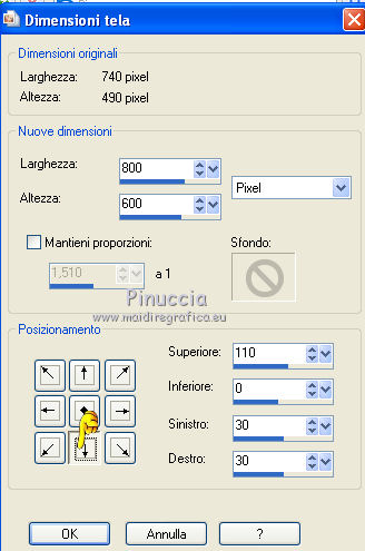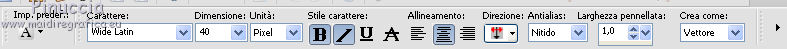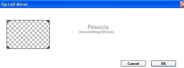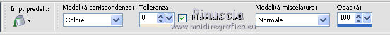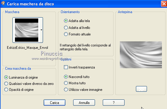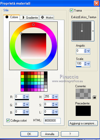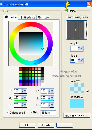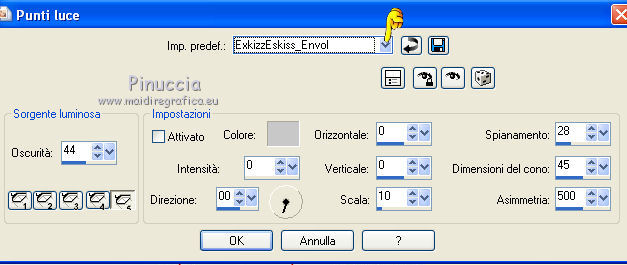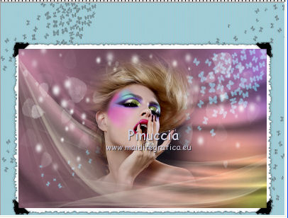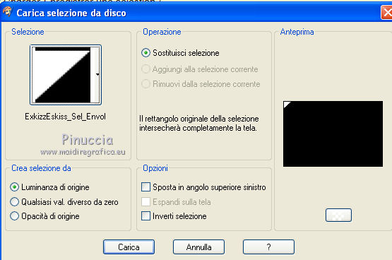 qui puoi trovare qualche risposta ai tuoi dubbi. Se l'argomento che ti interessa non è presente, ti prego di segnalarmelo. Questo tutorial è stato creato con PSP X2, ma può essere eseguito anche con le altre versioni di PSP. Per tradurlo, ho usato PSP X. Questo tutorial è una creazione di ©Exkizz Eskiss e non può essere copiato su altri siti nè essere offerto per il download. Lo stesso vale per la mia traduzione. Il materiale viene da vari gruppi di condivisione. Il copyright appartiene ai rispettivi autori. Grazie ai creatori dei tubes che mettono a disposizione il loro lavoro in vari gruppi di condivisione. Rispetta il lavoro degli autori, non cambiare il nome del file e non cancellare il watermark. Occorrente: Materiale qui Il tube usato è di Luz-Cristina. Filtri: in caso di dubbi, ricorda di consultare la mia sezione filtri qui Simple - Top Left Mirror qui Filters Unlimited 2.0 qui ![]() Metti la maschera nella cartella Maschere. Metti la selezione nella cartella Selezioni. Metti la trama nella cartella Trame. Metti il preset ExkizzEskiss_Envol nella cartella Impostazioni predefinite. Metti i pennelli nella cartella Pennelli. Attenzione, ogni pennello è composto da due files che non devono essere separati (Vedi gli appunti sui pennelli qui) 1. Apri "ExkizzEskiss_Alpha_Envol". Duplicala usando la combinazione di tasti maiuscola+D e chiudi l'originale. La copia sarà la base del tuo lavoro. Questa immagine non è vuota, ma contiene una selezione salvata sul canale alpha. Elimina il livello del watermark. Imposta il colore di primo piano con il colore nero #000000, e riempi l'immagine con questo colore.2. Livelli>Nuovo livello raster. Imposta il colore di primo piano con #df99ba. (se stai utilizzando un altro tube, scegli un colore chiaro in armonia con il tuo tube). Riempi il livello con il colore di primo piano.Livelli>Carica/Salva maschera>Carica maschera da disco. Cerca e carica la maschera ExkizzEskiss_Masque_Envoi. ![]() Livelli>Unisci>Unisci gruppo. Effetti>Effetti di illuminazione>Punti luce: apri il menu dei preset, seleziona ExkizzEskiss_Envol e ok. ![]() 3. Livelli>Nuovo livello raster. Imposta il colore di primo piano con #f5f5cf. Selezione>Carica/Salva selezione>Carica selezione da canale alpha. E' presente la selezione ExkizzEskiss_Voile; devi soltanto cliccare Carica. ![]() Attiva lo strumento Riempimento e imposta la modalità di corrispondenza in Colore.![]() Riempi la selezione con il colore #f5f5cf (un solo clic), o con un altro colore.Selezione>Deseleziona. Cambia la modalità di miscelatura di questo livello in Filtra, e abbassa l'opacità all'80%. 4. Livelli>Nuovo livello raster. Imposta il colore di primo piano con il colore bianco #ffffff. Attiva lo strumento Pennello ![]() cerca e seleziona il pennello ExkizzEskiss_Envol1; ingrandisci l'immagine attivando lo strumento Zoom o usando la rotellina del mouse,e applica il pennello cliccando una sola volta sulla parte superiore dell'immagine con il tasto sinistro del mouse per usare il colore di primo piano. ![]() Cambia la modalità di miscelatura di questo livello in Filtra. Se il tuo PSP non supporta pennelli superiori a 500 pixels (questo pennello ha la dimensione di 700x450 pixels), puoi rimediare procedendo così. Apri il file pspBrush del pennello in PSP. Immagine>Ridimensiona, a 500 pixels di larghezza. File>Esporta>Pennello personalizzato, assegna un nome al pennello e ok. Cerca e seleziona il pennello e applicalo con il colore di primo piano nell'angolo in alto a sinistra. Attiva lo strumento Deformazione , premendo sulla tastiera il tasto D,tira il pennello a destra fino a coprire tutta la larghezza dell'immagine. Poi, usando il nodo centrale inferiore allungalo a 450 pixels (altezza del pennello originale). 5. Livelli>Nuovo livello raster. Imposta il colore di primo piano con un colore dominante del tuo tube. Per l'esempio: #91c2ce. Attiva lo strumento Pennello ![]() cerca e seleziona il pennello ExkizzEskiss_Envol2, ingrandisci l'immagine come hai fatto prima, e applica il pennello nell'angolo in alto a destra. ![]() Cambia la modalità di miscelatura di questo livello in Luce netta. (in base ai tuoi colori, puoi sperimentare la modalità più adatta). anche questo pennello supera i 500 pixels (650x392). Procedi come nel passaggio precedente. ![]() 6. Apri il tube "2324-luzcristina" e vai a Modifica>Copia. Torna al tuo lavoro e vai a Modifica>Incolla come nuovo livello. Immagine>Ridimensiona, all'80%, tutti i livelli non selezionato, bicubica. ![]() Immagine>Rifletti. Livelli>Unisci>Unisci tutto (appiattisci). Immagine>Aggiungi bordatura, 20 pixels, simmetriche, con il colore bianco #ffffff. 7. Livelli>Innalza livello di sfondo. Effetti>Plugins>Filters Unlimited - Edges,Square - Square Edge 17. ![]() 8. Livelli>Nuovo livello raster. Imposta il colore di primo piano con il nero. Selezione>Carica/Salva selezione>Carica selezione da disco. Cerca e carica la selezione ExkizzEskiss_sel_Envol. ![]() Riempi la selezione con il colore nero #000000.Selezione>Deseleziona. Effetti>Plugins>Simple - Top Left Mirror. ![]() 9. Immagine>Dimensione tela - 800 x 600. ![]() Sempre posizionato sul livello degli angoli: Effetti>Effetti 3D>Sfalsa ombra, con il colore nero. ![]() Attiva il livello sottostante. Effetti>Effetti 3D>Sfalsa ombra, con i settaggi precedenti. 10. Livelli>Nuovo livello raster. Livelli>Disponi>Sposta giù. Imposta il colore di primo piano con #c0c0c0, e riempi il livello con questo colore.11. Livelli>Nuovo livello raster. Imposta il colore di primo piano con #69e3ff, seleziona Trama e imposta la trama ExkizzEskiss_Texture_Envol con i seguenti settaggi. ![]() Riempi il livello con questo colore+trama.Nota. L'applicazione della trama schiarisce il colore, scegli un colore vivo o scuro. 12. Livelli>Nuovo livello raster. Mantieni selezionato "Trama" e cambia il colore con il nero #000000. ![]() Attiva lo strumento Pennello ![]() cerca e seleziona il pennello ExkizzEskiss_Envol2, e applicalo a picco