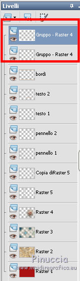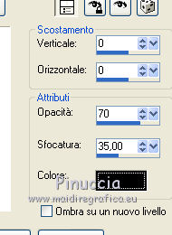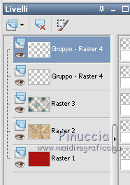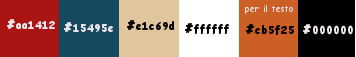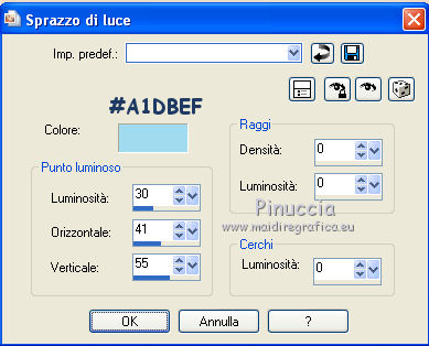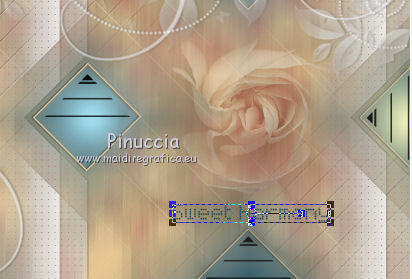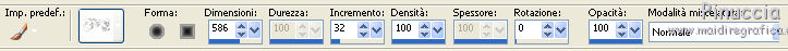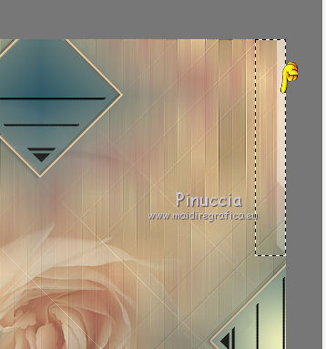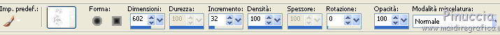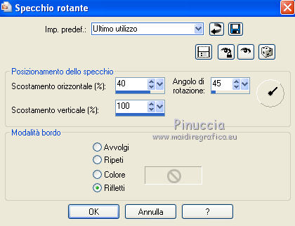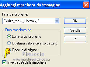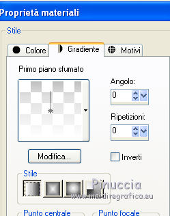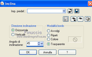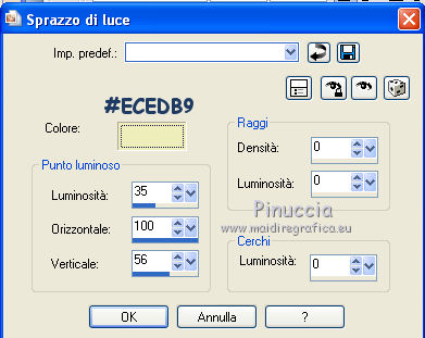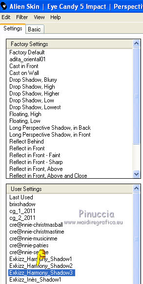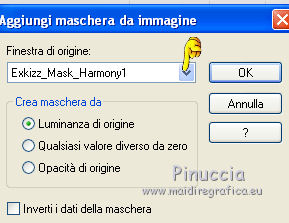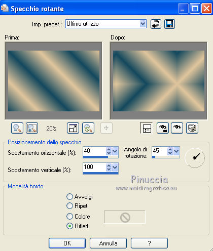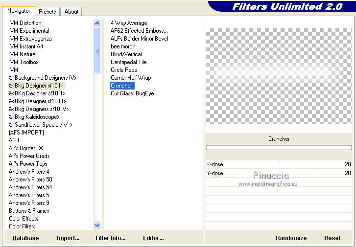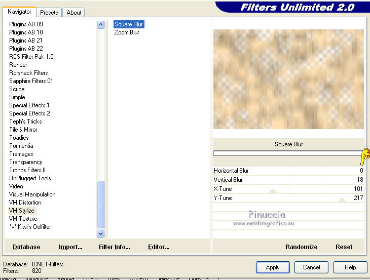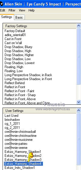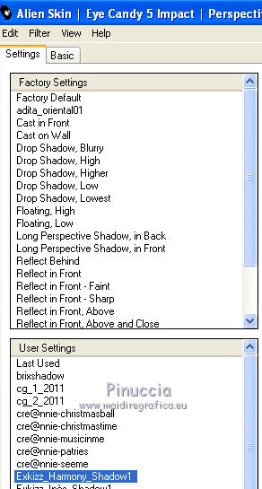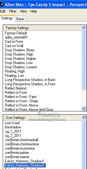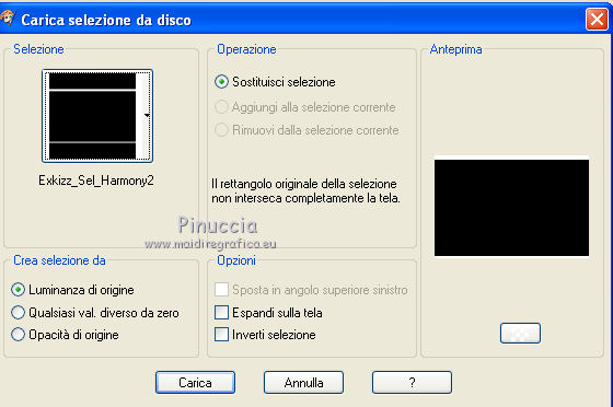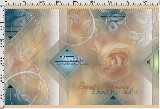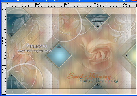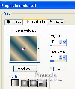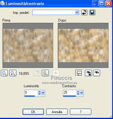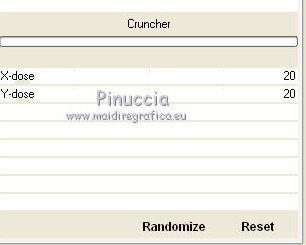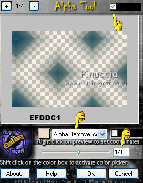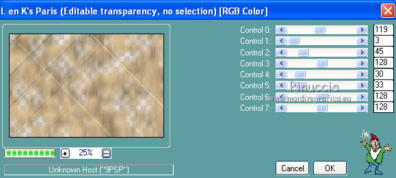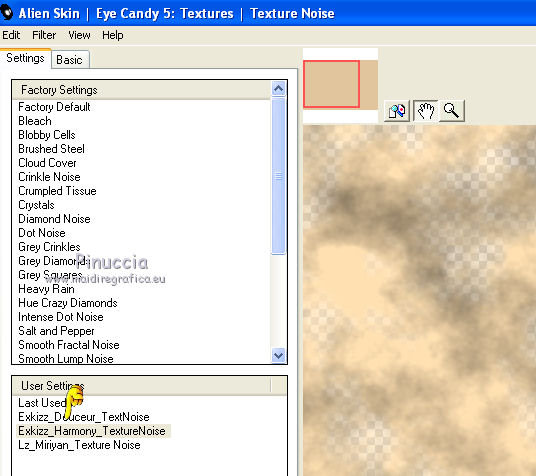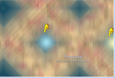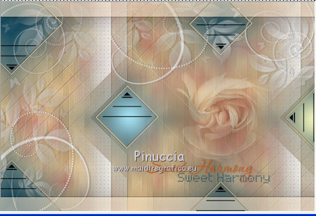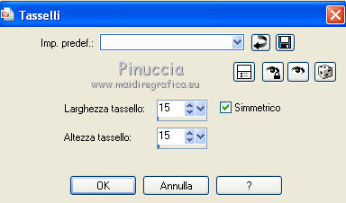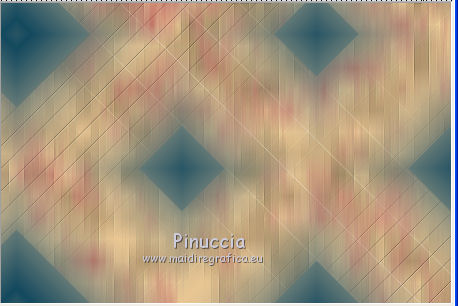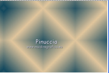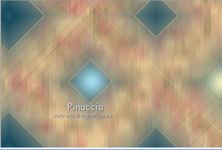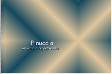 qui puoi trovare qualche risposta ai tuoi dubbi. Se l'argomento che ti interessa non è presente, ti prego di segnalarmelo. Questo tutorial è stato creato con PSP X2, ma può essere eseguito anche con le altre versioni di PSP. Per tradurlo, ho usato PSP X. Questo tutorial è una creazione di ©Exkizz Eskiss e non può essere copiato su altri siti nè essere offerto per il download. Lo stesso vale per la mia traduzione. Il materiale viene da vari gruppi di condivisione. Il copyright appartiene ai rispettivi autori. Grazie ai creatori dei tubes che mettono a disposizione il loro lavoro in vari gruppi di condivisione. Rispetta il lavoro degli autori, non cambiare il nome del file e non cancellare il watermark. Occorrente: Materiale qui I tubes sono di Annelies e Luna che ringrazio per l'autorizzazione a utilizzare i loro bellissimi tubes. E' vietato modificare, rinominare o togliere il watermark dai tubes. in caso di dubbi, ricorda di consultare la mia sezione filtri qui FM Tile Tools - Blend Emboss qui Plugins Galaxy - Alpha Tool qui L&K - L&K Paris qui Filters Unlimited 2.0 qui Bkg Designer sf10I - Cruncher (da importare in Unlimited) qui Alien Skin Eye Candy 5 Impact - Perspective shadow qui Alien Skin Eye Candy 5 Texture - Texture Noise qui VM Stylize qui Apri i font (cartella Polices) e minimizzali. Li troverai nella lista dei font disponibili, quando ti serviranno. Metti le selezioni (cartella Selections) nella cartella Selezioni. Metti i pennelli (cartella Pinceaux) nella cartella Pennelli. Attenzione, ciascun pennello è composto da due files che non devono essere separati. Nella cartella trovi anche i files in formato png; se il tuo PSP non consente l'uso dei pennelli perchè creati con una versione diversa, puoi usare questi esportandoli come pennelli. (Vedi gli appunti sui Pennelli qui). Metti i preset della cartella "Preset Filtres" nella cartella dei filtri. I quattro presets "Exkizz_Harmony_Shadow1-4" in Alien Skin Eye Candy 5 Impact>Settings>Shadow. e il preset "Exkizz_Harmony_TextureNoise in Alien Skin Eye Candy 5 Textures>Settings>Texture Noise. In alternativa, doppio clic sul file e il preset sarà automaticamente installato. Diversamente, se preferisci puoi importarli, quando ti serviranno, dalla cartella in cui hai scompattato il materiale. Vedi la scheda del filtro qui e come importare un preset in Eye Candy qui Apri le maschere (cartella Masques) in PSP e minimizzale con il resto del materiale. Colori utilizzati Apri la paletta "Exkizz_Palette_harmony" in PSP. Attiva lo strumento Contagocce ![]() Clicca con il tasto sinistro del mouse per impostare il colore di primo piano, e con il tasto destro per impostare il colore di sfondo. (Nota: Nel materiale trovi una paletta Template, nel caso volessi usare altri colori. Seleziona ogni casella con la bacchetta magica , modalità Sostituisci, corrispondenza Valore RGB, sfumatura e tolleranza0),e riempi la casella con i tuoi colori).Per questo tutorial devi scegliere 2 colori scuri e 1 colore chiaro. I colori utilizzati per l'esempio: primo colore scuro #aa1412, secondo colore scuro #15495e, colore chiaro #e1c69d. Se il tuo tube non è molto colorato, scegli colori che si armonizzano con la tua immagine. Questa la mia paletta. ![]() ***** 1. Apri la paletta "Exkizz_Palette_harmony". Attiva lo strumento Contagocce ,clicca con il tasto sinistro del mouse sul primo colore scuro #aa1412 per impostarlo come colore di primo piano.Clicca con il tasto destro del mouse sul colore chiaro #e1c69d per impostarlo come colore di sfondo.![]() 2. Apri una nuova immagine trasparente 900 x 600 pixels. ![]() Riempi l'immagine trasparente con il colore di primo piano #aa1412 (tasto sinistro).Livelli>Nuovo livello raster - Raster 2. Riempi con il colore di sfondo #e1c69d (tasto destro).Effetti>Plugins>Alien Skin Eye Candy 5 Textures - Texture Noise. Seleziona il preset exkizz_Harmony_TextureNoise e ok. ![]() Risultato: ![]() Effetti>Effetti di distorsione>Tasselli. ![]() Effetti>Effetti di bordo>Aumenta. Risultato. ![]() Effetti>Plugins>Filters Unlimited 2.0 - VM Stylize - Square blur. ![]() Risultato. ![]() Effetti>Plugins>L&K - L&K Paris. ![]() Effetti>Plugins>FM Tile Tools - Blend Emboss, con i settaggi standard. ![]() Questo filtro ha la tendenza a scurire l'immagine, per schiarirla un po' ho applicato: Regola>Luminosità e contrasto>Luminosità e contrasto, con i seguenti settaggi: ![]() Puoi provare altri settaggi in funzione dei tuoi colori. Risultato. ![]() 3. Livelli>Nuovo livello raster - Raster 3. Imposta il colore di primo piano con il secondo colore scuro #15495e. ATTENZIONE! E' importante che il colore sia molto scuro. Imposta il colore di sfondo con il colore chiaro #e1c69d. Passa il colore di primo piano a Gradiente di primo piano/sfondo, stile Lineare. ![]() Riempi il livello con il gradiente (tasto sinistro).Effetti>Effetti di riflesso>Specchio rotante. ![]() Risultato: ![]() Di nuovo Effetti>Effetti di riflesso>Specchio rotante con gli stessi settaggi. Risultato. ![]() 4. Effetti>Plugins>The Plugin Site - Alpha Tool. una volta inseriti nei Percorsi Files, i Plugin Galaxy, si trovano nell'elenco sotto "The Plugin Site" Seleziona la funzione a fianco alla scritta Alpa Tool: (è la funzione "Filtering": in alcune versioni la scritta non è visibile), e nel menu a discesa seleziona Alpha Remove(cool bo) - colore #efddc1. Importante. Questo filtro tende a cancellare il colore impostato. Se avessi utilizzato il colore chiaro di sfondo usato per il gradiente, sarebbe stato completamente cancellato dal filtro per conservare un leggero sprazzo di luce. Per questo ho scelto un colore leggermente più chiaro del colore chiaro di sfondo. Se le piccole losanghe non hanno la stessa dimensione delle mie, prova un altro valore, aumentando o abbassando il settaggio. ![]() Risultato. ![]() Effetti>Effetti di illuminazione>Sprazzo di luce, colore #a1dbef: ![]() Effetti>Effetti di illuminazione>Sprazzo di luce, questa volta con il colore #ecedb9. !