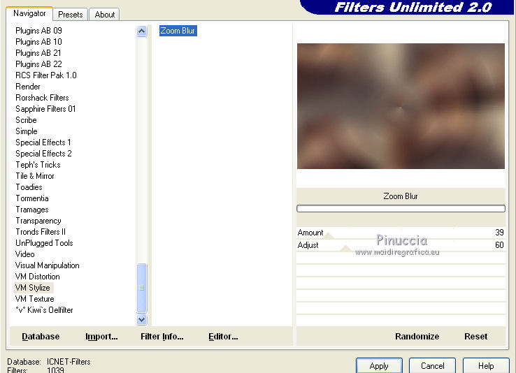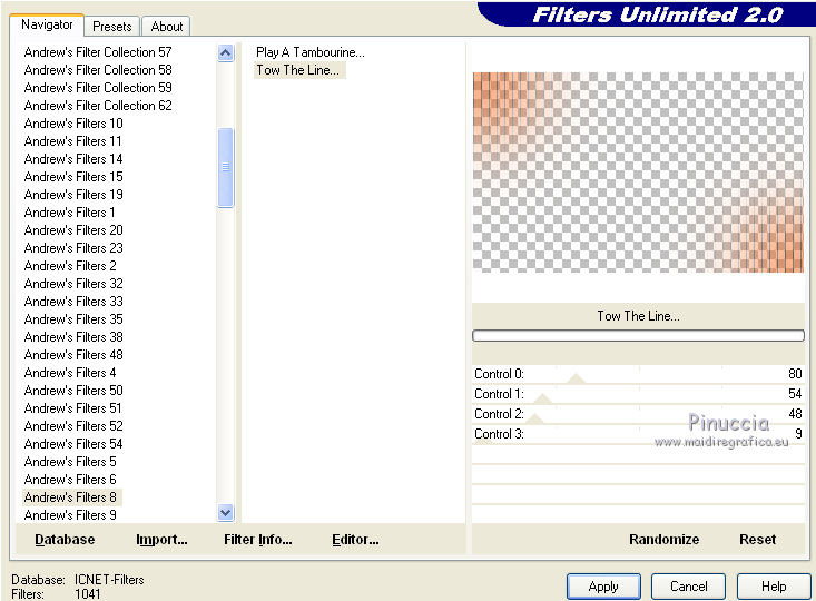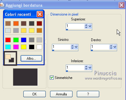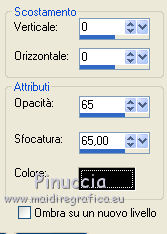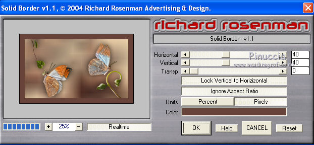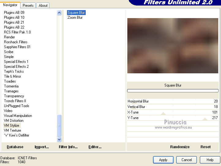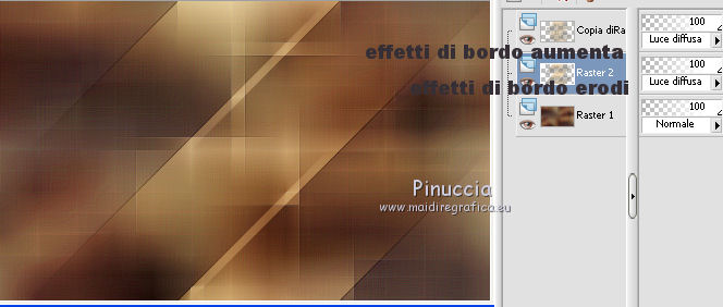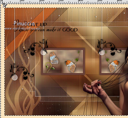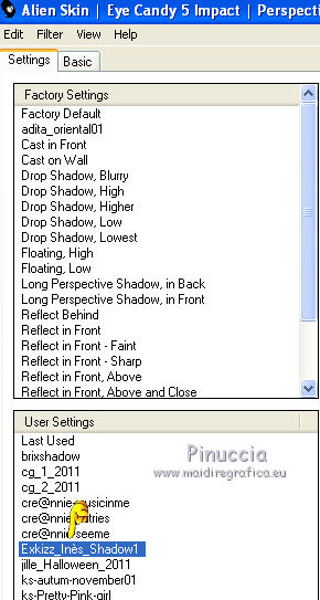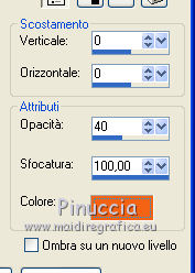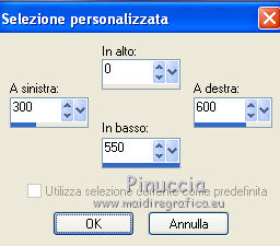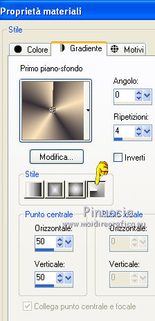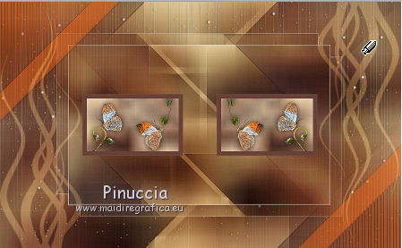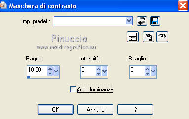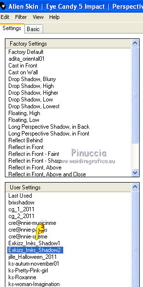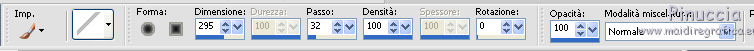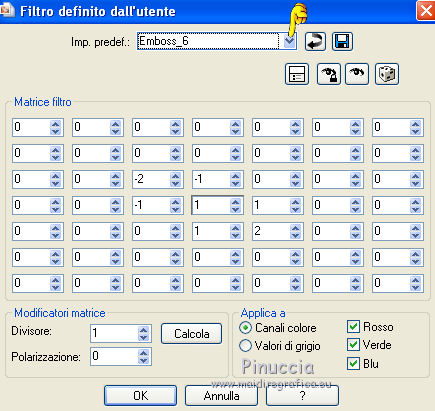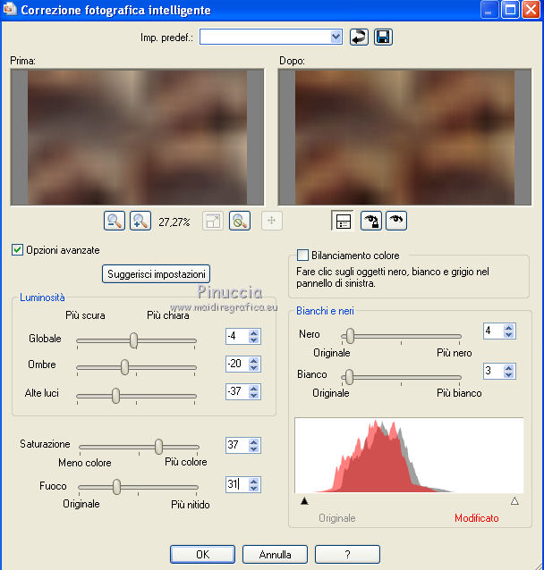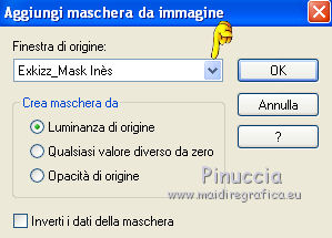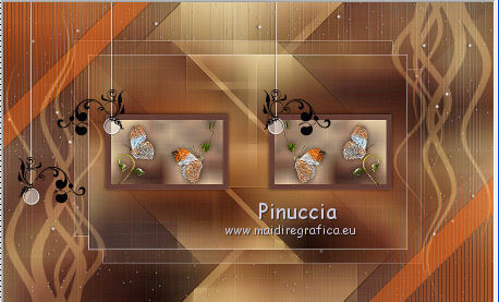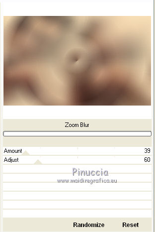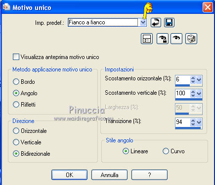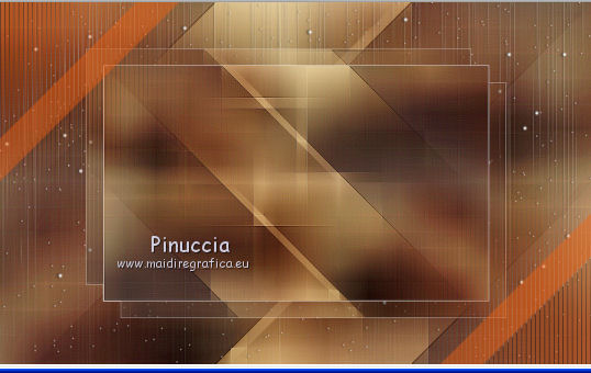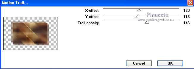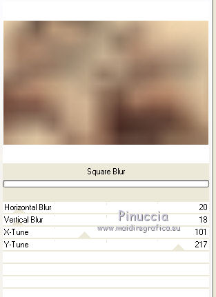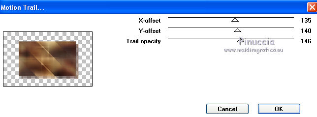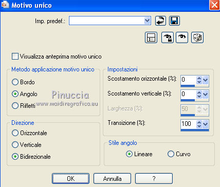 qui puoi trovare qualche risposta ai tuoi dubbi. Se l'argomento che ti interessa non è presente, ti prego di segnalarmelo. Questo tutorial è stato creato con PSP X2, ma può essere eseguito anche con le altre versioni di PSP. Per tradurlo, ho usato PSP X. Questo tutorial è una creazione di ©Exkizz Eskiss e non può essere copiato su altri siti nè essere offerto per il download. Lo stesso vale per la mia traduzione. Il materiale viene da vari gruppi di condivisione. Il copyright appartiene ai rispettivi autori. Grazie ai creatori dei tubes che mettono a disposizione il loro lavoro in vari gruppi di condivisione. Rispetta il lavoro degli autori, non cambiare il nome del file e non cancellare il watermark. Occorrente: Materiale qui Grazie a Radi che mi ha autorizzato a utilizzare il suo magnifico tube. Non condividere questo tube in altri gruppi di condivisione. Grazie Margit per i tubes delle farfalle. in caso di dubbi, ricorda di consultare la mia sezione filtri qui Vanderlee - Unplugged X qui VM Stylize qui Mehdi - Weaver qui Toadies - Motion Trail qui Richard Rosenman - Solid Border qui Graphics Plus - Horizontal Mirror qui Alien Skin Eye Candy 5 Impact - Perspective shadow qui Filters Unlimited 2.0 qui Andrew's Filter 8 - Tow the line qui I filtri Andrew's per essere usati devono prima essere convertiti. Come fare vedi qui Si usano importandoli in Filters Unlimited (come fare vedi qui) ma possono funzionare anche da soli Metti il preset Preset UserDefinedFilter Emboss nella cartella Impostazioni Predefinite. Metti i pennelli nella cartella Pennelli. Attenzione, ciascun pennello è composto da due files che non devono essere separati. (Vedi gli appunti sui Pennelli qui). Metti i preset Exkizz_Inès_Shadow1 e Exkizz_Inès_Shadow2 nella cartella del filtro Alien Skin Eye Candy 5 Impact>Settings>Shadow. Doppio clic sul file e il preset sarà automaticamente installato. Se preferisci puoi importarlo, quando ti servirà, dalla cartella in cui hai scompattato il materiale. Vedi la scheda del filtro qui e come importare un preset in Eye Candy qui Apri la maschera in PSP e minimizzala con il resto del materiale. Colori utilizzati Apri la paletta "Exkizz_Palette_ines" in PSP. Attiva lo strumento Contagocce ![]() Clicca con il tasto sinistro del mouse per impostare il colore di primo piano, e con il tasto destro per impostare il colore di sfondo. (Nota: Nel materiale trovi una paletta Template, nel caso volessi usare altri colori. Seleziona ogni casella con la bacchetta magica , modalità Sostituisci, corrispondenza Valore RGB, sfumatura e tolleranza0),e riempi la casella con i tuoi colori).Per questo tutorial sono stati usati tre colori scelti dal tube principale: il colore scuro #362f35, il colore chiaro #fde4bc, e il colore vivo #f36315. Se il tuo tube non è molto colorato, scegli due colori che si armonizzano con la tua immagine. Questa la mia paletta. ![]() ***** 1. Apri la paletta "Exkizz_Palette_ines". Attiva lo strumento Contagocce ,clicca con il tasto sinistro del mouse sul colore scuro #362f35 per impostarlo come colore di primo piano.Clicca con il tasto destro del mouse sul colore chiaro #fde4bc per impostarlo come colore di sfondo.![]() Passa il colore di primo piano a Gradiente, stile Radiale, con i seguenti settaggi. ![]() 2. Lo sfondo Apri una nuova immagine trasparente 900 x 550 pixels. ![]() Riempi l'immagine trasparente con il gradiente.Selezione>Seleziona tutto. Apri il tube "radi_senora_054" e vai a Modifica>Copia. non chiuderlo perchè ti servirà ancora Torna al tuo lavoro e vai a Modifica>Incolla nella selezione. Selezione>Deseleziona. ![]() Effetti>Effetti di immagine>Motivo unico. ![]() ![]() Regola>Sfocatura>Sfocatura gaussiana - raggio 30. ![]() Effetti>Plugins>Filters Unlimited 2.0 - VM Stylize - Zoom blur, con i settaggi standard. ![]() Effetti>Plugins>Filters Unlimited 2.0 - VM Stylize - Square Blur, con i settaggi standard. ![]() Poichè il mio colore è un po' spento, ho applicato una regolazione dei colori: Regola>Correzione fotografica intelligente. ![]() Se i colori non ti soddisfano, puoi provare altri settaggi. Effetti>Filtro definito dall'utente: apri il menu delle Impostazioni predefinite e seleziona Emboss 6. ![]() ricorda che in mancanza del preset, puoi impostare manualmente i settaggi che vedi nella schermata 3. Livelli>Nuovo livello raster - Raster 2. Attiva lo strumento Selezione (S),clicca sull'icona Selezione personalizzata ![]() e imposta i seguenti settaggi. ![]() Riempi la selezione con il colore chiaro di sfondo #fde4bc (tasto destro).Selezione>Deseleziona. Effetti>Effetti geometrici>Inclina. ![]() Effetti>Effetti di immagine>Scostamento. ![]() Effetti>Plugins>VanDerLee - Unplugged-X. Seleziona Vertical Tile e ok. ![]() Cambia la modalità di miscelatura di questo livello in Luce diffusa. ![]() Livelli>Duplica (copia di Raster 2). Effetti>Plugins>Mehdi - Weaver. ![]() Effetti>Effetti di bordo>Aumenta. Attiva il livello sottostante Raster 2. Effetti>Effetti di bordo>Erodi. Ecco il risultato e la paletta dei livelli. ![]() Livelli>Unisci>Unisci visibile. 4. Livelli>Duplica. Livelli>Nuovo livello raster - Raster 1. Imposta il colore di primo piano con il colore bianco #ffffff ![]() Riempi il livello con il colore bianco.Selezione>Seleziona tutto. Selezione>Modifica>Contrai - 1 pixel. Premi sulla tastiera il tasto CANC. Selezione>Deseleziona. Livelli>Unisci>Unisci giù. ![]() Immagine>Ridimensiona, al 65%, tutti i livelli non selezionato. ![]() Immagine>Rifletti. Regola>Messa a fuoco>Metti a fuoco. ![]() 5. Sei sempre posizionato sul livello "copia di Uniti". Effetti>Plugins>Toadies - Motion Trail. ![]() Di nuovo Effetti>Plugins>Toadies - Motion Trail con i seguenti settaggi. ![]() Risultato. ![]() 6. Chiudi il livello "copia di Uniti" e attiva il livello Uniti. ![]() Livelli>Nuovo livello raster - Raster 1. Riempi con il colore bianco #ffffff.Livelli>Nuovo livello maschera>Da immagine. Apri il menu sotto la finestra di origine e vedrai la list