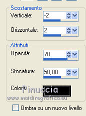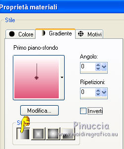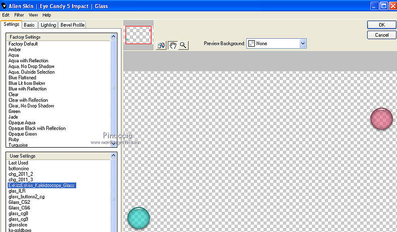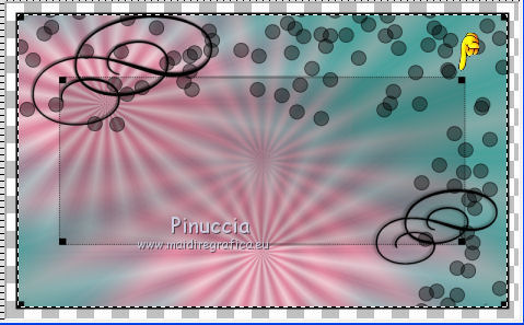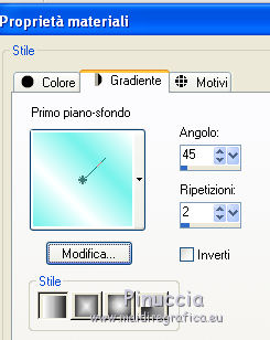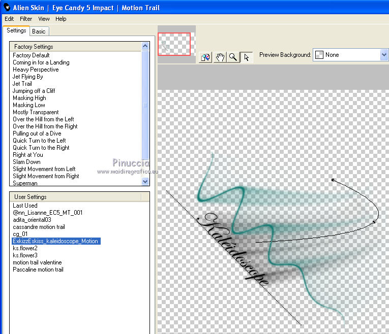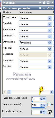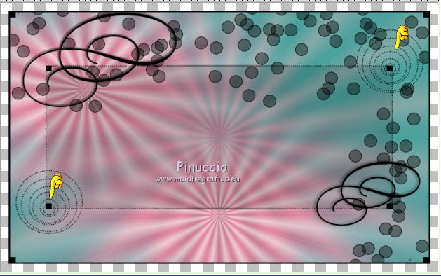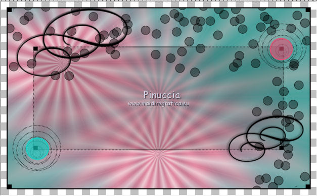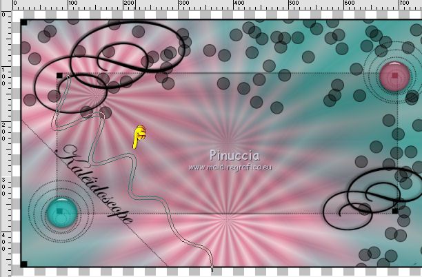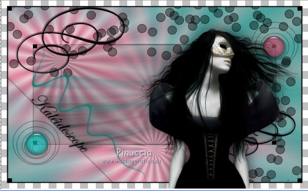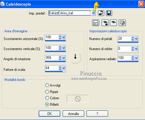 qui puoi trovare qualche risposta ai tuoi dubbi. Se l'argomento che ti interessa non è presente, ti prego di segnalarmelo. Questo tutorial è stato creato con PSP X2, ma può essere eseguito anche con le altre versioni di PSP, con qualche piccolo aggiustamento. Per tradurlo, ho usato PSP X. Questo tutorial è una creazione di ©Exkizz Eskiss e non può essere copiato su altri siti nè essere offerto per il download. Lo stesso vale per la mia traduzione. Il materiale viene da vari gruppi di condivisione. Il copyright appartiene ai rispettivi autori. Grazie ai creatori dei tubes che mettono a disposizione il loro lavoro in vari gruppi di condivisione. Rispetta il lavoro degli autori, non cambiare il nome del file e non cancellare il watermark. Occorrente: Materiale qui Scompattato il materiale, avrai 4 cartelle: avrai la paletta dei colori Exkizz_Palette_kaleidoscope e sette cartelle: Masques che contiene la maschera ExkizzEskiss_Kaleidoscope; Pinceau che contiene 3 pennelli, ognuno composto due files che non devono essere separati (vedi gli appunti sui Pennelli qui Presets Filtres et psp, che contiene i preset ExkizzEskiss_Kaleidoscope_Glass; ExkizzEskiss_kaleidoscope_Motion e Preset_Kaleidoscope Exkizz_Eskiss_kal.PspScript. Tubes che contiene il tube jet-fantasywoman-september-2007.pspimage (Grazie Jet per questo bel tube); il wordart ExkizzEskiss_Kaleidoscope_Text e la paletta dei colori ExkizzEskiss_Palette_Kaleidscope. Filtri: in caso di dubbi, ricorda di consultare la mia sezione filtri qui Alien Skin Eye Candy 5 Impact - Perspective Shadow, Glass, Motion Trail qui ![]() Metti i preset ExkizzEskiss_kaleidoscope_Glass.f1s e ExkizzEskiss_Kaleidoscope_Motion.f1s nella cartella del filtro: Alien Skin Eye Candy 5 Impact>Settings>Glass e Alien Skin Eye Candy 5 Impact>Setting>Motion. Se preferisci puoi importarli, quando ti serviranno, dalla cartella in cui hai scompattato il materiale. Vedi la scheda del filtro qui e come importare un preset in Eye Candy qui Metti il preset Kaleidoscope_ExkizzEskiss_kal.PspScript nella cartella Impostazioni predefinite. Metti la maschera nella cartella Maschere. ti servirà anche la maschera 20-20; se non ce l'hai, prendila qui Metti i pennelli nella cartella Pennelli. Apri il resto del materiale in PSP. Colori utilizzati Apri la paletta "Exkiss_Palette_kaleidoscope" in PSP. ![]() Attiva lo strumento Contagocce ![]() Clicca con il tasto sinistro del mouse per impostare il colore di primo piano, e con il tasto destro per impostare il colore di sfondo. 1. Imposta il colore di primo piano con #e15579, e il colore di sfondo con il colore bianco #ffffff. Passa il colore di primo piano a Gradiente Lineare, con i seguenti settaggi. ![]() Apri una nuova immagine trasparente 750 x 450 pixels, e riempila con il gradiente.Effetti>Effetti di riflesso>Caleidoscopio. Apri il menu delle impostazioni predefinite e seleziona il preset "ExkizzEskiss_kal. ![]() Livelli>Carica/Salva maschera>Carica maschera da disco. Cerca e carica la maschera 20-20, con i seguenti settaggi: ![]() Livelli>Unisci>Unisci gruppo. 2. Livelli>Duplica. Sul primo livello: Effetti>Effetti di immagine>Scostamento. ![]() Sul secondo livello: Effetti>Effetti di immagine>Scostamento. ![]() 3. Livelli>Nuovo livello raster. Imposta il colore di primo piano con il colore chiaro #14d2c5, automaticamente il gradiente cambierà colore. ![]() Mantieni il colore di sfondo con il colore bianco e il gradiente con i settaggi precedenti. ![]() Riempi il nuovo livello con il gradiente.Effetti>Effetti di riflesso>Caleidoscopio, con i settaggi precedenti. ![]() Cambia la modalità di miscelatura di questo livello in Luce diffusa. Livelli>Unisci>Unisci visibile. 4. Immagine>Dimensioni tela, e clicca sulla freccia al centro per distribuire equamente lo spazio. ![]() 5. Livelli>Nuovo livello raster. Imposta il colore di primo piano con il colore nero #000000. Riempi il livello con il colore nero.Livelli>Carica/Salva maschera>Carica maschera da disco. Cerca e carica la maschera ExkizzEskiss_Mask_Kaleidoscope. ![]() Livelli>Unisci>Unisci gruppo. 6. Livelli>Nuovo livello raster. Selezione>Seleziona tutto. Selezione>Modifica>Contrai - 17 pixels. Attiva lo strumento Pennello ![]() Cerca e seleziona il pennello ExkizzEskiss_Kaleidoscope 1, e imposta la dimensione a 25. Visualizza>Tavolozze>Variazione pennello (o clicca sulla tastiera F11). Regola il tasso dissolvenza a 2; jitter posizione a 900; impronte per passo a 1. ![]() Applica il pennello facendo scorrere il mouse dal lato sinistro verso il lato destro, seguendo la linea orizzontale della cornice, poi scendi verticalmente sempre lungo la cornice. Se necessario cancella con la Gomma i cerchi che coprono il piccolo quadro della cornice.![]() Selezione>Deseleziona. Chiudi la finestra Variazioni del pennello. 7. Livelli>Nuovo livello raster. Il colore di primo piano è sempre impostato sul nero. Attiva nuovamente lo strumento Pennello ![]() e seleziona il pennello ExkizzEskiss_Kaleidoscope2. Applica il pennello sul rettangolo interno della cornice: nell'angolo inferiore sinistro e nell'angolo superiore destro. ![]() Effetti>Effetti 3D>Sfalsa ombra, con il colore bianco. ![]() 8. Livelli>Nuovo livello raster. Imposta il colore di primo piano con #e15579, e il colore di sfondo con #14d2c5 (per comodità, puoi usare la paletta dei colori fornita). Seleziona il pennello ExkizzEskiss_Kaleidoscope1, regola la dimensione a 60, e applica il pennello sugli stessi piccoli quadretti neri: applica il pennello nell'angolo superiore destro del rettangolo interno, cliccando due volte con il tasto sinistro del mouse per usare il colore rosso di primo piano; applica il pennello nell'angolo inferiore sinistro, cliccando due volte con il tasto destro del mouse per usare il colore verde di sfondo. ![]() Effetti>Plugins>Alien Skin Eye Candy 5 Impact - Glass, seleziona il preset ExkizzEskiss_Kaleidoscope_Glass e ok. ![]() 9. Apri il tube ExkizzEskiss_Kaleidoscope_Text e vai a Modifica>Copia. Torn