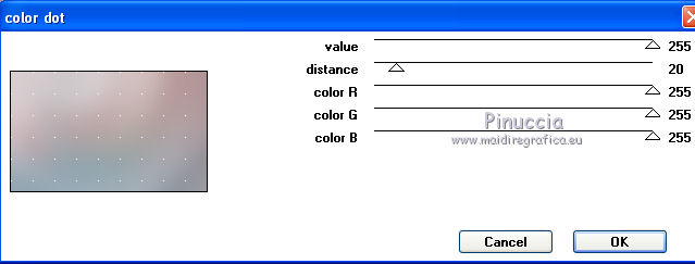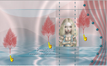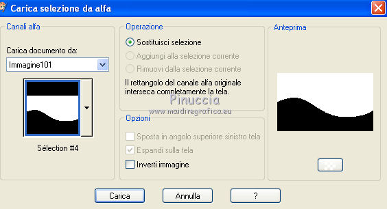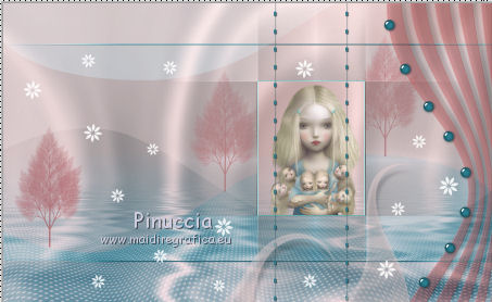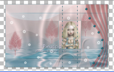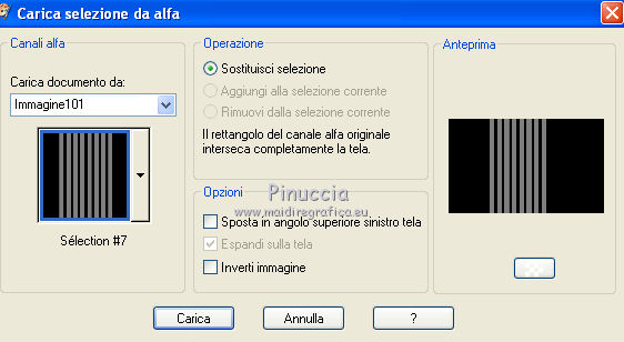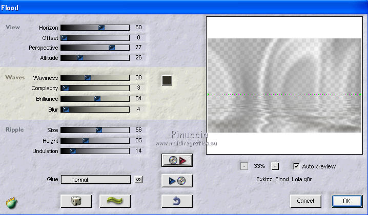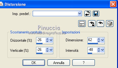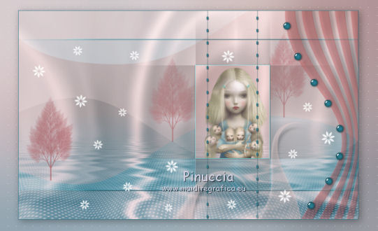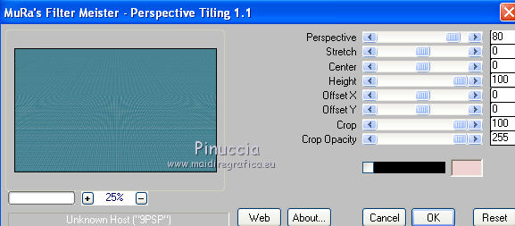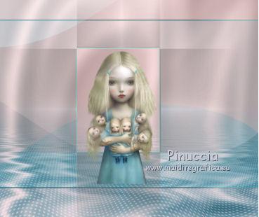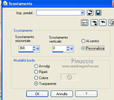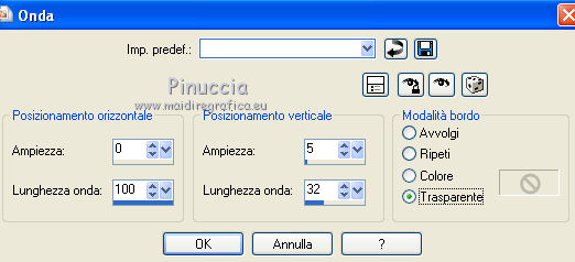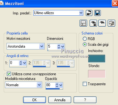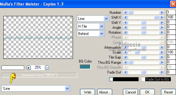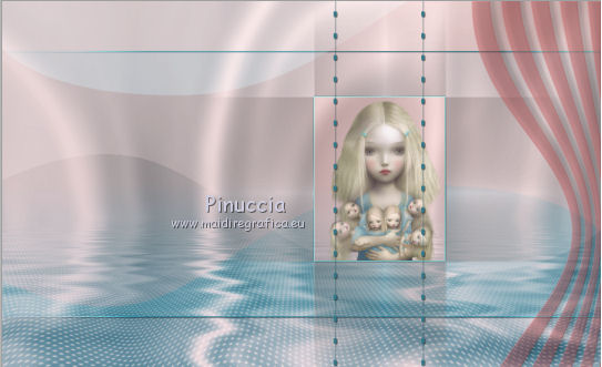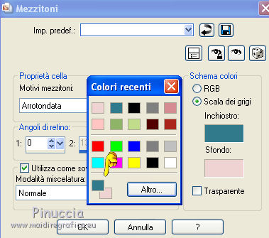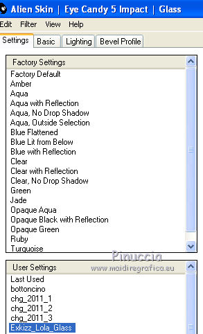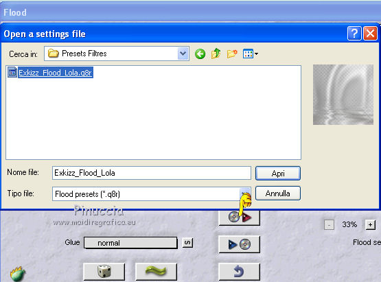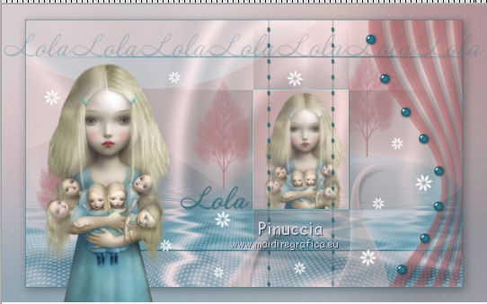 qui puoi trovare qualche risposta ai tuoi dubbi. Se l'argomento che ti interessa non è presente, ti prego di segnalarmelo. Questo tutorial è stato creato con PSP X2, ma può essere eseguito anche con le altre versioni di PSP. Per tradurlo, ho usato PSP X. Questo tutorial è una creazione di ©Exkizz Eskiss e non può essere copiato su altri siti nè essere offerto per il download. Lo stesso vale per la mia traduzione. Il materiale viene da vari gruppi di condivisione. Il copyright appartiene ai rispettivi autori. Grazie ai creatori dei tubes che mettono a disposizione il loro lavoro in vari gruppi di condivisione. Rispetta il lavoro degli autori, non cambiare il nome del file e non cancellare il watermark. Occorrente: Materiale qui Scompattato il materiale, troverai il font AnnabelleJFLessItalic e queste 4 cartelle: Masque che contiene la maschera "A gradienteworisch". in caso di dubbi, ricorda di consultare la mia sezione filtri qui Flaming Pear - Flood qui Mehdi - Weaver qui Alien Skin Eye Candy 5 Impact - Glass qui Mura's Meister - Perspective Tiling qui Mura's Meister - Copies qui Penta.com - Color dot qui Mura's Seamless - Emboss at Alpha qui Apri il font e minimizzalo. Lo troverai nella lista dei font disponibili quando ti servirà. Metti la maschera "A gradienteworisch" nella cartella Maschere. Metti i pennelli Exkizz_lola1, Exkizz_lola2 e Exkizz_lola3 nella cartella Pennelli. Ogni pennello è composto da due files che non devono essere separati. (Vedi gli appunti sui Pennelli qui). Metti il preset Exkizz_Lola_glass nella cartella del filtro Alien Skin Eye Candy 5 Impact>Settings>Glass (doppio clic sul file e il filtro sarà automaticamente installato). Se preferisci puoi importarlo, quando ti servirà, dalla cartella in cui hai scompattato il materiale. Vedi la scheda del filtro qui e come importare un preset in Eye Candy qui Metti il preset Exkizz_Flood.Lola nella cartella del filtro Flood, oppure puoi importarlo direttamente dalla cartella in cui hai scompattato il materiale quando ti servirà. Colori utilizzati Apri la paletta "Exkizz_Palette_lola" in PSP. Attiva lo strumento Contagocce ![]() Clicca con il tasto sinistro del mouse per impostare il colore di primo piano, e con il tasto destro per impostare il colore di sfondo. (Nota: Nel materiale trovi una paletta Template, nel caso volessi usare altri colori. Seleziona ogni casella con la bacchetta magica , modalità Sostituisci, corrispondenza Valore RGB, sfumatura e tolleranza0),e riempi la casella con i tuoi colori).Per questo tutorial sono stati usati tre colori scelti dal tube principale: 2 colori scuri: #317a8b e #ba4f50,e il colore chiaro #eed3d2.Se il tuo tube non ha tre colori, scegli dei colori che si armonizzano con il tuo tube. Scegli due colori scuri molto contrastanti. Questa la mia paletta. ![]() ***** 1. Apri la paletta "Exkizz_Palette_Lola". Attiva lo strumento Contagocce ,clicca con il tasto sinistro del mouse sul colore scuro #317a8b per impostarlo come colore di primo piano.Clicca con il tasto destro del mouse sul colore chiaro #eed3d2 per impostarlo come colore di sfondo.Questa dovrebbe essere la tua paletta dei Materiali. ![]() 2. Lo sfondo Apri "Exkizz_Lola_Canal Alpha". Questa immagine non è vuota, ma contiene le selezioni salvate sul canale alfa. Finestra>Duplica (o maiuscola+D) e chiudi l'originale. La copia sarà la base del tuo lavoro. Premi sulla tastiera il tasto CANC per eliminare il watermak. Riempi l'immagine trasparente con il colore chiaro di sfondo #eed3d2 (tasto destro del mouse).Apri "Exkizz_Lola_Template" e vai a Modifica>Copia. Torna al tuo lavoro e vai a Modifica>Incolla come nuovo livello. Cambia la modalità di miscelatura di questo livello in Luminanza (esistente). Effetti>Plugins>Flaming Pear - Flood. Clicca sull'icona con la freccia rossa per cercare il preset Exkizz_Flood. ![]() Ricorda che i preset sono settaggi memorizzati per doverli impostare in un utilizzo futuro. Se hai problemi con i preset, potrai impostare manualmente i settaggi come mostrati nella schermata. ![]() Risultato. ![]() Livelli>Nuovo livello raster - Raster 3. Riempi il livello con il colore scuro di primo piano #317a8b ![]() Effetti>Effetti artistici>Mezzitoni con i colori di primo piano (#317a8b) e sfondo (#eed3d2). Clicca sulla paletta del colore con il tasto destro del mouse, e avrai la tabella dei colori recenti; in basso a sinistra, trovi i tuoi colori di primo piano e sfondo; clicca sul colore corrispondente per impostarlo. ![]() Effetti>Plugins>Mura's Meister - Perspective Tiling, con i settaggi standard. ![]() Modifica>Ripeti Perspective Tiling. Effetti>Effetti di distorsione>Onda. ![]() Livelli>Carica/Salva maschera>Carica maschera da disco. Cerca e carica la maschera "A gradienteworisch", con i seguenti settaggi. ![]() Prima di unire il gruppo: Regola>Messa a fuoco>Metti a fuoco. Livelli>Unisci>Unisci gruppo. Effetti>Effetti di immagine>Scostamento. ![]() Cambia la modalità di miscelatura di questo livello in Sovrapponi. Attiva lo strumento Puntatore (sulla tastiera tasto K)se stai usando PSP 9 strumento Deformazione (sulla tastiera tasto D, valido per tutte le versioni),e tira leggermente l'immagine a destra e a sinistra. ![]() Per liberarti della griglia dello strumento: clicca sulla manina o su un altro strumento come, per esempio, lo strumento Spostamento ![]() Livelli>Unisci>Unisci visibile. Risultato. ![]() 3. Quadro grande In questo passaggio, se stai usando altri colori, non esitare a modificare le modalità di miscelatura e le opacità che più si adattano ai tuoi colori. Livelli>Nuovo livello raster - Raster 1. Selezione>Carica/Salva selezione>Carica selezione da canale alfa. La selezione Selection#1 è già presente. Devi soltanto cliccare Carica. ![]() Per visualizzare meglio il ristretto spazio della selezione, ![]() non esitare a ingrandire molto l'immagine attivando lo strumento Zoom o usando la rotellina del mouse.Imposta lo strumento Riempimento in modalità di corrispondenza "
