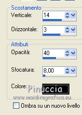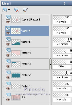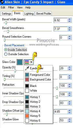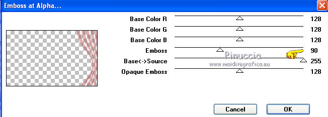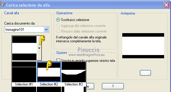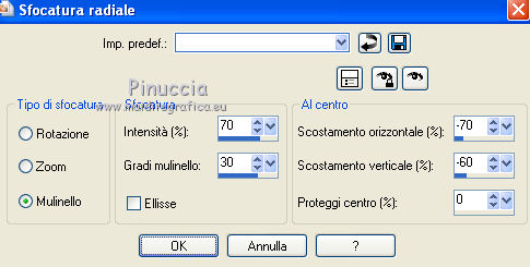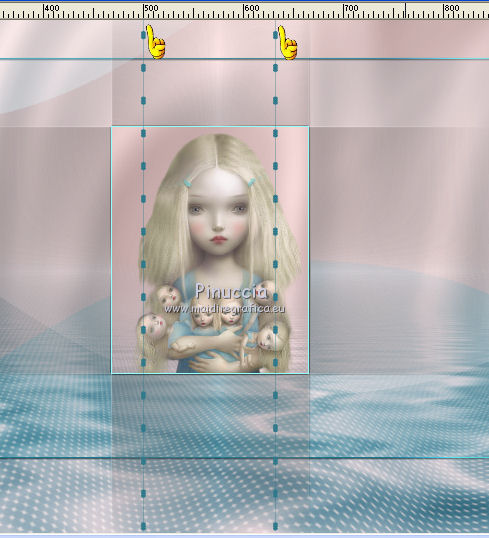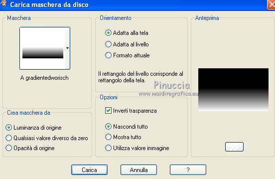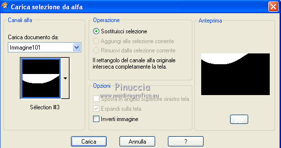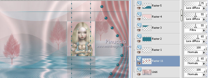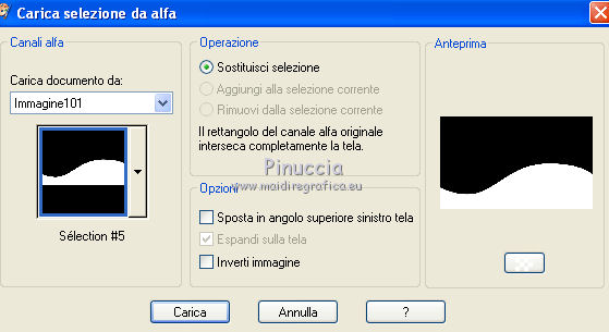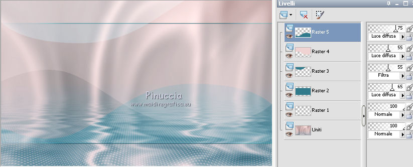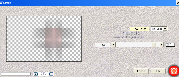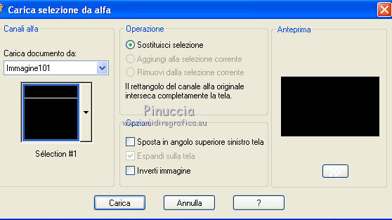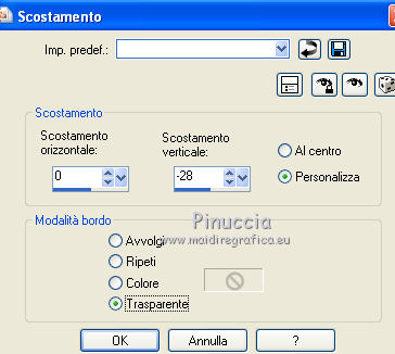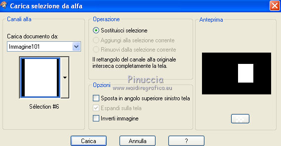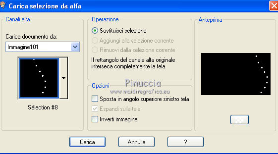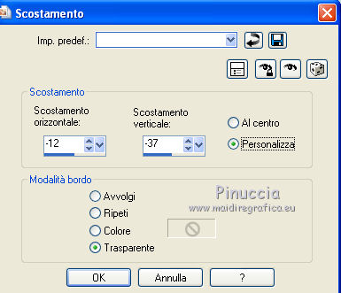 qui puoi trovare qualche risposta ai tuoi dubbi. Se l'argomento che ti interessa non è presente, ti prego di segnalarmelo. Questo tutorial è stato creato con PSP X2, ma può essere eseguito anche con le altre versioni di PSP. Per tradurlo, ho usato PSP X. Questo tutorial è una creazione di ©Exkizz Eskiss e non può essere copiato su altri siti nè essere offerto per il download. Lo stesso vale per la mia traduzione. Il materiale viene da vari gruppi di condivisione. Il copyright appartiene ai rispettivi autori. Grazie ai creatori dei tubes che mettono a disposizione il loro lavoro in vari gruppi di condivisione. Rispetta il lavoro degli autori, non cambiare il nome del file e non cancellare il watermark. Occorrente: Materiale qui Scompattato il materiale, troverai il font AnnabelleJFLessItalic e queste 4 cartelle: Masque che contiene la maschera "A gradienteworisch". in caso di dubbi, ricorda di consultare la mia sezione filtri qui Flaming Pear - Flood qui Mehdi - Weaver qui Alien Skin Eye Candy 5 Impact - Glass qui Mura's Meister - Perspective Tiling qui Mura's Meister - Copies qui Penta.com - Color dot qui Mura's Seamless - Emboss at Alpha qui Apri il font e minimizzalo. Lo troverai nella lista dei font disponibili quando ti servirà. Metti la maschera "A gradienteworisch" nella cartella Maschere. Metti i pennelli Exkizz_lola1, Exkizz_lola2 e Exkizz_lola3 nella cartella Pennelli. Ogni pennello è composto da due files che non devono essere separati. (Vedi gli appunti sui Pennelli qui). Metti il preset Exkizz_Lola_glass nella cartella del filtro Alien Skin Eye Candy 5 Impact>Settings>Glass (doppio clic sul file e il filtro sarà automaticamente installato). Se preferisci puoi importarlo, quando ti servirà, dalla cartella in cui hai scompattato il materiale. Vedi la scheda del filtro qui e come importare un preset in Eye Candy qui Metti il preset Exkizz_Flood.Lola nella cartella del filtro Flood, oppure puoi importarlo direttamente dalla cartella in cui hai scompattato il materiale quando ti servirà. Colori utilizzati Apri la paletta "Exkizz_Palette_lola" in PSP. Attiva lo strumento Contagocce ![]() Clicca con il tasto sinistro del mouse per impostare il colore di primo piano, e con il tasto destro per impostare il colore di sfondo. (Nota: Nel materiale trovi una paletta Template, nel caso volessi usare altri colori. Seleziona ogni casella con la bacchetta magica , modalità Sostituisci, corrispondenza Valore RGB, sfumatura e tolleranza0),e riempi la casella con i tuoi colori).Per questo tutorial sono stati usati tre colori scelti dal tube principale: 2 colori scuri: #317a8b e #ba4f50,e il colore chiaro #eed3d2.Se il tuo tube non ha tre colori, scegli dei colori che si armonizzano con il tuo tube. Scegli due colori scuri molto contrastanti. Questa la mia paletta. ![]() ***** 1. Apri la paletta "Exkizz_Palette_Lola". Attiva lo strumento Contagocce ,clicca con il tasto sinistro del mouse sul colore scuro #317a8b per impostarlo come colore di primo piano.Clicca con il tasto destro del mouse sul colore chiaro #eed3d2 per impostarlo come colore di sfondo.Questa dovrebbe essere la tua paletta dei Materiali. ![]() 2. Lo sfondo Apri "Exkizz_Lola_Canal Alpha". Questa immagine non è vuota, ma contiene le selezioni salvate sul canale alfa. Finestra>Duplica (o maiuscola+D) e chiudi l'originale. La copia sarà la base del tuo lavoro. Premi sulla tastiera il tasto CANC per eliminare il watermak. Riempi l'immagine trasparente con il colore chiaro di sfondo #eed3d2 (tasto destro del mouse).Apri "Exkizz_Lola_Template" e vai a Modifica>Copia. Torna al tuo lavoro e vai a Modifica>Incolla come nuovo livello. Cambia la modalità di miscelatura di questo livello in Luminanza (esistente). Effetti>Plugins>Flaming Pear - Flood. Clicca sull'icona con la freccia rossa per cercare il preset Exkizz_Flood. ![]() Ricorda che i preset sono settaggi memorizzati per doverli impostare in un utilizzo futuro. Se hai problemi con i preset, potrai impostare manualmente i settaggi come mostrati nella schermata. ![]() Risultato. ![]() Livelli>Nuovo livello raster - Raster 3. Riempi il livello con il colore scuro di primo piano #317a8b ![]() Effetti>Effetti artistici>Mezzitoni con i colori di primo piano (#317a8b) e sfondo (#eed3d2). Clicca sulla paletta del colore con il tasto destro del mouse, e avrai la tabella dei colori recenti; in basso a sinistra, trovi i tuoi colori di primo piano e sfondo; clicca sul colore corrispondente per impostarlo. ![]() Effetti>Plugins>Mura's Meister - Perspective Tiling, con i settaggi standard. ![]() Modifica>Ripeti Perspective Tiling. Effetti>Effetti di distorsione>Onda. ![]() Livelli>Carica/Salva maschera>Carica maschera da disco. Cerca e carica la maschera "A gradienteworisch", con i seguenti settaggi. ![]() Prima di unire il gruppo: Regola>Messa a fuoco>Metti a fuoco. Livelli>Unisci>Unisci gruppo. Effetti>Effetti di immagine>Scostamento. ![]() Cambia la modalità di miscelatura di questo livello in Sovrapponi. Attiva lo strumento Puntatore (sulla tastiera tasto K)se stai usando PSP 9 strumento Deformazione (sulla tastiera tasto D, valido per tutte le versioni),e tira leggermente l'immagine a destra e a sinistra. ![]() Per liberarti della griglia dello strumento: clicca sulla manina o su un altro strumento come, per esempio, lo strumento Spostamento ![]() Livelli>Unisci>Unisci visibile. Risultato. ![]() 3. Quadro grande In questo passaggio, se stai usando altri colori, non esitare a modificare le modalità di miscelatura e le opacità che più si adattano ai tuoi colori. Livelli>Nuovo livello raster - Raster 1. Selezione>Carica/Salva selezione>Carica selezione da canale alfa. La selezione Selection#1 è già presente. Devi soltanto cliccare Carica. ![]() Per visualizzare meglio il ristretto spazio della selezione, ![]() non esitare a ingrandire molto l'immagine attivando lo strumento Zoom o usando la rotellina del mouse.Imposta lo strumento Riempimento in modalità di corrispondenza "
