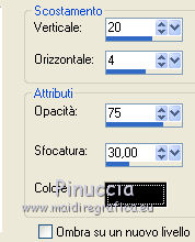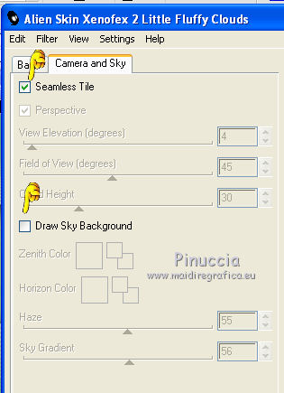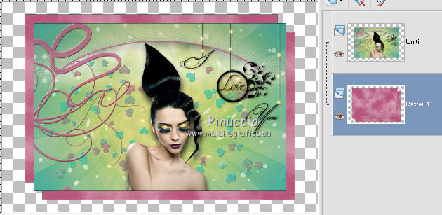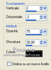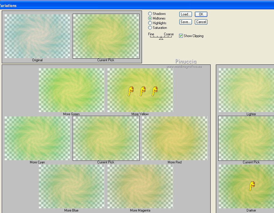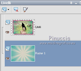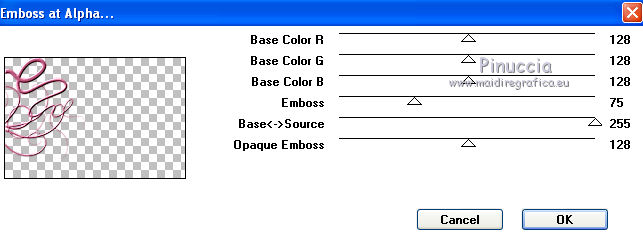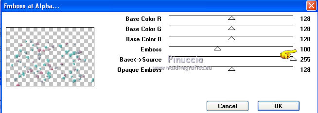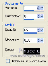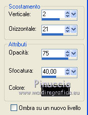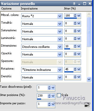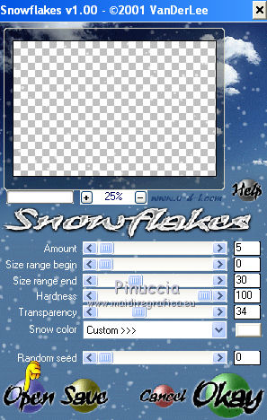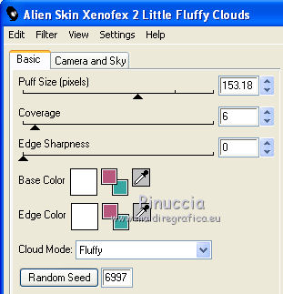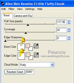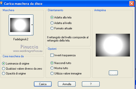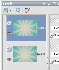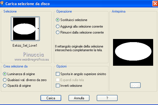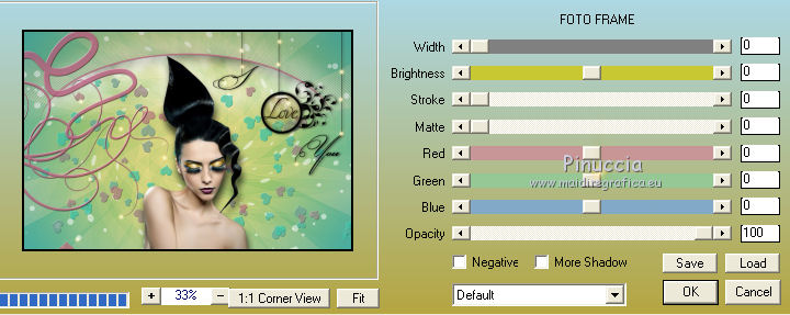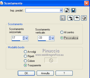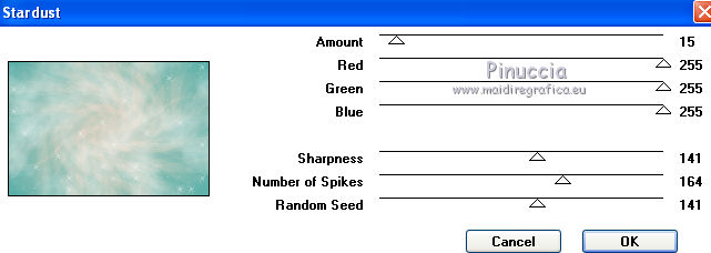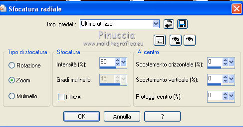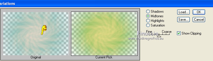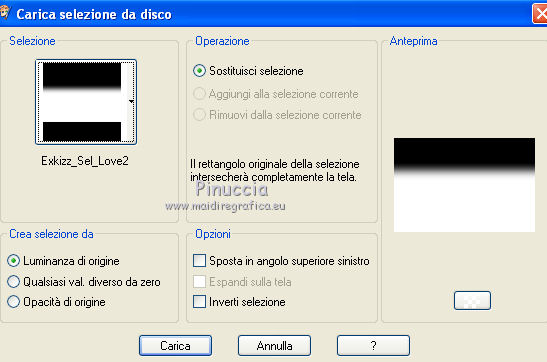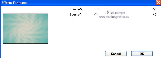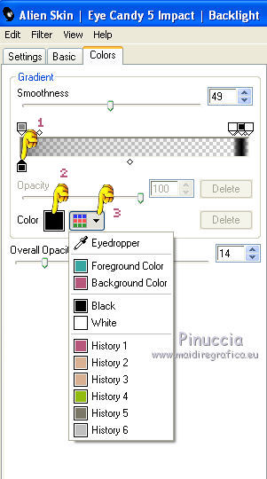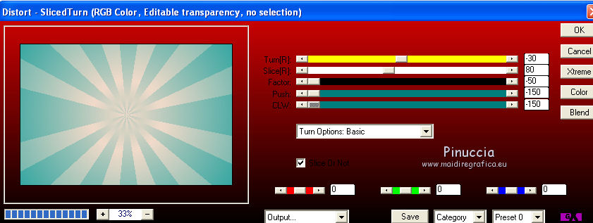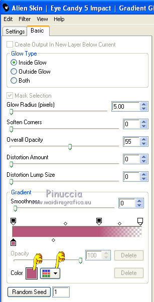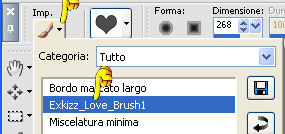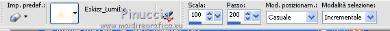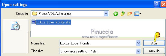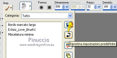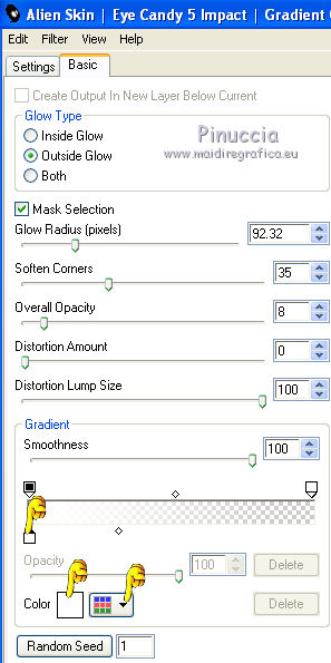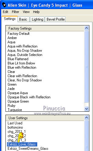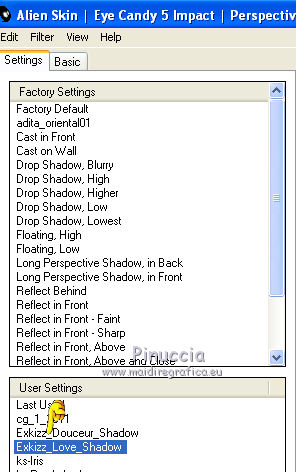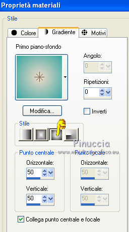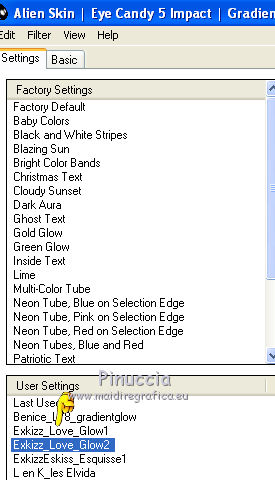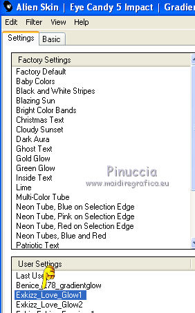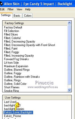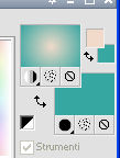 qui puoi trovare qualche risposta ai tuoi dubbi. Se l'argomento che ti interessa non è presente, ti prego di segnalarmelo. Questo tutorial è stato creato con PSP X2, ma può essere eseguito anche con le altre versioni di PSP. Per tradurlo, ho usato PSP X. Questo tutorial è una creazione di ©Exkizz Eskiss e non può essere copiato su altri siti nè essere offerto per il download. Lo stesso vale per la mia traduzione. Il materiale viene da vari gruppi di condivisione. Il copyright appartiene ai rispettivi autori. Grazie ai creatori dei tubes che mettono a disposizione il loro lavoro in vari gruppi di condivisione. Rispetta il lavoro degli autori, non cambiare il nome del file e non cancellare il watermark. Occorrente: Materiale qui Scompattato il materiale, troverai 7 cartelle: Masque che contiene la maschera Fadebgmsk2. in caso di dubbi, ricorda di consultare la mia sezione filtri qui AP 01 [Innovations] - Distort - SlicedTurn qui Italian Editors Effects - Effetto Fantasma qui Alien Skin Eye Candy 5 Impact qui Mura's Seamles - Emboss at Alpha qui VM Natural - Stardust qui Alien Skin Xenofex 2.0 - Little Fluffy Clouds qui VDL Adrenaline - Snowflakes qui AAA Frames - Foto Frame qui Adjust - Variations qui Metti le selezioni nella cartella Selezioni. Metti i pennelli della cartella "Pinceaux" nella cartella Pennelli. Ricorda che i due files di ogni pennelli non vanno separati. se preferisci, per non appesantire le cartelle di PSP, puoi inserire nei Percorsi Files le rispettive cartelle del materiale. In questo modo, avrai ti sarà più facile selezionare il materiale quando ti servirà e, una volta terminato il tutorial, potrai rimuovere le cartelle dai Percorsi Metti la maschera Fadebgmsk2 nella cartella Maschere. Metti l'ornamento nella cartella Ornamenti. Metti il preset Preset_PaintBrush_Exkizz_Love nella cartella Impostazioni predefinite. Metti il preset della cartella "Presets Filtres Alien Skin" nelle rispettive cartelle del filtro: Alien Skin Eye Candy 5 Impact>Settings... (Backlight, Glass, Gradient Glow, Shadow). Se preferisci puoi importarlo, quando ti servirà, dalla cartella in cui hai scompattato il materiale. Vedi la scheda del filtro qui e come importare un preset in Eye Candy qui Metti il preset "Exkizz_love_Tekstya.tek, in una cartella a scelta. Lo importerai da questa cartella quando ti servirà. Metti il preset VDL (Vanderlee) Adrenaline>Snoflakes nella cartella del filtro. Anche in questo caso, puoi importare il preset quando ti servirà dalla cartella in cui hai scompattato il materiale. Colori utilizzati Apri la paletta "Exkizz_Palette_love" in PSP. ![]() Attiva lo strumento Contagocce ![]() Clicca con il tasto sinistro del mouse per impostare il colore di primo piano, e con il tasto destro per impostare il colore di sfondo. (Nota: Nel materiale trovi una paletta Template, nel caso volessi usare altri colori. Seleziona ogni casella con la bacchetta magica , modalità Sostituisci, corrispondenza Valore RGB, sfumatura e tolleranza0),e riempi la casella con i tuoi colori).Per questo tutorial sono stati usati: 1 colore chiaro é ![]() 2 colori di tonalità medio scura: e .Per scegliere altri colori in armonia con i tuoi tubes, scegli due colore molto contrastanti. Ecco la mia paletta. ![]() 1. Imposta il colore di primo piano con #f1dac9 ![]() e il colore di sfondo con #39a7a2 ![]() Passa il colore di primo piano a Gradiente Sprazzo di luce, con i seguenti settaggi. ![]() 1. Apri una nuova immagine trasparente 900 x 600 pixels. ![]() Riempi l'immagine trasparente con il gradiente.Effetti>Plugins>AP Innovations - Distort, SlicedTurn. ![]() Per ammorbidire le linee: Regola>Sfocatura>Sfocatura radiale. ![]() Finestra>Duplica (o sulla tastiera maiuscola+D) per duplicare l'immagine. Minimizza la copia che userai più tardi e continua a lavorare sull'originale. Livelli>Duplica. ![]() Rimani sul secondo livello Copia di Raster 1. Effetti>Effetti di distorsione>Mulinello. ![]() Effetti>Plugins>Italian Editors Effects - Effetto Fantasma. ![]() Livelli>Carica/Salva maschera>Carica maschera da disco. Cerca e carica la maschera Fadebgmsk2. ![]() Livelli>Unisci>Unisci gruppo. Effetti>Plugins>Adjust - Variations. Clicca tre volte su More Yellow, e 1 volta su Darker. (Puoi provare a scegliere altri colori che si armonizzano con quelli del tuo sfondo). ![]() Se il risultato non ti soddisfa e vuoi applicare nuovamente il filtro, prima di cambiare i settaggi, ricorda che devi cliccare su Original per annullare i settaggi precedenti. ![]() Nota. Se hai problemi con questo filtro, puoi usare il Viraggio (Regola>Tonalità e saturazione>Viraggio), e scegliere la tonalità che ti soddsfa. Livelli>Unisci>Unisci giù. Effetti>Effetti di bordo>Aumenta di più. 2. Livelli>Nuovo livello raster. Effetti>Plugins>VDL Adrenaline - Snowflakes. Se nei tuoi Percorsi hai la nuova versione del filtro: Effetti>Plugins>VanDerLee - Snowflakes. Clicca su Open e cerca il preset "Exkizz Love Ronds" nella cartella dove lo hai salvato. Se vuoi modificare il colore dei piccoli cerchi, clicca sulla palettina del colore accanto a "Snow color" ![]() ![]() Effetti>Effetti di distorsione>Mulinello, con i settaggi precedenti. ![]() Abbassa l'opacità di questo livello all'80%. Livelli>Nuovo livello raster. Selezione>Carica/Salva selezione>Carica selezione da disco. Cerca e carica la selezione Exkizz_Sel_Love1. ![]() Effetti>Effetti 3D>Ritaglio, colore dell'ombra nero #000000. ![]() Mantieni selezionato. Effetti>Plugins>Alien Skin Eye Candy 5 Impact - Backlight. Seleziona il prest Exkizz_Love_Backlight e ok. ![]() Dovresti avere questo. ![]() Se vuoi modificare il colore: dopo aver selezionato il preset, sotto "Colors" clicca sulla piccola icona del colore (1) per attivare l'uso del colore, poi puoi scegliere se impostare manualmente il colore cliccando sulla palettina (2), o scegliere dal menu (3), dove trovi sempre i colori di primo piano (foreground) e sfondo (background), il bianco e il nero e gli ultimi colori utili