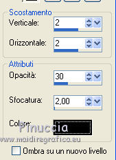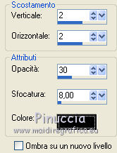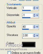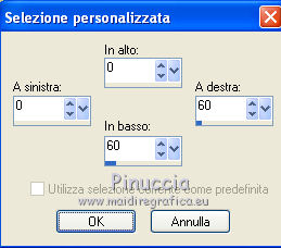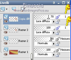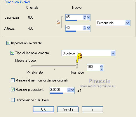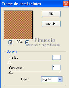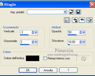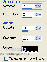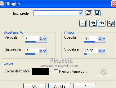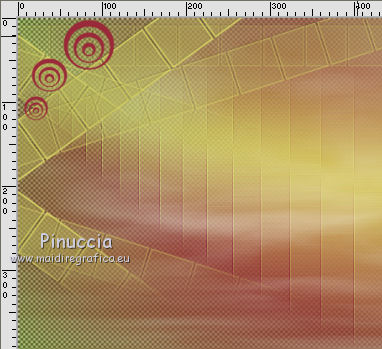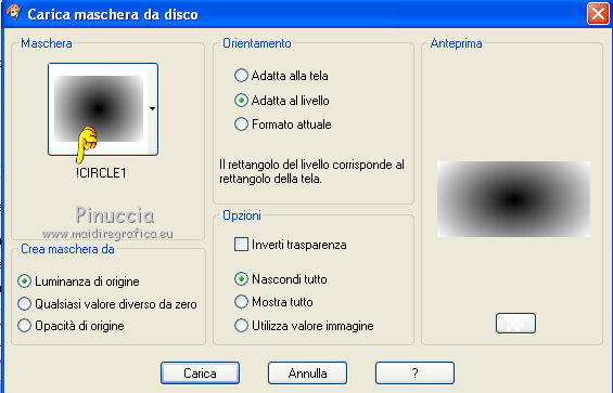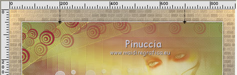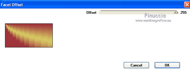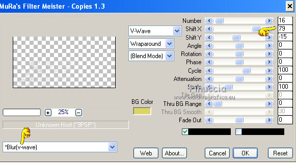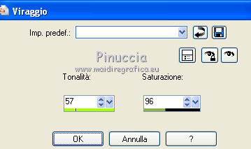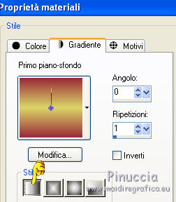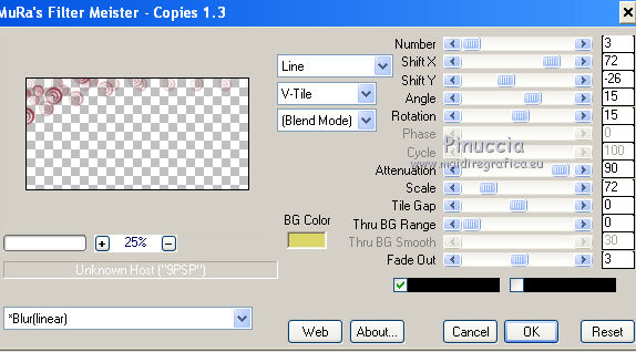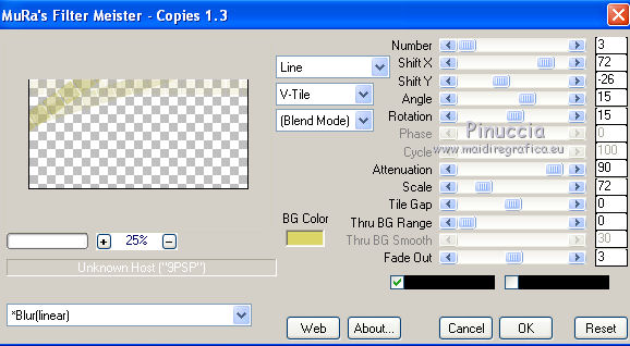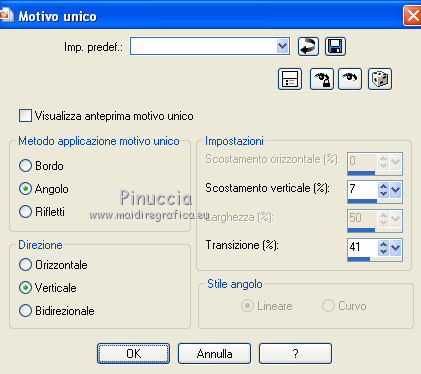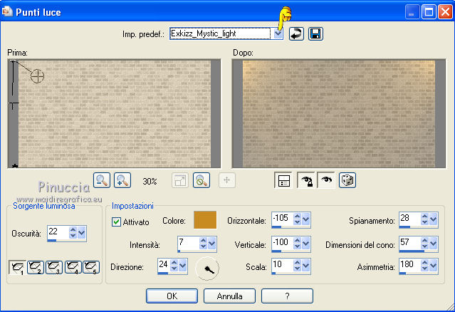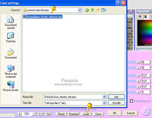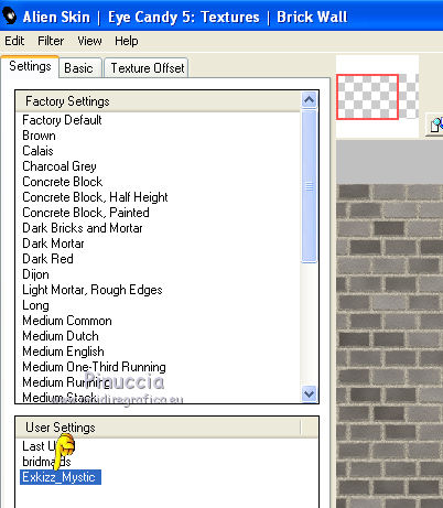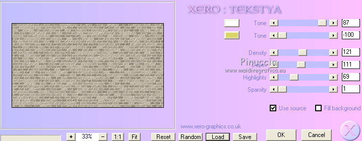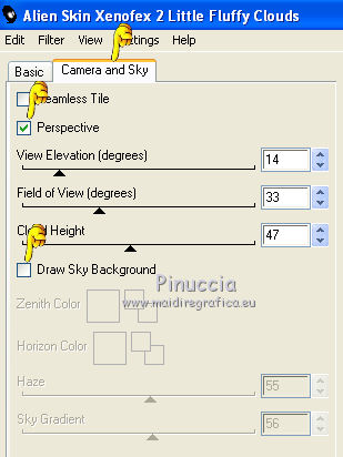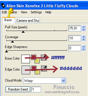 qui puoi trovare qualche risposta ai tuoi dubbi. Se l'argomento che ti interessa non è presente, ti prego di segnalarmelo. Questo tutorial è stato creato con PSP X2, ma può essere eseguito anche con le altre versioni di PSP. Per tradurlo, ho usato PSP X. Questo tutorial è una creazione di ©Exkizz Eskiss e non può essere copiato su altri siti nè essere offerto per il download. Lo stesso vale per la mia traduzione. Il materiale viene da vari gruppi di condivisione. Il copyright appartiene ai rispettivi autori. Grazie ai creatori dei tubes che mettono a disposizione il loro lavoro in vari gruppi di condivisione. Rispetta il lavoro degli autori, non cambiare il nome del file e non cancellare il watermark. Occorrente: Materiale qui Scompattato il materiale, avrai la paletta dei colori Exkizz_Palette_Mystic, e 5 cartelle: Masques che contiene la maschera ¡CIRCLE1. in caso di dubbi, ricorda di consultare la mia sezione filtri qui Esquisse - Trame de demi-teintes qui Alien Skin Eye Candy 5 Textures - Brick Wall qui Mura's Meister - Copies qui Xero - Tekstya qui Alien Skin Xenofex 2.0 - Little Fluffy Clouds qui Filters Unlimited 2.0 qui Funhouse - Facet Offset qui i filtri Funhouse si possono usare importandoli in Filters Unlimited ma possono funzionare anche da soli Metti la maschera nella cartella Maschere. Metti i pennelli nella cartella Pennelli. Metti il preset Preset_Lights_Exkizz_Mystic_light nella cartella Impostazioni predefinite. Metti il preset Exkizz_Mystic.f1s nella cartella del filtro: Alien Skin Eye Candy 5 Textures>Settings>Brick Wall. Se preferisci puoi importarlo, quando ti servirà, dalla cartella in cui hai scompattato il materiale. Vedi la scheda del filtro qui e come importare un preset in Eye Candy qui Metti il preset "Exkizz_Mystic_Tekstya.tek, in una cartella a scelta. Lo importerai da questa cartella quando ti servirà. Colori utilizzati Apri la paletta "Exkizz_Palette_mystic" in PSP. ![]() Attiva lo strumento Contagocce ![]() Clicca con il tasto sinistro del mouse per impostare il colore di primo piano, e con il tasto destro per impostare il colore di sfondo. Imposta il colore di primo piano con il colore scuro #9a2a39. e il colore di sfondo con #dbd567. 1. Apri una nuova immagine trasparente 800 x 400 pixels. Passa il colore di primo piano a Gradiente lineare, con i seguenti settaggi. ![]() Riempi l'immagine trasparente con il gradiente.Regola>Sfocatura>Sfocatura gaussiana - raggio 25. ![]() Effetti>Plugins>Funhouse - Facet Offset. ![]() Effetti>Effetti di bordo>Aumenta di più. 2.Livelli>Nuovo livello raster. Effetti>Plugins>Alien Skin Xenofex 2.0 - Little Fluffy Clouds. Regola i settaggi sotto le linguette "Basic" e "Camera and Sky" come indicato nelle schermate. ![]() Abbassa l'opacità di questo livello all'80%. 3. Apri il tube "12479954808_nikita_femmes" e vai a Modifica>Copia. Torna al tuo lavoro e vai a Modifica>Incolla come nuovo livello. Immagine>Ridimensiona, al 45%, tutti i livelli non selezionato e bicubica. ![]() Regola>Messa a fuoco>Metti a fuoco. Nelle versioni superiori di PSP, la Messa a fuoco è stata inserita nel Ridimensionamento. ![]() Sposta il tube a destra.Cambia la modalità di miscelatura di questo livello in Luce diffusa. Livelli>Duplica e abbassa l'opacità di questa copia al 70%. un piccolo consiglio: nella paletta dei livelli, collega i due livelli, assegnando lo stesso numero. In questo modo, se avrai bisogno di regolare la posizione del tube i due livelli si sposteranno contemporaneamente. ![]() 4. Livelli>Nuovo livello raster. Riempi con il colore chiaro di sfondo #dbd567.Effetti>Plugins>Esquisse - Trame de demi-teintes. ![]() Livelli>Carica/Salva maschera>Carica maschera da disco. Cerca e carica la maschera ¡Circle1. attenzione, la denominazione della maschera inizia con un punto esclamativo invertito "¡", pertanto, per effetto delle regole dell'ordine alfabetico, cerca la maschera all'inizio dell'elenco, prima delle lettere ![]() Livelli>Unisci>Unisci gruppo. Livelli>Carica/Salva maschera>Carica maschera da disco. Carica nuovamente la maschera. Livelli>Unisci>Unisci gruppo. Regola>Tonalità e saturazione>Viraggio. ![]() Eventualmente, regola i settaggi in modo da trovare un colore che si adatti allo sfondo; sperimenta i settaggi in funzione dei tuoi colori. 5. Livelli>Nuovo livello raster. Attiva lo strumento Selezione ,clicca sull'icona Selezione personalizzata ![]() e imposta i seguenti settaggi: ![]() Riempi la selezione con il colore chiaro di sfondo #dbd567.Selezione>Modifica>Contrai - 2 pixels. Premi sulla tastiera il tasto CANC e mantieni selezionato. Livelli>Nuovo livello raster. Riempi nuovamente con il colore chiaro #dbd567.Selezione>Deseleziona. Abbassa l'opacità di questo livello al 40%. Livelli>Unisci>Unisci giù. Effetti>Effetti di immagine>Scostamento. ![]() Effetti>Effetti 3D>Sfalsa ombra, con il colore nero. ![]() Effetti>Plugins>Mura's Meister - Copies. ![]() 6. Livelli>Duplica. Imamgine>Capovolgi. Effetti>Effetti di immagine>Motivo unico. ![]() 7. Livelli>Nuovo livello raster. Passa il colore di primo piano da gradiente al colore scuro #9a2a39. Attiva lo strumento Pennello ![]() Cerca e seleziona il pennello Exkizz_Mystic_brush1, e applicalo nell'angolo in alto a sinistra, cliccando con il tasto sinistro del mouse per usare il colore scuro di primo piano. ![]() Effetti>Effetti 3D>Sfalsa ombra, con il colore nero. ![]() Effetti>Plugins>Mura's Meister - Copies, con i settaggi precedenti. ![]() ![]() 8. Livelli>Nuovo livello raster. Imposta il colore di primo piano con il colore bianco #ffffff. Attiva nuovamente lo strumento Pennello ![]() Cerca e seleziona il pennello Exkizz_Mystic_brush2, e applicalo nell'angolo in basso a sinistra, cliccando con il tasto sinistro del mouse per usare il colore bianco di primo piano. ![]() Effetti>Effetti 3D>Sfalsa ombra, con il colore nero. ![]() Effetti>Plugins>Mura's Meister - Copies. ![]() 9. Livelli>Unisci>Unisci tutto. Immagine>Aggiungi bordatura, 2 pixels, simmetrich