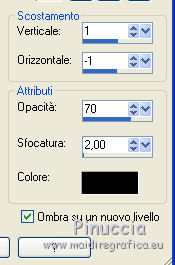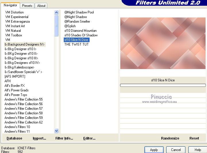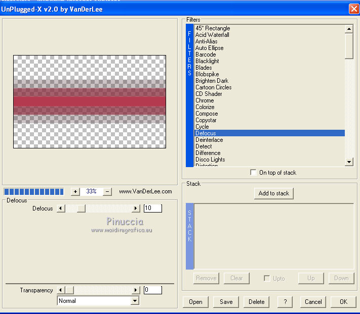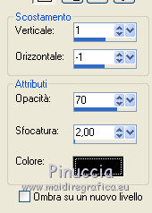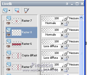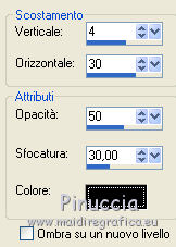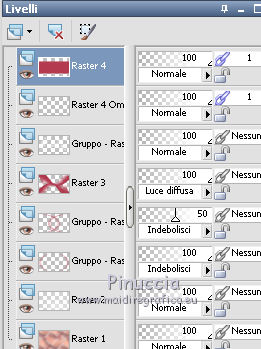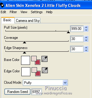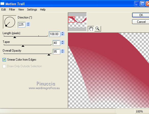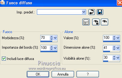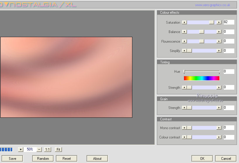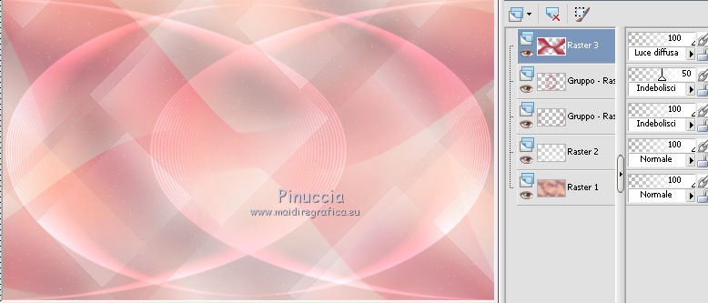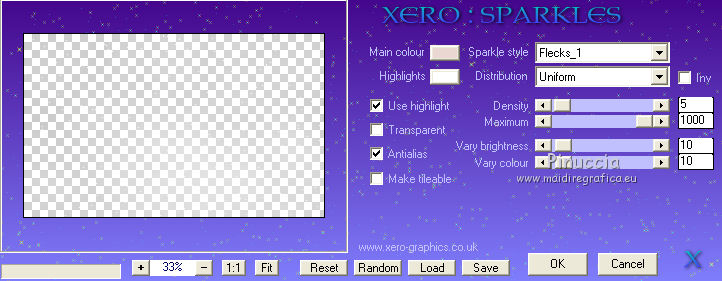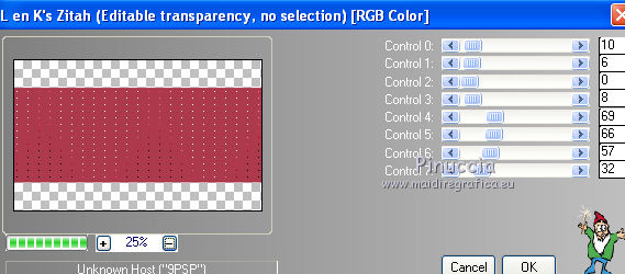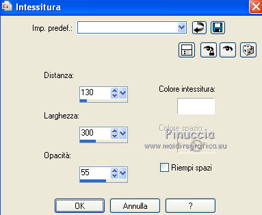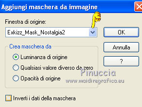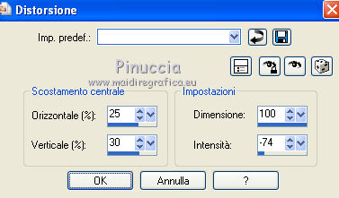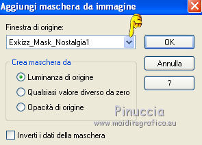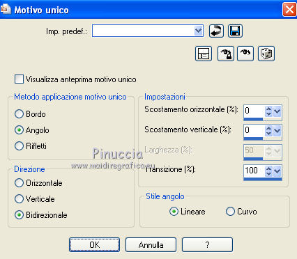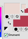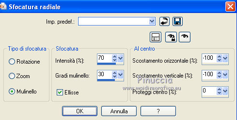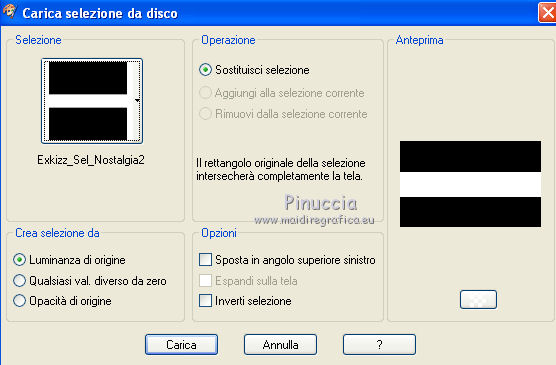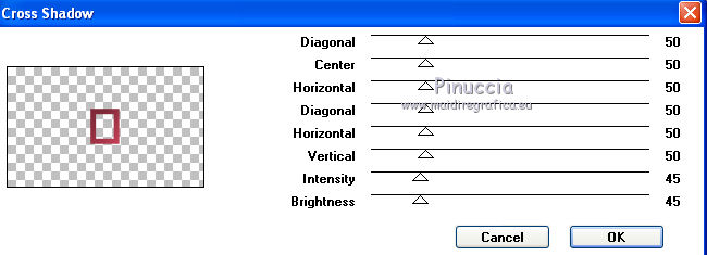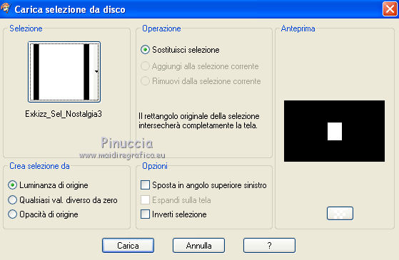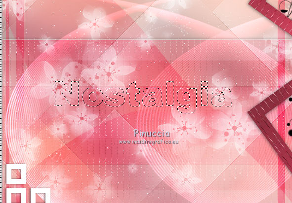 qui puoi trovare qualche risposta ai tuoi dubbi. Se l'argomento che ti interessa non è presente, ti prego di segnalarmelo. Questo tutorial è stato creato con PSP X2, ma può essere eseguito anche con le altre versioni di PSP. Per tradurlo, ho usato PSP X. Questo tutorial è una creazione di ©Exkizz Eskiss e non può essere copiato su altri siti nè essere offerto per il download. Lo stesso vale per la mia traduzione. Il materiale viene da vari gruppi di condivisione. Il copyright appartiene ai rispettivi autori. Grazie ai creatori dei tubes che mettono a disposizione il loro lavoro in vari gruppi di condivisione. Rispetta il lavoro degli autori, non cambiare il nome del file e non cancellare il watermark. Occorrente: Materiale qui Per il permesso di utilizzare il tube Pascale_270611_Woman_Doll grazie Pascale in caso di dubbi, ricorda di consultare la mia sezione filtri qui Xero - Nostalgia XL qui Xero Sparkles qui Alien Skin Xenofex 2.0 - Little Fluffy Clouds qui Filters Unlimited 2.0 qui &<Background Designers IV> qui Eye Candy 4000 - Motion Trail qui Mura's Meister - Copies qui Graphics Plus - Cross Shadow qui VanDerLee - Unplugged X qui L & K - Zitah qui Apri il font e minimizzalo. Lo troverai nella lista dei font disponibili quando ti servirà. Il secondo font che ti servirà è standard in Windows. Metti le selezioni nella cartella Selezioni. Metti il pennello nella cartella Pennelli. Attenzione, il pennello è composto da due files che non devono essere separati. (Vedi gli appunti sui Pennelli qui). Apri le tre maschere in PSP e minimizzale con il resto del materiale. Colori utilizzati Apri la paletta "Exkizz_Palette_nostalgia" in PSP. Attiva lo strumento Contagocce ![]() Clicca con il tasto sinistro del mouse per impostare il colore di primo piano, e con il tasto destro per impostare il colore di sfondo. (Nota: Nel materiale trovi una paletta Template, nel caso volessi usare altri colori. Seleziona ogni casella con la bacchetta magica , modalità Sostituisci, corrispondenza Valore RGB, sfumatura e tolleranza0),e riempi la casella con i tuoi colori).Per questo tutorial sono stati usati due colori scelti dal tube principale: il colore chiaro #ead7d1, e il colore scuro #b33a4f. Se il tuo tube non è molto colorato, scegli due colori che si armonizzano con la tua immagine. Questa la mia paletta. ![]() ***** 1. Apri la paletta "Exkizz_Palette_nostalgia". Attiva lo strumento Contagocce ,clicca con il tasto sinistro del mouse sul colore chiaro #ead7d1 per impostarlo come colore di primo piano.Clicca con il tasto destro del mouse sul colore scuro #b33a4f per impostarlo come colore di sfondo.Attenzione! = Non usare un colore troppo scuro. Questa dovrebbe essere la tua paletta dei Materiali. ![]() 2. Apri una nuova immagine trasparente 900 x 550 pixels. ![]() Riempi l'immagine trasparente con il colore chiaro di primo piano #ead7d1 (tasto sinistro del mouse).Selezione>Seleziona tutto. Apri il tube "Pascale_270611_Woman_Dool"e vai a Modifica>Copia. minimizza il tube perchè ti servirà ancora Torna al tuo lavoro e vai a Modifica>Incolla nella selezione. Selezione>Deseleziona. Effetti>Effetti di immagine>Motivo unico. ![]() ![]() Regola>Sfocatura>Sfocatura radiale. ![]() Regola>Sfocatura>Sfocatura gaussiana - raggio 30. ![]() Per ravvivare il colore: Effetti>Plugins>Xero - Nostalgia XL. bisogna regolare soltanto la Saturazione che nell'esempio è impostata a 82. Puoi impostare un settaggio diverso a seconda dei tuoi colori. ![]() Effetti>Effetti di trama>Intessitura - colore bianco. ![]() Risultato. ![]() Effetti>Plugins>Filters Unlimited - &<Background Designers IV> - sf10 Slice N Dice ![]() Effetti>Effetti di bordo>Aumenta. Regola>Morbidezza - Fuoco diffuso. ![]() Risultato. ![]() 3. Livelli>Nuovo livello raster - Raster 2. nota adesso serve il filtro Xenofex 2.0 - Se hai problemi con questo filtro, in sostituzione puoi copiare e incollare come nuovo livello il file "Nuages" che trovi nel materiale. Effetti>Plugins>Alien Skin Xenofex 2.0 - Little Fluffy Clouds. ![]() Effetti>Plugins>Xero - Sparkles (questo filtro creerà delle piccole stelle). ![]() Risultato: ![]() Questo invece sarà il risultato se userai il file "Nuages". ![]() Ho continuato il mio esempio con l'applicazione del filtro Xenofex; per questo motivo le immagini potranno essere diverse dalle tue, a seconda della tua scelta. 4. Se non lo hai fatto all'inizio del tutorial, apri le tre maschere e minimizzale. Livelli>Nuovo livello raster - Raster 3. Riempi con il colore scuro #b33a4f ![]() Livelli>Nuovo livello maschera>Da immagine. Apri il menu sotto la finestra di origine e vedrai la lista dei files aperti. Seleziona la maschera Exkizz_Mask_Nostalgia 1. ![]() Livelli>Unisci>Unisci gruppo. Cambia la modalità di miscelatura di questo livello in Indebolisci. Livelli>Nuovo livello raster - Raster 3. Riempi con il colore scuro #b33a4f ![]() Livelli>Nuovo livello maschera>Da immagine. Apri il menu sotto la finestra di origine e seleziona la maschera Exkizz_Mask_Nostalgia 2. ![]() Livelli>Unisci>Unisci gruppo. Cambia la modalità di miscelatura di questo livello in Indebolisci, e abbassa l'opacità al 50% (questo dipende dai colori utilizzati). Risultato. ![]() Questo sarà il risultato se hai usato il file "Nuages" al posto del filtro Xenofex ![]() 5. Livelli>Nuovo livello raster - Raster 3. Attiva lo strumento Selezione ,clicca sull'icona Selezione personalizzata ![]() e imposta i seguenti settaggi: ![]() Riempi la selezione con il colore chiaro di primo piano.Selezione>Deseleziona. Effetti>Effetti di distorsione>Distorsione. ![]() Effetti>Plugins>Eye Candy 4000 - Motion Trail. ![]() Risultato. ![]() Livelli>Duplica. Immagine>Rifletti. Immagine>Capovolgi. Livelli>Unisci>Unisci giù. Cambia la modalità di miscelatura di questo livello in Luce diffusa. Risultato. ![]() Questo il risultato usando il file "Nuages" ![]() 6. Imposta il colore di primo pano con il colore bianco #ffffff. Livelli>Nuovo livello raster - Raster 4. Riemp