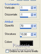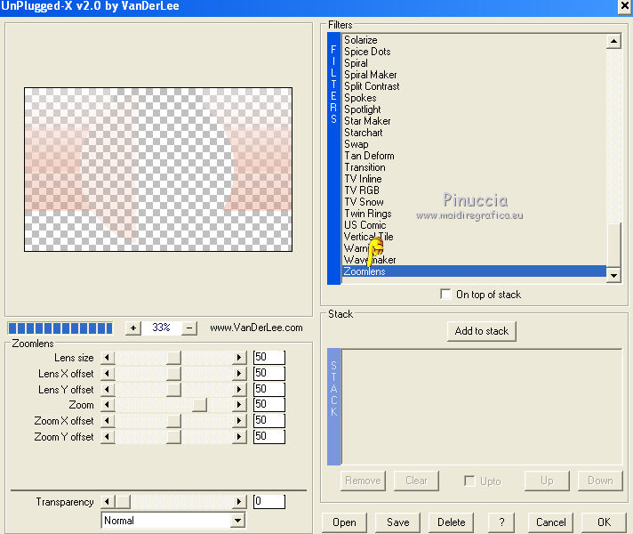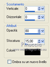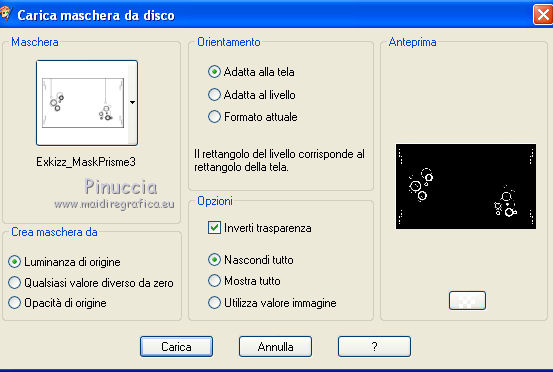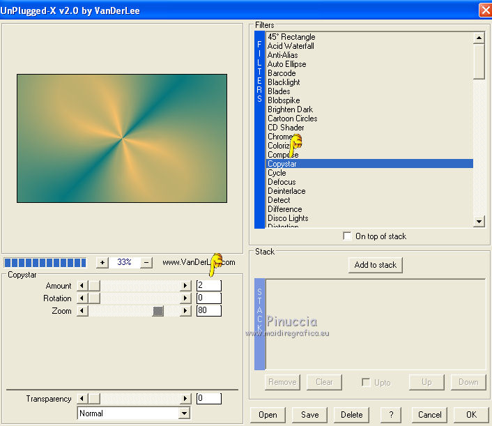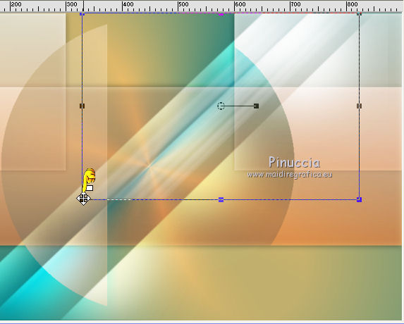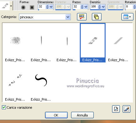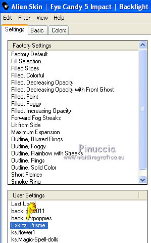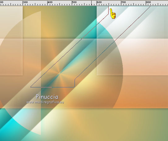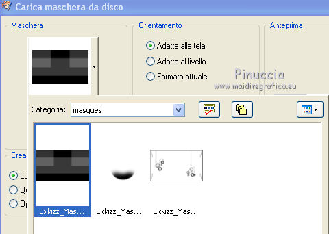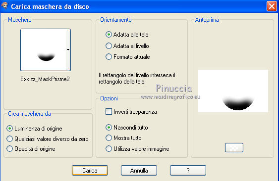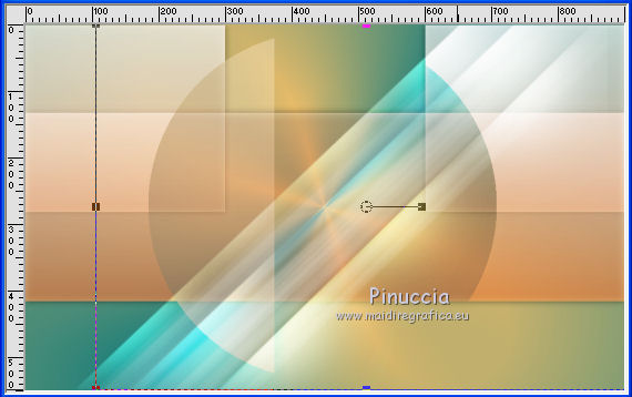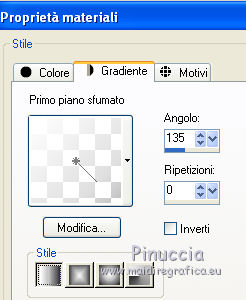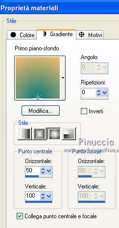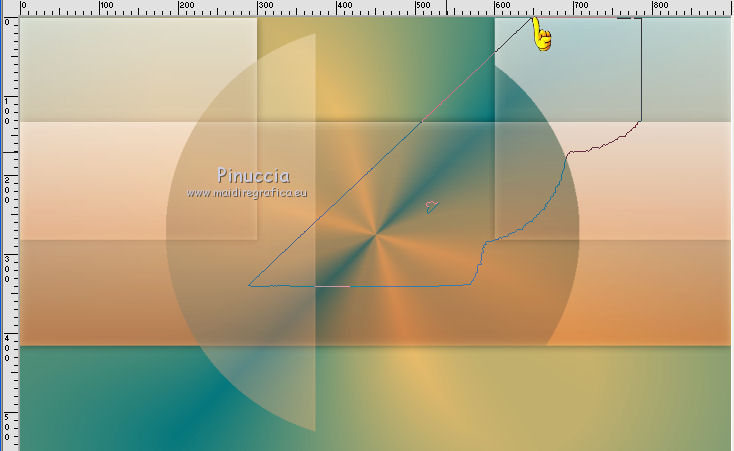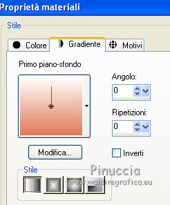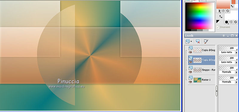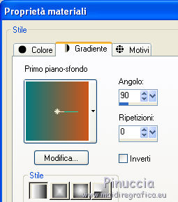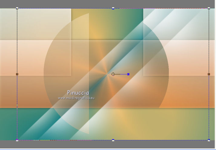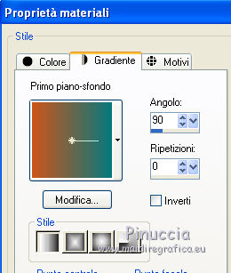 qui puoi trovare qualche risposta ai tuoi dubbi. Se l'argomento che ti interessa non è presente, ti prego di segnalarmelo. Questo tutorial è stato creato con PSP X2, ma può essere eseguito anche con le altre versioni di PSP, con qualche piccolo aggiustamento. Per tradurlo, ho usato PSP X. Questo tutorial è una creazione di ©Exkizz Eskiss e non può essere copiato su altri siti nè essere offerto per il download. Lo stesso vale per la mia traduzione. Il materiale viene da vari gruppi di condivisione. Il copyright appartiene ai rispettivi autori. Grazie ai creatori dei tubes che mettono a disposizione il loro lavoro in vari gruppi di condivisione. Rispetta il lavoro degli autori, non cambiare il nome del file e non cancellare il watermark. Occorrente: Materiale qui Scompattato il materiale, avrai la paletta dei colori Exkizz_Palette_Prisme e quattro cartelle: Masques che contiene 3 maschere; Pinceaux che contiene 7 pennelli, ognuno composto da due files che non devono essere separati (vedi gli appunti sui Pennelli qui Preset Eye Candy 5 Impact, che contiene il preset Exkiss_Prisme. Tube con il tube Yoka-Faces-Green-and-orange-02122010; e proibito modificare o rinominare il tube o elimininare il watermark. Grazie Yoka per l'autorizzazione ad utilizzare questo magnifico tube Filtri: in caso di dubbi, ricorda di consultare la mia sezione filtri qui Vanderlee - Unplugged-X qui Alien Skin Eye Candy 5 Impact - Backlight qui Transparency - Eliminate black qui Flaming Pear - Rule30 qui ![]() Metti il preset Exkizz_Prisme nella cartella del filtro: Alien Skin Eye Candy 5 Impact>Settings>Backlight. Se preferisci puoi importarlo, quando ti servirà, dalla cartella in cui hai scompattato il materiale. Vedi la scheda del filtro qui e come importare un preset in Eye Candy qui Metti le maschere nella cartella Maschere. Metti i pennelli nella cartella Pennelli. un piccolo consiglio che ti permetterà di guadagnare tempo quando dovrai cercare maschere e pennelli. Invece di copiarli nelle cartelle di PSP, inserisci direttamente le cartelle nei Percorsi files, lasciandole nella cartella dove hai scompattato il materiale. Colori utilizzati Apri la paletta "Exkiss_Palette_Prisme" in PSP. ![]() Attiva lo strumento Contagocce ![]() Clicca con il tasto sinistro del mouse per impostare il colore di primo piano, e con il tasto destro per impostare il colore di sfondo. 1. Imposta il colore di primo piano con il colore scuro #07787d, e il colore di sfondo con il colore chiaro #f6bf68. Passa il colore di primo piano a Gradiente, con i seguenti settaggi. ![]() 2. Apri una nuova immagine trasparente 900 x 550 pixels, e riempila con il gradiente.Effetti>Plugins>Vanderlee - Unplugged-X - seleziona il filtro Copystar con i seguenti settaggi. ![]() 3. Imposta il colore di primo piano con #df7955, e il colore di sfondo con il bianco #ffffff. Passa il colore di primo piano a Gradiente: ![]() Livelli>Nuovo livello raster. Riempi il nuovo livello con il gradiente.Livelli>Carica/Salva maschera>Carica maschera da disco. Cerca e carica la maschera Exkizz_MaskPrisme1; inverti trasparenza non selezionato. come puoi vedere, se hai seguito il mio consiglio, non dovrai cercare la maschera, ma l'avrai già immediatamente visibile nella cartella del materiale. ![]() ![]() Livelli>Unisci>Unisci gruppo. Livelli>Duplica, e rimani sul livello della copia. Effetti>Plugins>Vanderlee - Unplugged-X, filtro Zoomlens, con i settaggi standard. ![]() Cambia la modalità di miscelatura di questo livello in Luce netta. Attiva il livello sottostante dell'originale. Effetti>Effetti 3D>Sfalsa ombra, con il colore nero. ![]() Livelli>Duplica, e cambia la modalità di miscelatura di questo livello in Luce netta. Dovresti avere questo. ![]() 4. Attiva il livello superiore. Livelli>Nuovo livello raster. Imposta il colore di primo piano con il bianco #ffffff. ![]() Passa il colore di primo piano a Gradiente sfumato (nelle versioni superiori ha assunto la denominazione Corel_06_026), con i seguenti settaggi. ![]() Attiva lo strumento Pennello ![]() cerca e seleziona il pennello Exkizz_Prisme_Rayons1, con i settaggi standard, e applicalo posizionando il bordo superiore sinistro del pennello a 650 pixels. Clicca 2 volte con il tasto sinistro del mouse per usare il colore di primo piano. Se hai seguito il mio consiglio, non dovrai cercare i pennelli, ma li avrai immediatamente visibili selezionando la cartella. ![]() Se il tuo PSP non supporta pennelli superiori a 500 pixels, ti troverai un pennello impostato a 32 pixels. In questo caso, porta il settaggio alla dimensione massima di 500 pixels, e applica il pennello posizionandolo - come scritto sopra - a 650 pixels in alto e cliccando 2 volte con il tasto sinistro del mouse per usare il gradiente. ![]() Per adattarlo alle dimensioni reali, premi il tasto D per attivare lo strumento Deformazione ![]() allunga il pennello fino al bordo inferiore, e allargalo a destra e a sinistra, come nel mio esempio. ![]() Cambia la modalità di miscelatura di questo livello in Sovrapponi. 5. Livelli>Nuovo livello raster. Seleziona il pennello Exkizz_Prisme_Rayons2, con i settaggi standard, se stai usando le versioni superiori di PSP. Applicalo posizionando il bordo superiore sinistro del pennello a 650 pixels e clicca due volte con il tasto sinistro del mouse per usare il gradiente di primo piano. Se il tuo PSP non supporta pennelli superiori a 500 pixels, applica il pennello come indicato a 650 pixels (non dimenticare di impostare la dimensione a 500). ![]() Poi, per adattarlo, tasto D per attivare lo strumento Deformazione. In questo caso, usa il nodo nell'angolo inferiore a sinistra. ![]() e tira l'angolo fino in basso come nell'esempio. ![]() Poi, muovi il mouse sulla griglia e, quando appare l'icona dello spostamento, sposta il pennello a 650 pixels. ![]() Cambia la modalità di miscelatura di questo livello in Filtra. 6. Livelli>Nuovo livello raster. Riporta il colore di primo piano al colore bianco non devi riempire