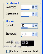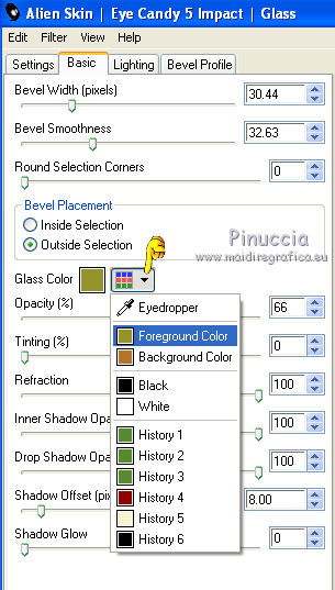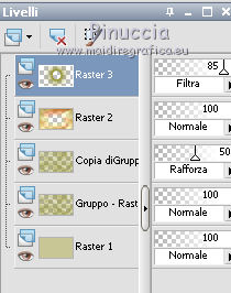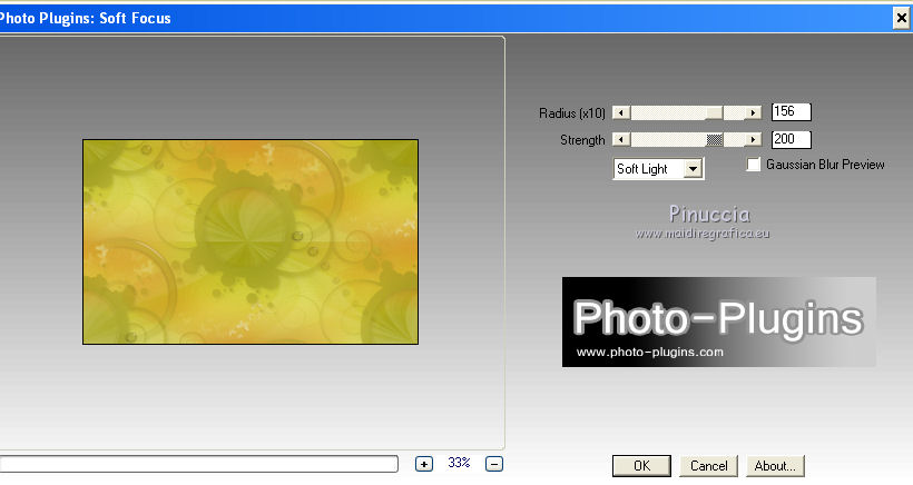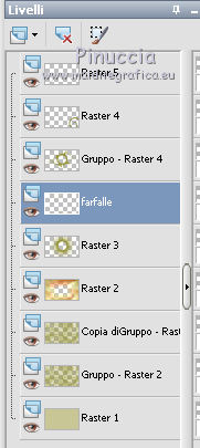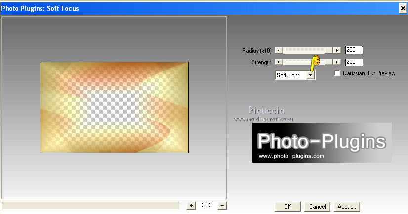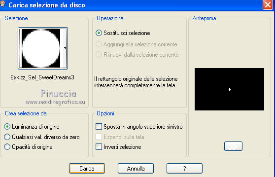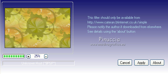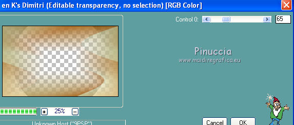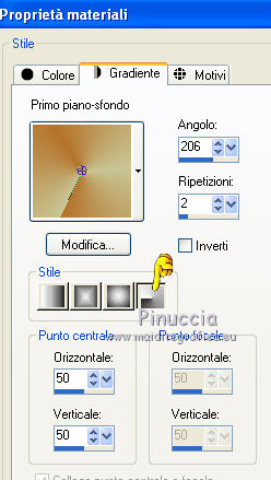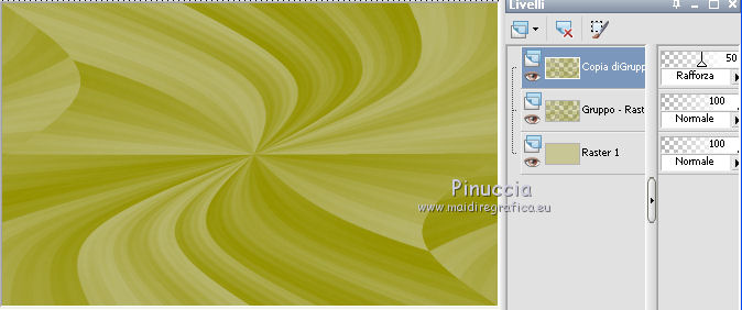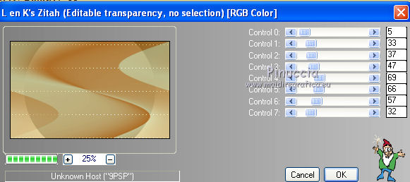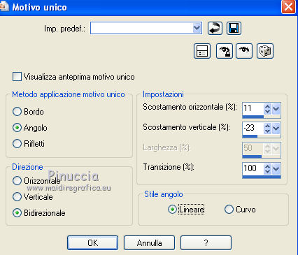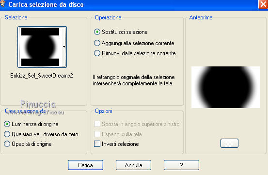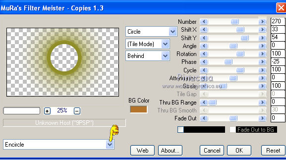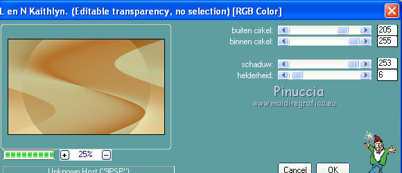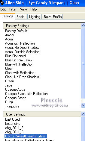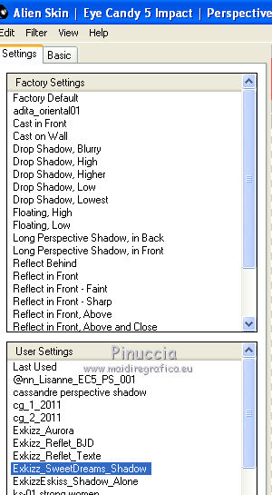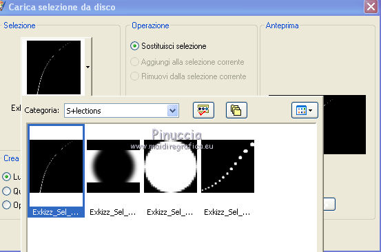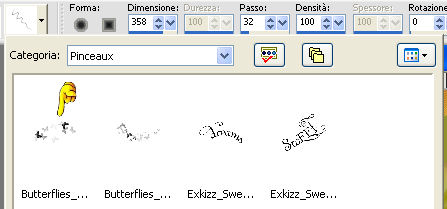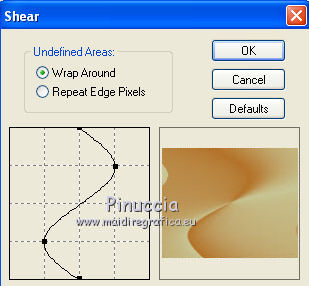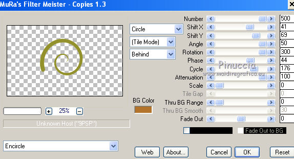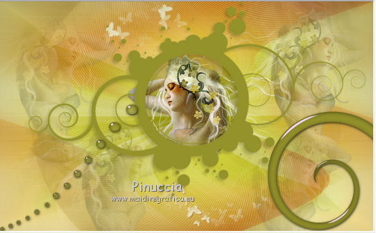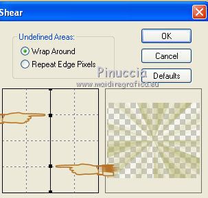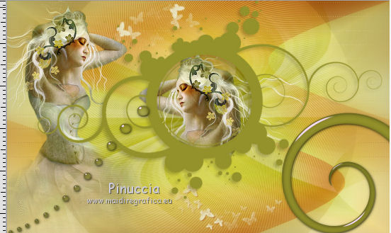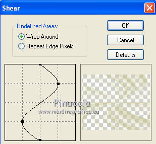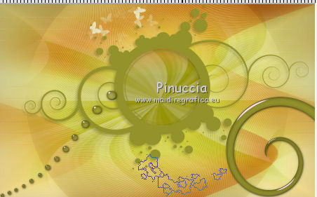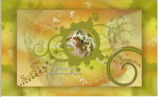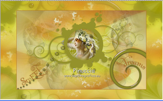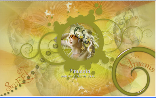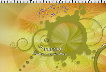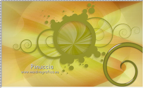 qui puoi trovare qualche risposta ai tuoi dubbi. Se l'argomento che ti interessa non è presente, ti prego di segnalarmelo. Questo tutorial è stato creato con PSP X2, ma può essere eseguito anche con le altre versioni di PSP, con qualche piccolo aggiustamento. Per tradurlo, ho usato PSP X. Questo tutorial è una creazione di ©Exkizz Eskiss e non può essere copiato su altri siti nè essere offerto per il download. Lo stesso vale per la mia traduzione. Il materiale viene da vari gruppi di condivisione. Il copyright appartiene ai rispettivi autori. Grazie ai creatori dei tubes che mettono a disposizione il loro lavoro in vari gruppi di condivisione. Rispetta il lavoro degli autori, non cambiare il nome del file e non cancellare il watermark. Occorrente: Materiale qui Scompattato il materiale, troverai il font Abermarle Swash usato per i pennelli di testo, e 5 cartelle. Masques che contiene 2 maschere: "masque-mentali49" e di Metali e "Exkizz_Mask_Sweet" realizzata dall'autrice del tutorial; Pinceaux che contiene 4 pennelli, ognuno composto da due files che non devono essere separati (vedi gli appunti sui Pennelli qui I pennelli "Butterflies_ShadyMedusa1 e 2" sono stati realizzati da Presets Eye Candy, che contiene 2 preset; Sélections, che contiene 4 selezioni. Tubes et Palette che contiene il tube KATabsinthe, 1 paletta dei colori e una paletta template. Filtri: in caso di dubbi, ricorda di consultare la mia sezione filtri qui Distort - Shear qui Alien Skin Eye Candy 5 Impact - Perspective Shadow, Glass qui Photo-Plugins - SoftFocus qui Mura's Meister - Copies qui L&K - L&K Kaithlyn qui L&K - L&K Dimitri qui L&K - L&K Zitah qui Simple - Quick Tile qui ![]() Metti i preset Exkizz_sweetdreams_Glass e Exkizz_Sweetdreams_Shadow nella cartella del filtro: Alien Skin Eye Candy 5 Impact>Settings>Glass e ...Impact_Settings>Shadow. Se preferisci puoi importarli, quando ti serviranno, dalla cartella in cui hai scompattato il materiale. Vedi la scheda del filtro qui e come importare un preset in Eye Candy qui Metti le maschere nella cartella Maschere. Metti le selezioni nella cartella Selezioni. Metti i pennelli nella cartella Pennelli. un piccolo consiglio che ti permetterà di guadagnare tempo quando dovrai cercare il materiale. Invece di copiarlo nelle cartelle di PSP, inserisci direttamente le cartelle nei Percorsi files, lasciandole nella cartella dove hai scompattato il materiale. Apri il resto del materiale in PSP. Colori utilizzati Apri la paletta "Exkiss_Palette_Sweet" in PSP. Attiva lo strumento Contagocce ![]() Clicca con il tasto sinistro del mouse per impostare il colore di primo piano, e con il tasto destro per impostare il colore di sfondo. (Nota: Se vuoi utilizzare altri colori, puoi preparare una paletta dei tuoi colori, usando la Palette_Template. Seleziona ogni casella con la bacchetta magica , modalità sostituisci, corrispondenza Valore RVB, tolleranza 0, e riempi con il tuo colore.)Per questo tutorial sono stati scelti due colori di tonalità chiara: #c8c695 e #e8e2be ,e due colori di tonalità media: #94922c e #b4732a .Scegli due colori molto contrastanti, in armonia con il tuo tubes. Ecco la mia paletta. ![]() Strumento Contagocce ![]() : clicca con il tasto sinistro del mouse sul colore #c8c695 per impostarlo come colore di primo piano, Clicca con il tasto destro del mouse sul colore #94922c per impostarlo come colore di sfondo. 1. Apri una nuova immagine trasparente 900 x 550 pixels. ![]() Riempi l'immagine trasparente con il colore chiaro di primo piano #c8c695 .Livelli>Nuovo livello raster. Riempi .Livelli>Carica/Salva maschera>Carica maschera da disco. Cerca e carica la maschera Exkizz_Mask_Sweet. ![]() Livelli>Unisci>Unisci gruppo. Effetti>Plugins>Distort - Shear: Seleziona Wrap Around; clicca sulla linea in alto e tira il quadretto nero verso destra; fai la stessa cosa in basso tirando il quadretto nero verso sinistra. ![]() ![]() Livelli>Duplica. Cambia la modalità di miscelatura di questo livello in Rafforza, e abbassa l'opacità al 50%. ![]() 3. Livelli>Nuovo livello raster. Mantieni il colore di primo piano con il colore chiaro #c8c695 ,e imposta il colore di sfondo con il colore medio #b4732a .Passa il colore di primo piano a Gradiente Radiale, con i seguenti settaggi. ![]() Riempi il nuovo livello con il gradiente.Effetti>Plugins>Distort - Shear - 2 volte - con i settaggi precedenti. ![]() Immagine>Rifletti. Dovresti avere questo. ![]() Effetti>Plugins>L&K - L&K Kaithlyn: ![]() Effetti>Plugins>L&K - L&K Zitah. ![]() Effetti>Plugins>L&K - L&K Dimitri. ![]() Effetti>Plugins>Photo Plugins - SoftFocus: seleziona il preset Soft Light con i seguenti settaggi. ![]() 4. Livelli>Nuovo livello raster. Selezione>Carica/Salva selezione>Carica selezione da disco. Cerca e carica la selezione Exkizz_Sel_SweetDreams1. se hai seguito il mio consiglio, non dovrai cercare la selezione, ma l'avrai già immediatamente visibile nella cartella del materiale inserita nei Percorsi Files. ![]() ![]() Imposta il colore di primo piano con #94922c ,e riempi la selezione con questo colore.non esitare ad ingrandire l'immagine attivando lo strumento Zoom , o usando la rotellina del mouseSelezione>Deseleziona. Effetti>Plugins>Mura's Meister - Copies - Preset Encircle con i seguenti settaggi. ![]() Cambia la modalità di miscelatura di questo livello in Filtra per dare luminosità all'immagine, e abbassa l'opacità all'85%. Nota. Se questa modalità non si adatta ai tuoi colori, puoi rimanere in modalità Normale o sperimentare altre modalità Esempio in Modalità Normale. ![]() Esempio in Modalità Filtra. ![]() Paletta dei livelli. ![]() Selezione>Carica/Salva selezione>Carica selezione da disco. Cerca e carica la selezione Exkizz_Sel_SweetDreams2. ![]() Premi 2 volte sulla tastiera il tasto CANC per eliminare qualche tratto che deborda. Selezione>Deseleziona. 5. Cornice Livelli>Nuovo livello raster. Riempi con il colore chiaro #94922c .Livelli>Carica/Salva maschera>Carica maschera da disc