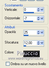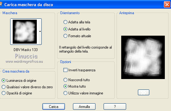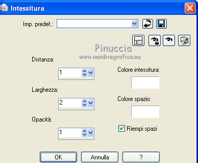 qui puoi trovare qualche risposta ai tuoi dubbi. Se l'argomento che ti interessa non è presente, ti prego di segnalarmelo. Questo tutorial è stato scritto in PSP X2, ma può essere eseguito anche con le altre versioni di PSP. Per tradurlo, l'ho eseguito con PSP X. Occorrente: Un tube a scelta. Il resto del materiale qui Gli elementi scrap sono di Delicious Scraps (Iced Wine), le maschere sono di DVB ![]() Metti le maschere nella cartella Maschere, e apri il resto del materiale in PSP. Imposta il colore di primo piano con #cdded3. 1. Apri una nuova immagine bianca 650 x 650 pixels. ![]() 2. Livelli>Nuovo livello raster. Riempi con il colore di primo piano.3. Livelli>Carica/Salva maschera>Carica maschera da disco. Cerca e carica la maschera DBV Masks 133, con i seguenti settaggi. ![]() Livelli>Elimina e rispondi sì alla domanda Unire la maschera nel livello corrente. ![]() Livelli>Unisci>Unisci gruppo. 4. Livelli>Nuovo livello raster. Riempi di nuovo con il colore di primo piano.5. Livelli>Carica/Salva maschera>Carica maschera da disco. Cerca e carica la maschera 205, con i seguenti settaggi. ![]() Livelli>Elimina e rispondi sì alla domanda Unire la maschera nel livello corrente. ![]() Livelli>Unisci>Unisci gruppo. Effetti>Effetti di trama>Intessitura. ![]() 7. Apri "net" e vai a Modifica>copia. Torna al tuo lavoro e vai a Modifica>Incolla come nuovo livello. Sposta la rete in basso.8. Apri Frame Fancy e vai a Modifica>copia. Torna al tuo lavoro e vai a Modifica>Incolla come nuovo livello. 9. Attiva lo strumento Selezione a mano libera , da punto a punto,e seleziona la cornice superiore. ![]() 10. Livelli>Nuovo livello raster. Riempi con il colore di primo piano.11. Livelli>Disponi>Sposta giù. 12. Apri il tuo tube e vai a Modifica>Copia. Torna al tuo lavoro e vai a Modifica>Incolla come nuovo livello. Posiziona il viso nella cornice.13. Selezione>Inverti. Premi sulla tastiera il tasto CANC. 14. Selezione>Deseleziona. 15. Cambia la modalità di miscelatura di questo livello in Luminanza (esistente). 16. Attiva il livello Raster 2. 17. Apri flower 2 e vai a Modifica>copia. Torna al tuo lavoro e vai a Modifica>Incolla come nuovo livello. Spostalo a sinistra sulla cornice.18. Effetti>Effetti 3D>Sfalsa ombra. ![]() 19. Apri il tuo tube e vai a Modifica>copia. Torna al tuo lavoro e vai a Modifica>Incolla come nuovo livello. 20. Attiva lo strumento Selezione a mano libera , da punto a punto,e seleziona la parte di tube esterna alla cornice. ![]() Premi sulla tastiera il tasto CANC. 21. Selezione>Desleeziona. 22. Effetti>Effetti 3D>Sfalsa ombra, con i settaggi precedenti. 23. Apri Bow2 e vai a Modifica>copia. Torna al tuo lavoro e vai a Modifica>Incolla come nuovo livello. Spostalo a destra della cornice inferiore.24. Apri wordart_allforlove_vika e vai a Modifica>copia. Torna al tuo lavoro e vai a Modifica>Incolla come nuovo livello. Spostalo in basso.25. Aggiungi il tuo nome e/o il tuo watermark. 26. Livelli>Unisci>Unisci tutto e salva in formato jpg.