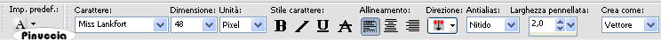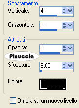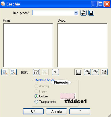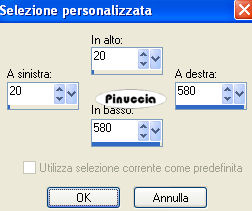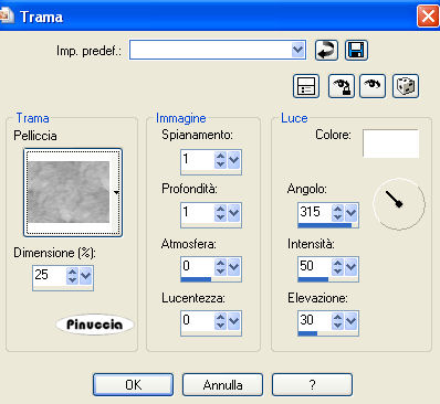 qui puoi trovare qualche risposta ai tuoi dubbi. Se l'argomento che ti interessa non è presente, ti prego di segnalarmelo. Questo tutorial è stato scritto in PSP X2, ma può essere eseguito anche con le altre versioni di PSP. Per tradurlo, l'ho eseguito con PSP X. Occorrente: Un tube a scelta. Il resto del materiale qui Metti la maschera nella cartella Maschere e apri il resto del materiale in PSP. Imposta il colore di primo piano con il bianco, e il colore di sfondo con #b1617d. 1. Apri una nuova immagine bianca 600 x 600 pixels. ![]() 2. Livelli>Nuovo livello raster. Attiva lo strumento Selezione ,clicca sull'icona Selezione personalizzata ![]() e imposta i seguenti settaggi: ![]() Riempi la selezione con il colore di primo piano (bianco).3. Effetti>Effetti geometrici>Cerchio, con il colore #f4dce1. ![]() Selezione>Deseleziona. 4. Attiva lo strumento Bacchetta magica e clicca sulle parte rosa per selezioanrla.5. Effetti>Effetti di trama>Trama - seleziona la trama Pelliccia, con i seguenti settaggi. ![]() Selezione>Deseleziona. 6. Seleziona con la bacchetta magica il cerchio bianco.7. Livelli>Nuovo livello raster. Riempi con il colore di sfondo.8. Livelli>Carica/Salva maschera>Carica maschera da disco. Cerca e carica la maschera gemsmask19: ![]() Livelli>elimina, e rispondi sì alla domanda Unire la maschera nel livello corrente. ![]() Livelli>Unisci>Unisci gruppo. Selezione>Deseleziona. 9. Apri angel_kiss_Vika e vai a Modifica>copia. Torna al tuo lavoro e vai a Modifica>Incolla come nuovo livello. 10. Apri il tube "dove" e vai a Modifica>copia. Torna al tuo lavoro e vai a Modifica>Incolla come nuovo livello. Sposta il tube in alto a sinistra.11. Effetti>Effetti 3D>Sfalsa ombra: ![]() 12. Apri il tuo tube e vai a Modifica>copia. Torna al tuo lavoro e vai a Modifica>Incolla come nuovo livello. Sposta il tube a destra.13. Effetti>Effetti 3D>sfalsa ombra. ![]() 14. Chiudi il colore di primo piano. 15. Attiva lo strumento Testo , seleziona il font Miss Lankfort:![]() Scrivi "angel kiss" o quello che preferisci. Livelli>Converti in livello raster. 16. Immagine>Ruota per gradi - 90 gradi a sinistra: ![]() Sposta il testo al centro.17. Aggiungi il tuo nome e/o il tuo watermark. Livelli>Unisci>Unisci tutto e salva in formato jpg. ![]()