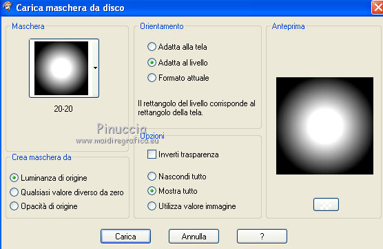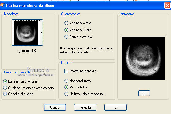 qui puoi trovare qualche risposta ai tuoi dubbi. Se l'argomento che ti interessa non è presente, ti prego di segnalarmelo. Questo tutorial è stato scritto in PSP X2, ma può essere eseguito anche con le altre versioni di PSP. Per tradurlo, l'ho eseguito con PSP X. Occorrente: Un tube a scelta. Il resto del materiale qui Il tube usato è di Denise Worisch. Apri il font e minimizzalo. Lo troverai nella lista dei font disponibili quando ti servirà. Metti le maschere nella cartella Maschere, e apri il resto del materiale in PSP. Imposta il colore di primo piano con #fecedc, e il colore di sfondo con il bianco. 1. Apri una nuova immagine bianca 650x650 pixels. ![]() 2. Livelli>Nuovo livello raster. Riempi con il colore di primo piano.3. Livelli>Carica/Salva maschera>Carica maschera da disco. Cerca e carica la maschera 20-20. ![]() Livelli>Elimina, e rispondi sì alla domanda Unire la maschera nel livello corrente. ![]() Livelli>Unisci>Unisci gruppo. 4. Livelli>Nuovo livello raster. Selezione>Seleziona tutto. 5. Apri DBS_Paper19 e vai a Modifica>copia. Torna al tuo lavoro e vai a Modifica>Incolla nella selezione. 6. Livelli>Carica/Salva maschera>Carica maschera da disco. Cerca e carica la maschera gemsmask6. ![]() Livelli>Elimina, e rispondi sì alla domanda Unire la maschera nel livello corrente. ![]() Livelli>Unisci>Unisci gruppo. Selezione>Deseleziona. 7. Apri heavensgate e vai a Modifica>Copia. Torna al tuo lavoro e vai a Modifica>Incolla come nuovo livello. Sposta il tube a destra.8. Livelli>Duplica. Immagine>Rifletti. 9. Livelli>Unisci>Unisci giù. 10. Abbassa l'opacità di questo livello al 50%. 11. Apri "smoke" e vai a Modifica>copia. Torna al tuo lavoro e vai a Modifica>Incolla come nuovo livello. 12. Apri DBS_Sparkles02 e vai a Modifica>copia. Torna al tuo lavoro e vai a Modifica>Incolla come nuovo livello. 13. Apri veil, e vai a Modifica>copia. Torna al tuo lavoro e vai a Modifica>Incolla come nuovo livello. Sposta il tube a sinistra.14. Livelli>Duplica. Immagine>Rifletti. 15. Apri swirlbling2, e vai a Modifica>copia. Torna al tuo lavoro e vai a Modifica>Incolla come nuovo livello. Spostalo in basso.16. Apri il tuo tube e vai a Modifica>copia. Torna al tuo lavoro e vai a Modifica>Incolla come nuovo livello. 17. Apri rose_wing_border, e vai a Modifica>copia. Torna al tuo lavoro e vai a Modifica>Incolla come nuovo livello. Sposta i fiori in basso.![]() 18. Apri "dove" e vai a Modifica>copia. Torna al tuo lavoro e vai a Modifica>Incolla come nuovo livello. Sposta il tube a destra.19. Livelli>Duplica. Immagine>Rifletti. 20. Attiva lo strumento Testo ![]() e seleziona il font Morrison con i seguenti settaggi. ![]() Scrivi "Angel on Heaven" o "Angelo del Paradiso" o quello che preferisci. Livelli>Converti in livello raster. 21. Effetti>Effetti 3D>Sfalsa ombra, con il colore nero. ![]() 22. Aggiungi il tuo nome e/o il tuo watermark. 23. Livelli>Unisci>Unisci tutto e salva in formato jpg.