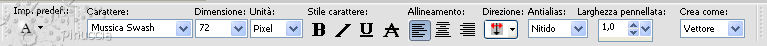 qui puoi trovare qualche risposta ai tuoi dubbi. Se l'argomento che ti interessa non è presente, ti prego di segnalarmelo. Questo tutorial è stato scritto in PSP X2, ma può essere eseguito anche con le altre versioni di PSP. Per tradurlo, l'ho eseguito con PSP X. Occorrente: Un tube a scelta. Il resto del materiale qui Il tube che ho usato è di NimueLaFee Apri il font e minimizzalo. Lo troverai nella lista dei font disponibili, quando ti servirà. Apri il resto del materiale in PSP. 1. Apri una nuova immagine bianca 600 x 600 pixels. ![]() 2. Apri il file di sfondo achtergrond1_barbara_Vika e vai a Modifica>Copia. Torna al tuo lavoro e vai a Modifica>Incolla come nuovo livello. 3. Apri achtergrond2_barbara_Vika e vai a Modifica>copia. Torna al tuo lavoro e vai a Modifica>Incolla come nuovo livello. 4. Apri feather e vai a Modifica>copia. Torna al tuo lavoro e vai a Modifica>Incolla come nuovo livello. Sposta la piuma un po' più a sinistra.5. Apri frame e vai a Modifica>copia. Torna al tuo lavoro e vai a Modifica>Incolla come nuovo livello. 6. Apri il tuo tube e vai a Modifica>Copia. Torna al tuo lavoro e vai a Modifica>Incolla come nuovo livello. 7. Regola>Tonalità e saturazione>Viraggio. ![]() 8. Effetti>Effetti 3D>Sfalsa ombra. ![]() 9. Apri element1 e vai a Modifica>Copia. Torna al tuo lavoro e vai a Modifica>Incolla come nuovo livello. Spostalo in basso, sotto la cornice.![]() 10. Apri roses1 e vai a Modifica>Copia. Torna al tuo lavoro e vai a Modifica>Incolla come nuovo livello. Sposta queste rose a sinistra.11. Apri roses2 e vai a Modifica>Copia. Torna al tuo lavoro e vai a Modifica>Incolla come nuovo livello. Sposta queste rose a destra.![]() 12. Apri bow e vai a Modifica>Incolla come nuovo livello. Sposta il nastro a destra.13. Apri heart_misted e vai a Modifica>Incolla come nuovo livello. Sposta il tube a sinistra sopra le rose.![]() 14. Chiudi il colore di primo piano e imposta il colore di sfondo con il bianco. 15. Attiva lo strumento Testo e seleziona il font Mussica Swash con i seguenti settaggi.![]() Scrivi il tuo testo e posizionalo. 16. Livelli>Converti in livello raster. 17. Effetti>Effetti 3D>sfalsa ombra: ![]() 18. Attiva il livello Raster 5. 19. Attiva lo strumento Gomma ![]() e cancella eventuali tracce del tube visibili sotto la cornice. 20. Aggiungi il tuo nome e/o il tuo watermark. 21. Livelli>Unisci>Unisci tutto e salva in formato jpg.